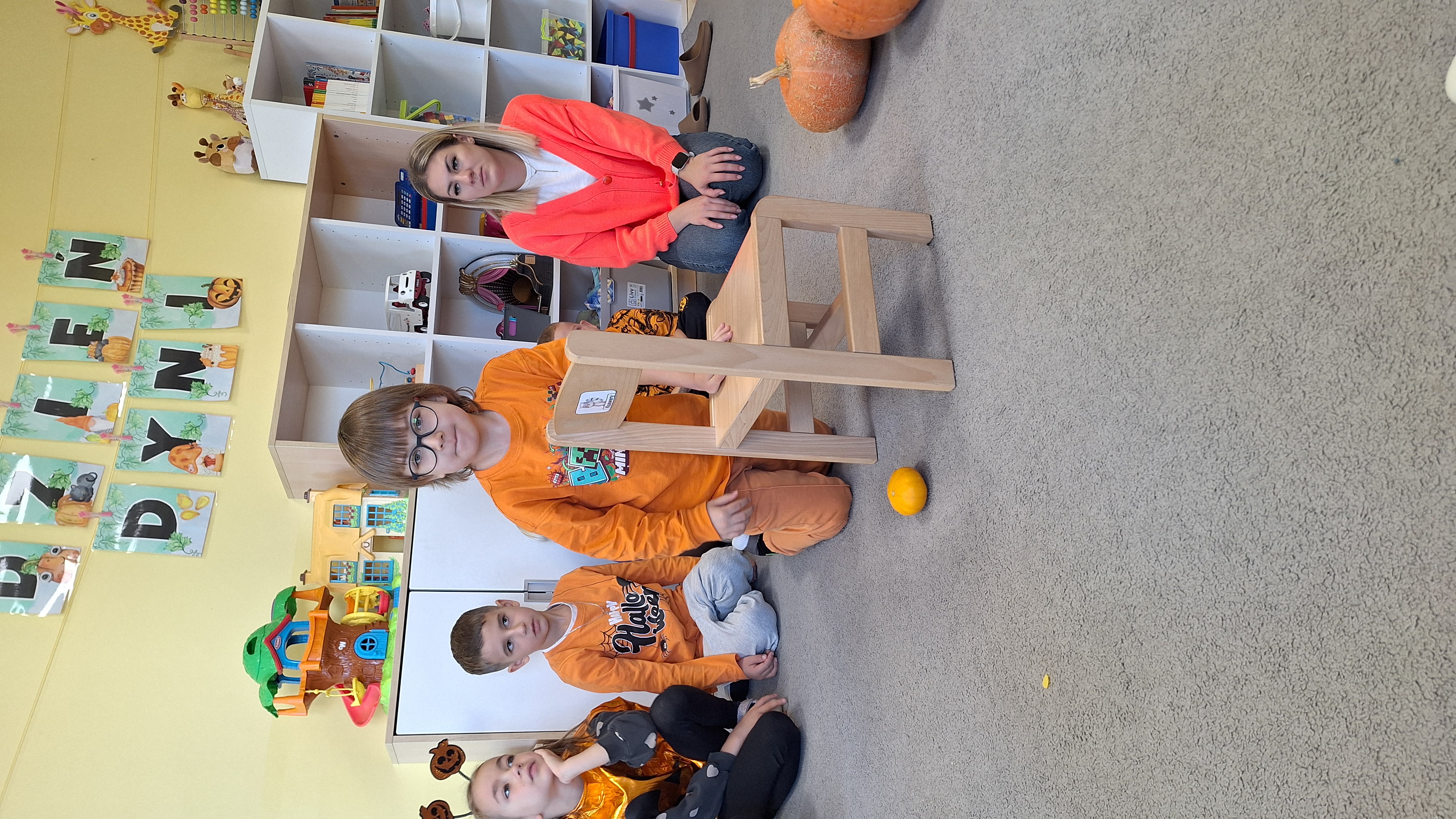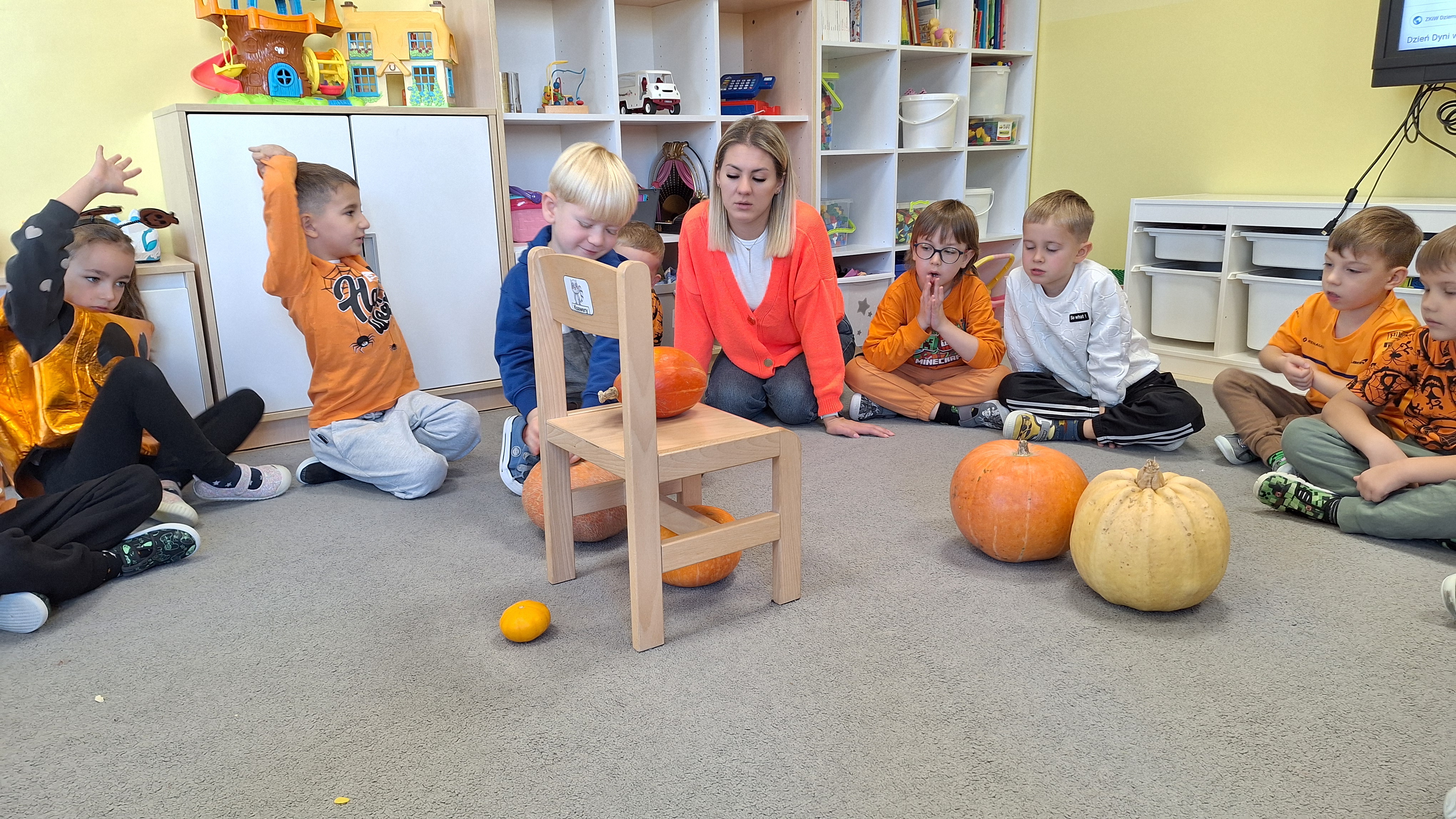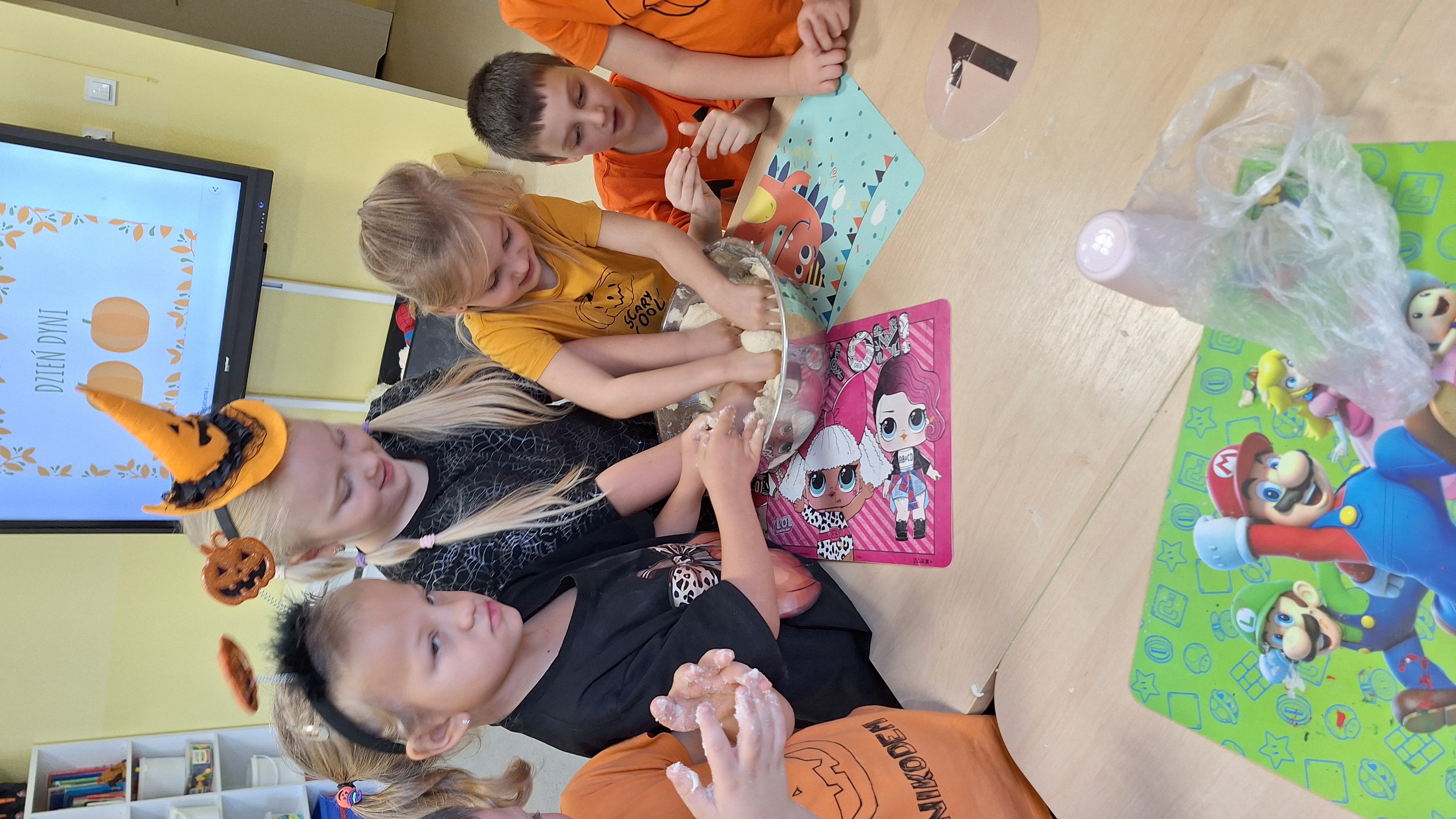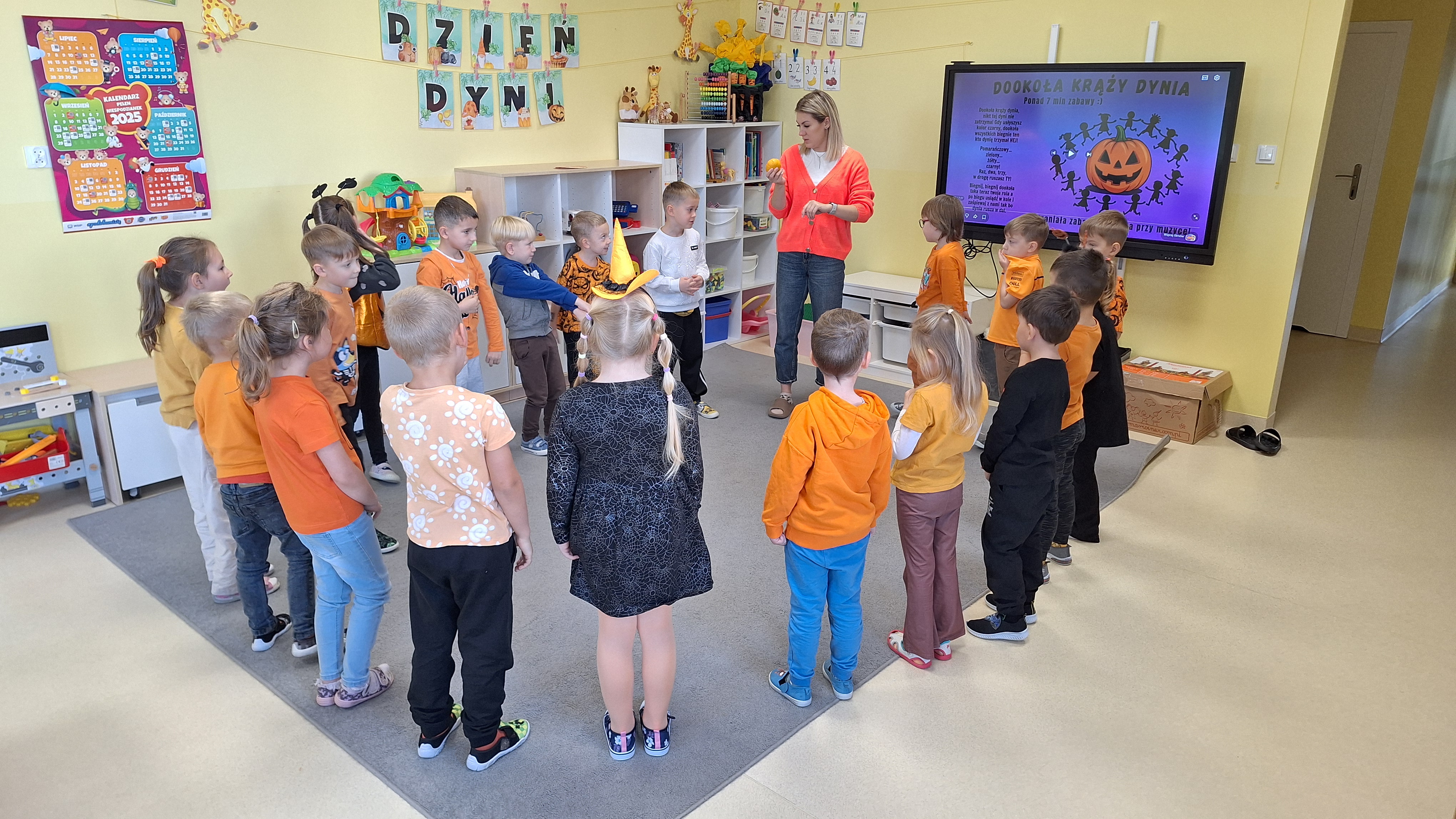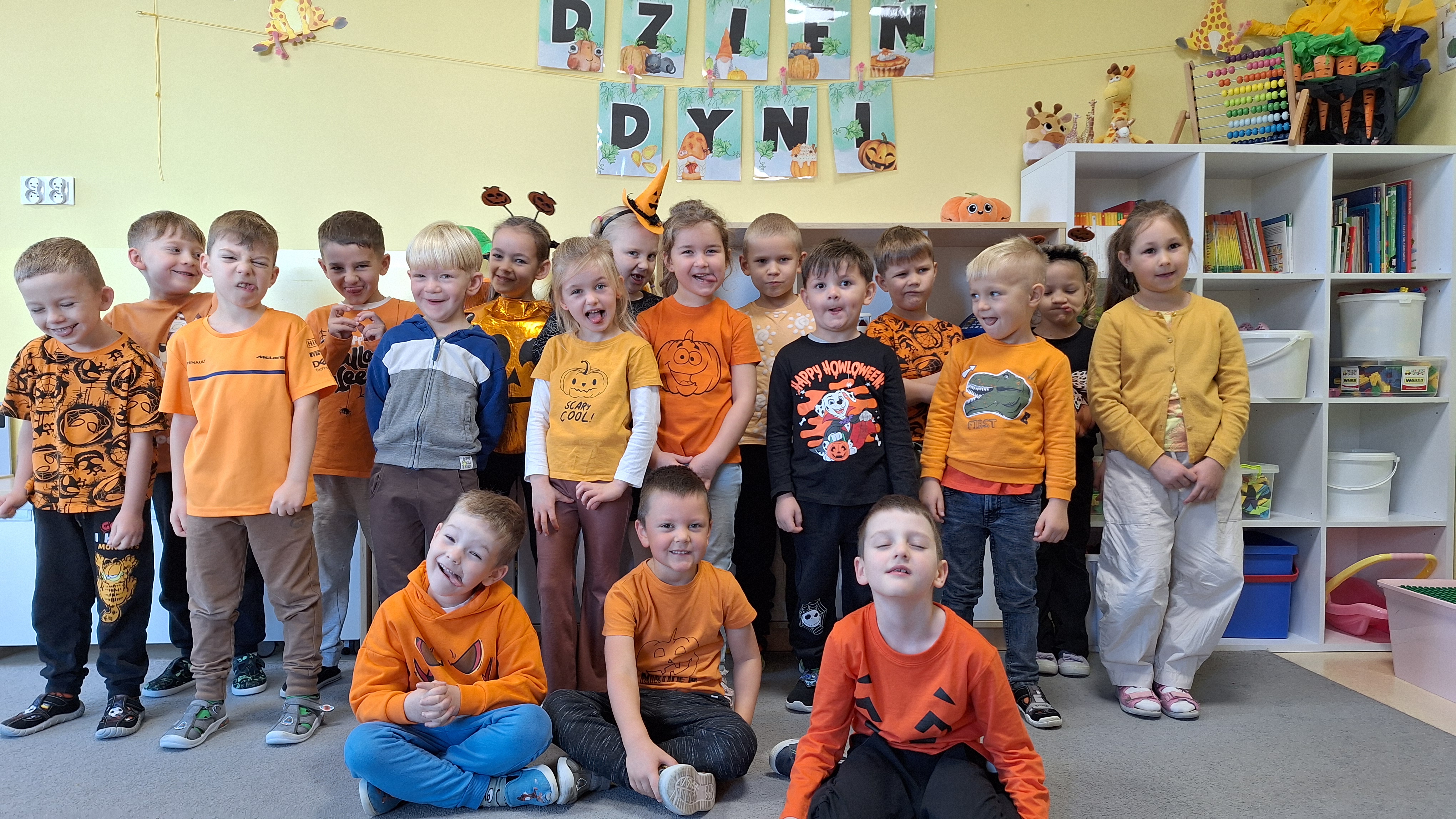 Dnia 31.10.2025 w grupie Żyrafy obchodziliśmy Dzień dyni. Dzieci ubrane na pomarańczowo porównywały wielkości, ciężar, a także układały je w przestrzeni(nad, pod obok). Miały również świetną zabawę przy tworzeniu własnych dyni z masy solnej. Zabawa do piosenki ,, Podaj dynie” sprawiła dzieciom wiele radości i śmiechu. Nie mogliśmy się zatrzymać, na koniec utrwalaliśmy kolory i cyfry podczas kodowania.