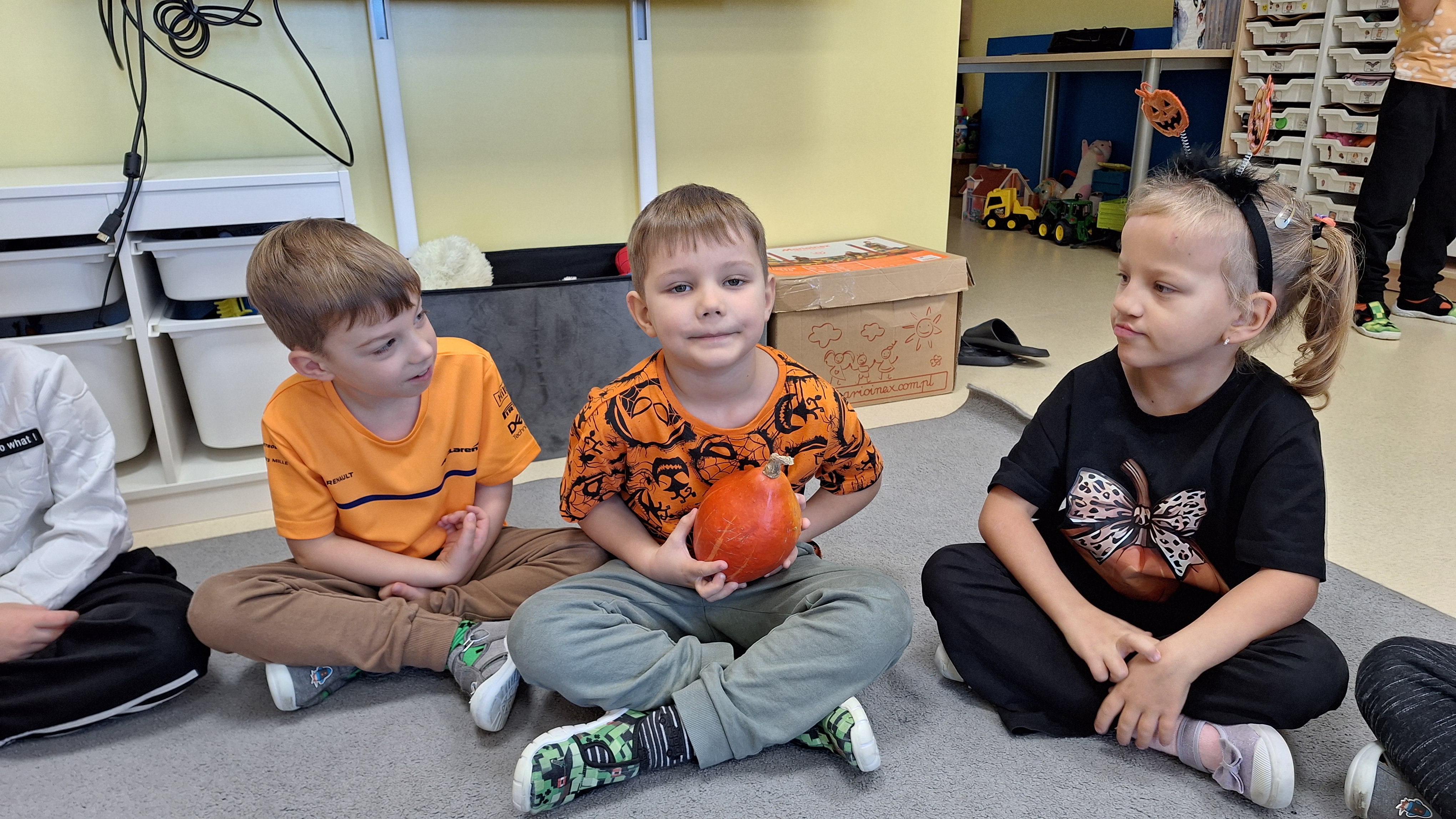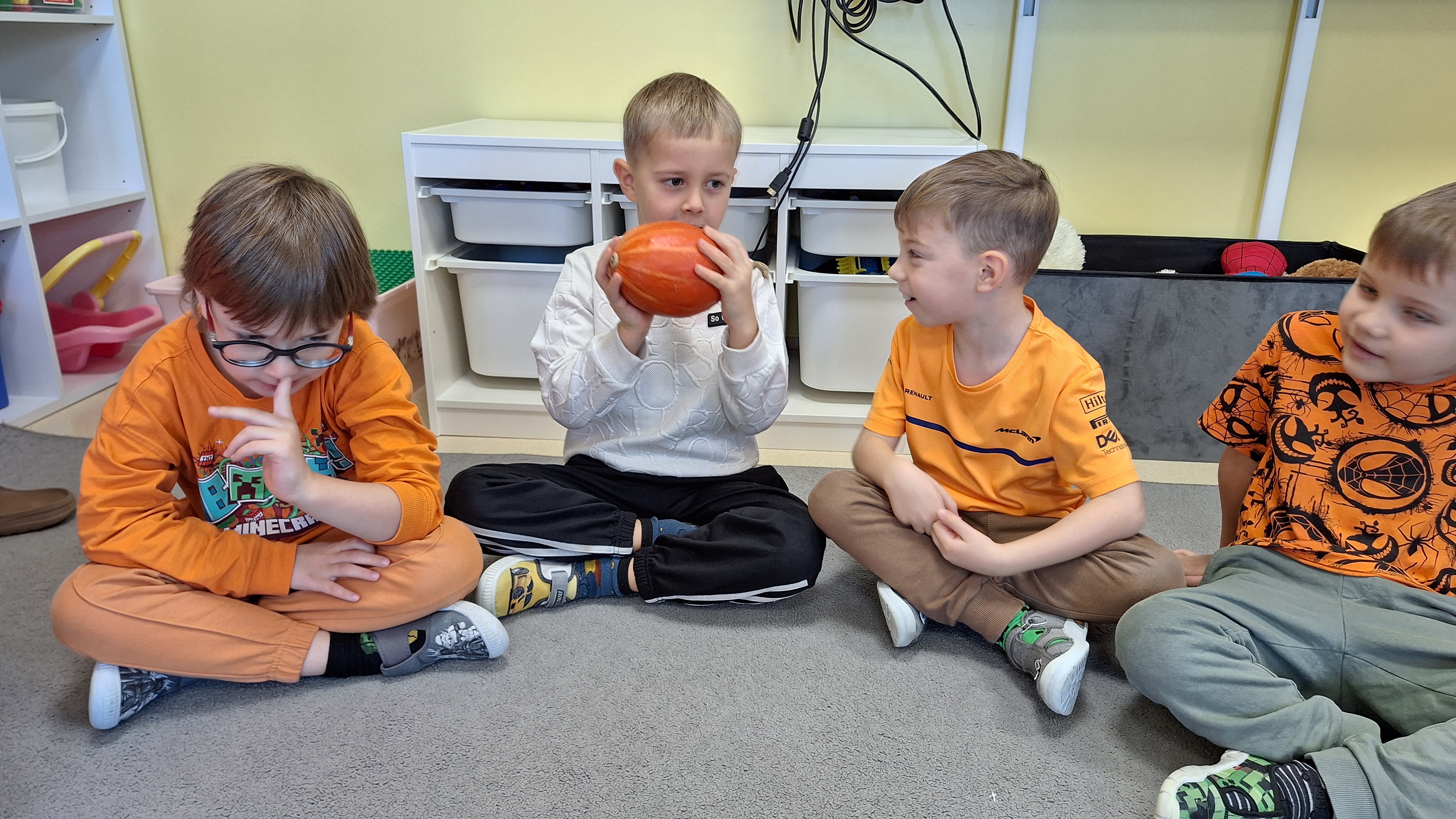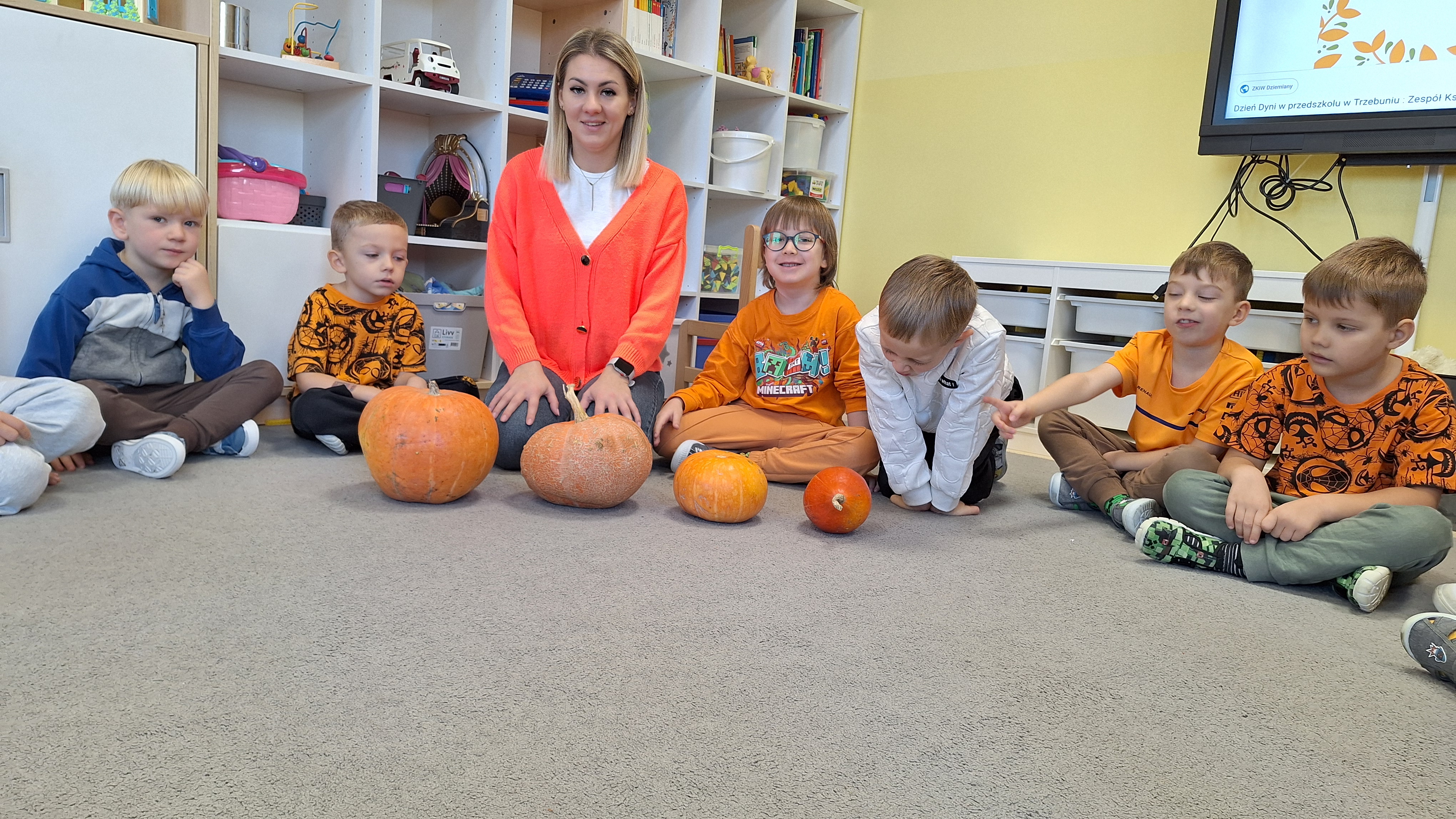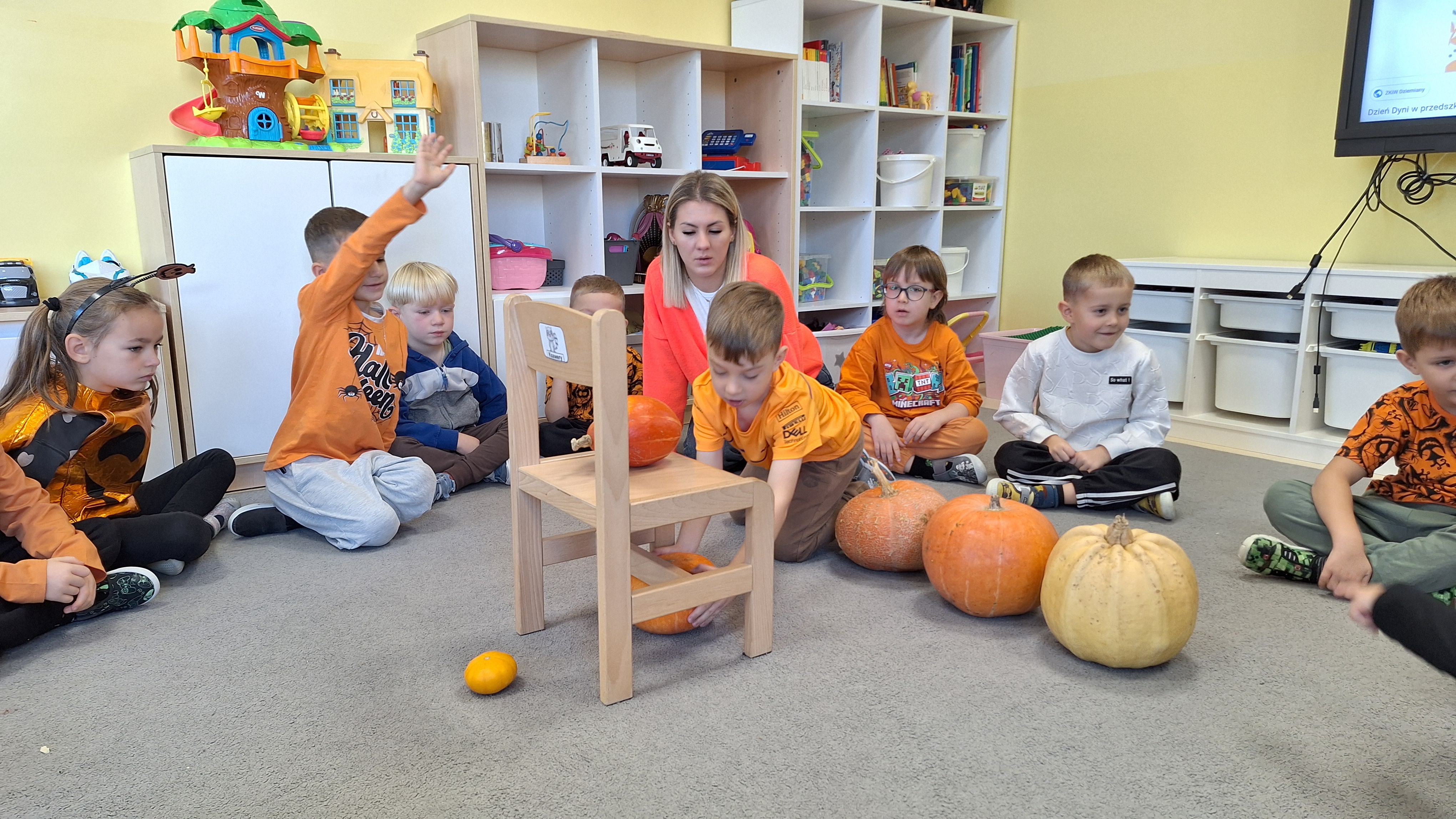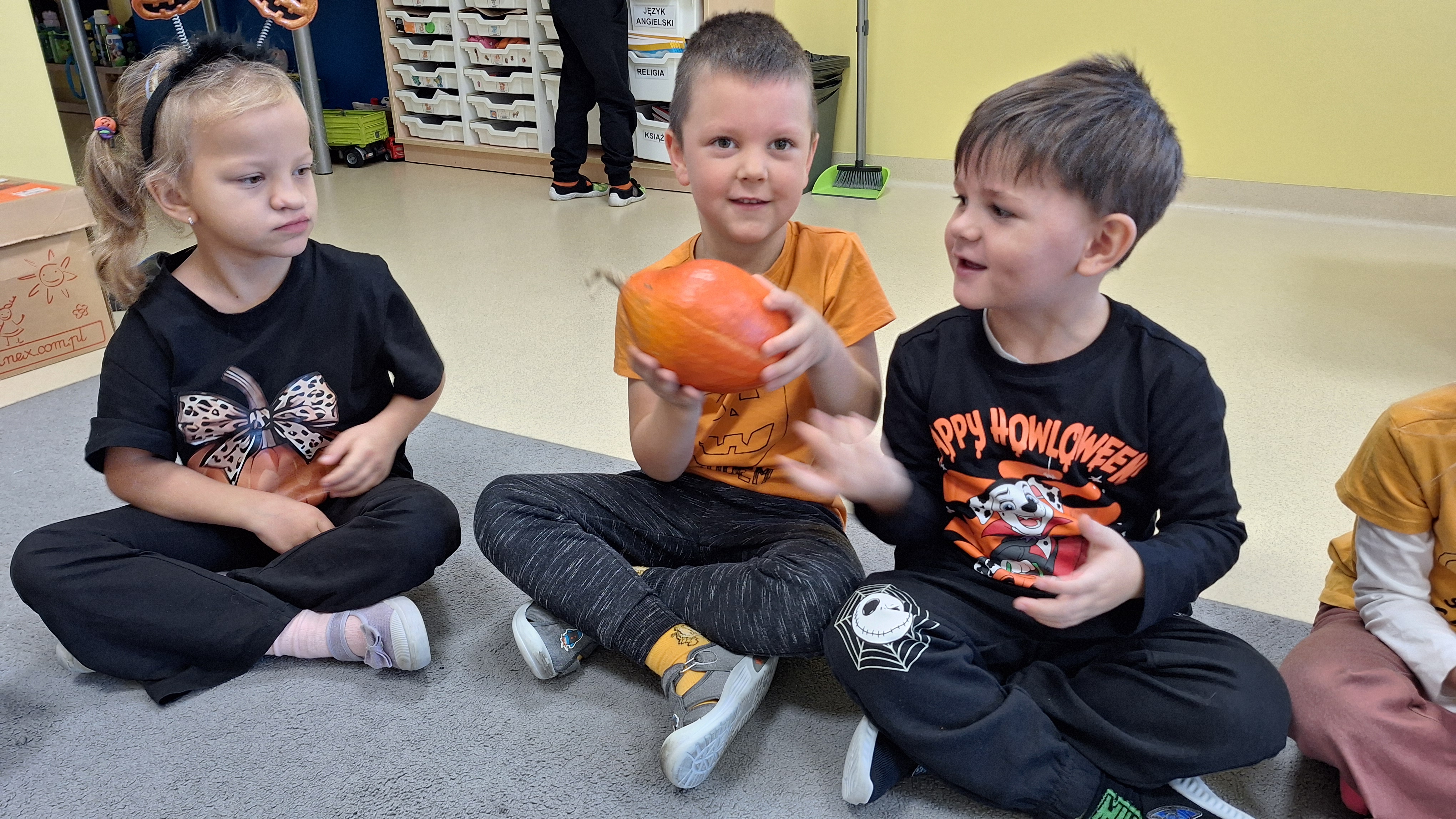 Dnia 31.10.2025 w grupie Żyrafy obchodziliśmy Dzień dyni. Dzieci ubrane na pomarańczowo porównywały wielkości, ciężar, a także układały je w przestrzeni(nad, pod obok). Miały również świetną zabawę przy tworzeniu własnych dyni z masy solnej. Zabawa do piosenki ,, Podaj dynie” sprawiła dzieciom wiele radości i śmiechu. Nie mogliśmy się zatrzymać, na koniec utrwalaliśmy kolory i cyfry podczas kodowania.