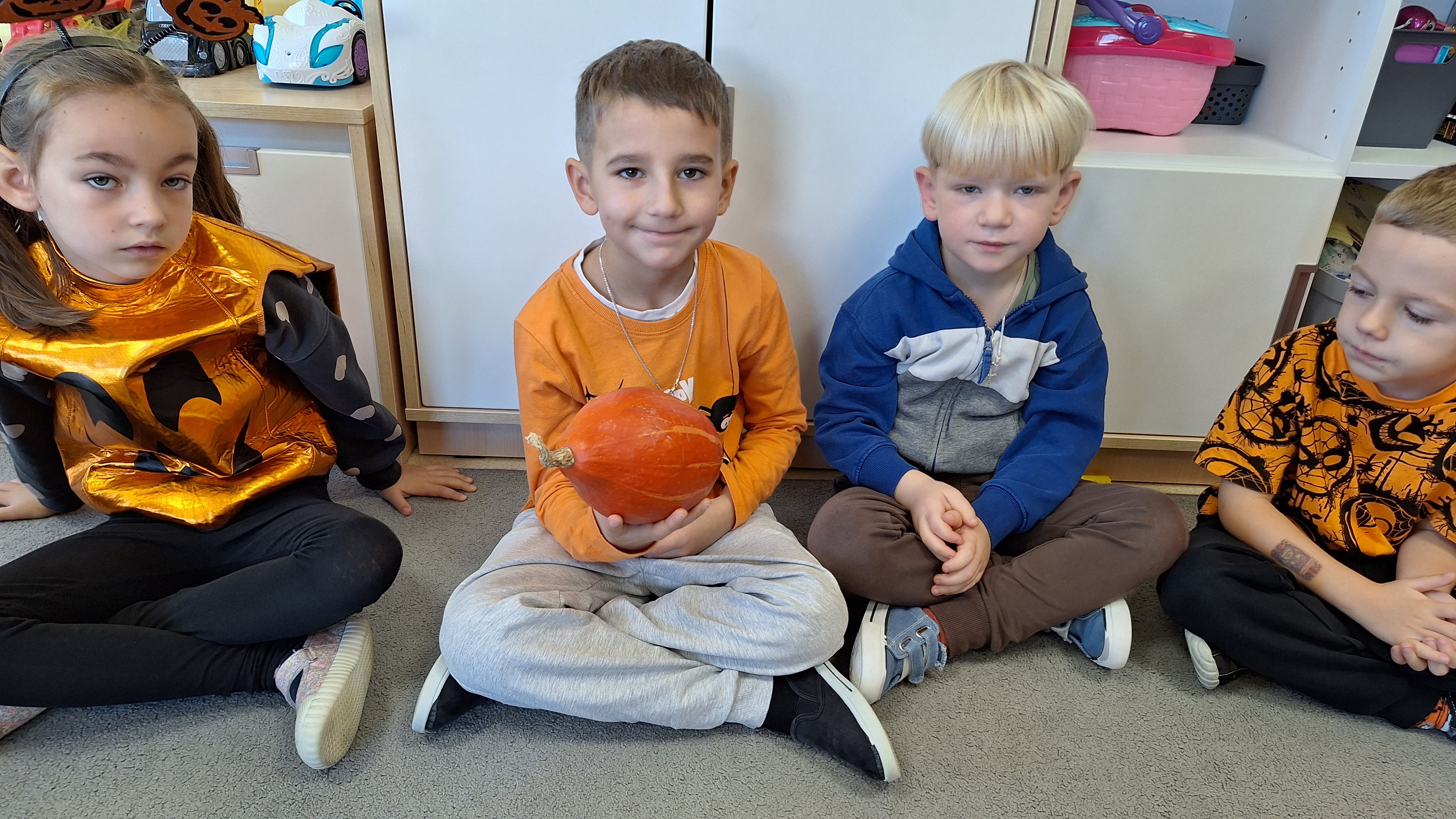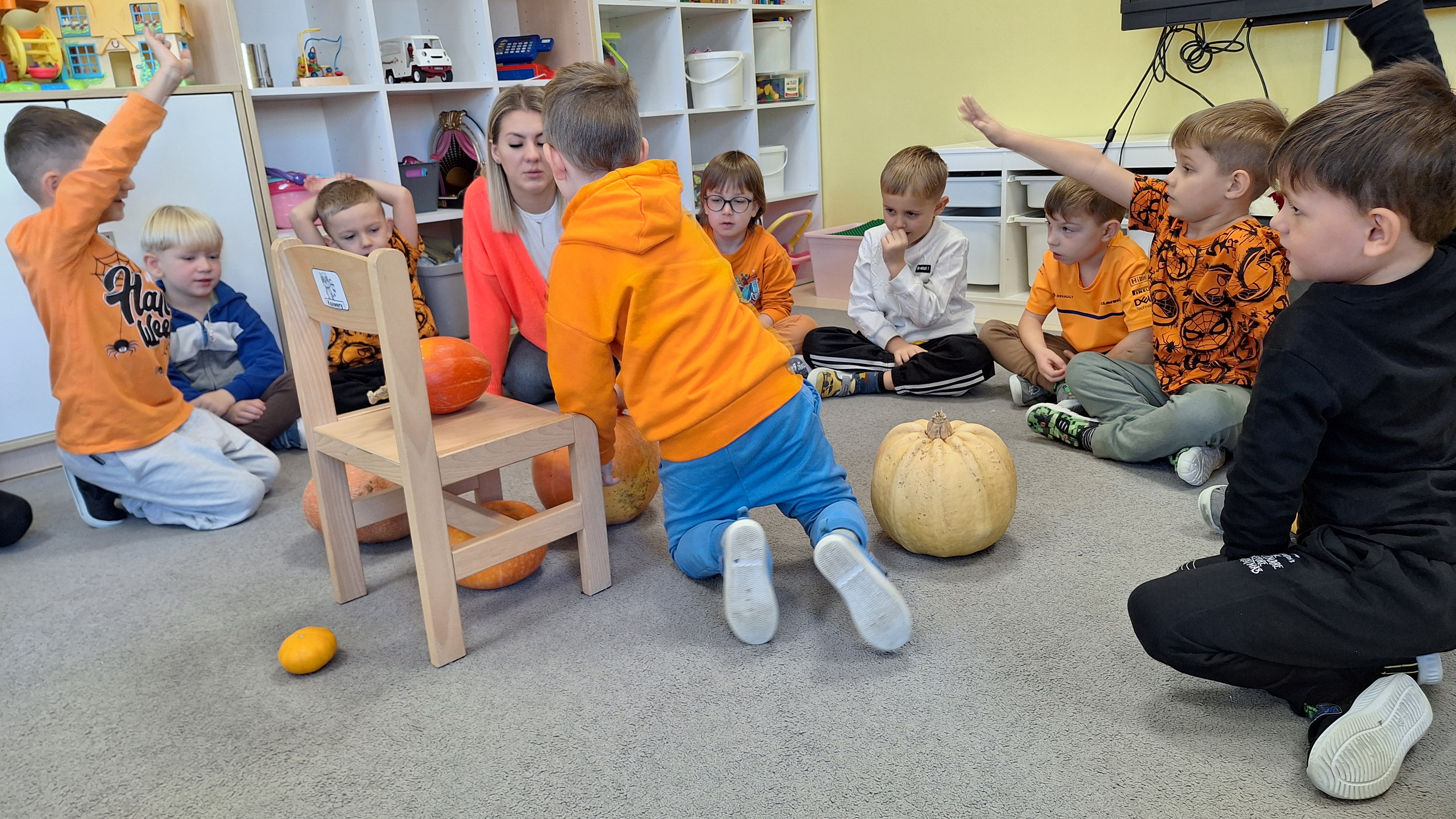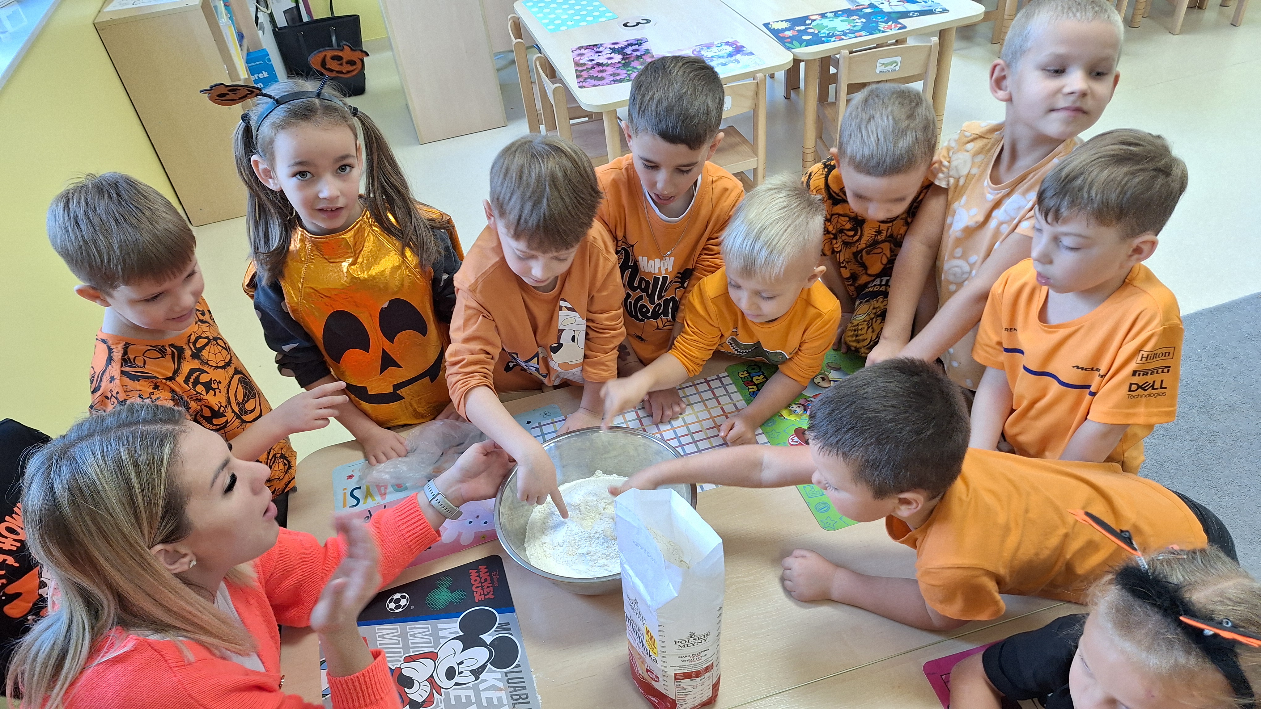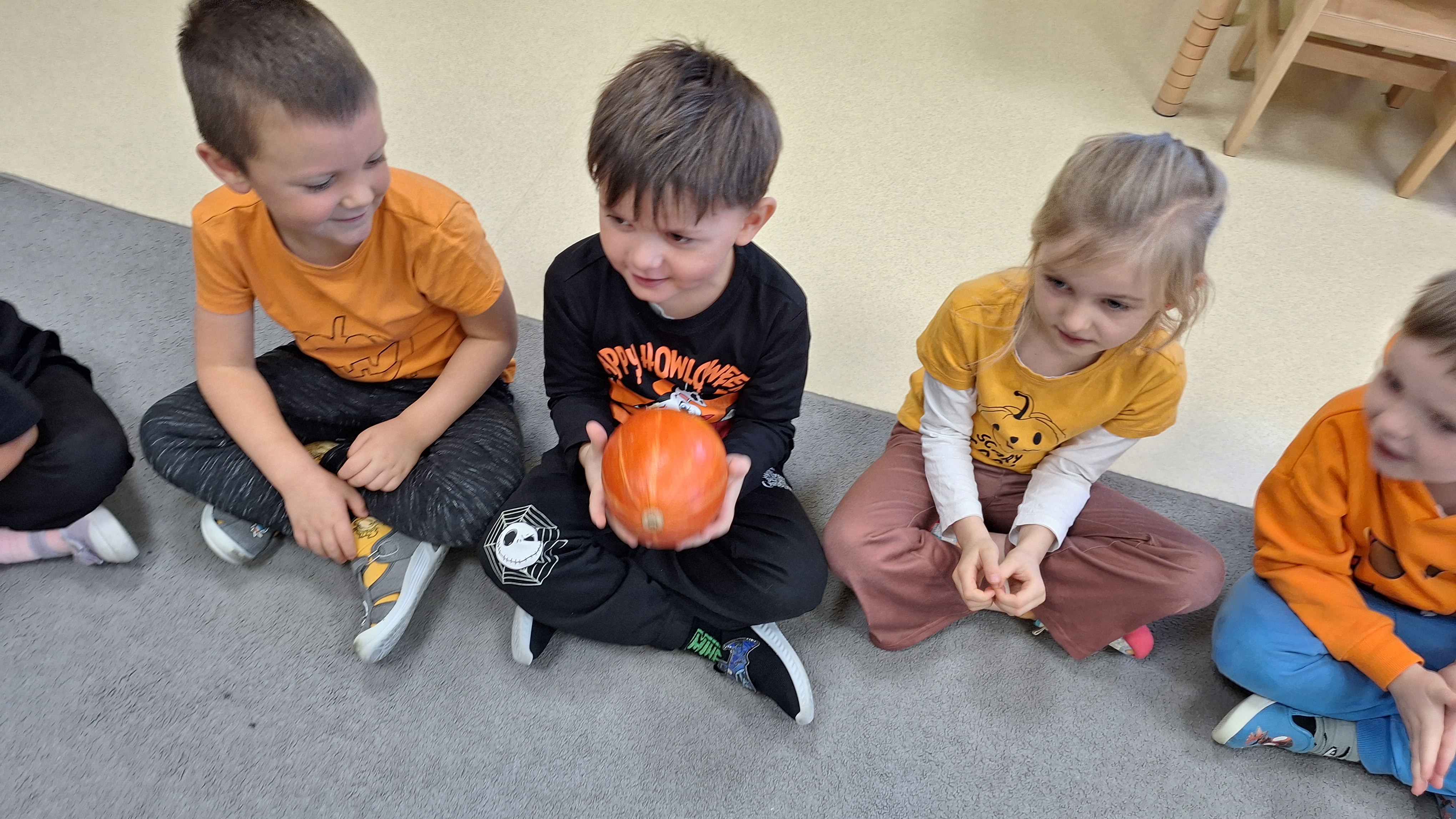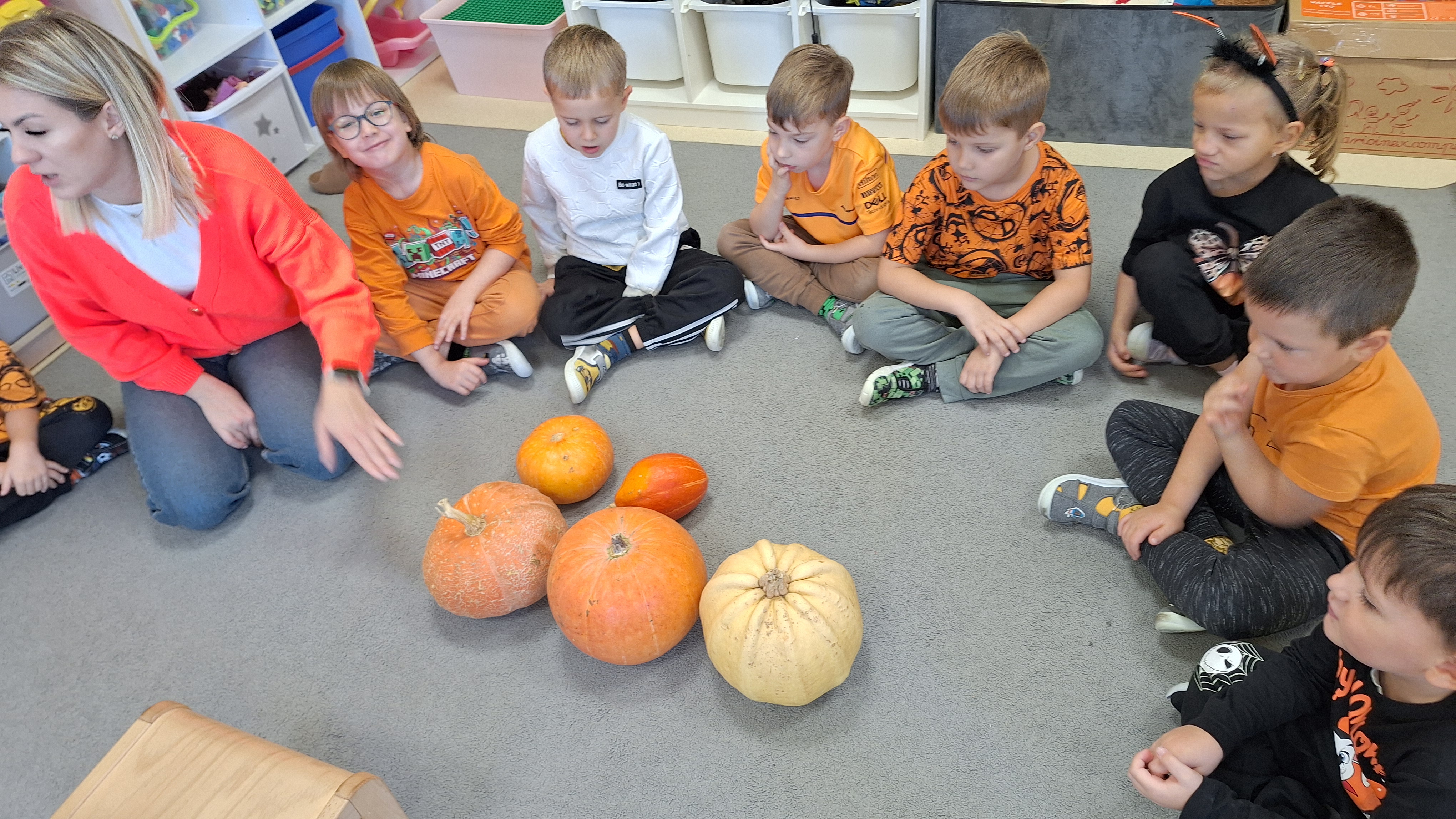 Dnia 31.10.2025 w grupie Żyrafy obchodziliśmy Dzień dyni. Dzieci ubrane na pomarańczowo porównywały wielkości, ciężar, a także układały je w przestrzeni(nad, pod obok). Miały również świetną zabawę przy tworzeniu własnych dyni z masy solnej. Zabawa do piosenki ,, Podaj dynie” sprawiła dzieciom wiele radości i śmiechu. Nie mogliśmy się zatrzymać, na koniec utrwalaliśmy kolory i cyfry podczas kodowania.