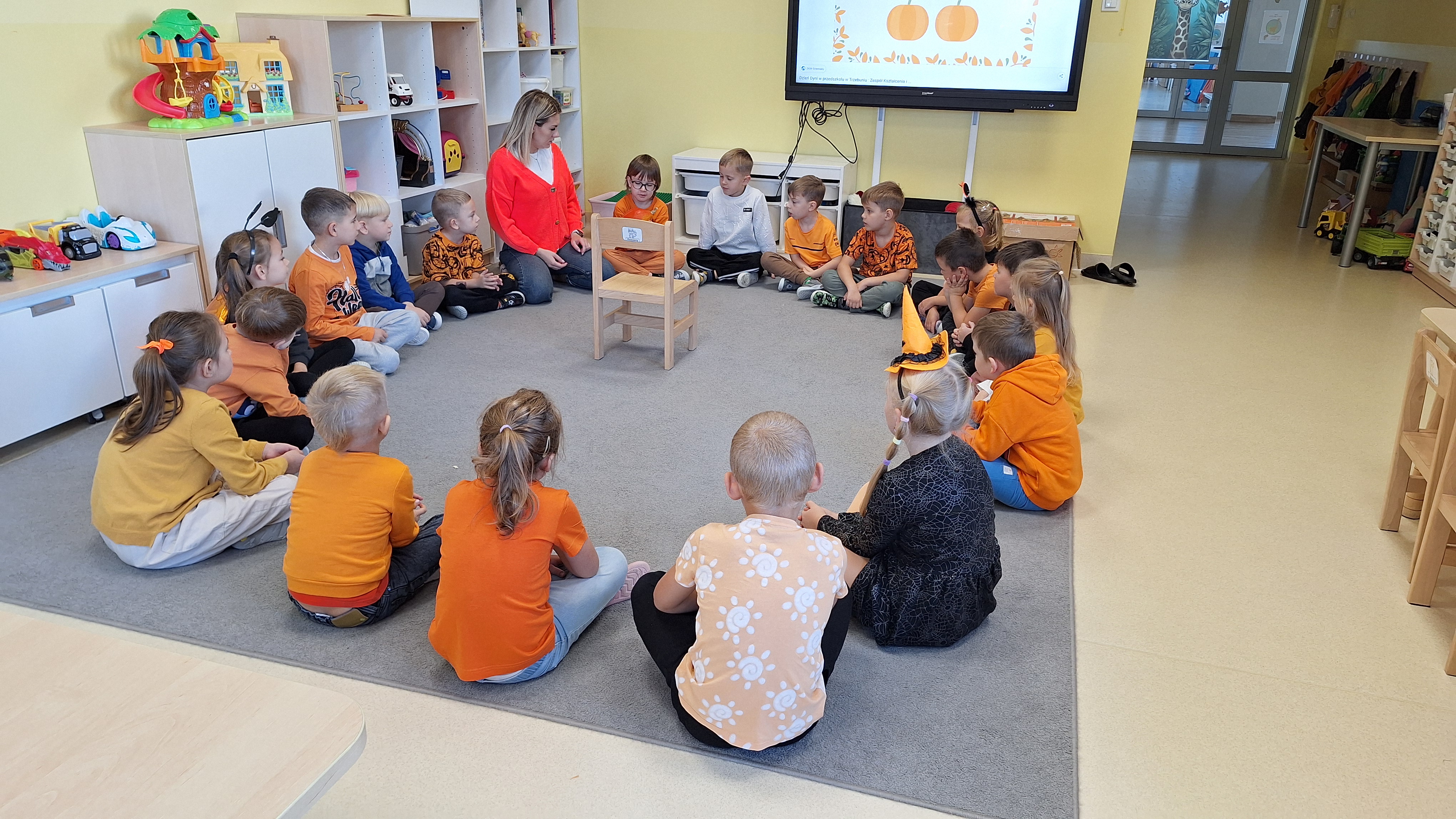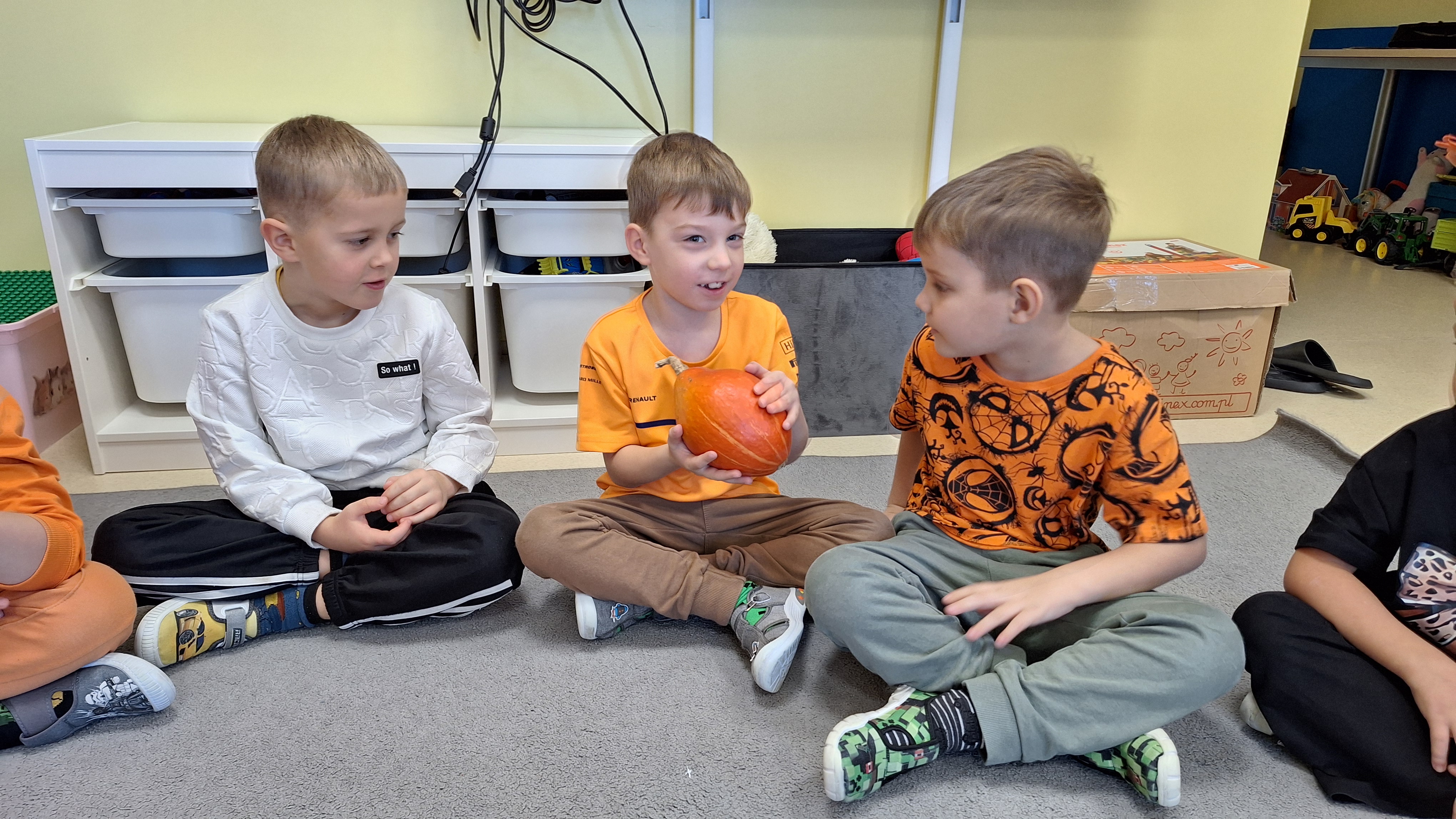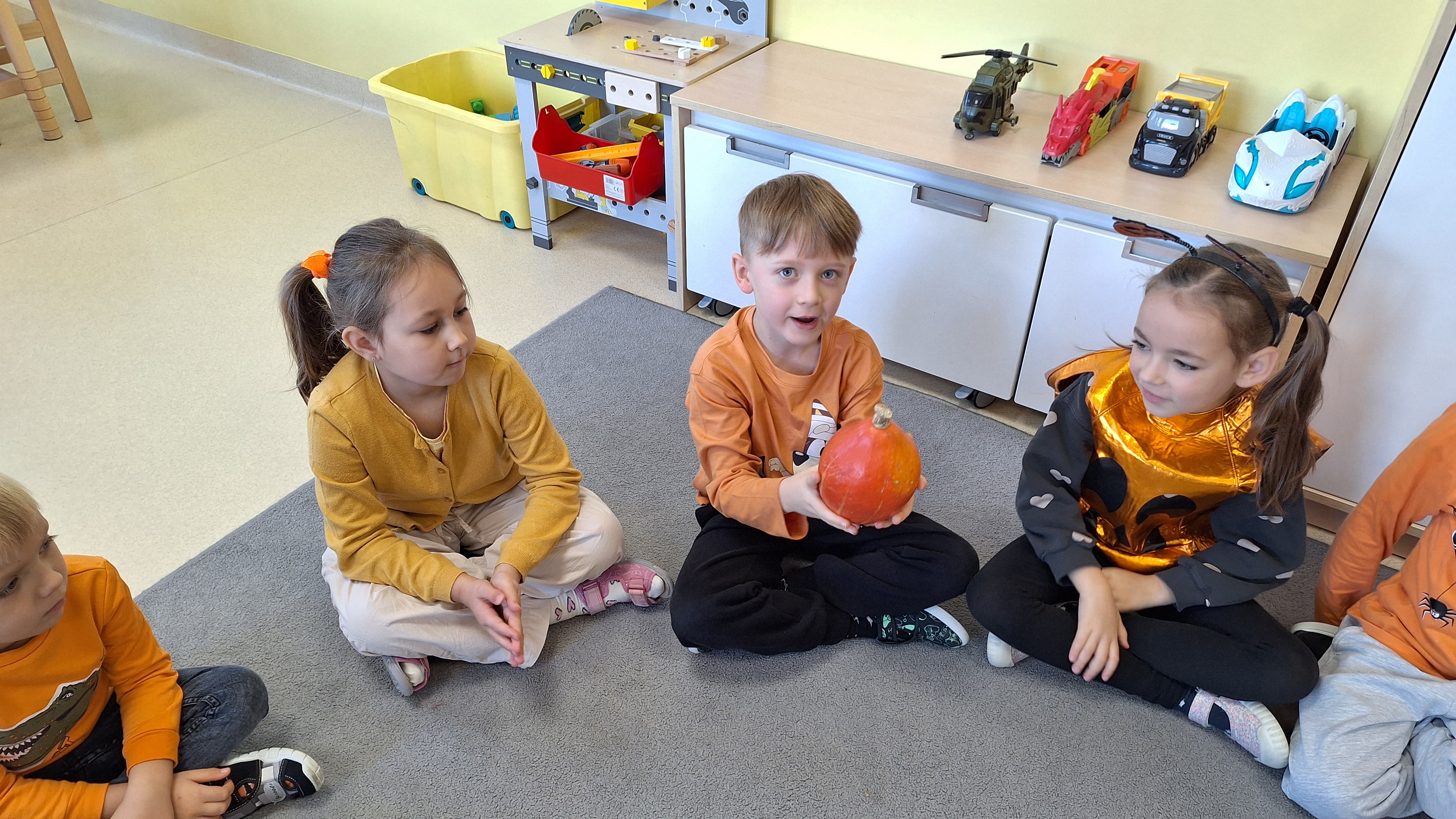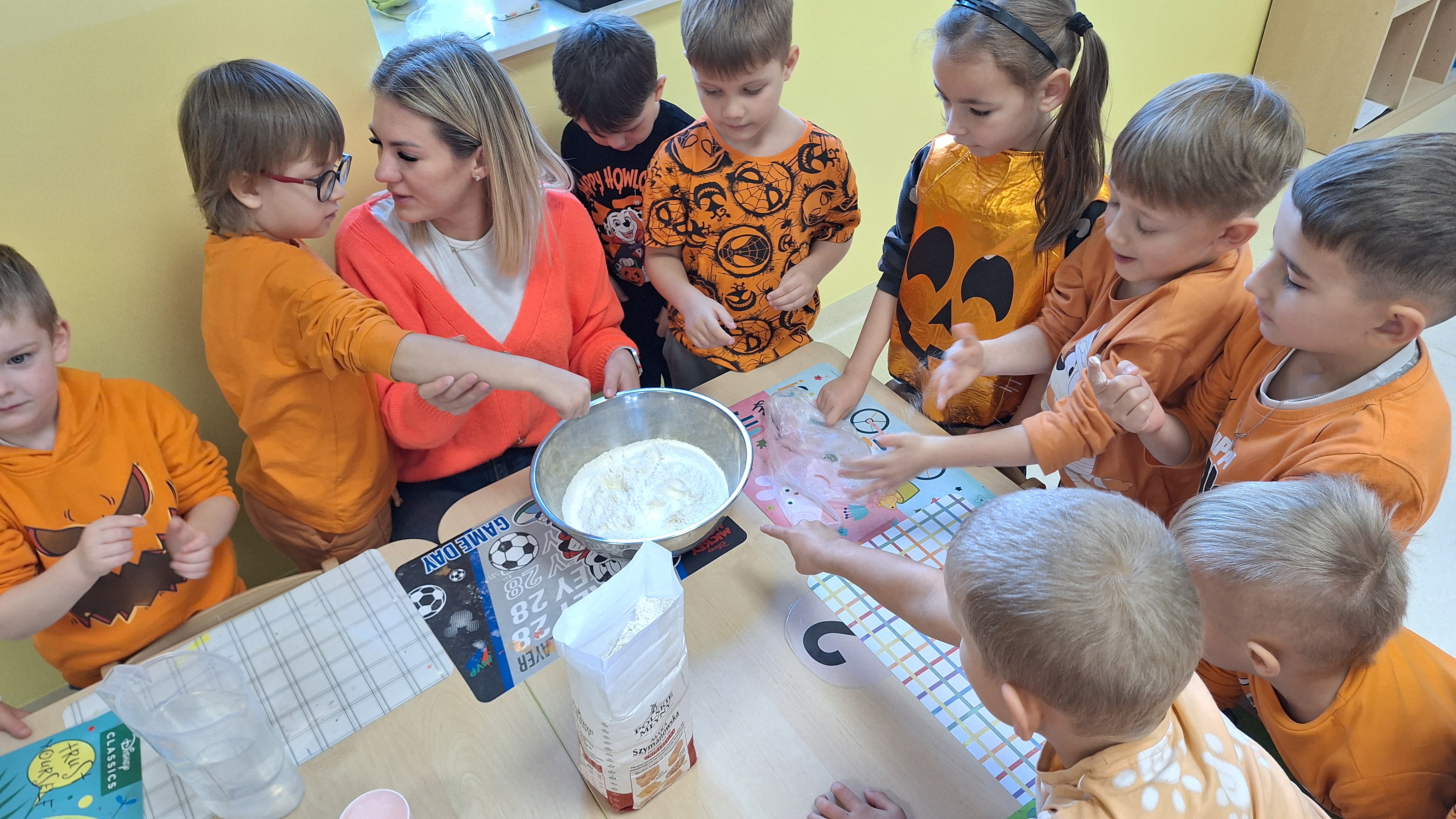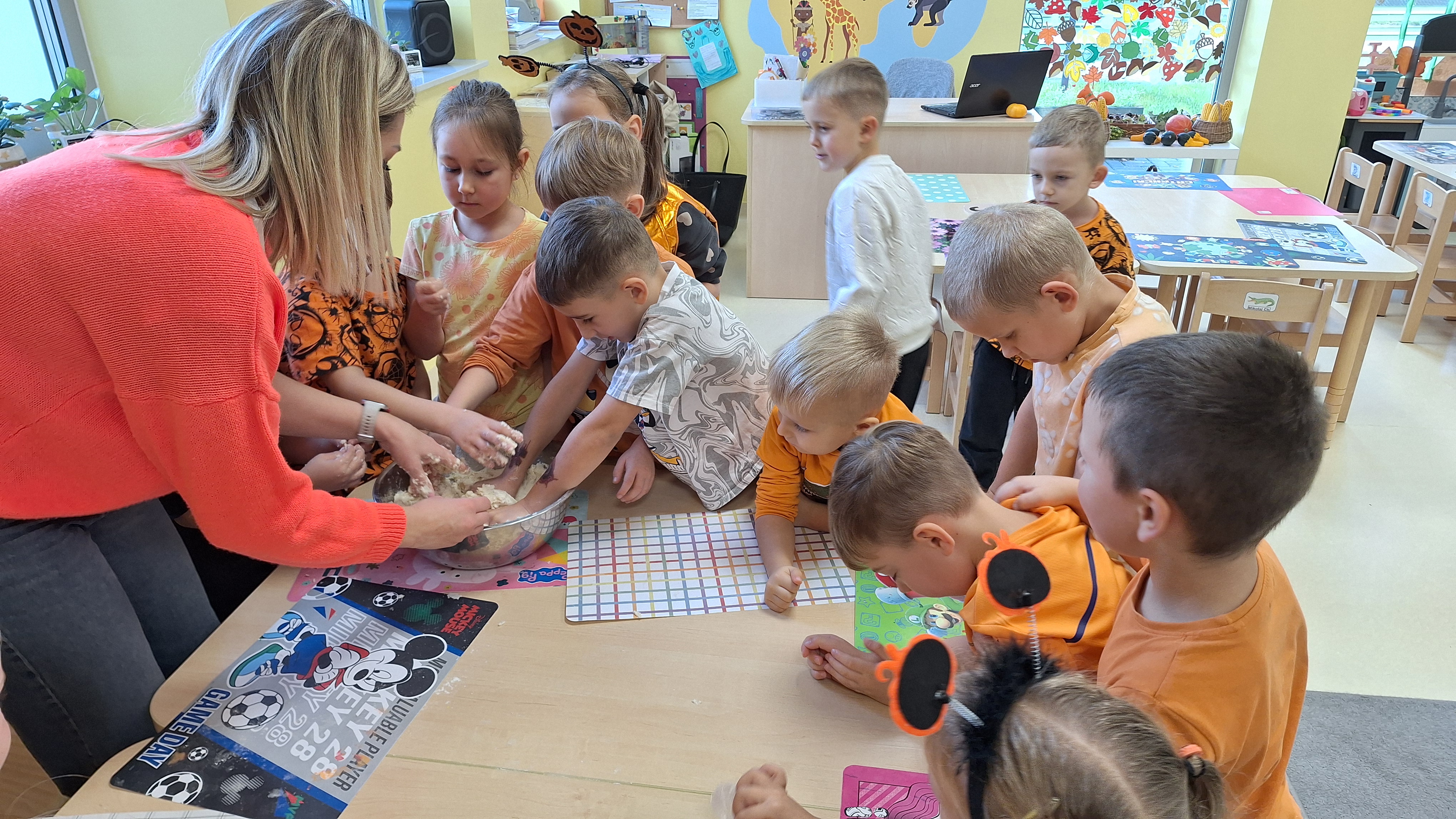 Dnia 31.10.2025 w grupie Żyrafy obchodziliśmy Dzień dyni. Dzieci ubrane na pomarańczowo porównywały wielkości, ciężar, a także układały je w przestrzeni(nad, pod obok). Miały również świetną zabawę przy tworzeniu własnych dyni z masy solnej. Zabawa do piosenki ,, Podaj dynie” sprawiła dzieciom wiele radości i śmiechu. Nie mogliśmy się zatrzymać, na koniec utrwalaliśmy kolory i cyfry podczas kodowania.