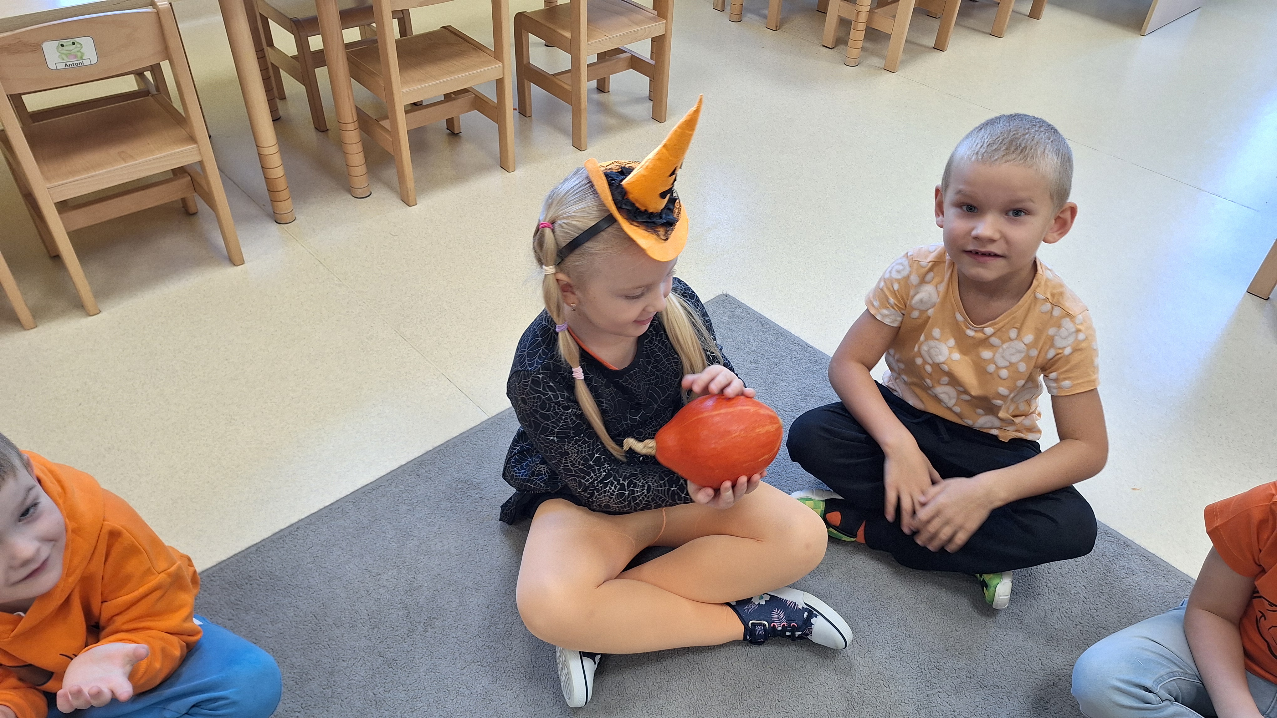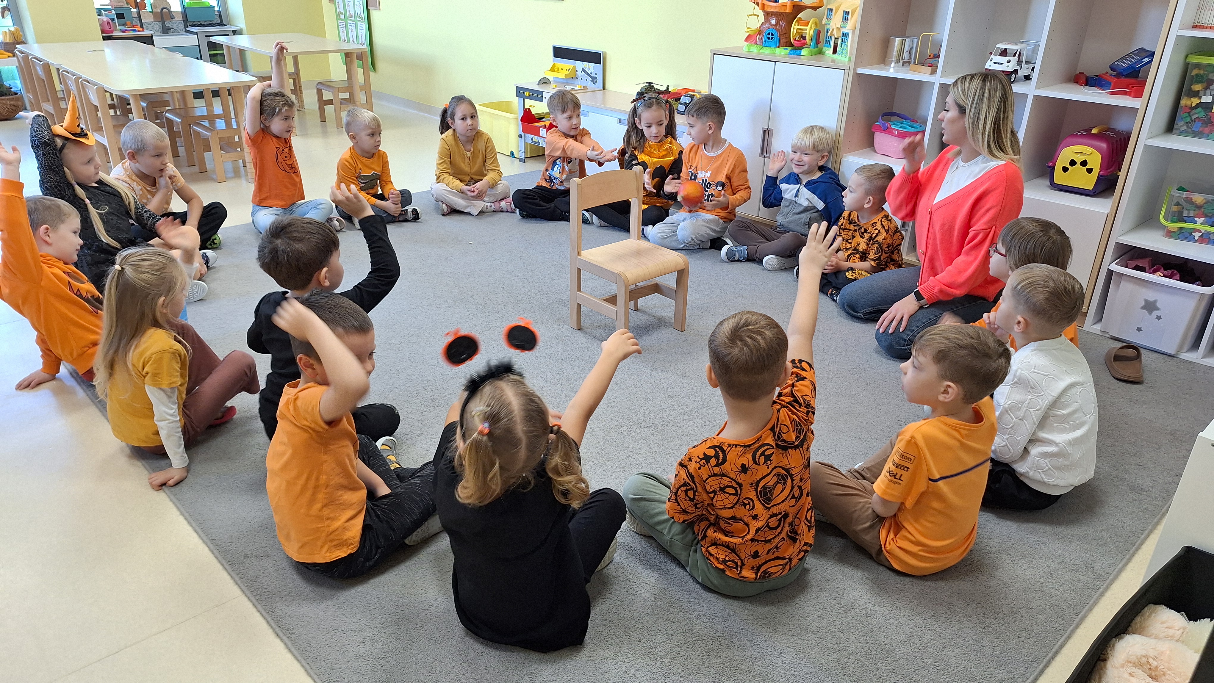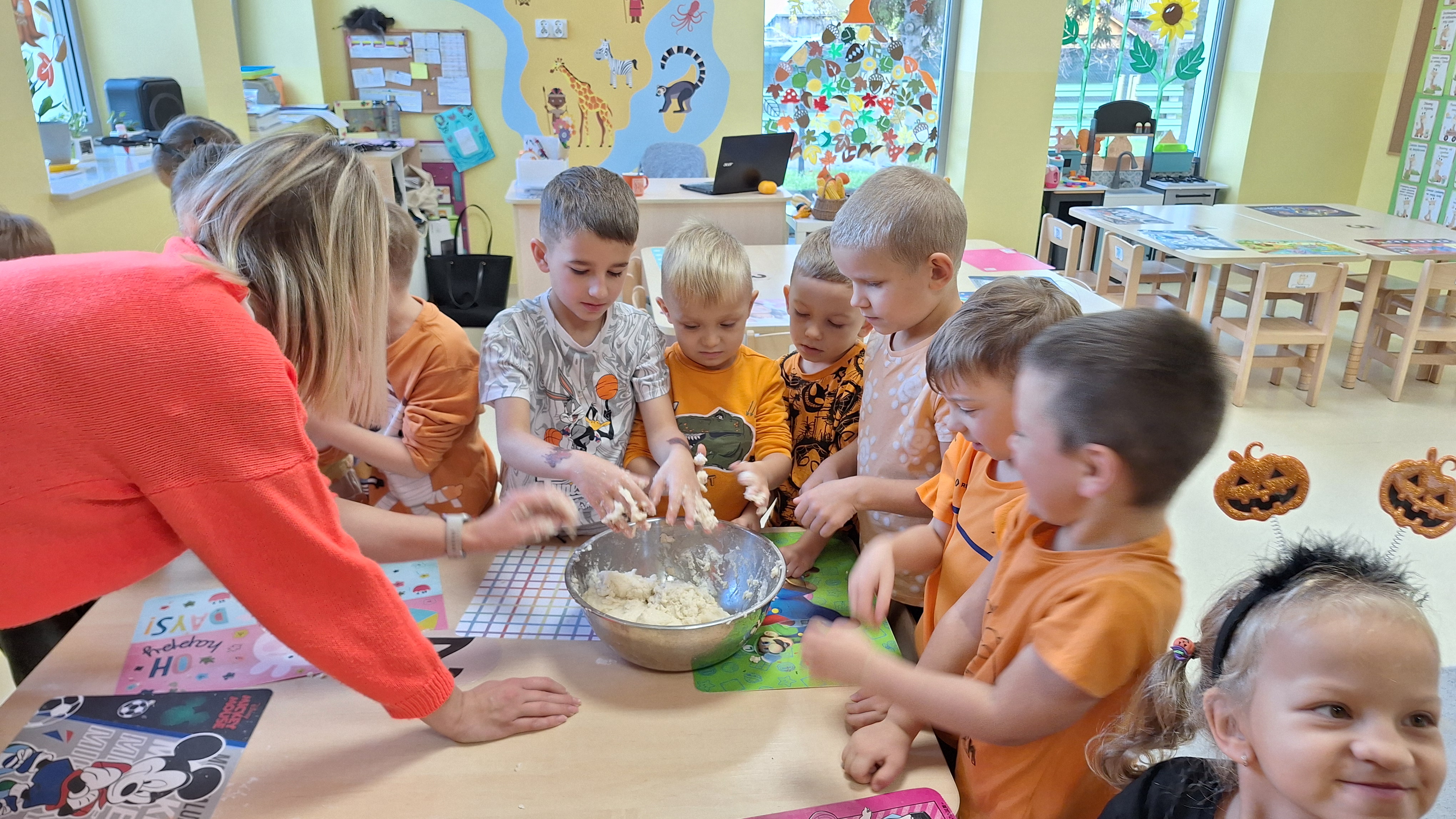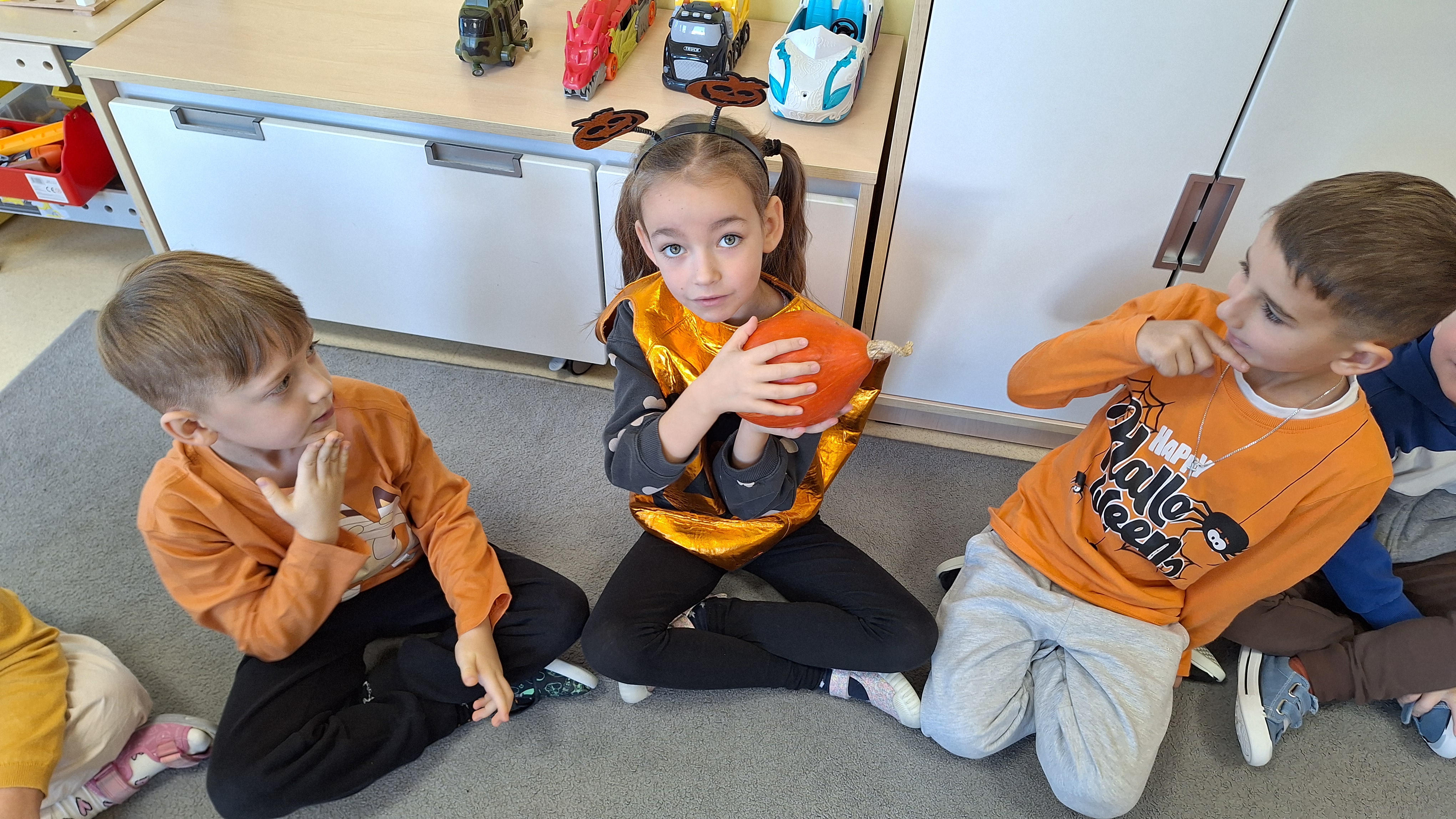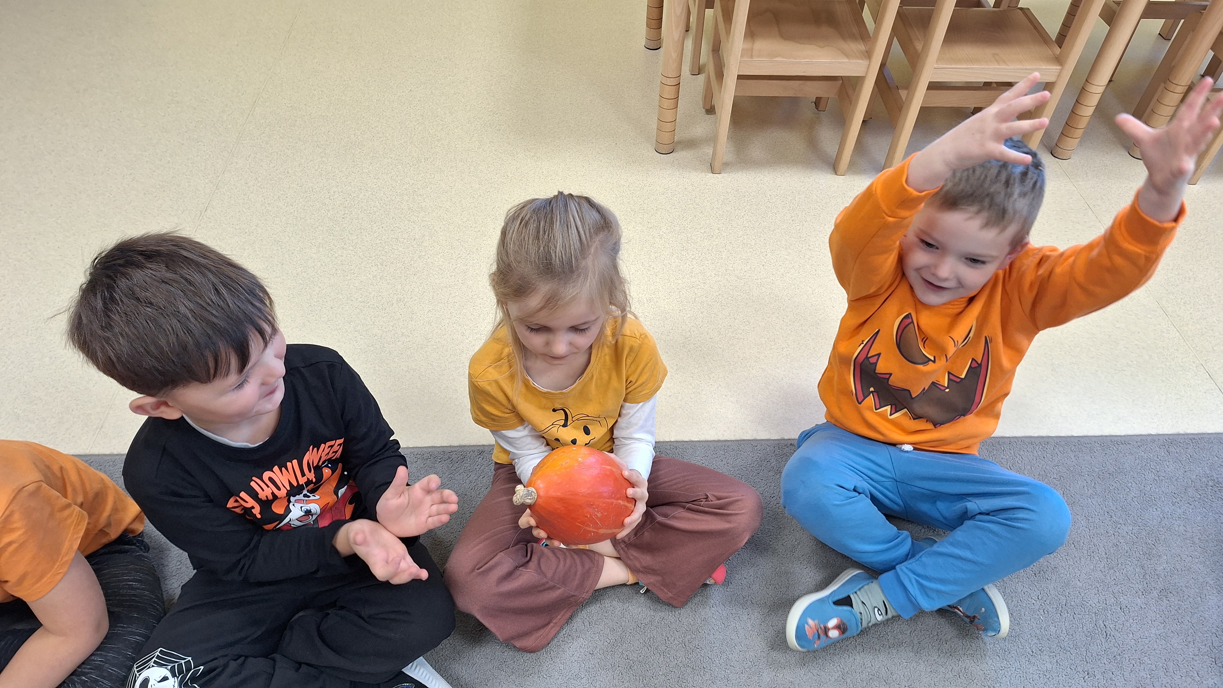 Dnia 31.10.2025 w grupie Żyrafy obchodziliśmy Dzień dyni. Dzieci ubrane na pomarańczowo porównywały wielkości, ciężar, a także układały je w przestrzeni(nad, pod obok). Miały również świetną zabawę przy tworzeniu własnych dyni z masy solnej. Zabawa do piosenki ,, Podaj dynie” sprawiła dzieciom wiele radości i śmiechu. Nie mogliśmy się zatrzymać, na koniec utrwalaliśmy kolory i cyfry podczas kodowania.