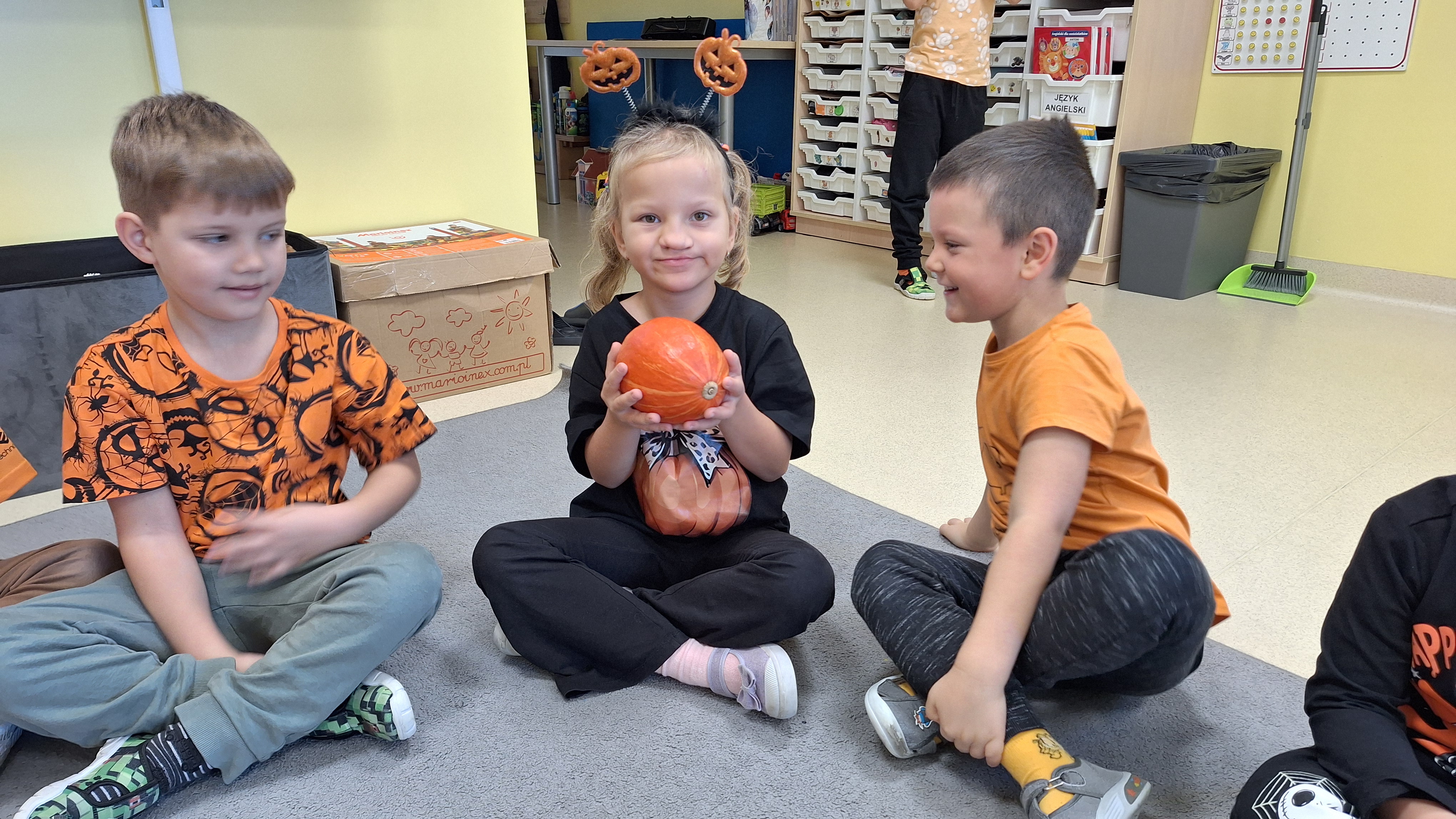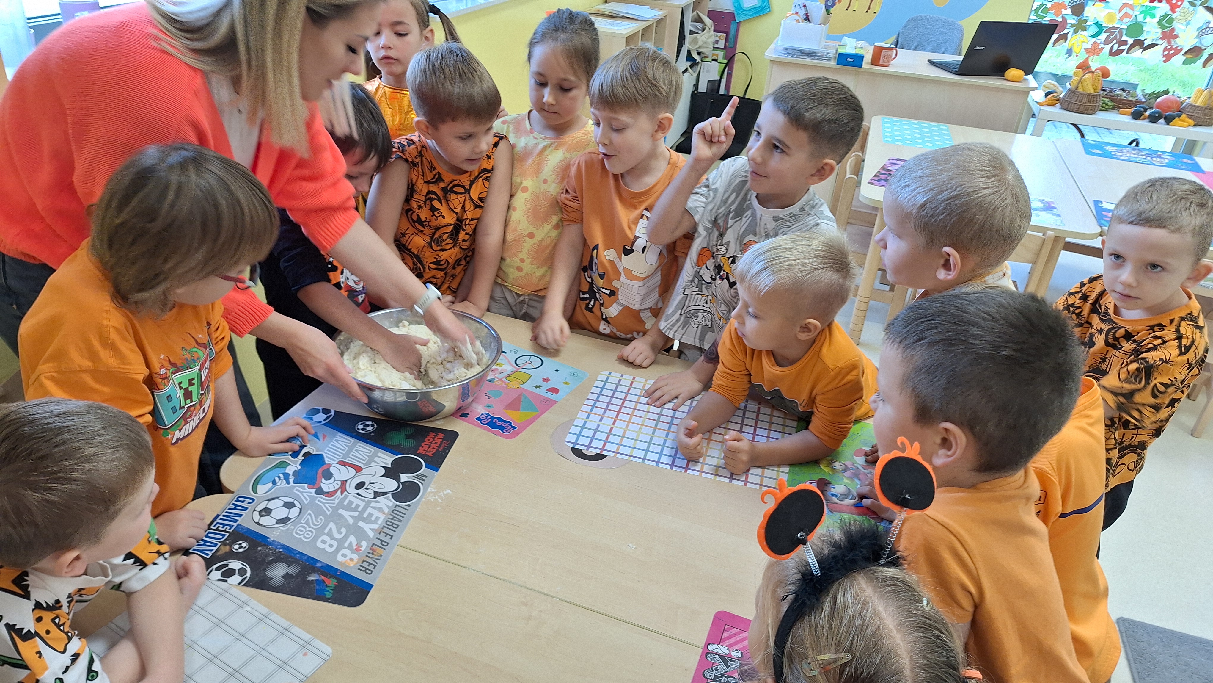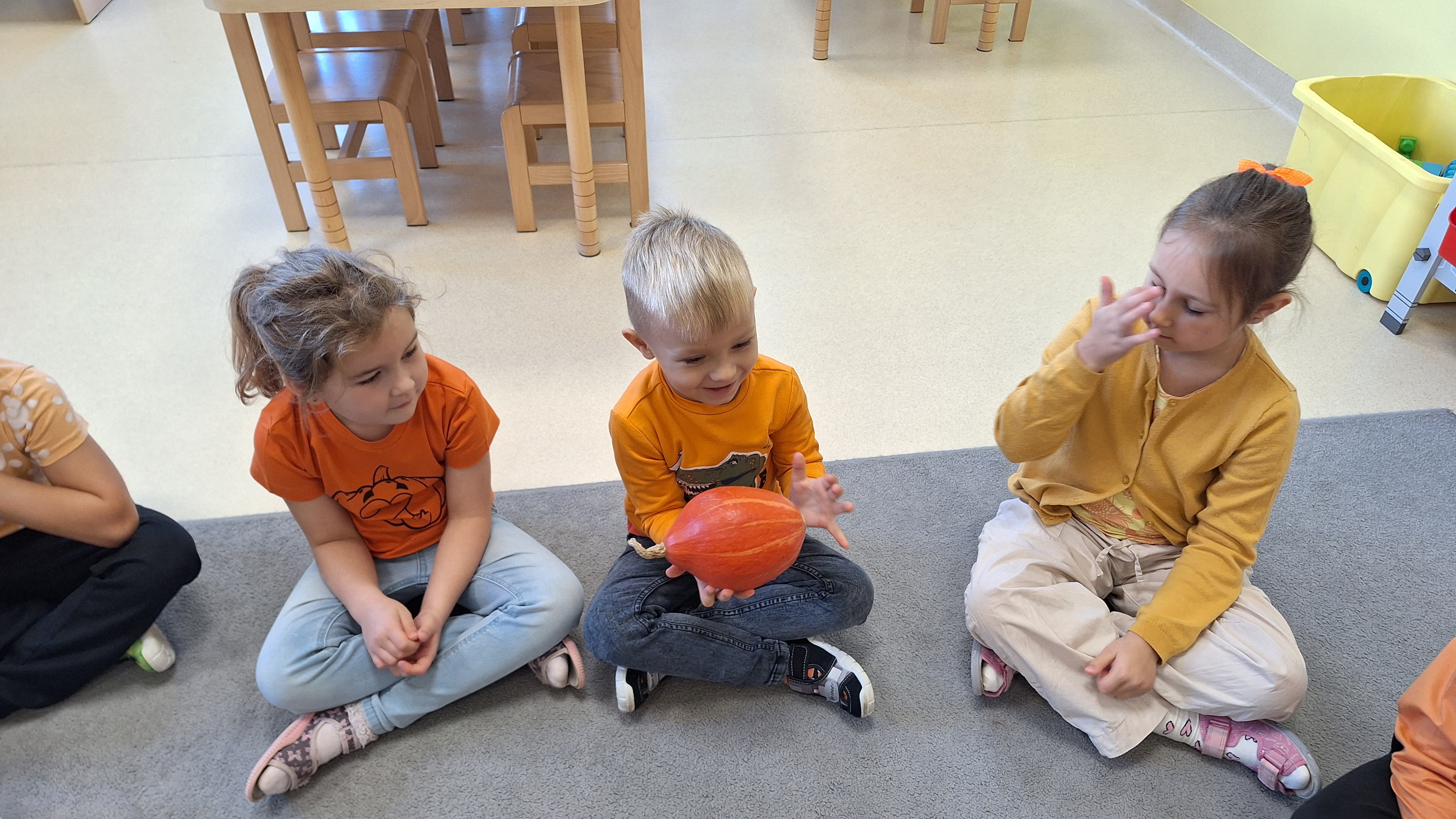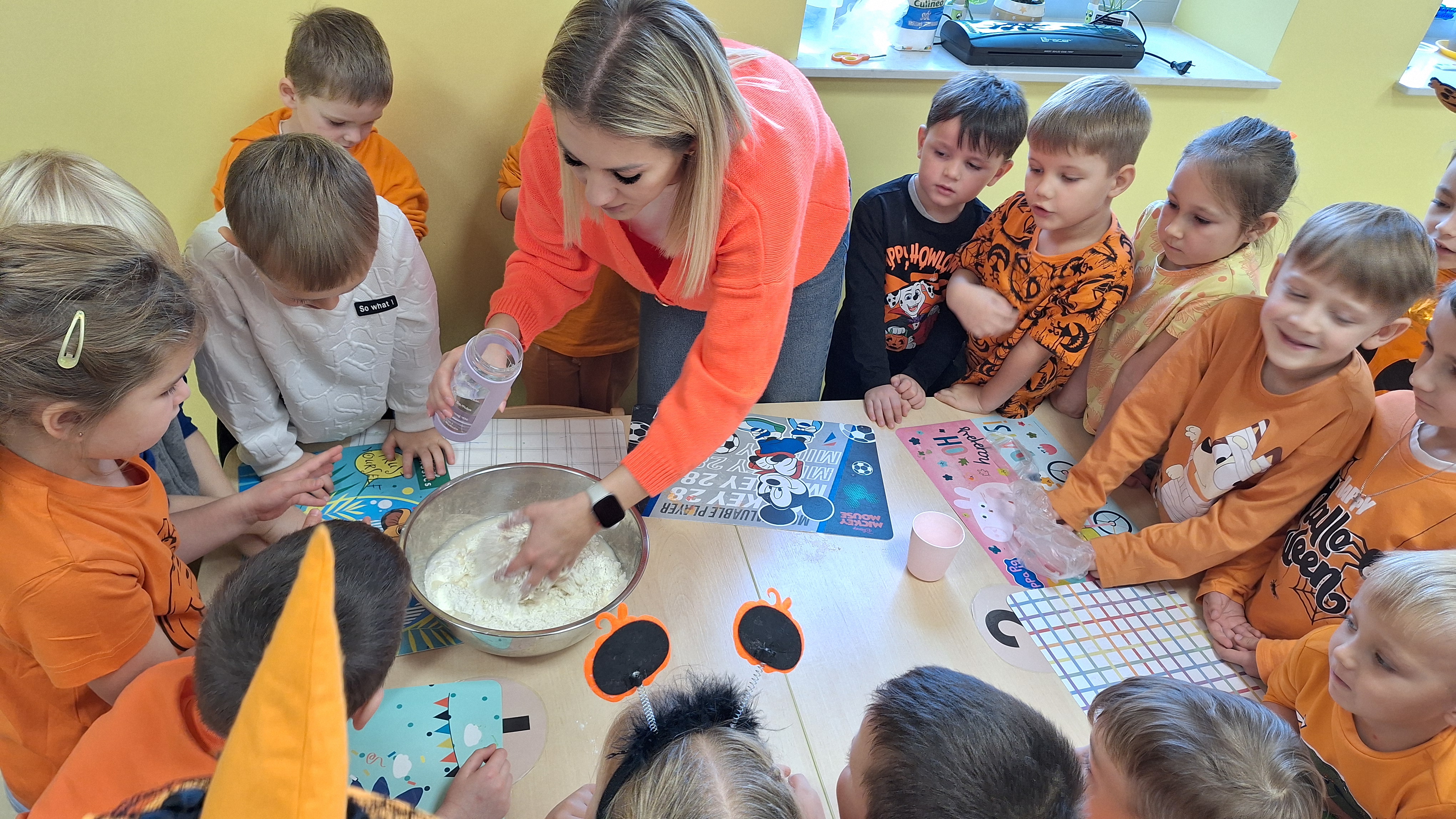 Dnia 31.10.2025 w grupie Żyrafy obchodziliśmy Dzień dyni. Dzieci ubrane na pomarańczowo porównywały wielkości, ciężar, a także układały je w przestrzeni(nad, pod obok). Miały również świetną zabawę przy tworzeniu własnych dyni z masy solnej. Zabawa do piosenki ,, Podaj dynie” sprawiła dzieciom wiele radości i śmiechu. Nie mogliśmy się zatrzymać, na koniec utrwalaliśmy kolory i cyfry podczas kodowania.