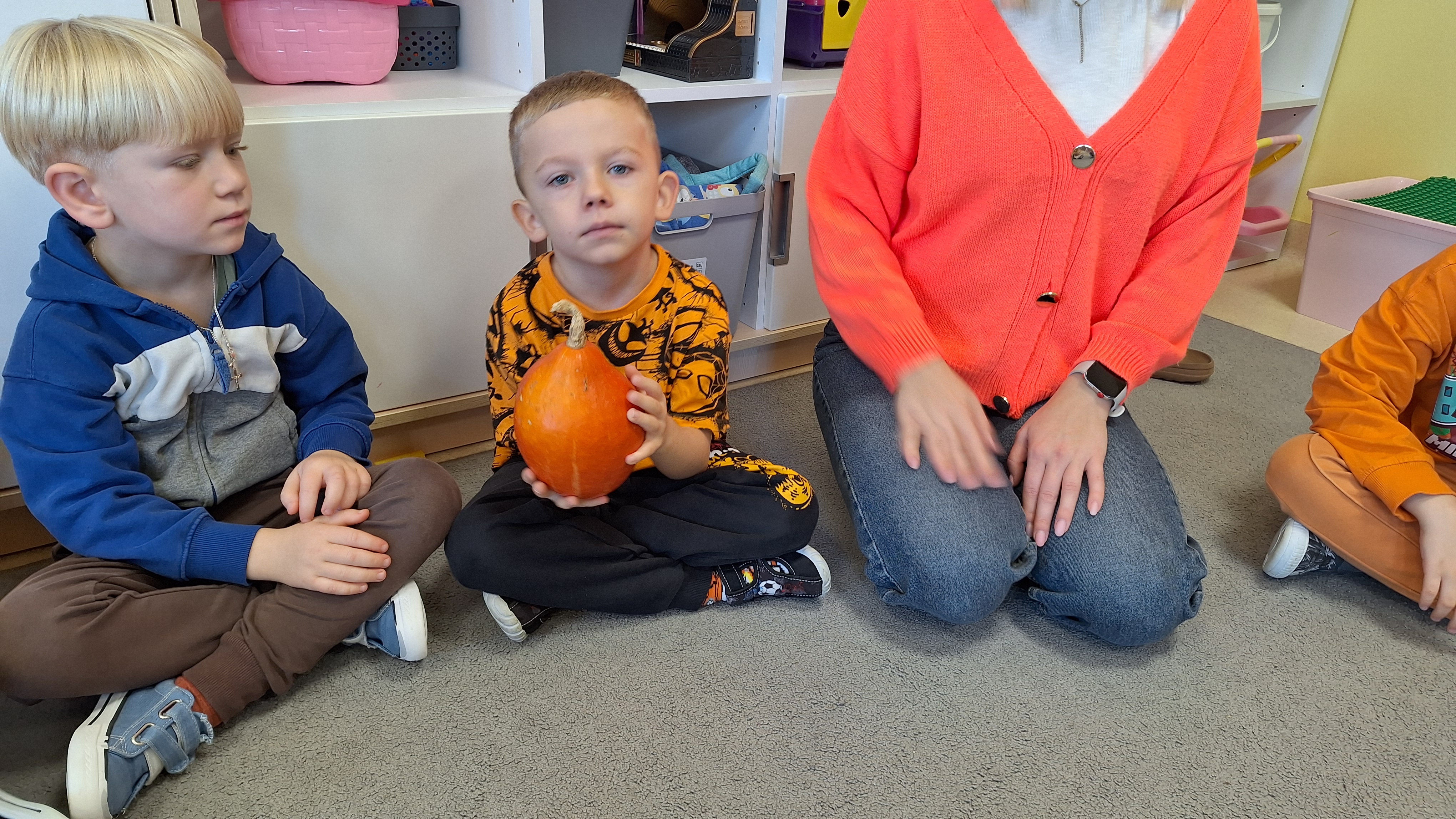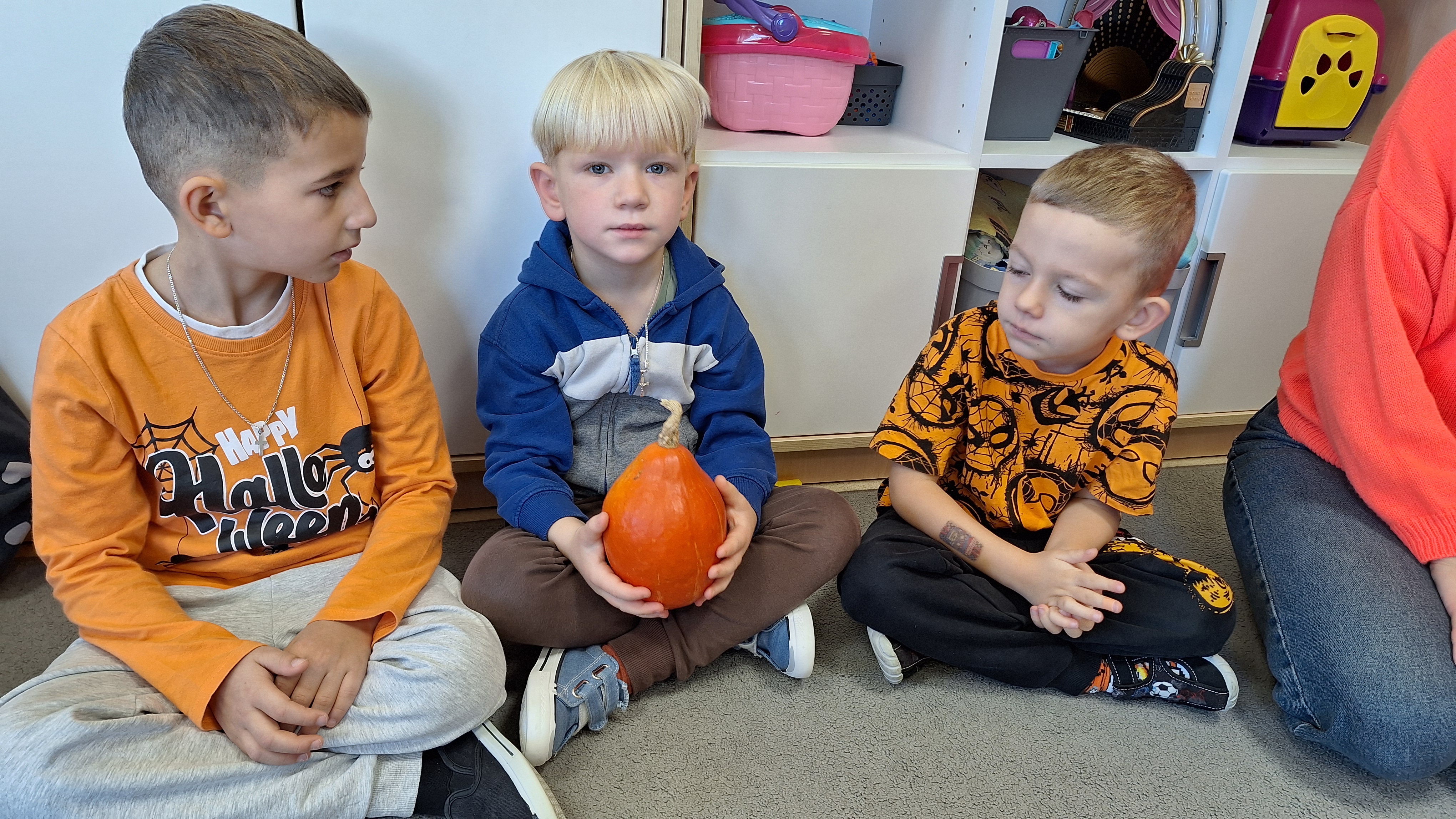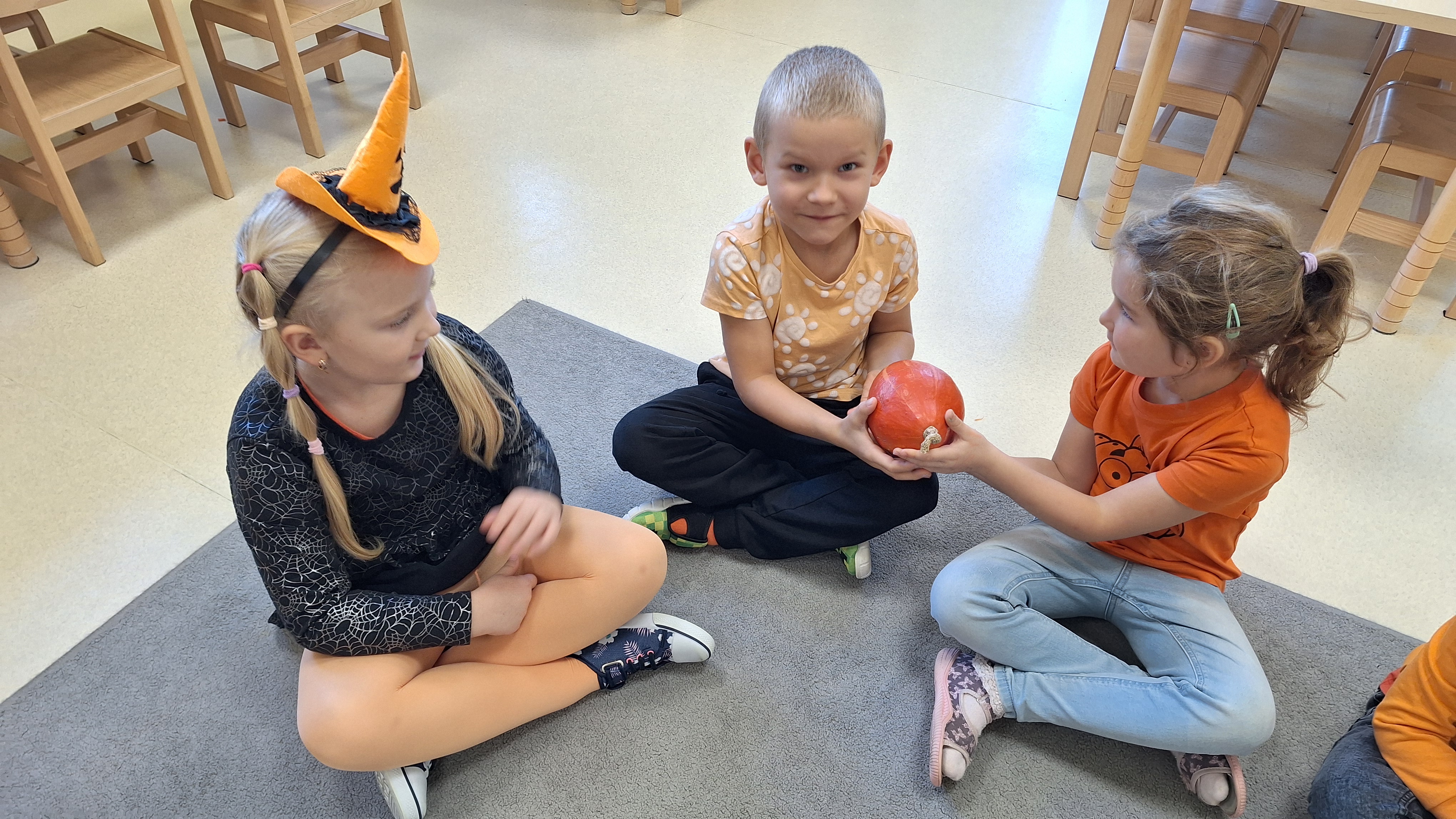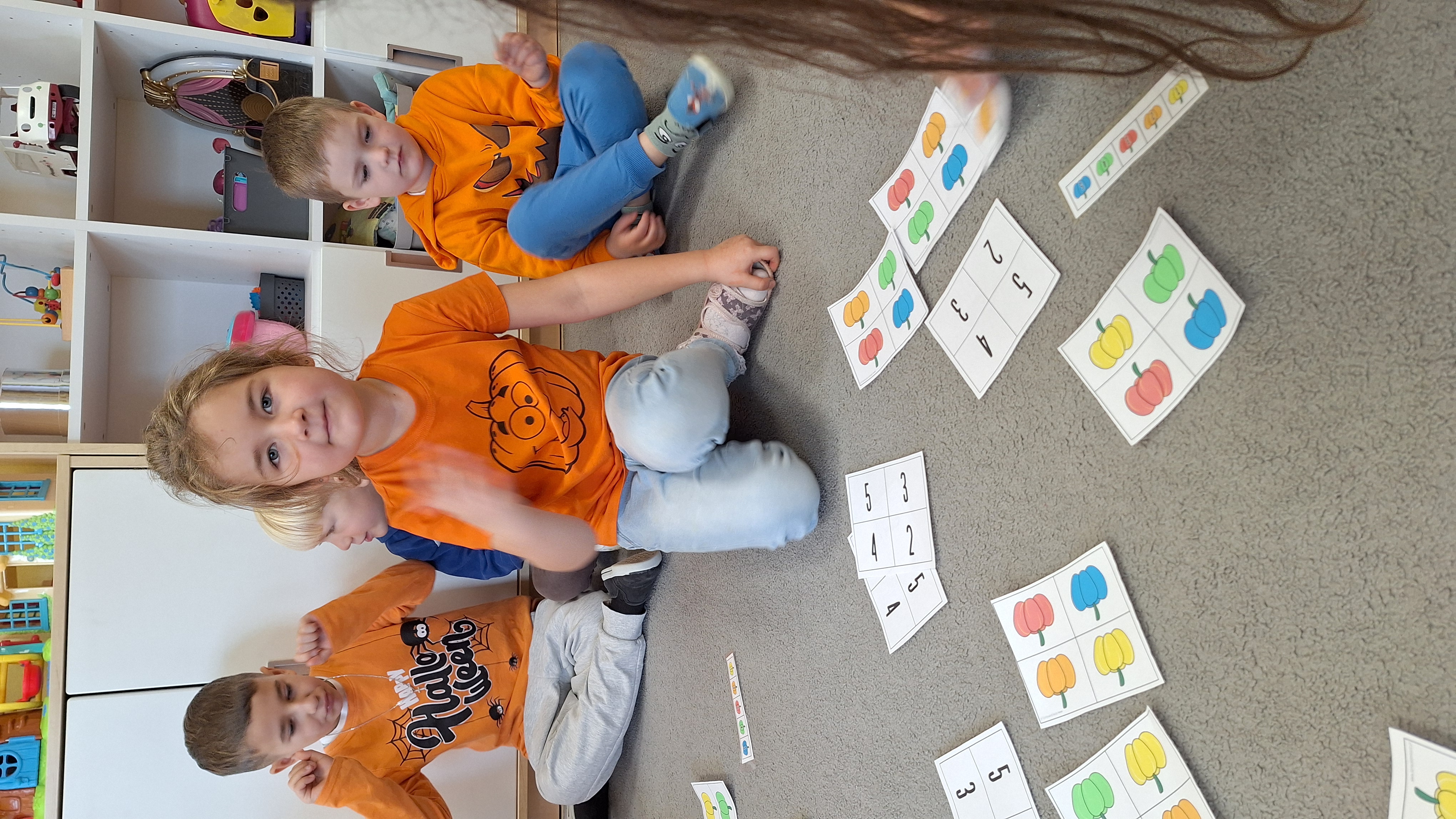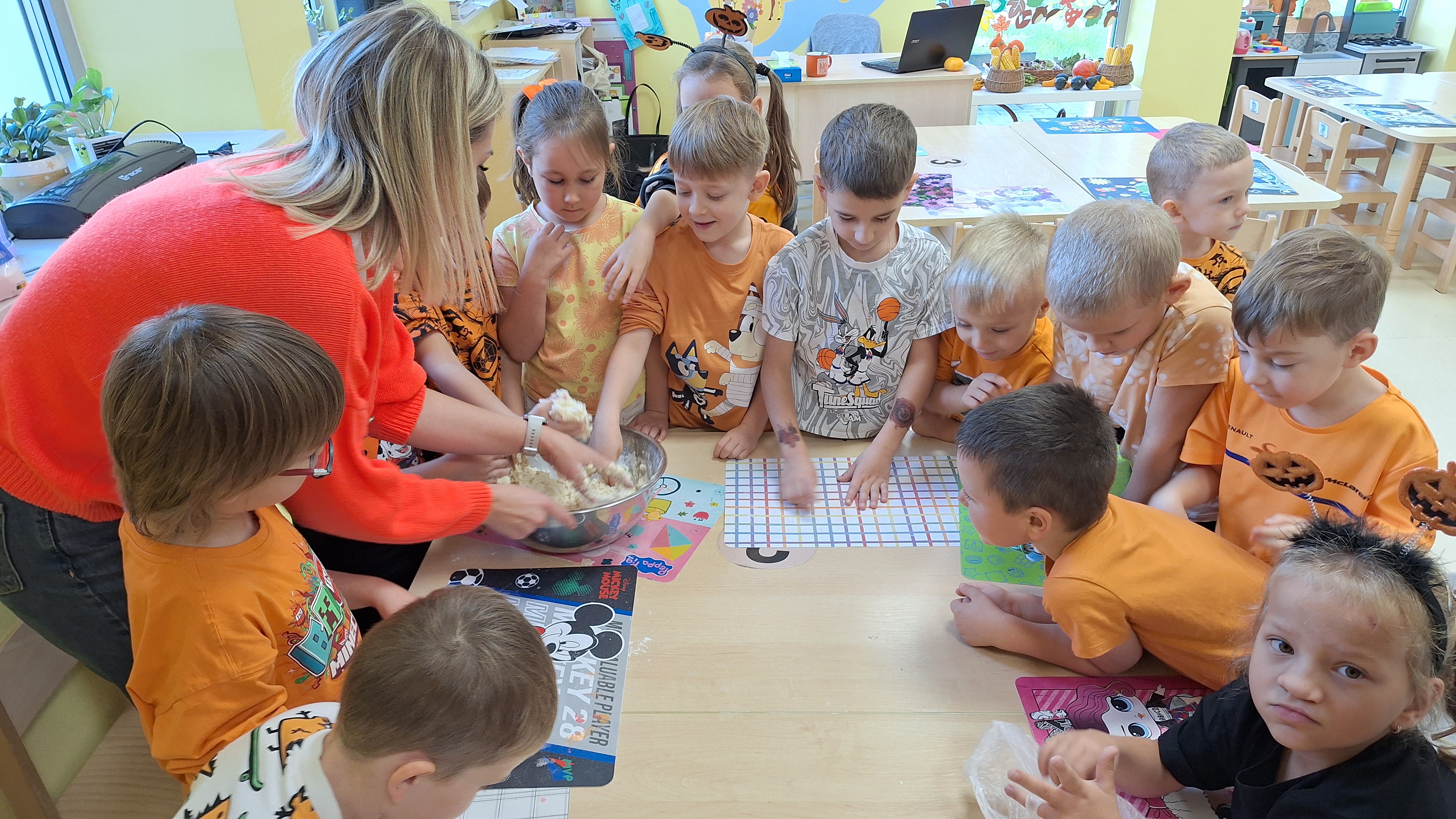 Dnia 31.10.2025 w grupie Żyrafy obchodziliśmy Dzień dyni. Dzieci ubrane na pomarańczowo porównywały wielkości, ciężar, a także układały je w przestrzeni(nad, pod obok). Miały również świetną zabawę przy tworzeniu własnych dyni z masy solnej. Zabawa do piosenki ,, Podaj dynie” sprawiła dzieciom wiele radości i śmiechu. Nie mogliśmy się zatrzymać, na koniec utrwalaliśmy kolory i cyfry podczas kodowania.