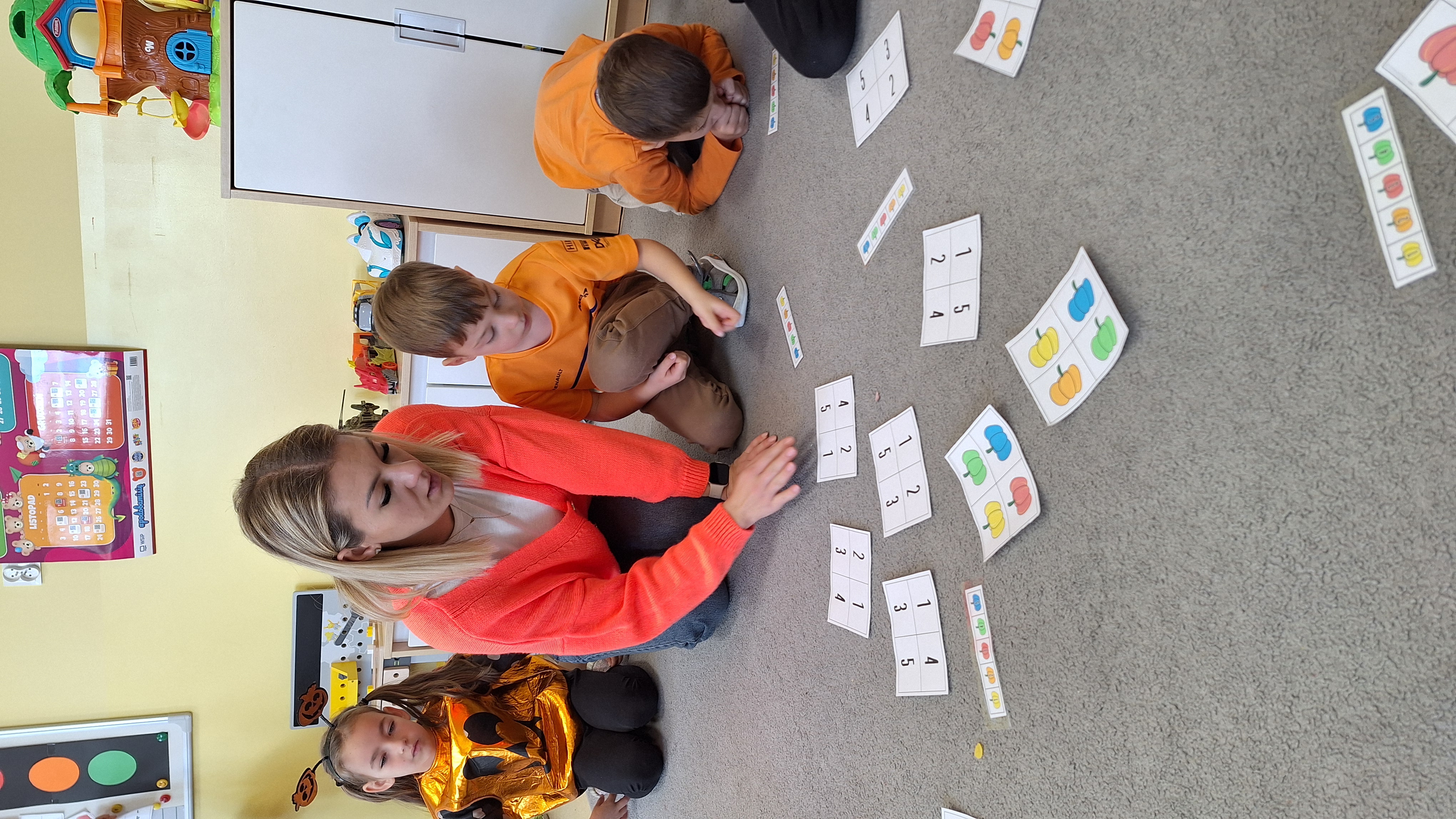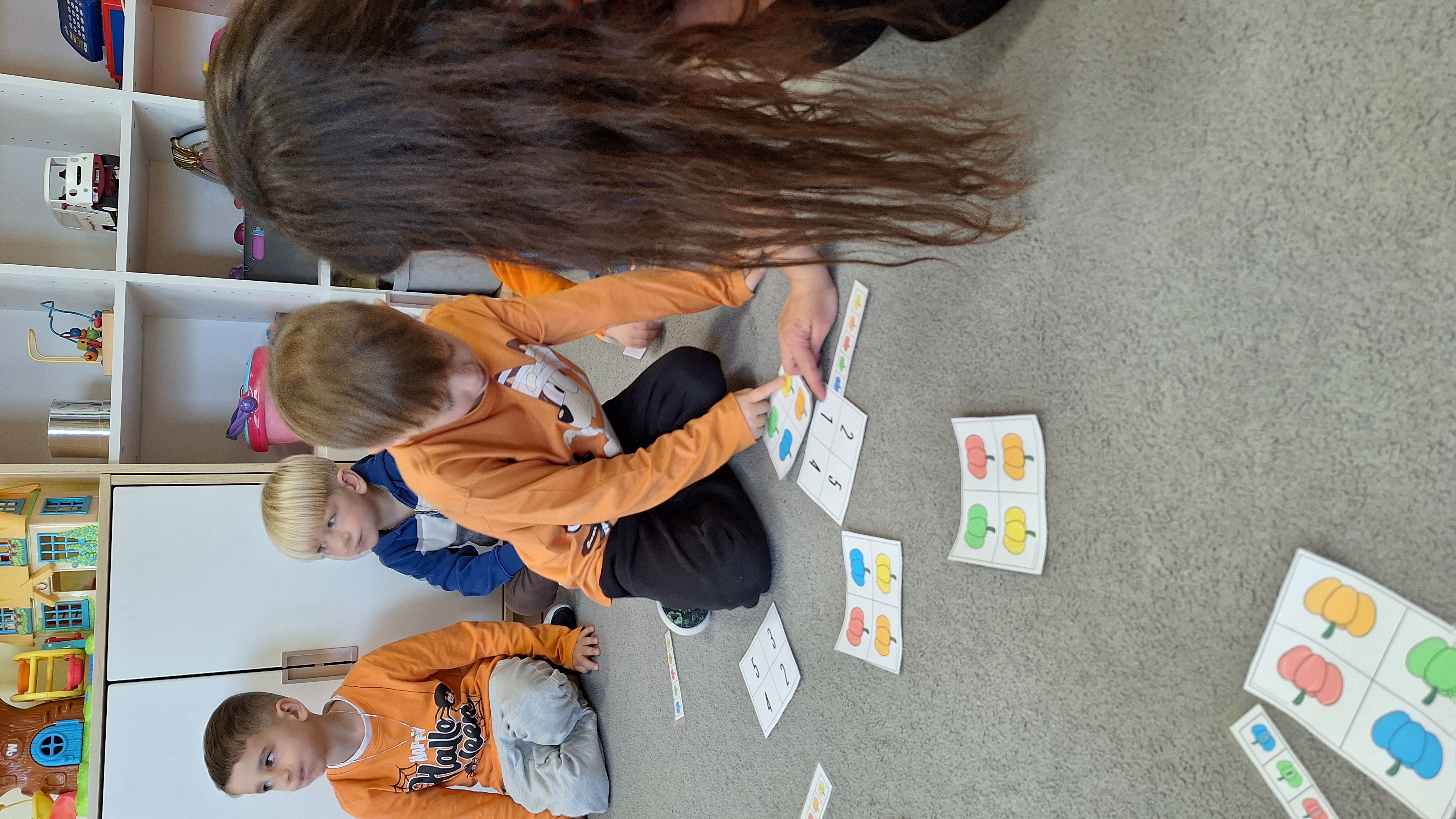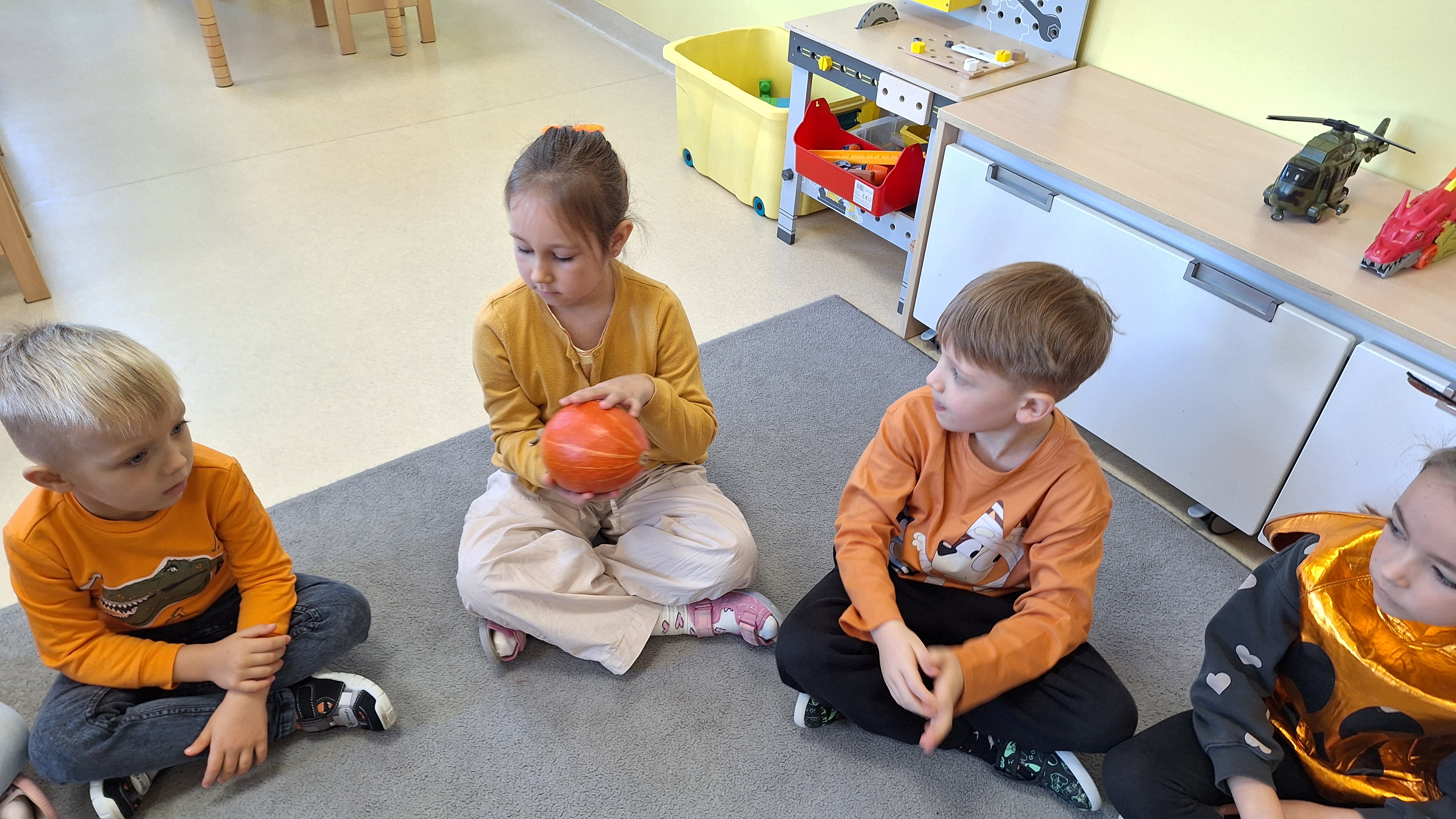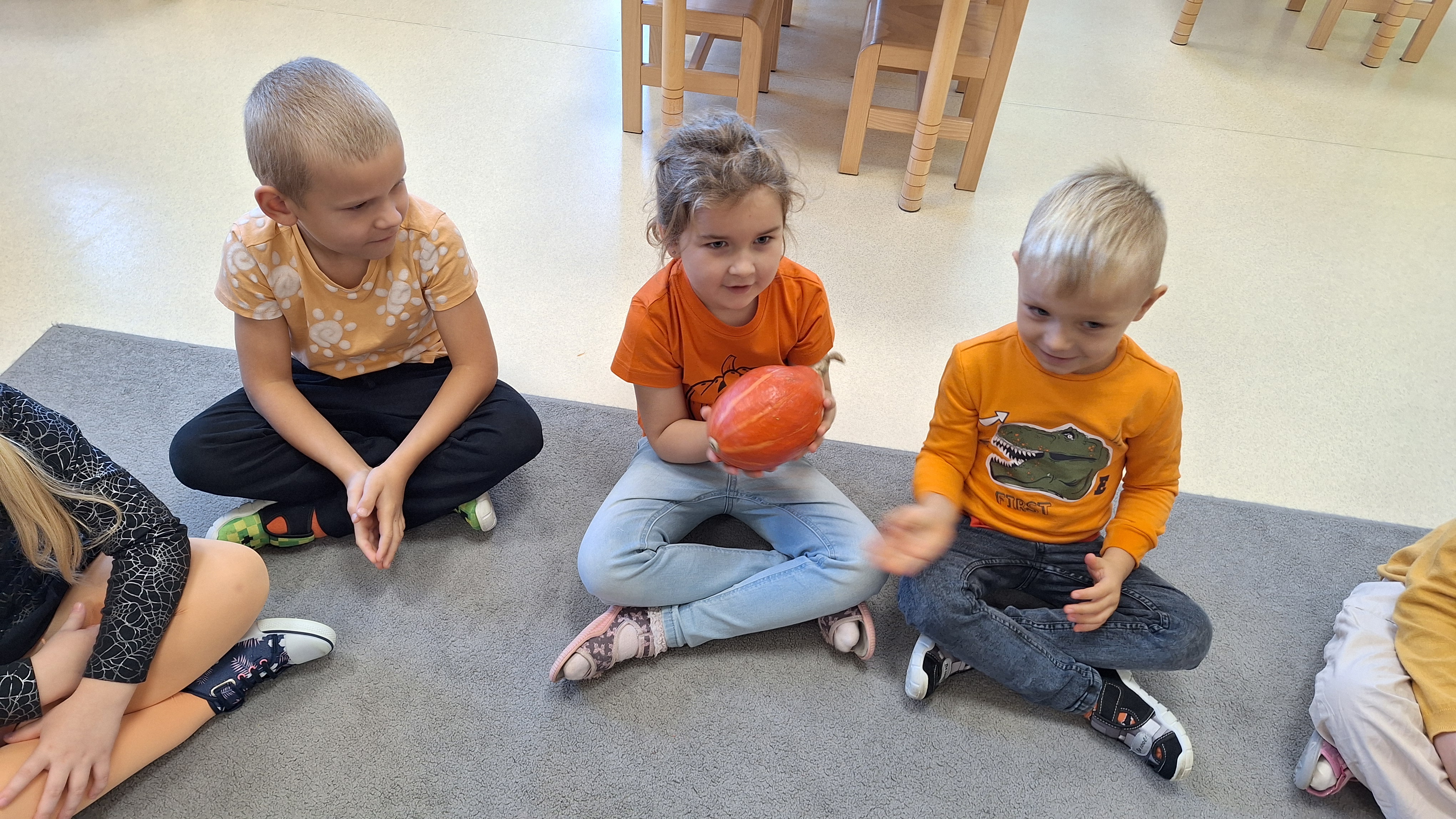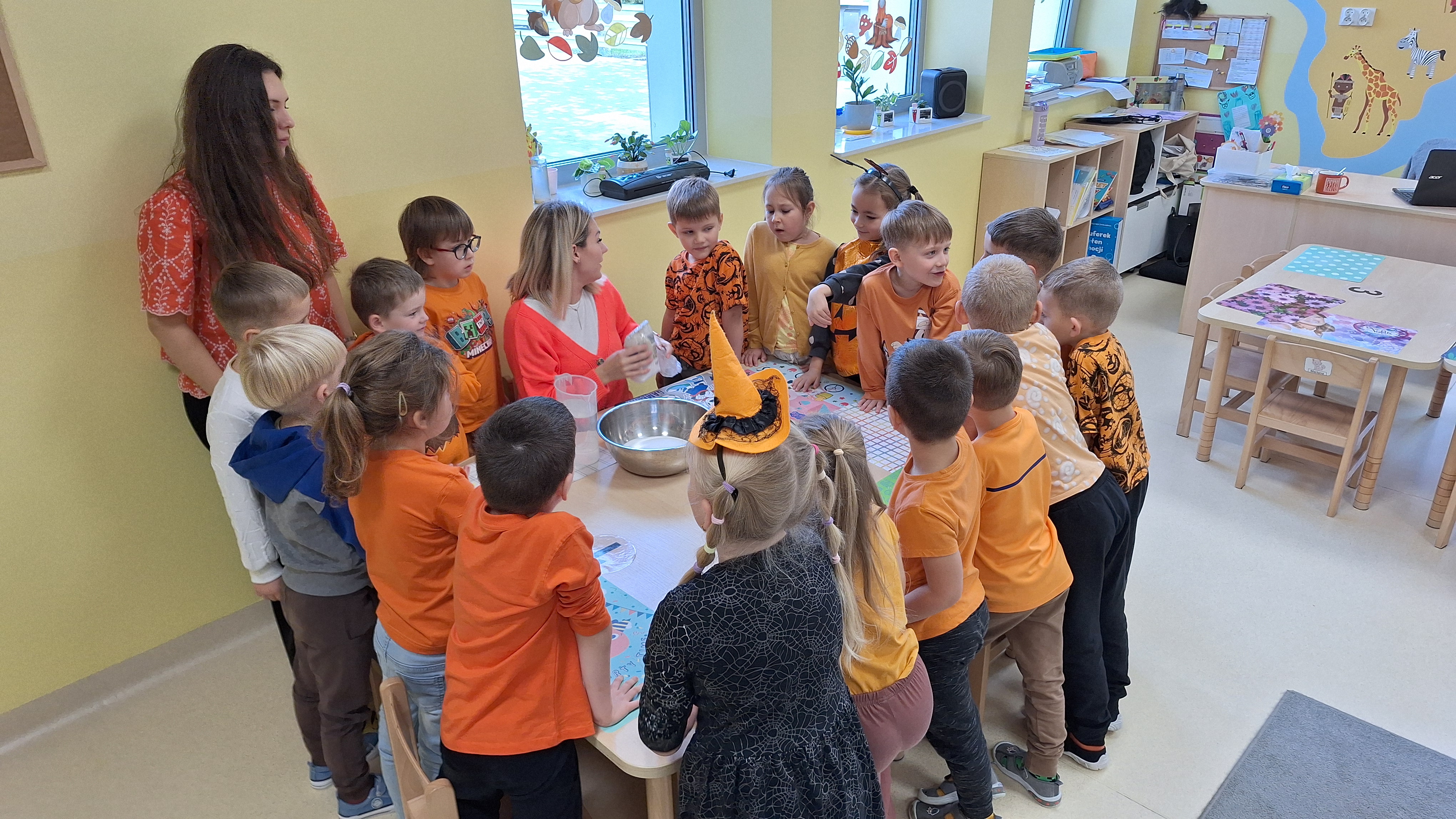 Dnia 31.10.2025 w grupie Żyrafy obchodziliśmy Dzień dyni. Dzieci ubrane na pomarańczowo porównywały wielkości, ciężar, a także układały je w przestrzeni(nad, pod obok). Miały również świetną zabawę przy tworzeniu własnych dyni z masy solnej. Zabawa do piosenki ,, Podaj dynie” sprawiła dzieciom wiele radości i śmiechu. Nie mogliśmy się zatrzymać, na koniec utrwalaliśmy kolory i cyfry podczas kodowania.