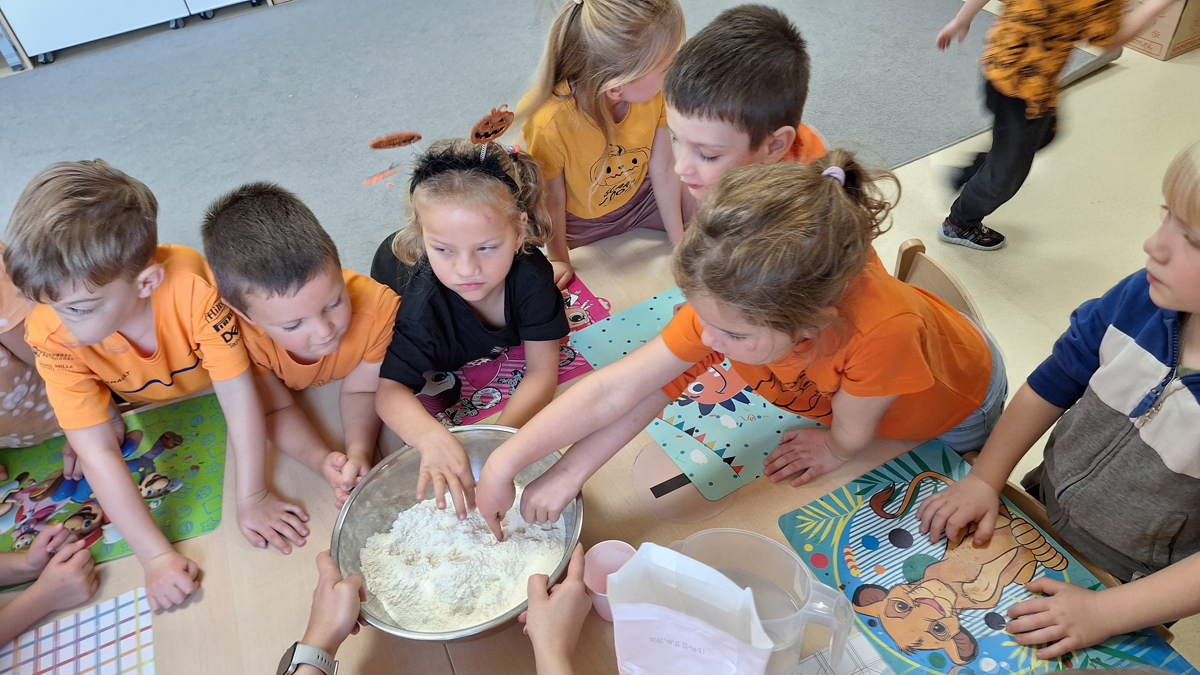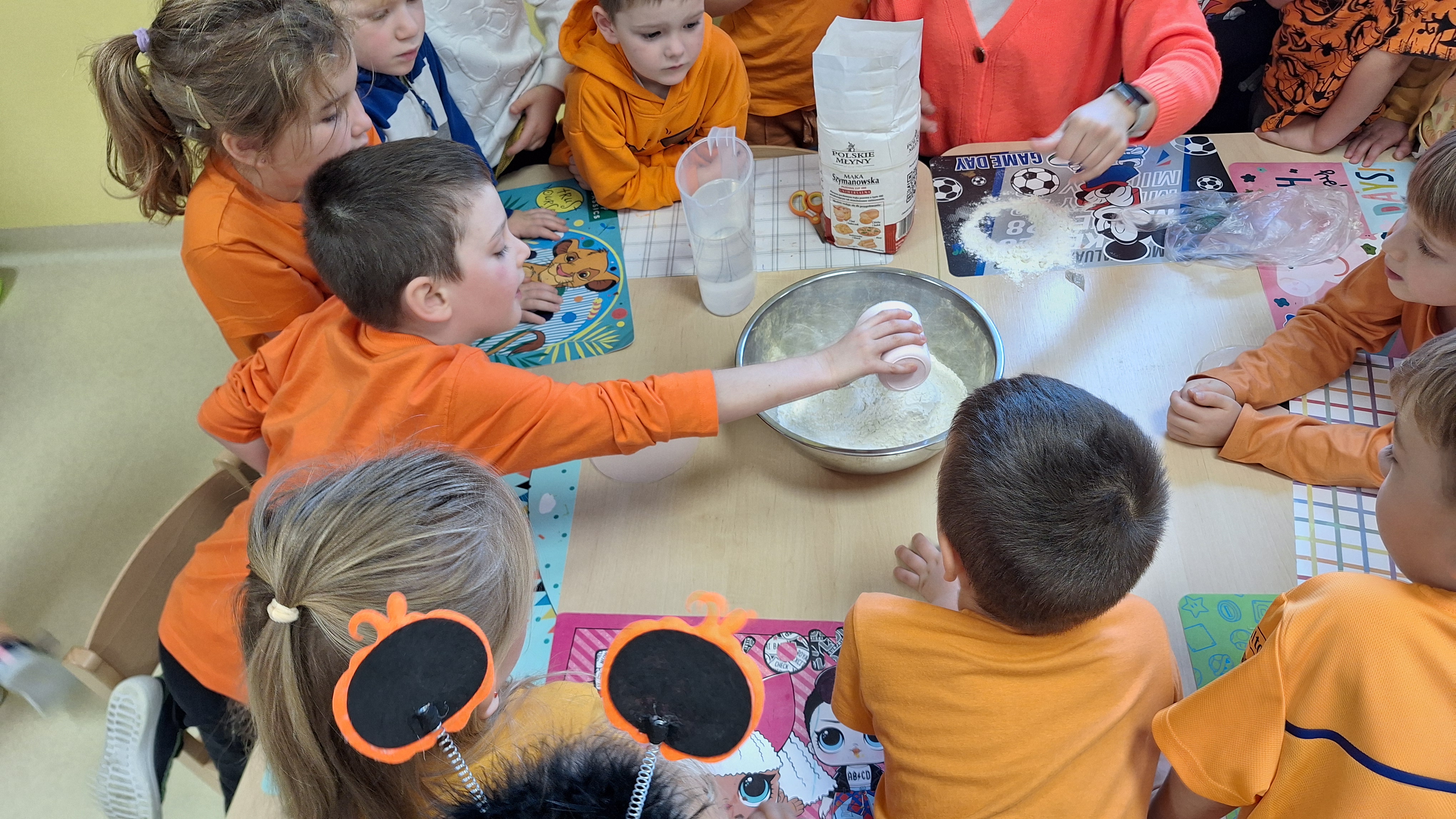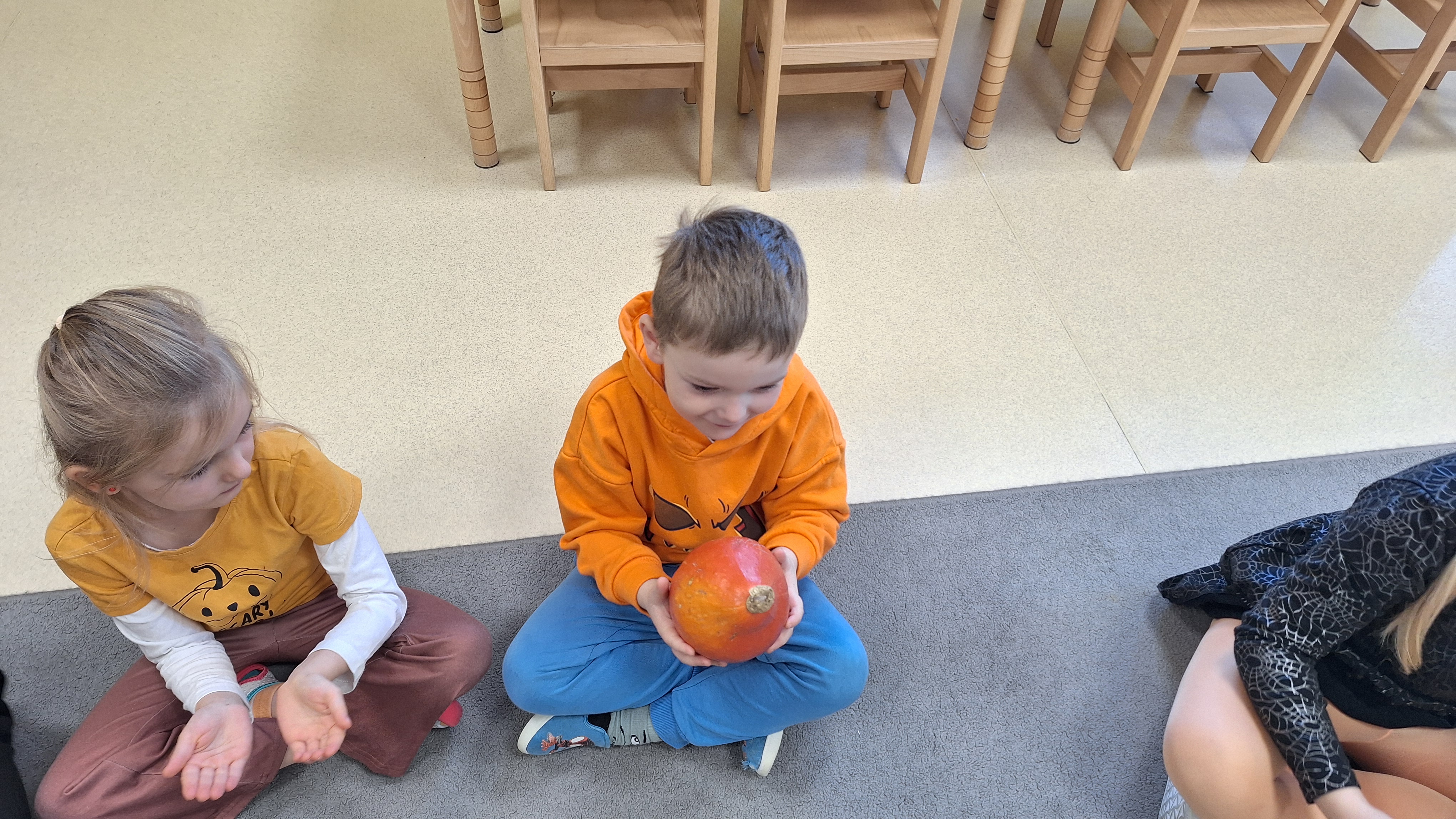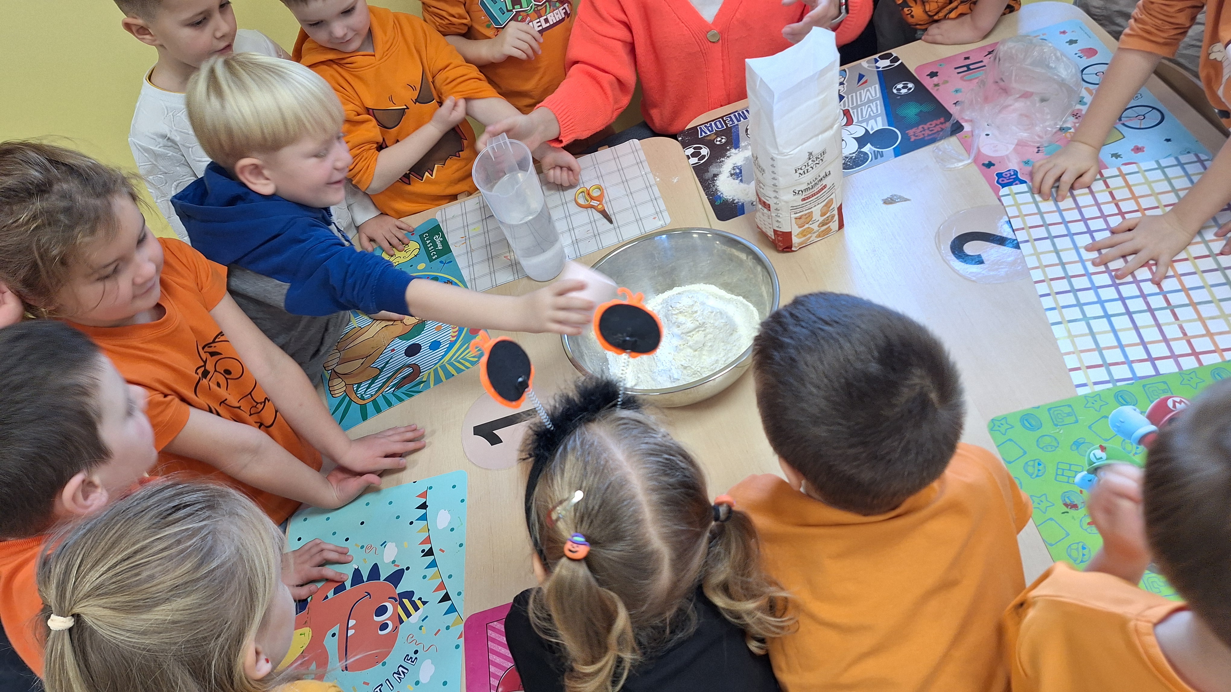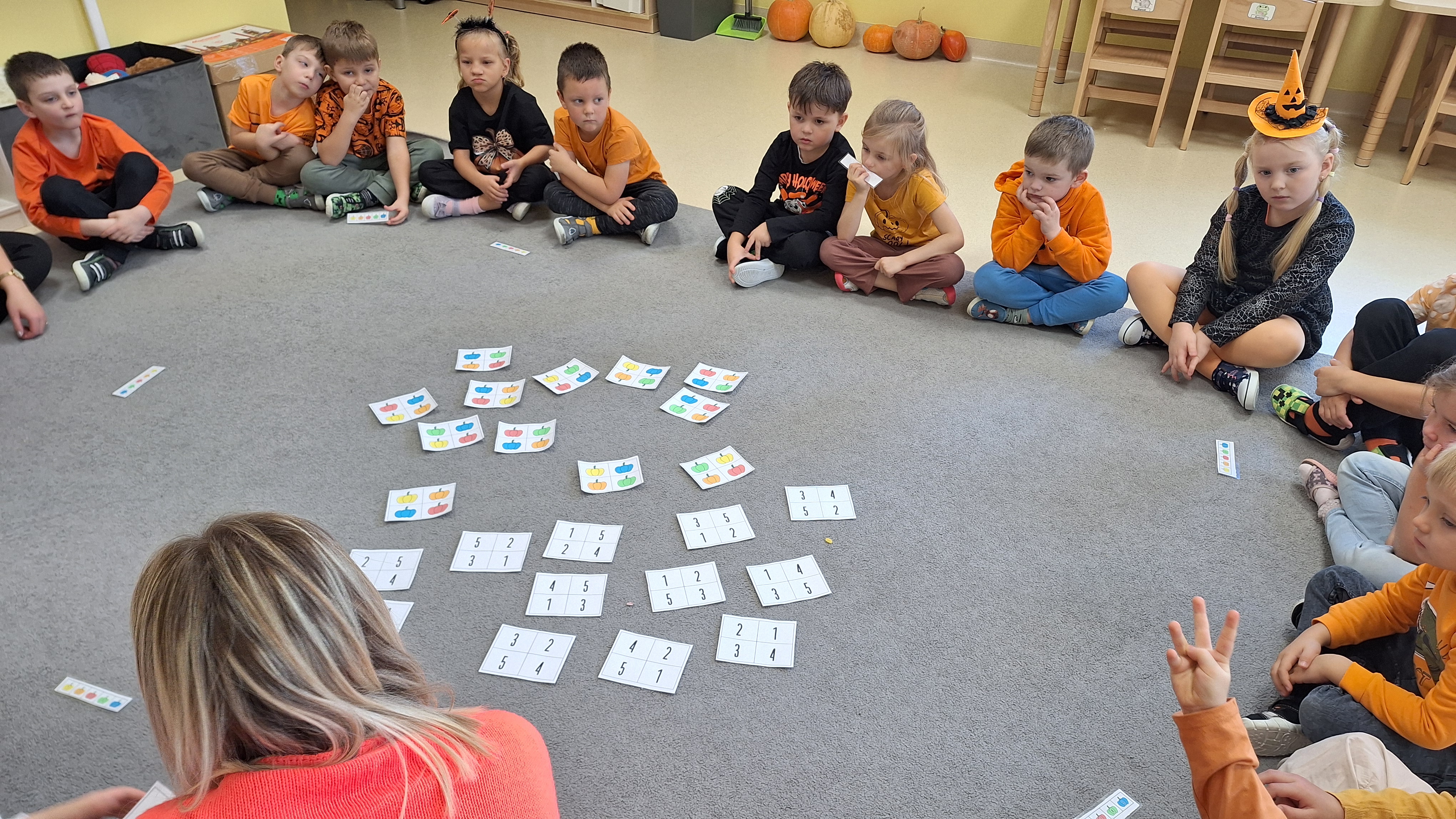 Dnia 31.10.2025 w grupie Żyrafy obchodziliśmy Dzień dyni. Dzieci ubrane na pomarańczowo porównywały wielkości, ciężar, a także układały je w przestrzeni(nad, pod obok). Miały również świetną zabawę przy tworzeniu własnych dyni z masy solnej. Zabawa do piosenki ,, Podaj dynie” sprawiła dzieciom wiele radości i śmiechu. Nie mogliśmy się zatrzymać, na koniec utrwalaliśmy kolory i cyfry podczas kodowania.
