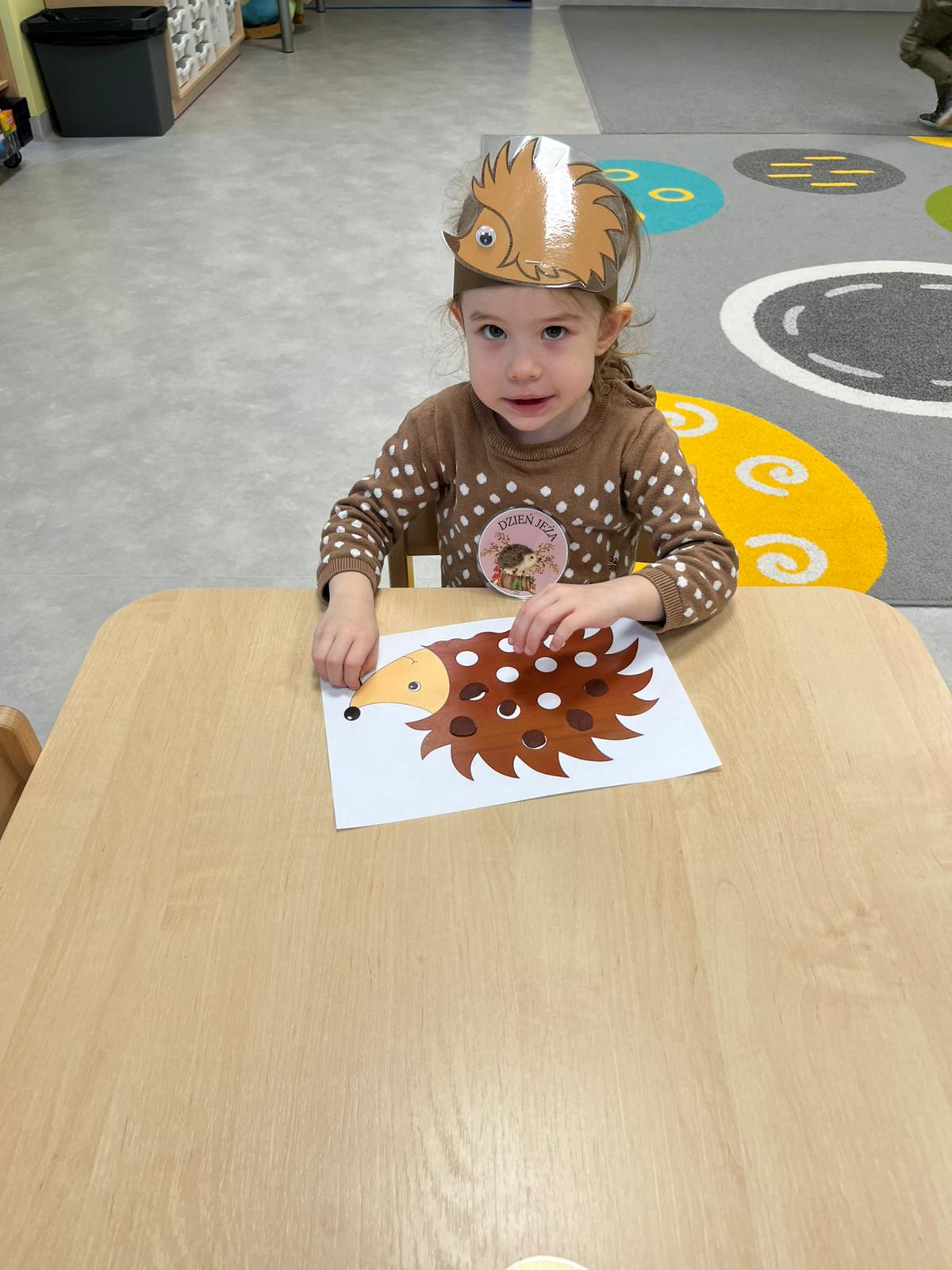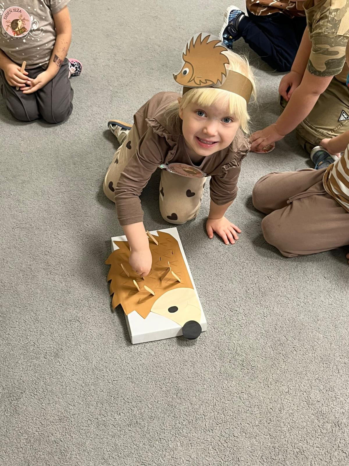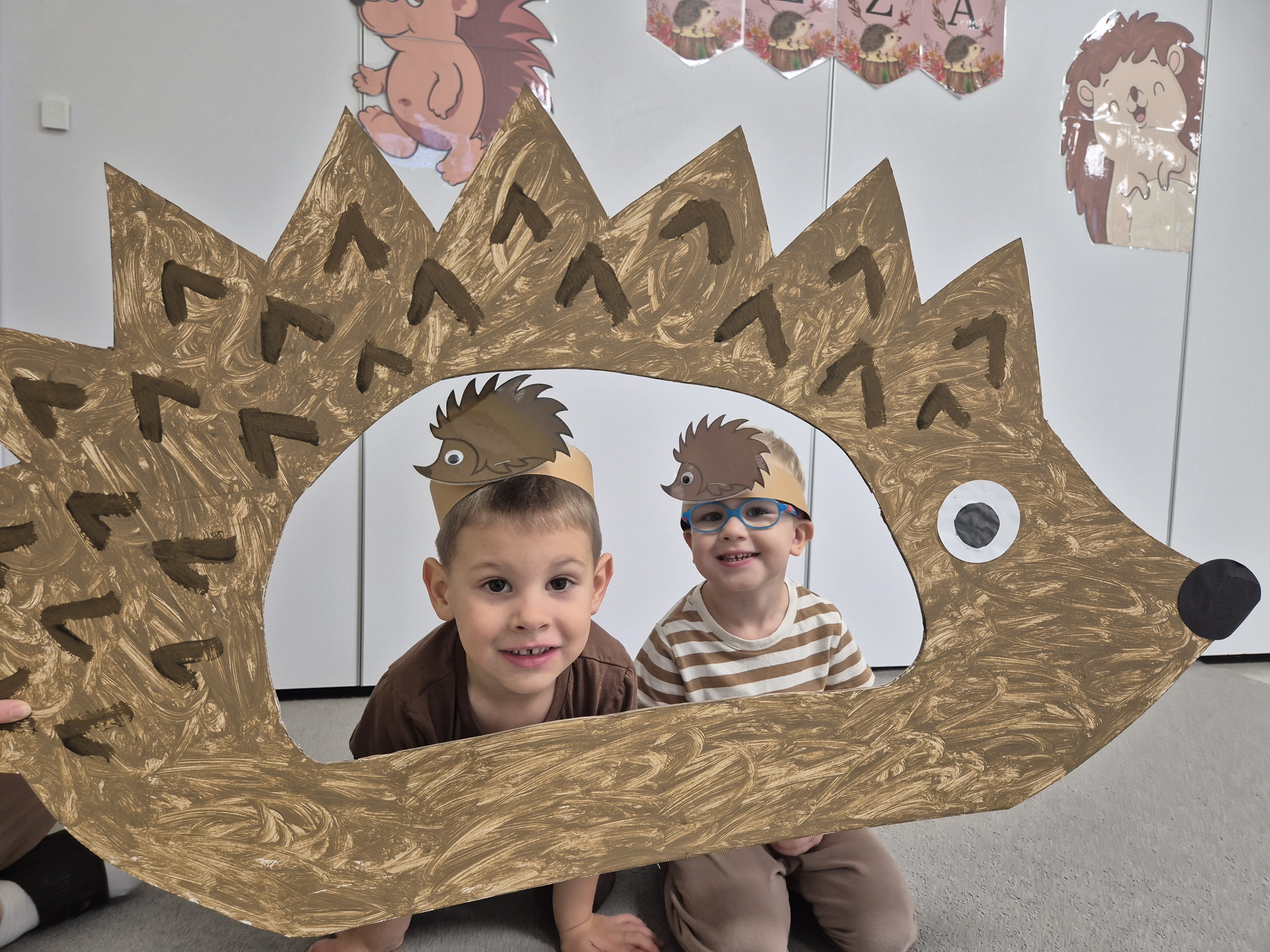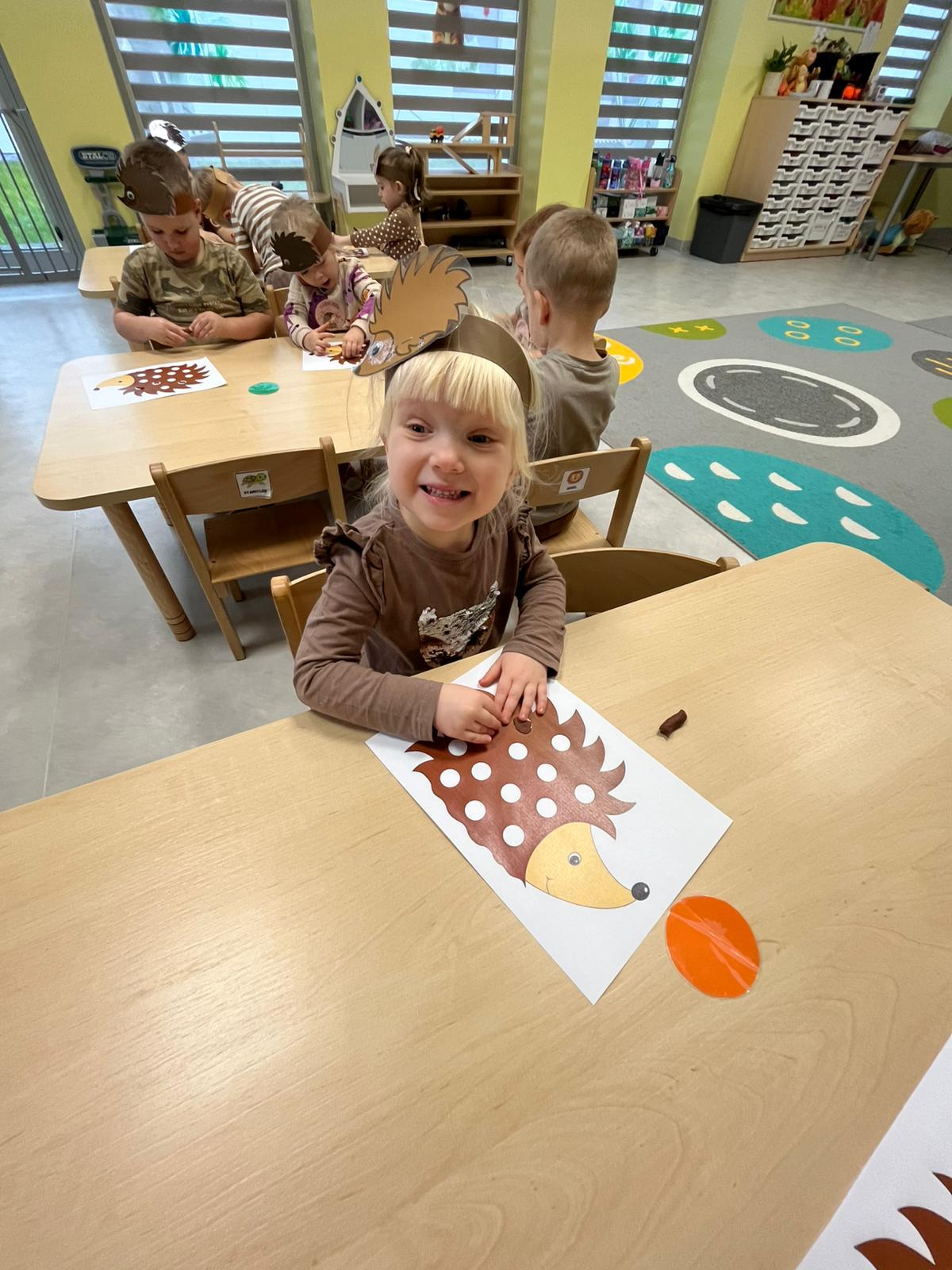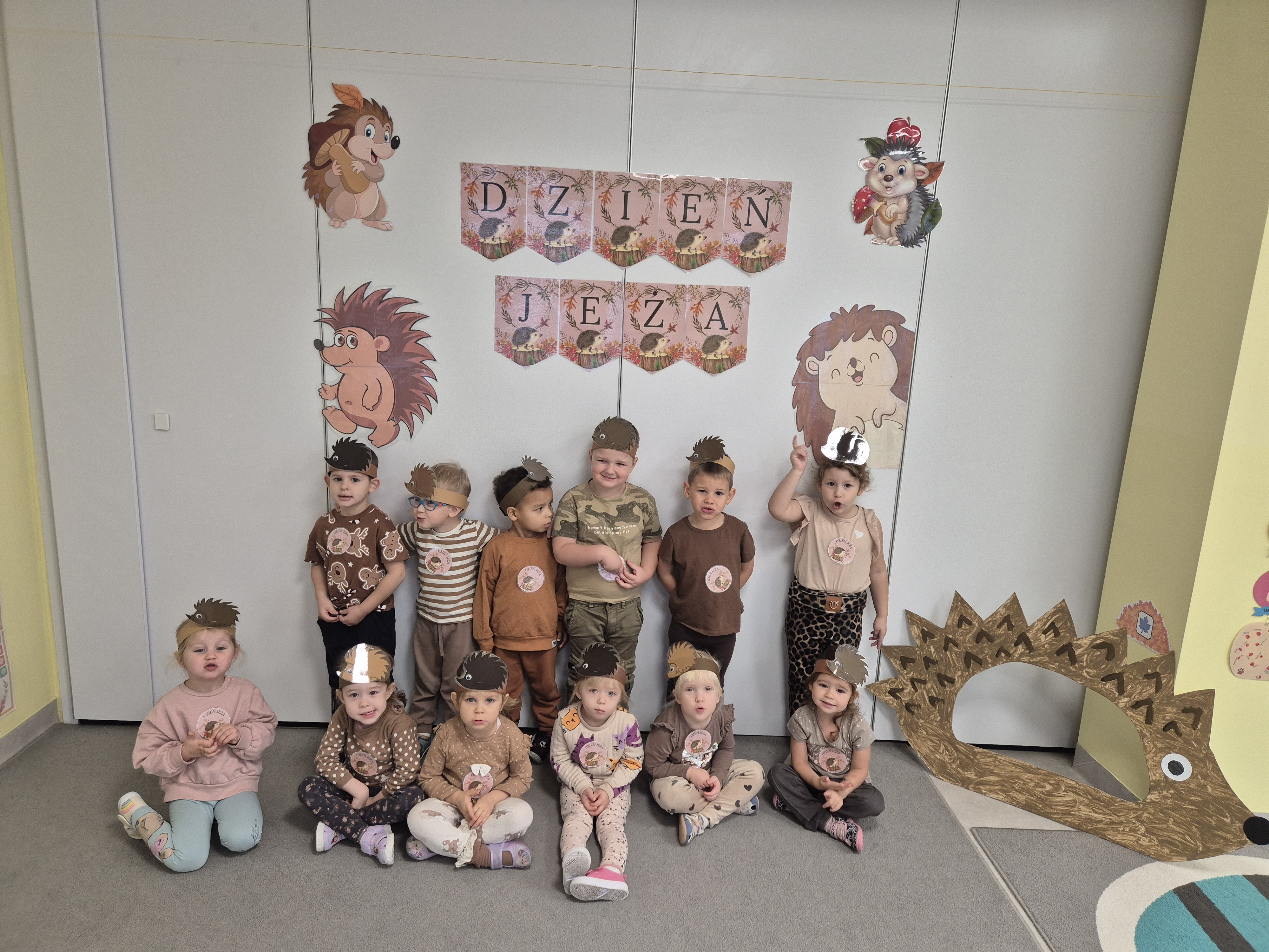 „Liski” rozpoczęły świętowanie od radosnego powitania pluszowego jeża, który odwiedził grupę i stał się bohaterem porannych zajęć. Dzieci mogły dokładnie przyjrzeć się jego wyglądowi i porozmawiać o tym, jak żyją prawdziwe jeże. Następnie wysłuchały bajki o jeżykach, a później same wcieliły się w małe jeże, biorąc udział w zabawach ruchowych rozwijających wyobraźnię i sprawność. Na zakończenie wykonały farbami prace plastyczne pt. „Jesienne jeże”. W tym samym czasie „Tygryski” obejrzały film edukacyjny o jeżach, dzięki któremu poznały ich zwyczaje, sposób życia i dietę. Następnie przygotowały plastelinowe prace plastyczne – jeżyki wyklejane plasteliną. Dzieci brały też udział w gimnastyce z jeżykiem oraz symbolicznie „karmiły jeżyka” dżdżownicami i ślimakami w formie pomocy dydaktycznych. Na zakończenie świetnie bawiły się przy piosence „Dwa malutkie jeże”, uczestnicząc w zabawach ruchowych. Wspólne obchody Dnia Jeża upłynęły w atmosferze zaangażowania, radości i twórczej zabawy, wzbogacając dzieci o nową wiedzę i piękne doświadczenia.