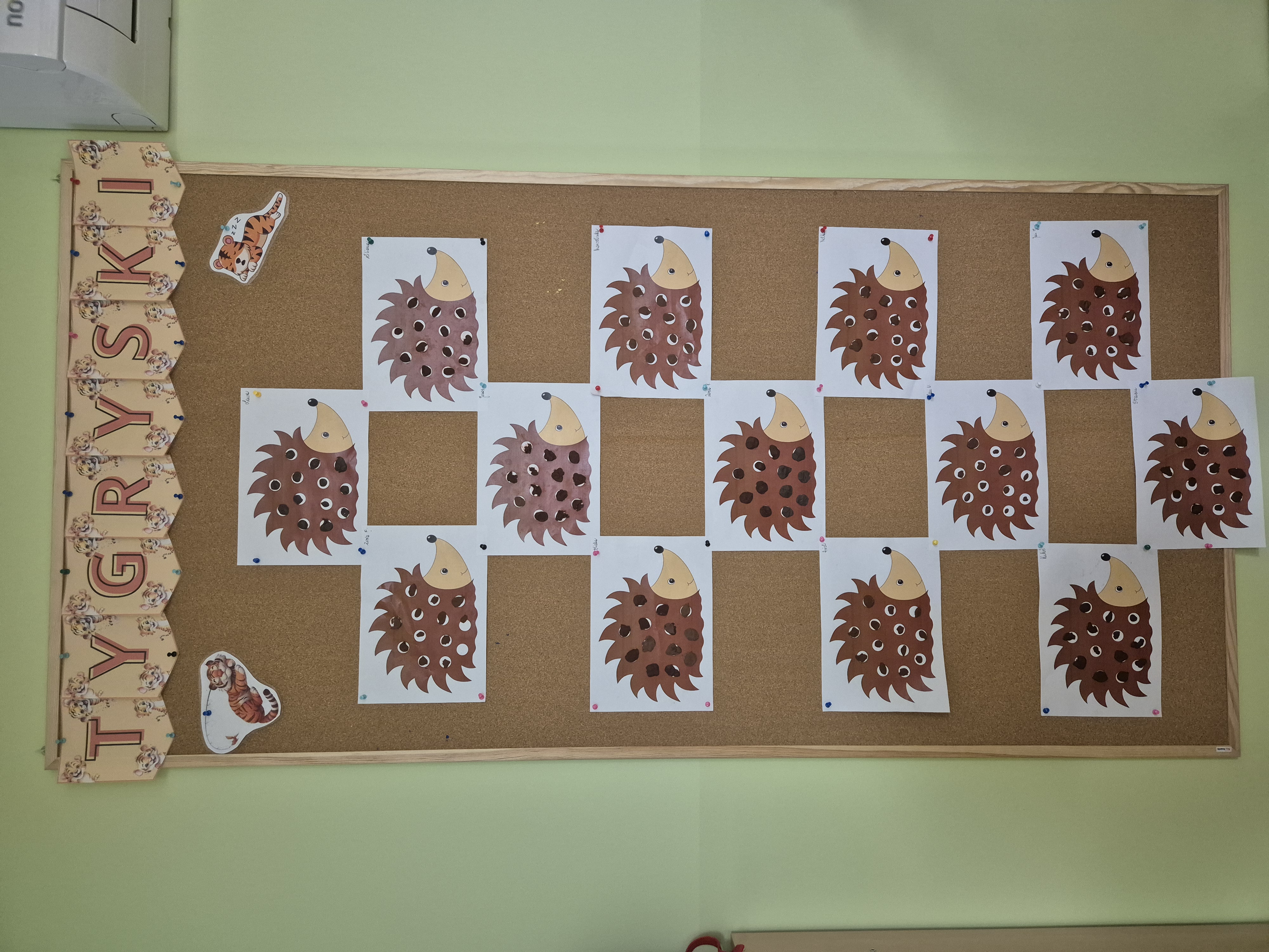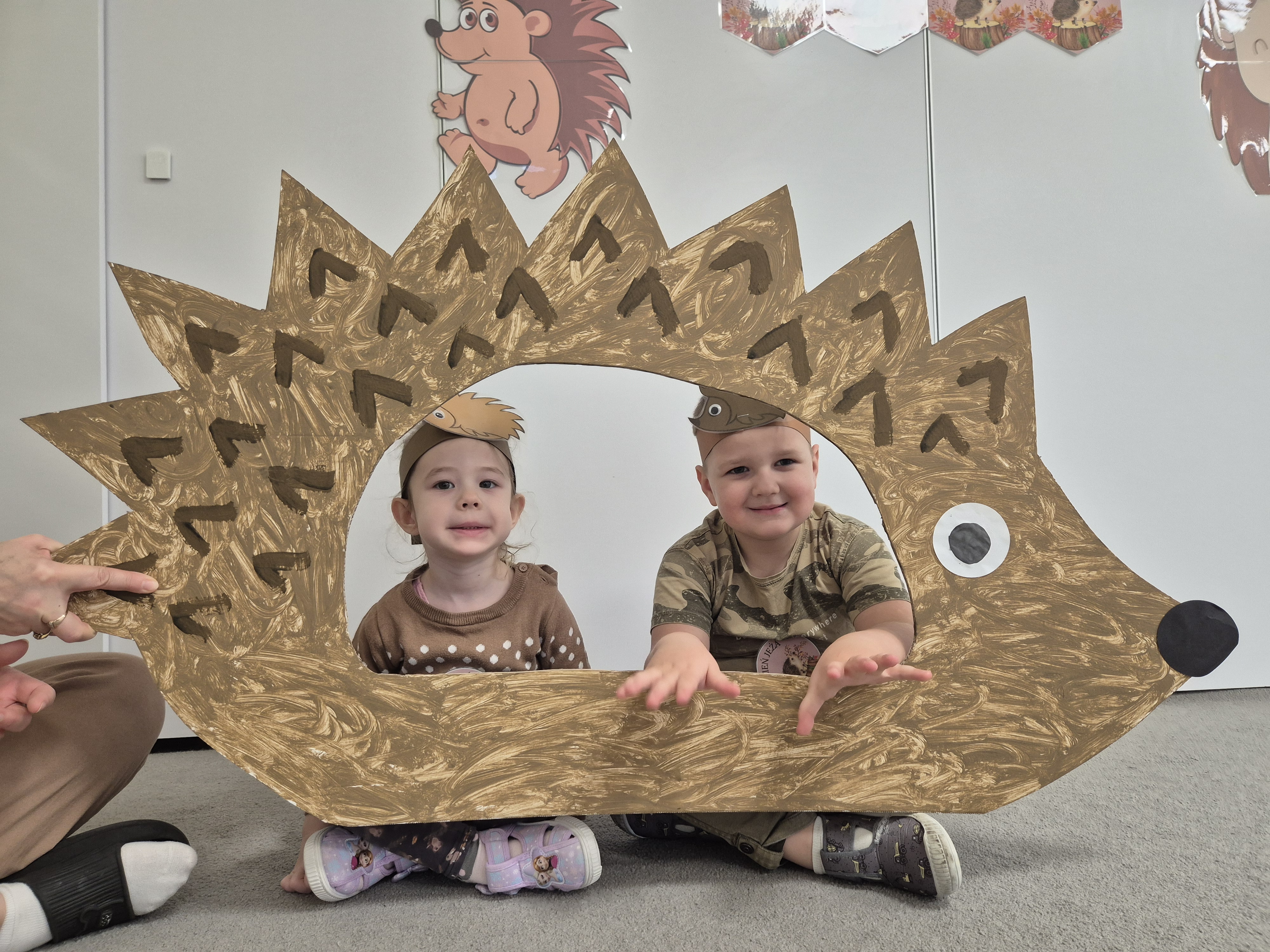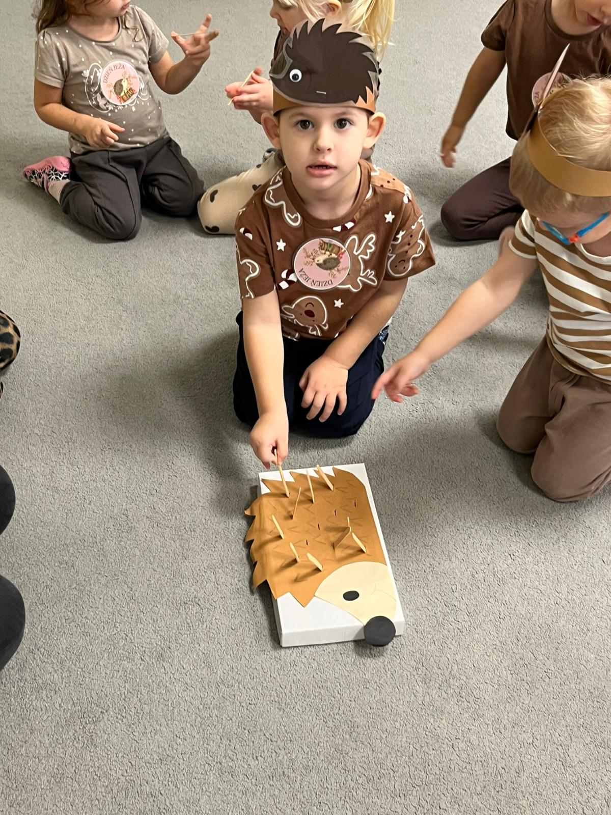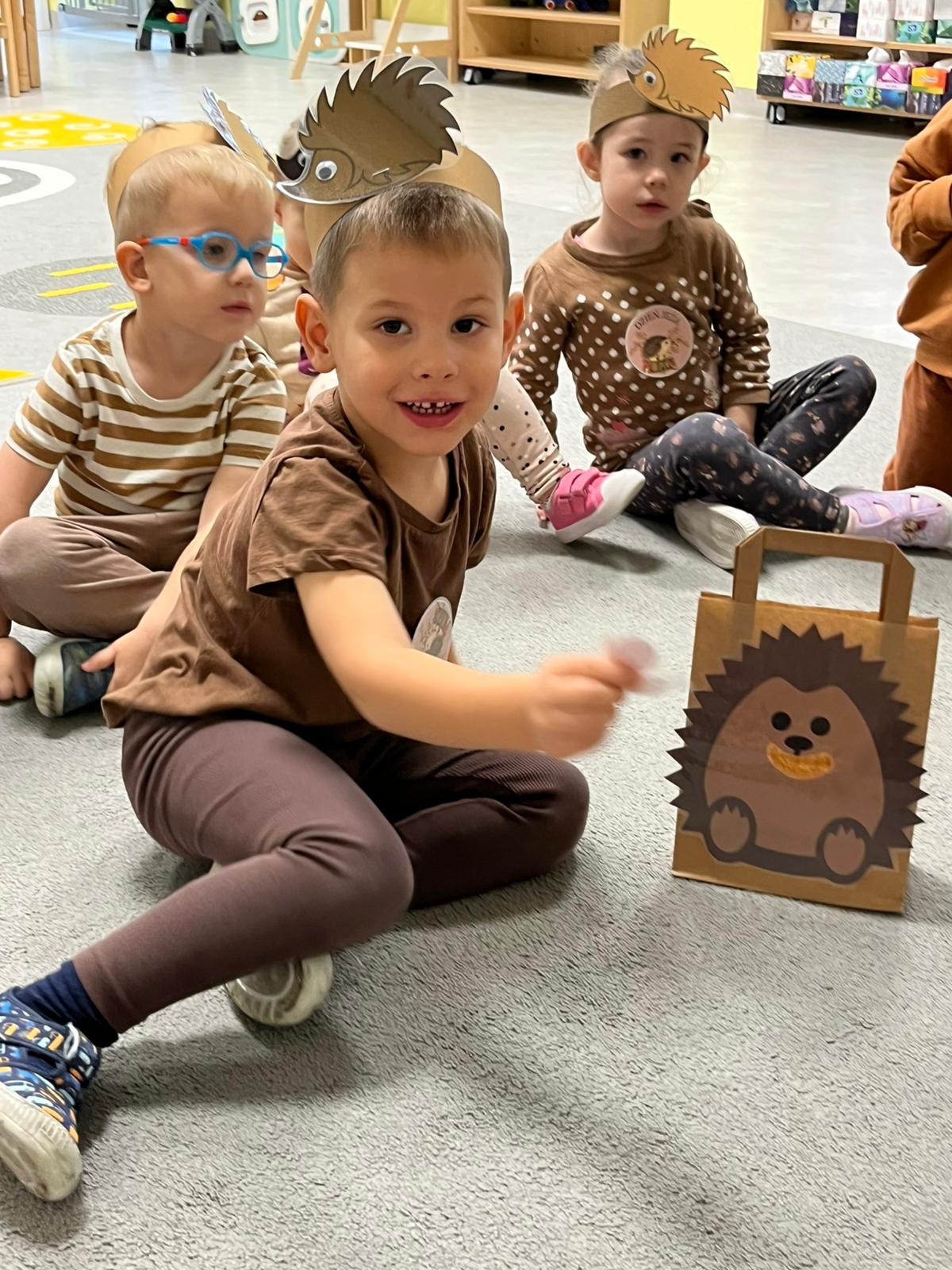 „Liski” rozpoczęły świętowanie od radosnego powitania pluszowego jeża, który odwiedził grupę i stał się bohaterem porannych zajęć. Dzieci mogły dokładnie przyjrzeć się jego wyglądowi i porozmawiać o tym, jak żyją prawdziwe jeże. Następnie wysłuchały bajki o jeżykach, a później same wcieliły się w małe jeże, biorąc udział w zabawach ruchowych rozwijających wyobraźnię i sprawność. Na zakończenie wykonały farbami prace plastyczne pt. „Jesienne jeże”. W tym samym czasie „Tygryski” obejrzały film edukacyjny o jeżach, dzięki któremu poznały ich zwyczaje, sposób życia i dietę. Następnie przygotowały plastelinowe prace plastyczne – jeżyki wyklejane plasteliną. Dzieci brały też udział w gimnastyce z jeżykiem oraz symbolicznie „karmiły jeżyka” dżdżownicami i ślimakami w formie pomocy dydaktycznych. Na zakończenie świetnie bawiły się przy piosence „Dwa malutkie jeże”, uczestnicząc w zabawach ruchowych. Wspólne obchody Dnia Jeża upłynęły w atmosferze zaangażowania, radości i twórczej zabawy, wzbogacając dzieci o nową wiedzę i piękne doświadczenia.