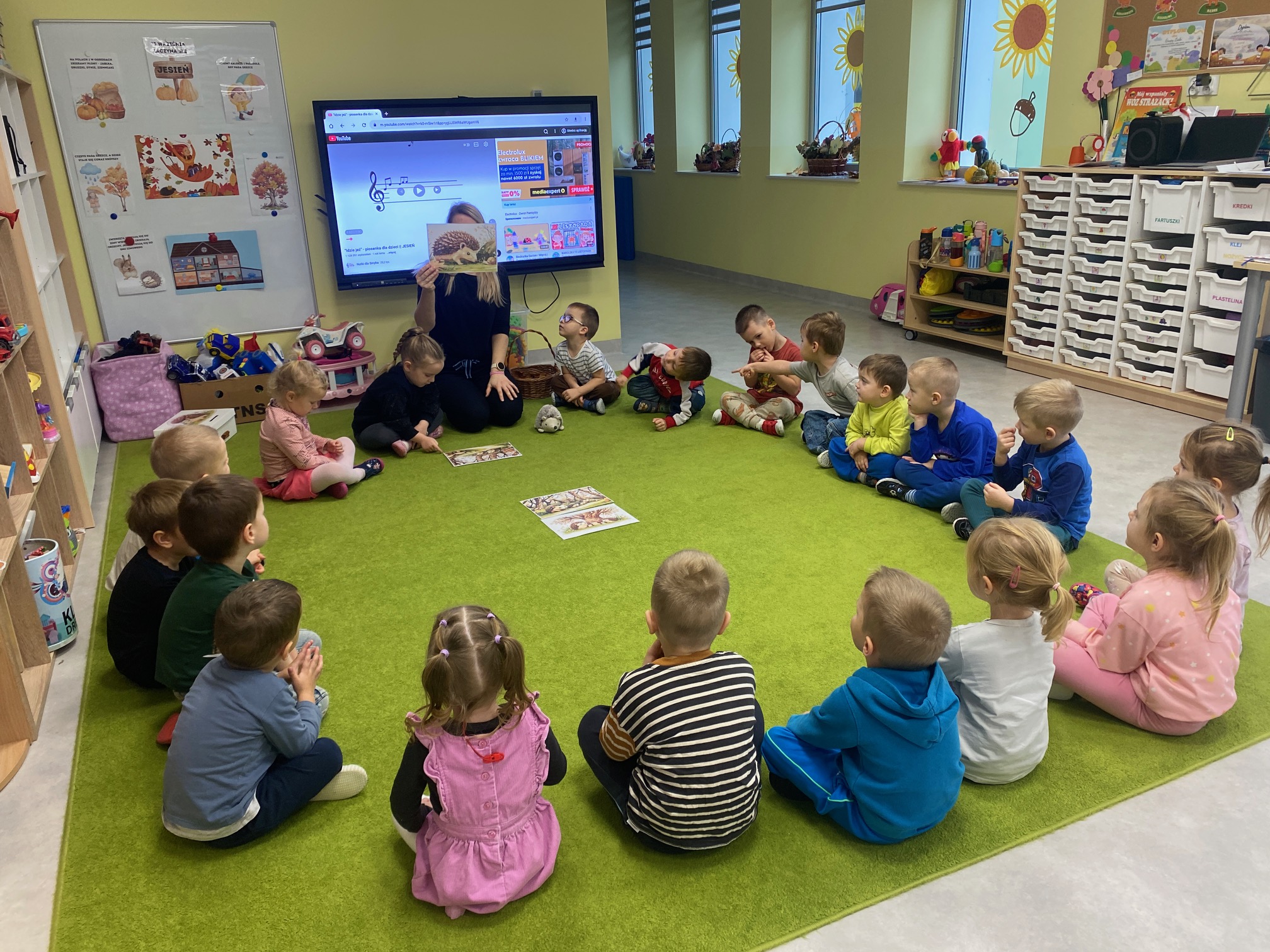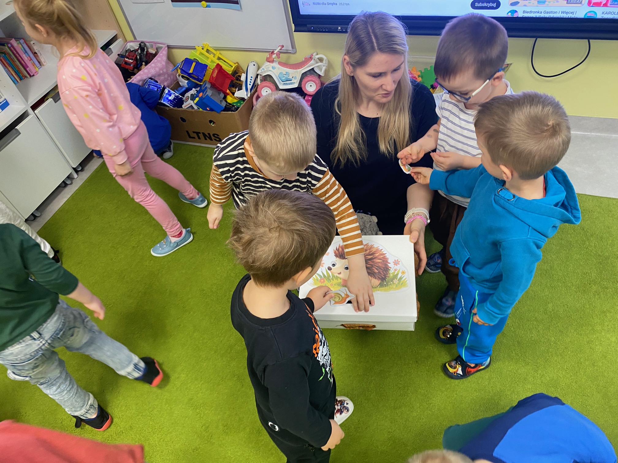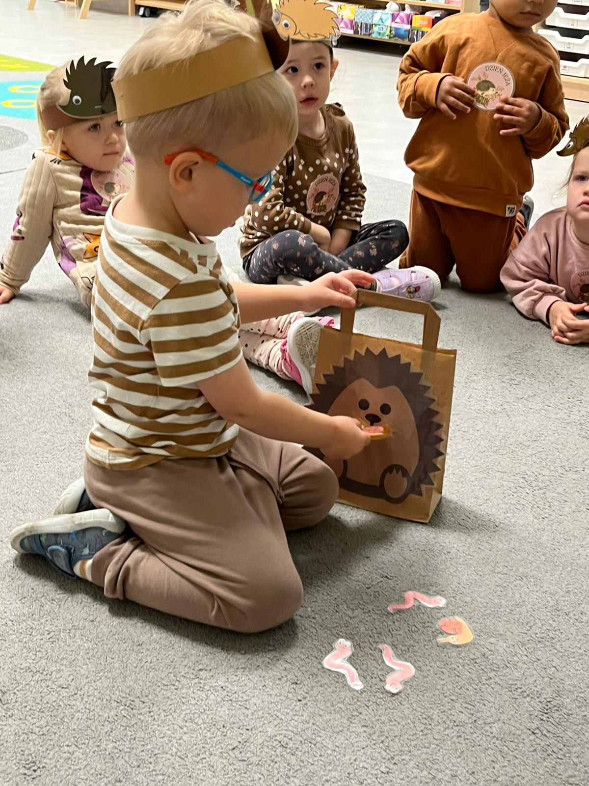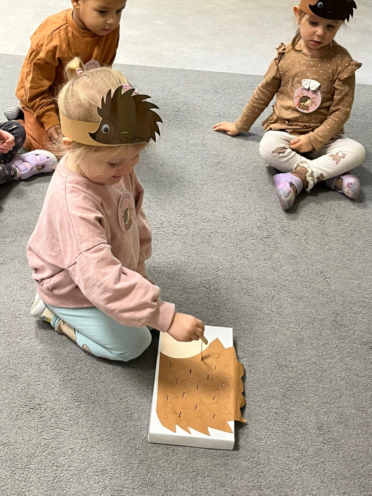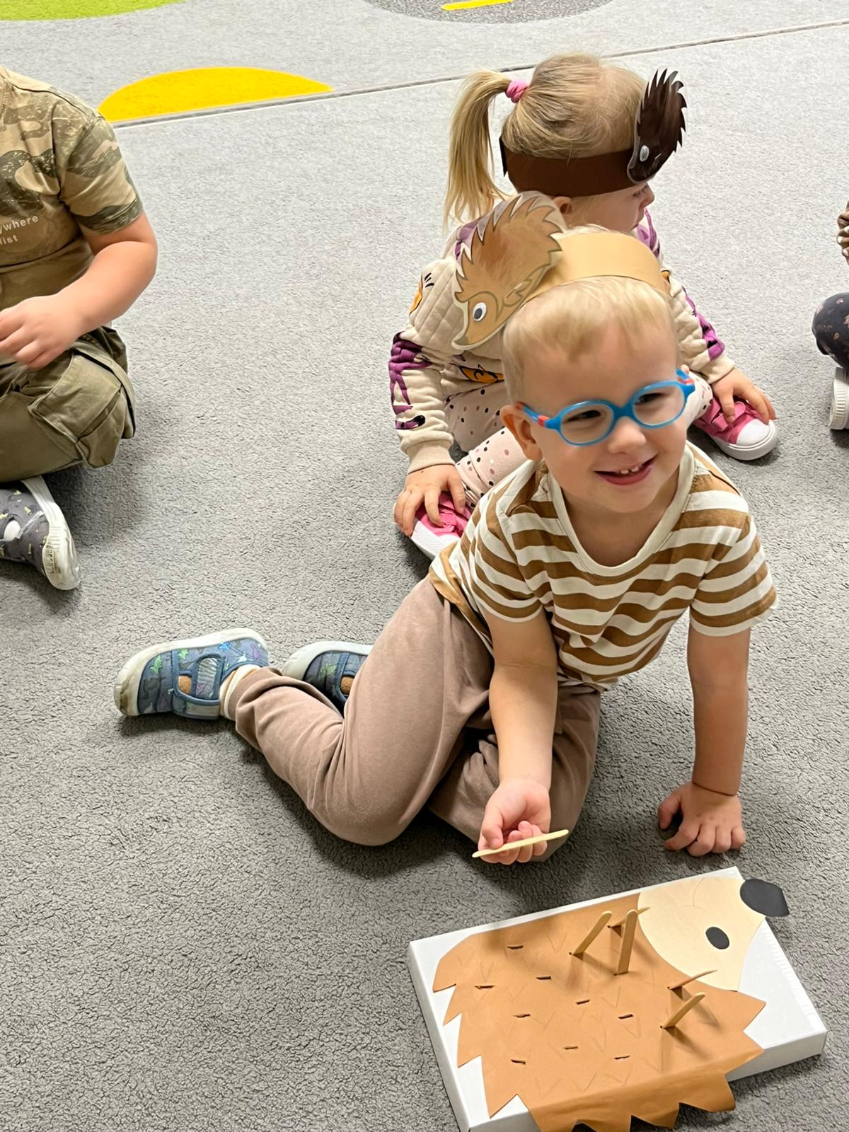 „Liski” rozpoczęły świętowanie od radosnego powitania pluszowego jeża, który odwiedził grupę i stał się bohaterem porannych zajęć. Dzieci mogły dokładnie przyjrzeć się jego wyglądowi i porozmawiać o tym, jak żyją prawdziwe jeże. Następnie wysłuchały bajki o jeżykach, a później same wcieliły się w małe jeże, biorąc udział w zabawach ruchowych rozwijających wyobraźnię i sprawność. Na zakończenie wykonały farbami prace plastyczne pt. „Jesienne jeże”. W tym samym czasie „Tygryski” obejrzały film edukacyjny o jeżach, dzięki któremu poznały ich zwyczaje, sposób życia i dietę. Następnie przygotowały plastelinowe prace plastyczne – jeżyki wyklejane plasteliną. Dzieci brały też udział w gimnastyce z jeżykiem oraz symbolicznie „karmiły jeżyka” dżdżownicami i ślimakami w formie pomocy dydaktycznych. Na zakończenie świetnie bawiły się przy piosence „Dwa malutkie jeże”, uczestnicząc w zabawach ruchowych. Wspólne obchody Dnia Jeża upłynęły w atmosferze zaangażowania, radości i twórczej zabawy, wzbogacając dzieci o nową wiedzę i piękne doświadczenia.
