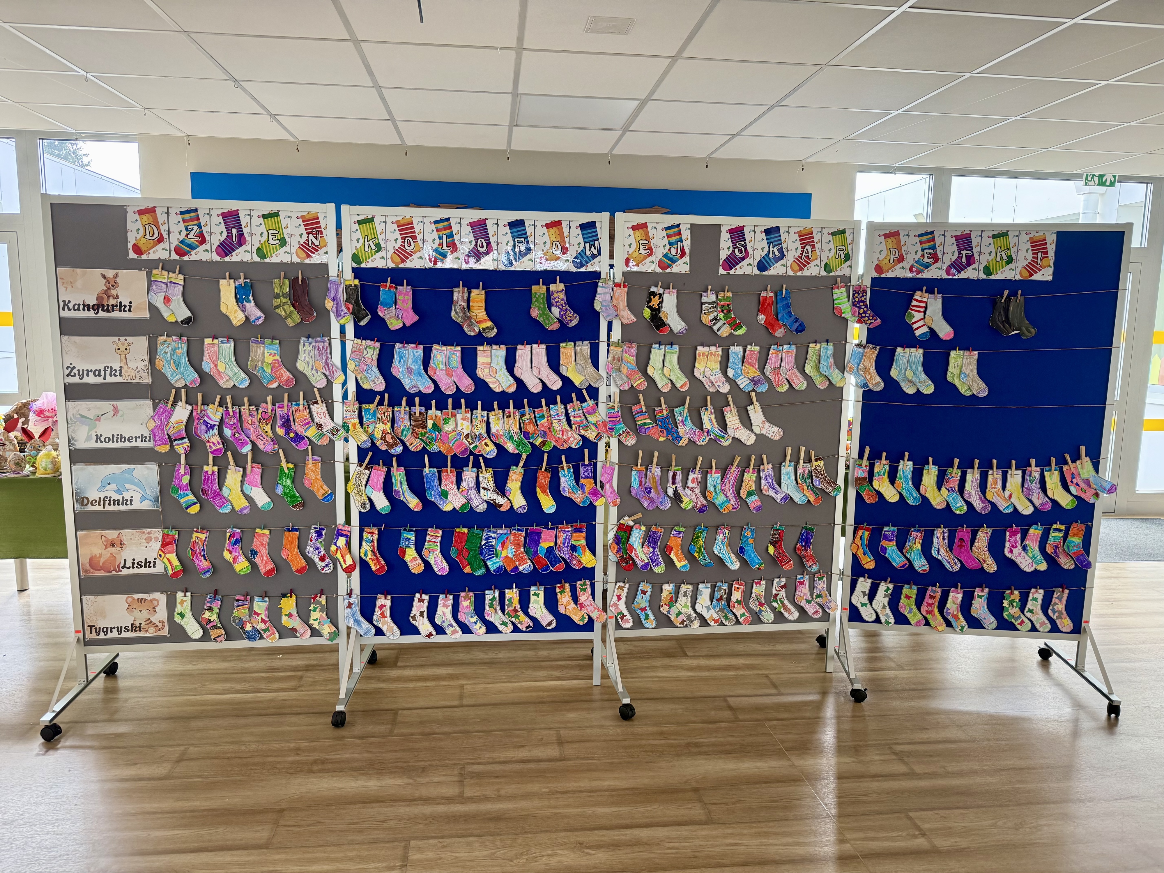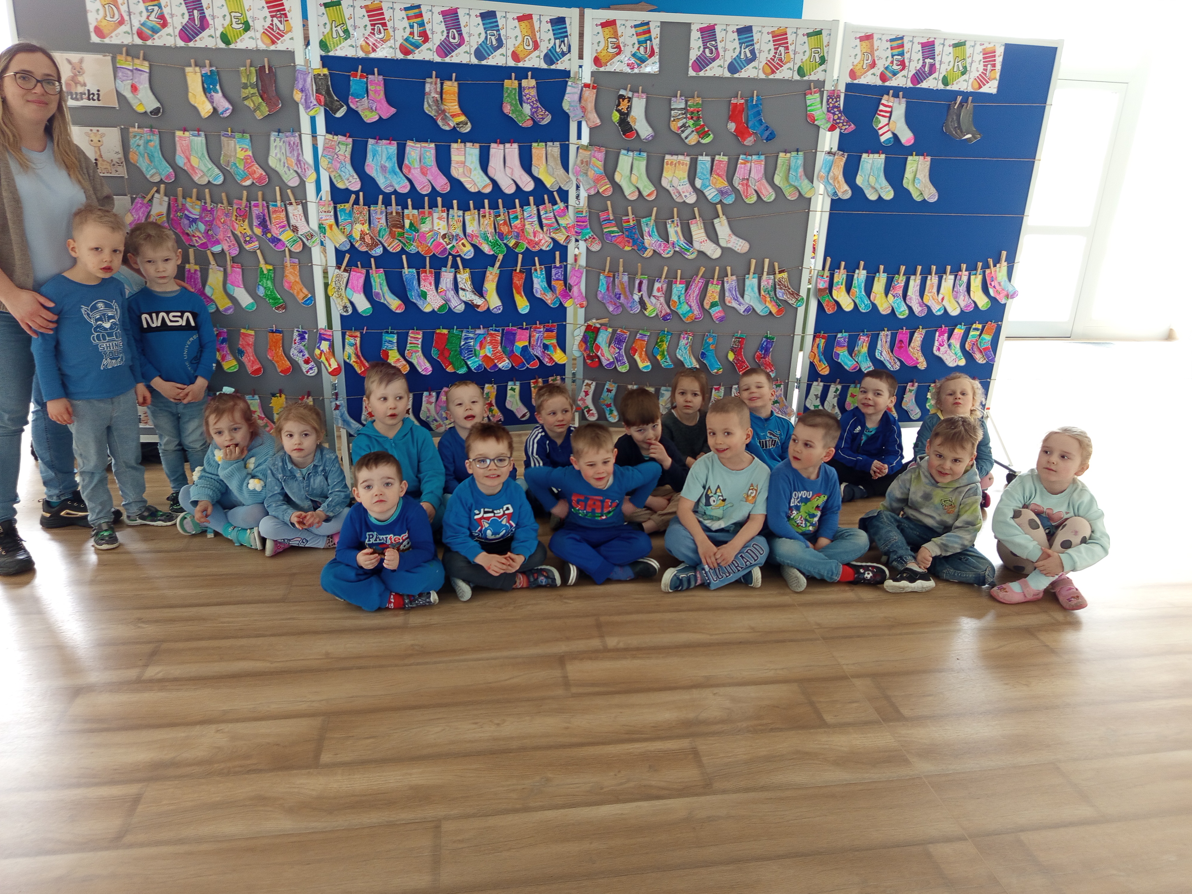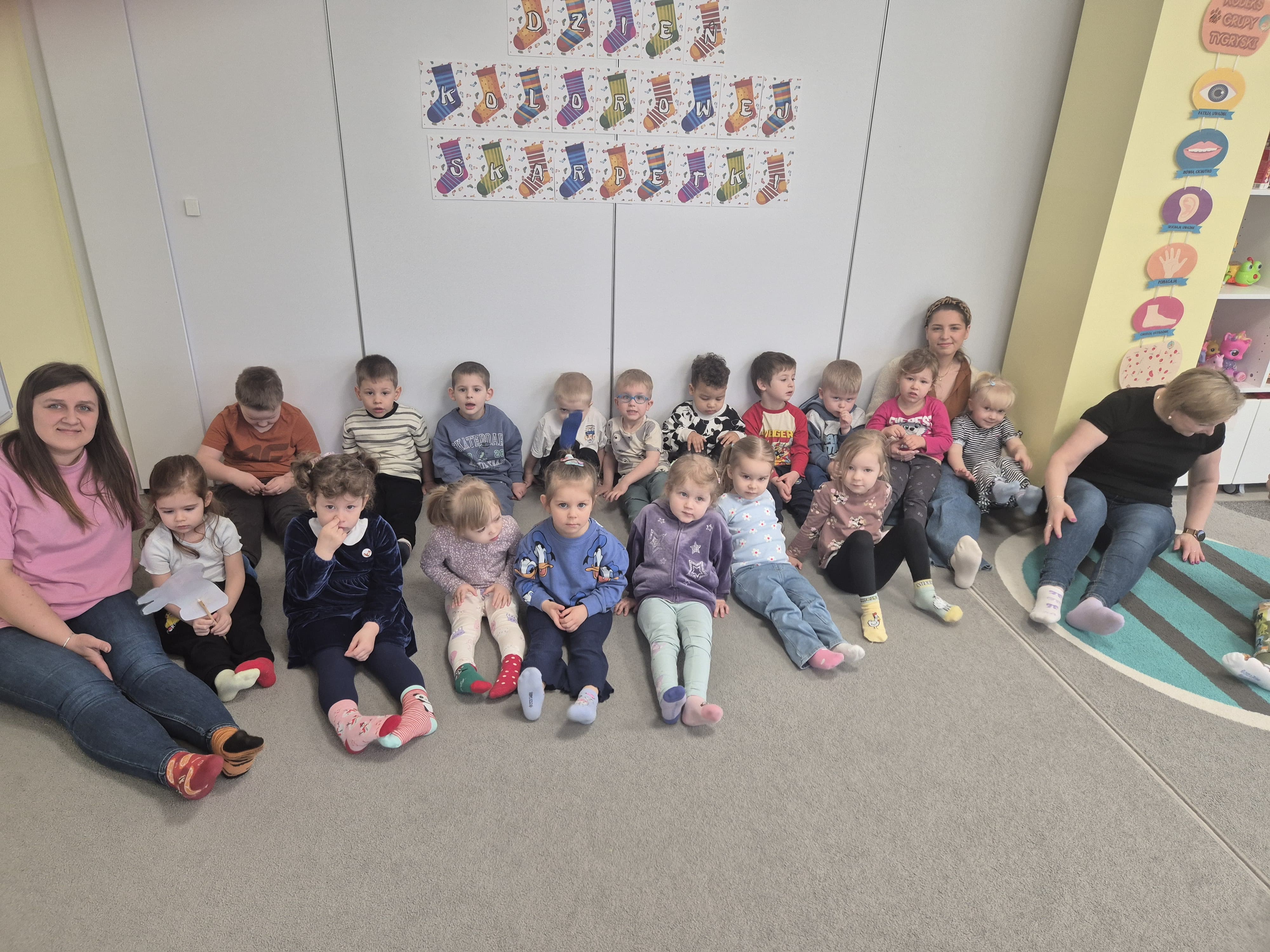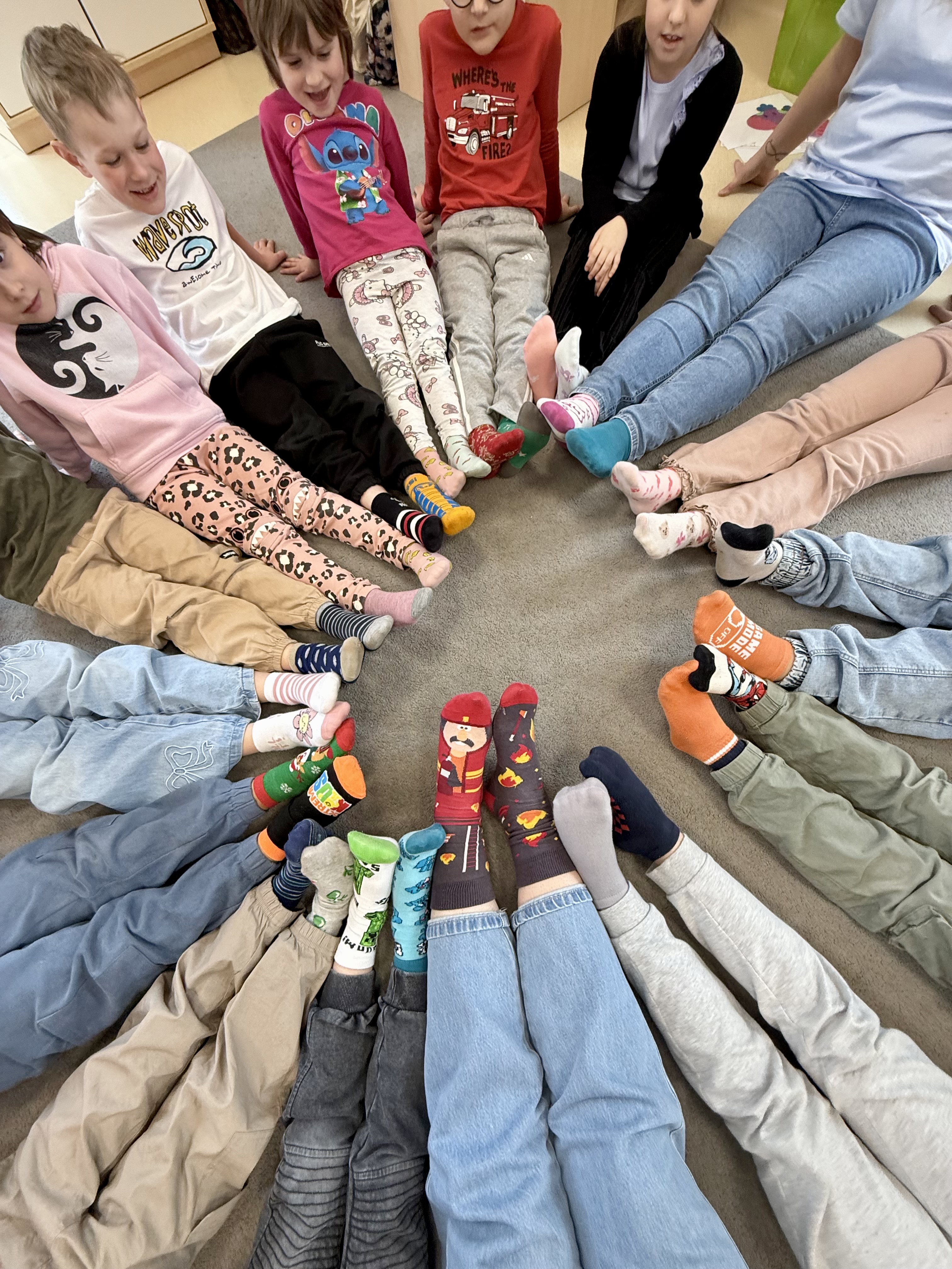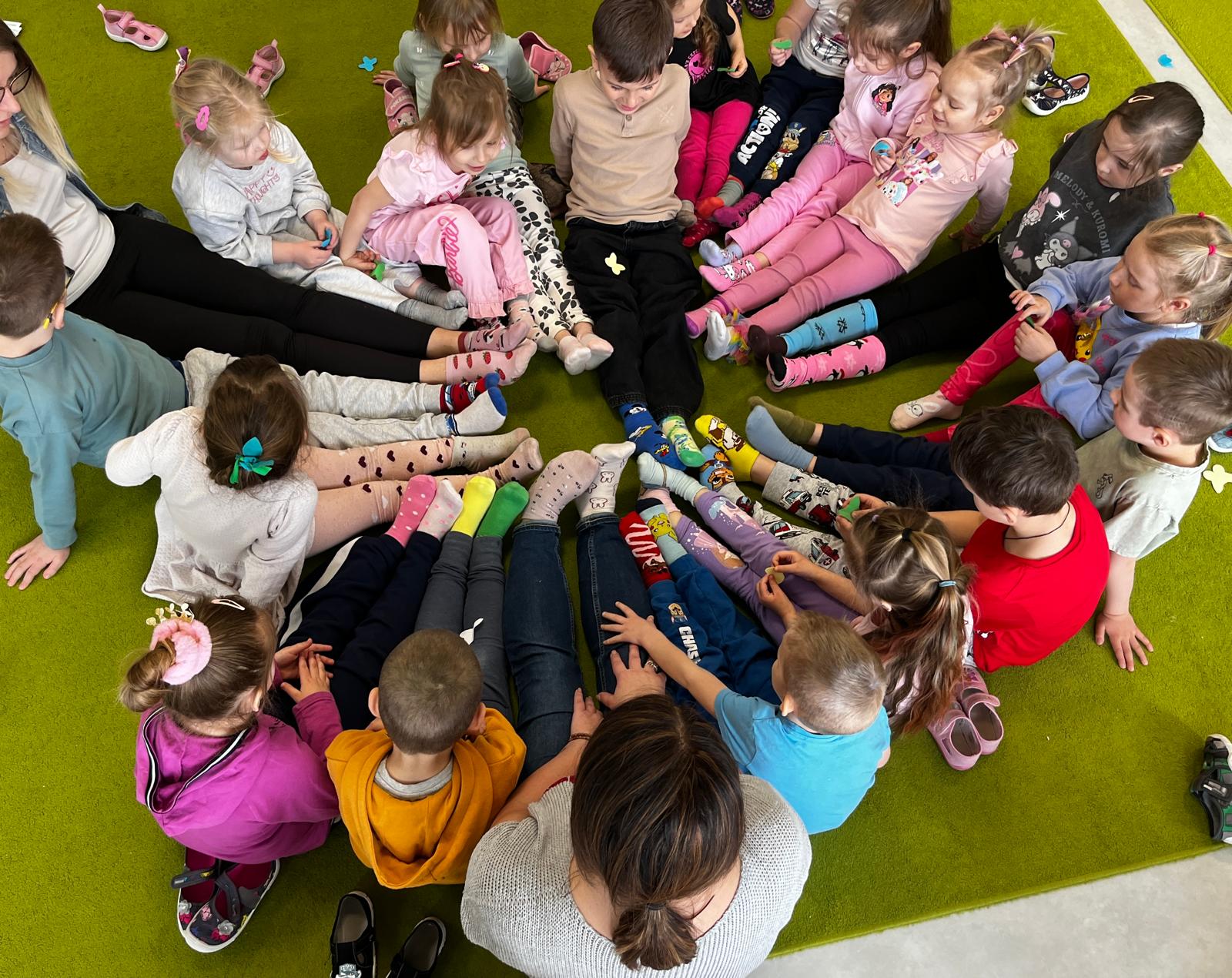 Dnia 20.03 26 roku w naszym przedszkolu obchodziliśmy Dzień Kolorowej Skarpetki – Światowy Dzień Zespołu Downa. Celem wydarzenia było zwiększenie u dzieci świadomości na temat Zespołu Downa, promowanie akceptacji i tolerancji. Wszystkie dzieci oraz pracownicy tego dnia ubrali skarpetki nie do pary, natomiast nauczycielki, odpowiedzialne za zorganizowanie tego święta odwiedziły każdy oddział, gdzie w sposób zrozumiały dla dzieci wytłumaczyły na czym polega ten dzień. Wykorzystały do tego piosenkę o kolorowych skarpetkach oraz bajkę pt.” Kolorowe skarpetki”. Następnie każda grupa miała zadanie, aby w dowolny sposób ozdobić dwie skarpetki oczywiście musiały być nie do pary. Na koniec dzieci przywiesiły swoje ozdobione skarpetki na korytarzu przedszkolnym. Dzień minął w atmosferze solidarności, radości, akceptacji i edukacji.
