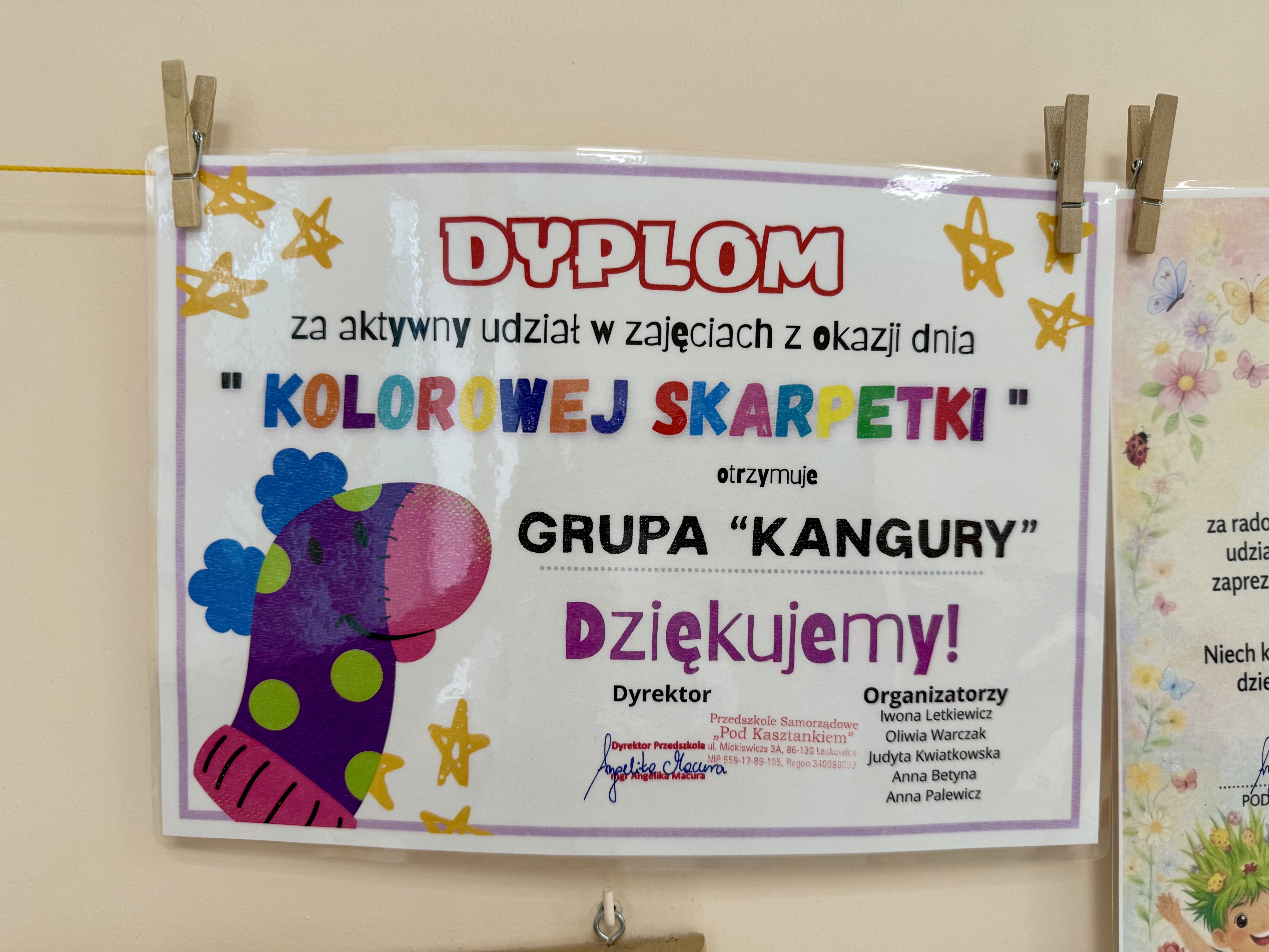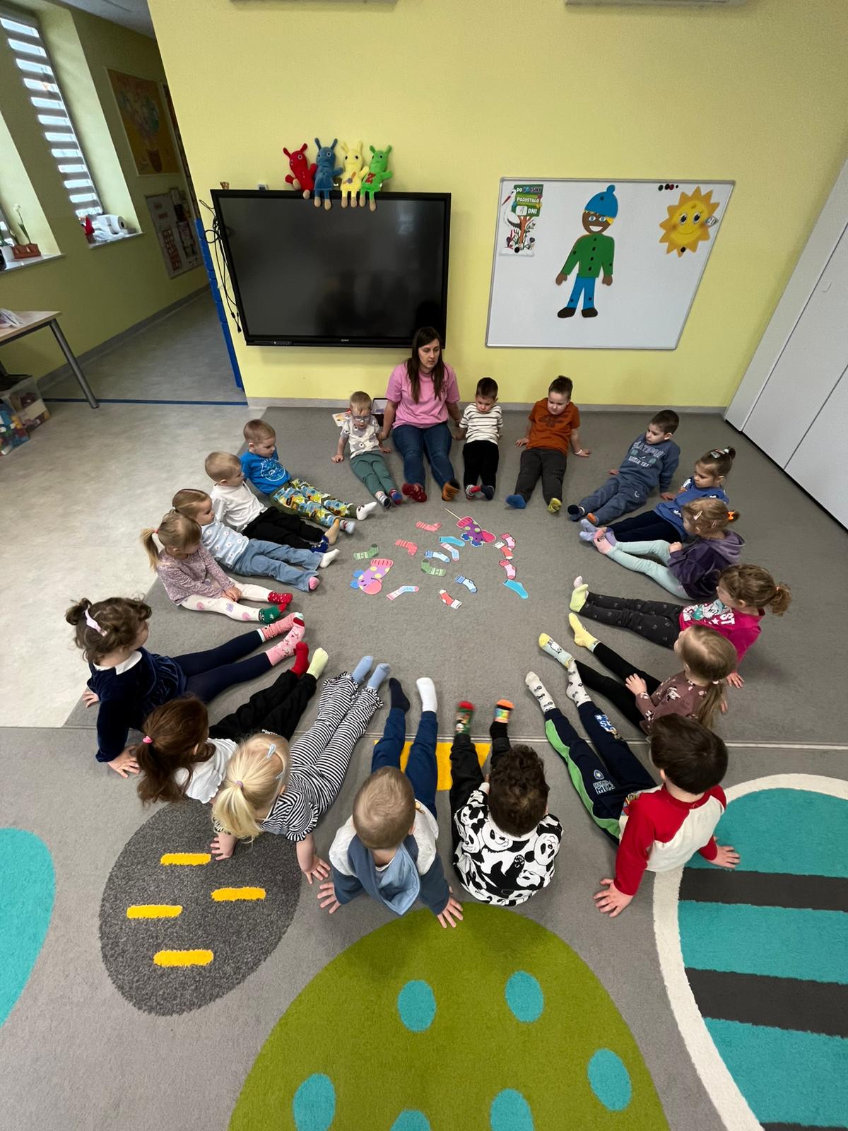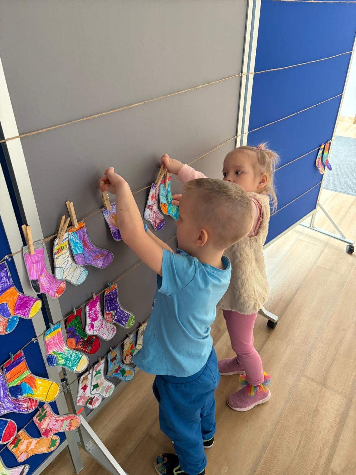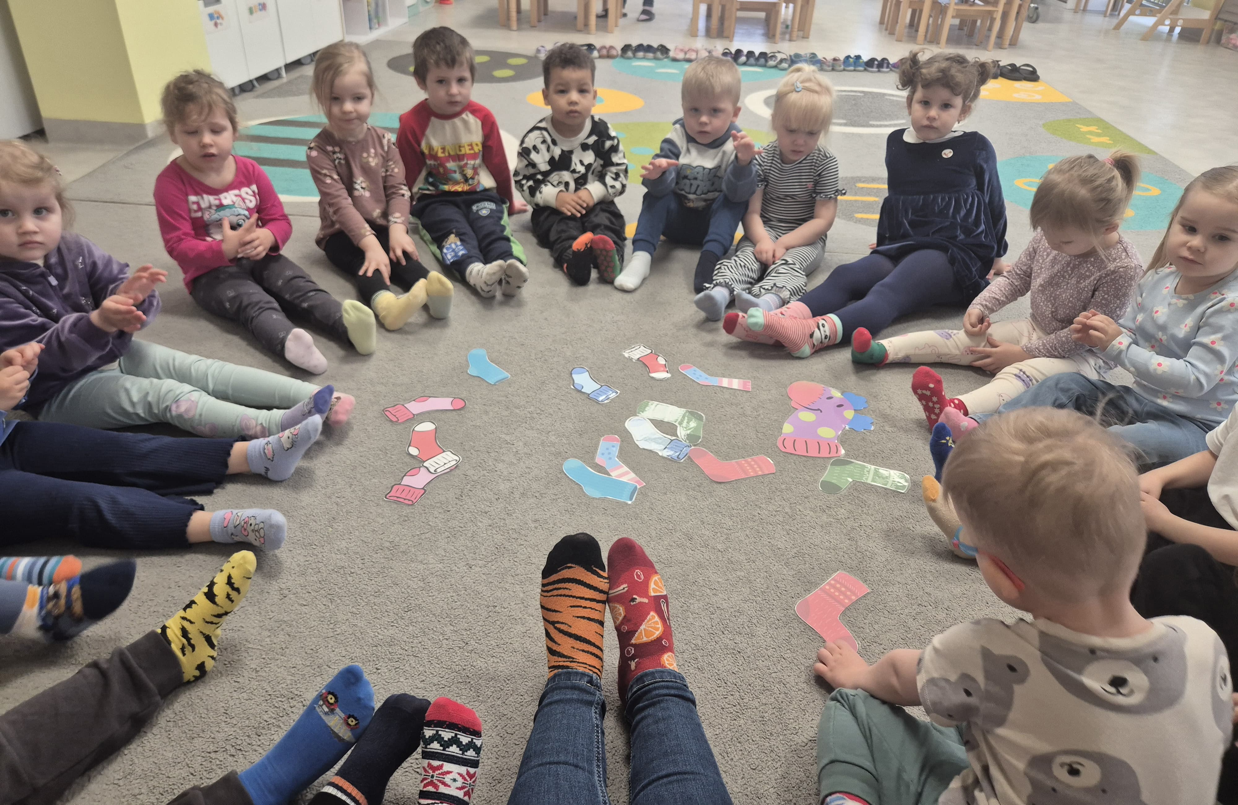 Dnia 20.03 26 roku w naszym przedszkolu obchodziliśmy Dzień Kolorowej Skarpetki – Światowy Dzień Zespołu Downa. Celem wydarzenia było zwiększenie u dzieci świadomości na temat Zespołu Downa, promowanie akceptacji i tolerancji. Wszystkie dzieci oraz pracownicy tego dnia ubrali skarpetki nie do pary, natomiast nauczycielki, odpowiedzialne za zorganizowanie tego święta odwiedziły każdy oddział, gdzie w sposób zrozumiały dla dzieci wytłumaczyły na czym polega ten dzień. Wykorzystały do tego piosenkę o kolorowych skarpetkach oraz bajkę pt.” Kolorowe skarpetki”. Następnie każda grupa miała zadanie, aby w dowolny sposób ozdobić dwie skarpetki oczywiście musiały być nie do pary. Na koniec dzieci przywiesiły swoje ozdobione skarpetki na korytarzu przedszkolnym. Dzień minął w atmosferze solidarności, radości, akceptacji i edukacji.