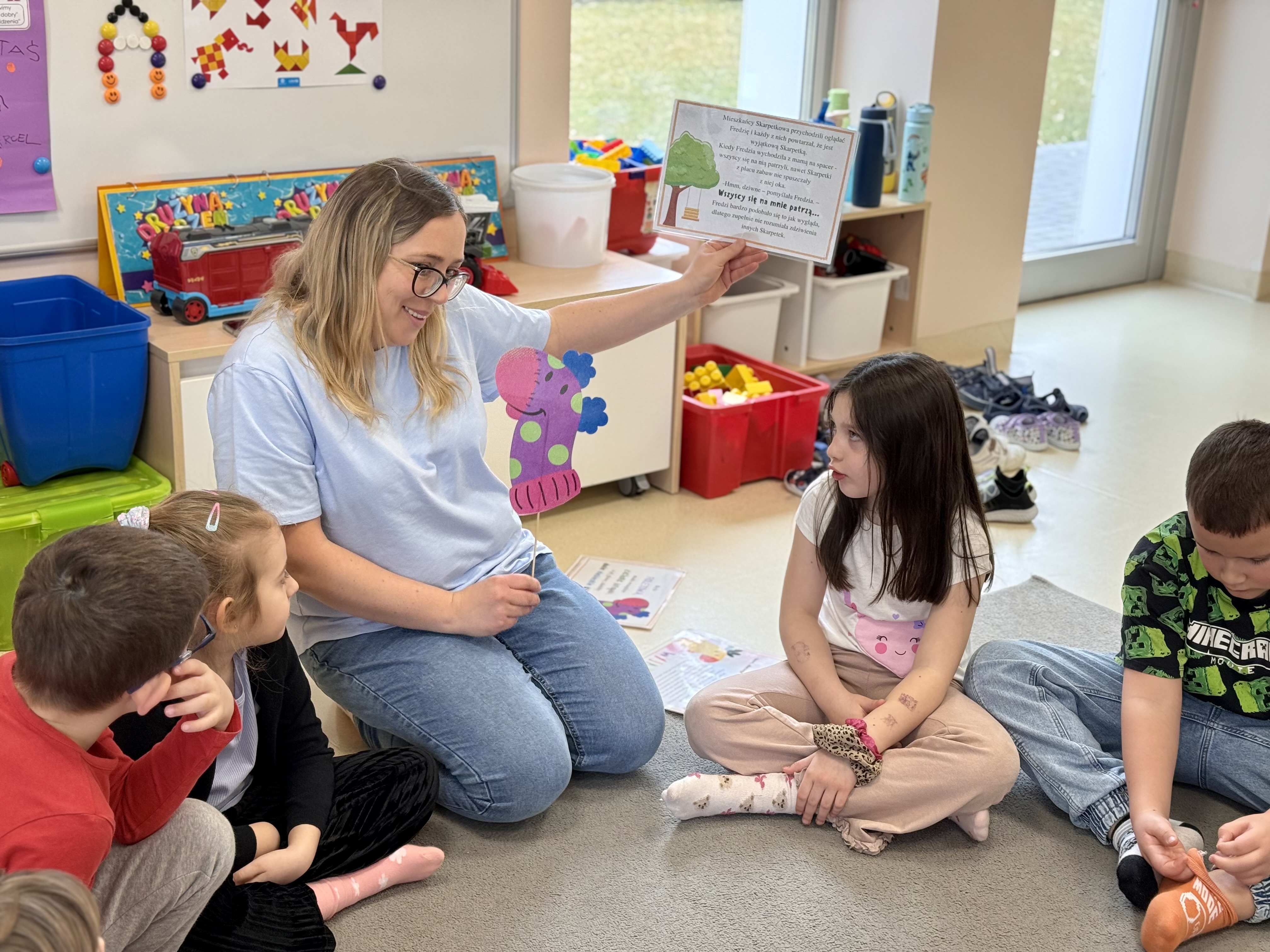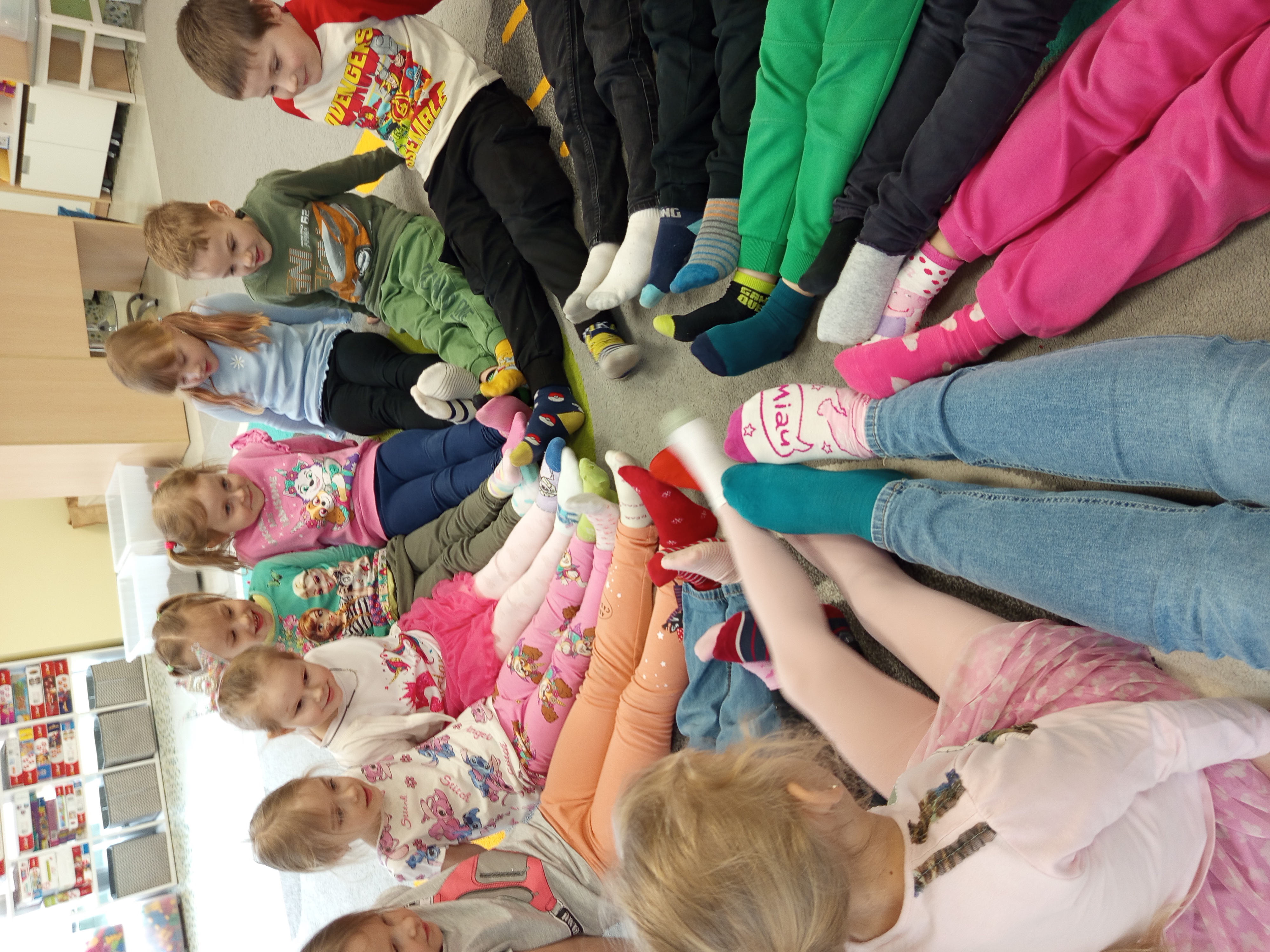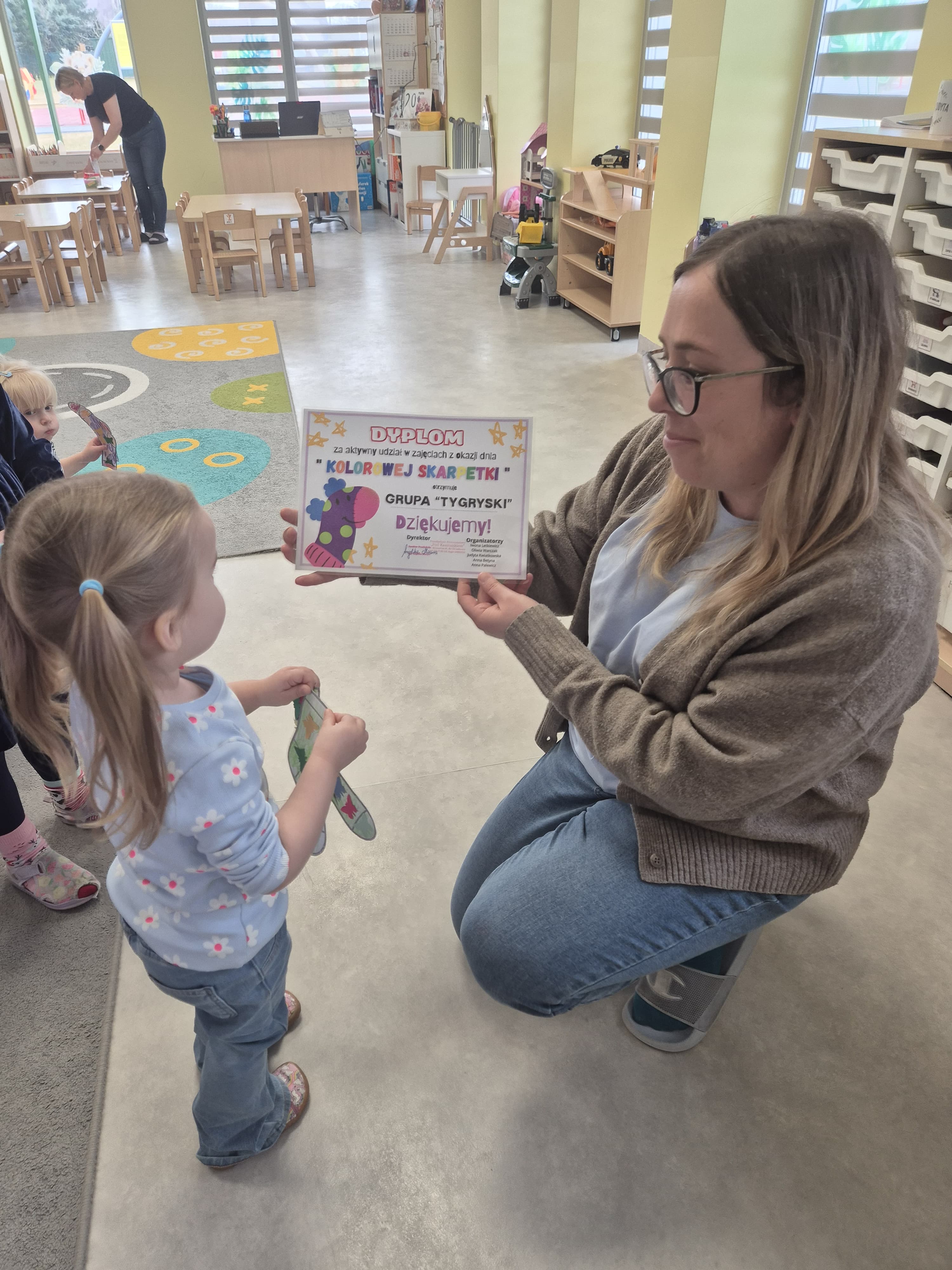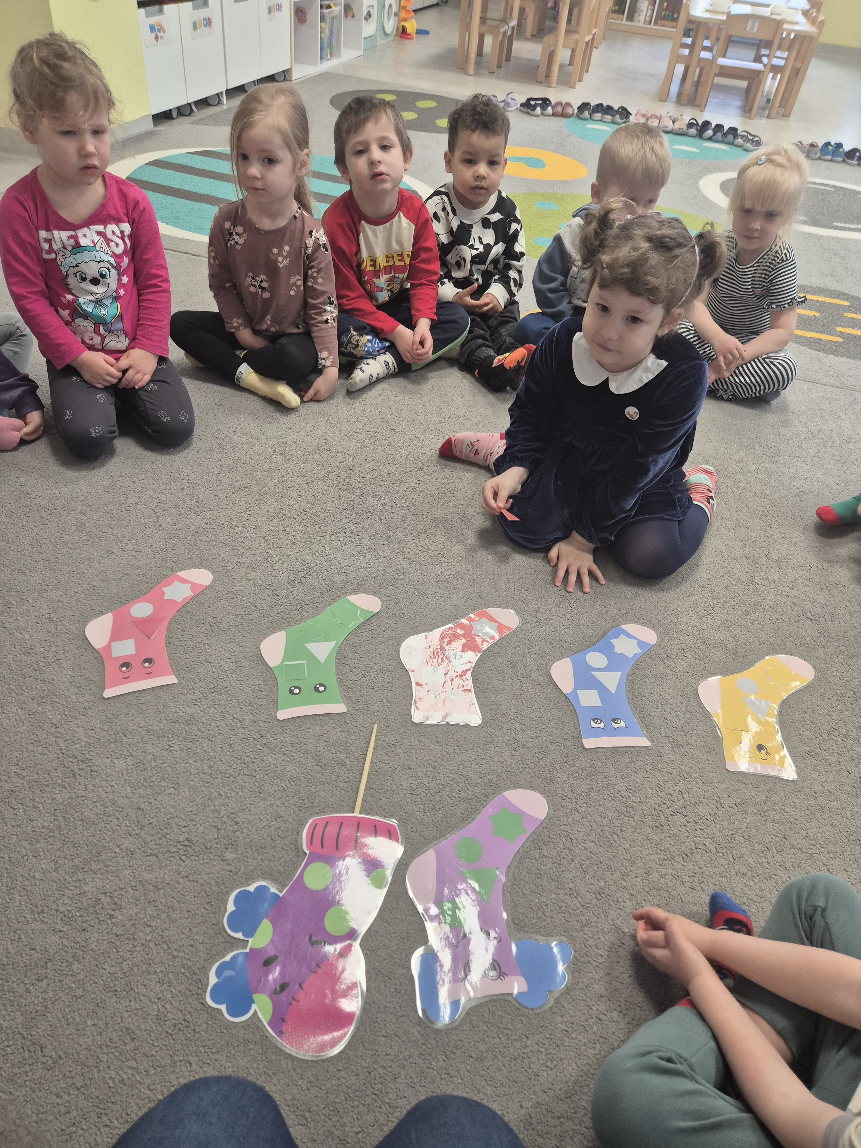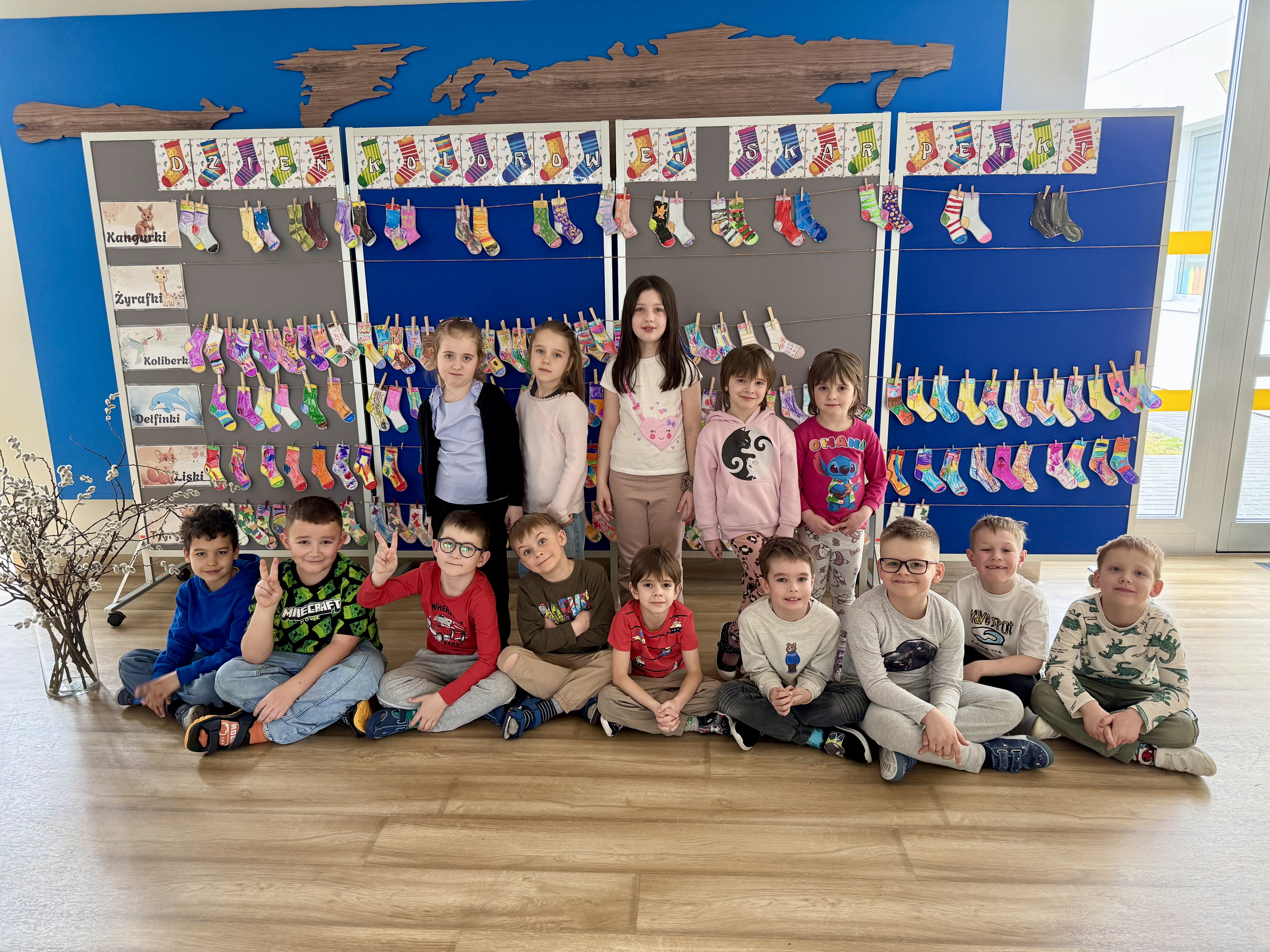 Dnia 20.03 26 roku w naszym przedszkolu obchodziliśmy Dzień Kolorowej Skarpetki – Światowy Dzień Zespołu Downa. Celem wydarzenia było zwiększenie u dzieci świadomości na temat Zespołu Downa, promowanie akceptacji i tolerancji. Wszystkie dzieci oraz pracownicy tego dnia ubrali skarpetki nie do pary, natomiast nauczycielki, odpowiedzialne za zorganizowanie tego święta odwiedziły każdy oddział, gdzie w sposób zrozumiały dla dzieci wytłumaczyły na czym polega ten dzień. Wykorzystały do tego piosenkę o kolorowych skarpetkach oraz bajkę pt.” Kolorowe skarpetki”. Następnie każda grupa miała zadanie, aby w dowolny sposób ozdobić dwie skarpetki oczywiście musiały być nie do pary. Na koniec dzieci przywiesiły swoje ozdobione skarpetki na korytarzu przedszkolnym. Dzień minął w atmosferze solidarności, radości, akceptacji i edukacji.