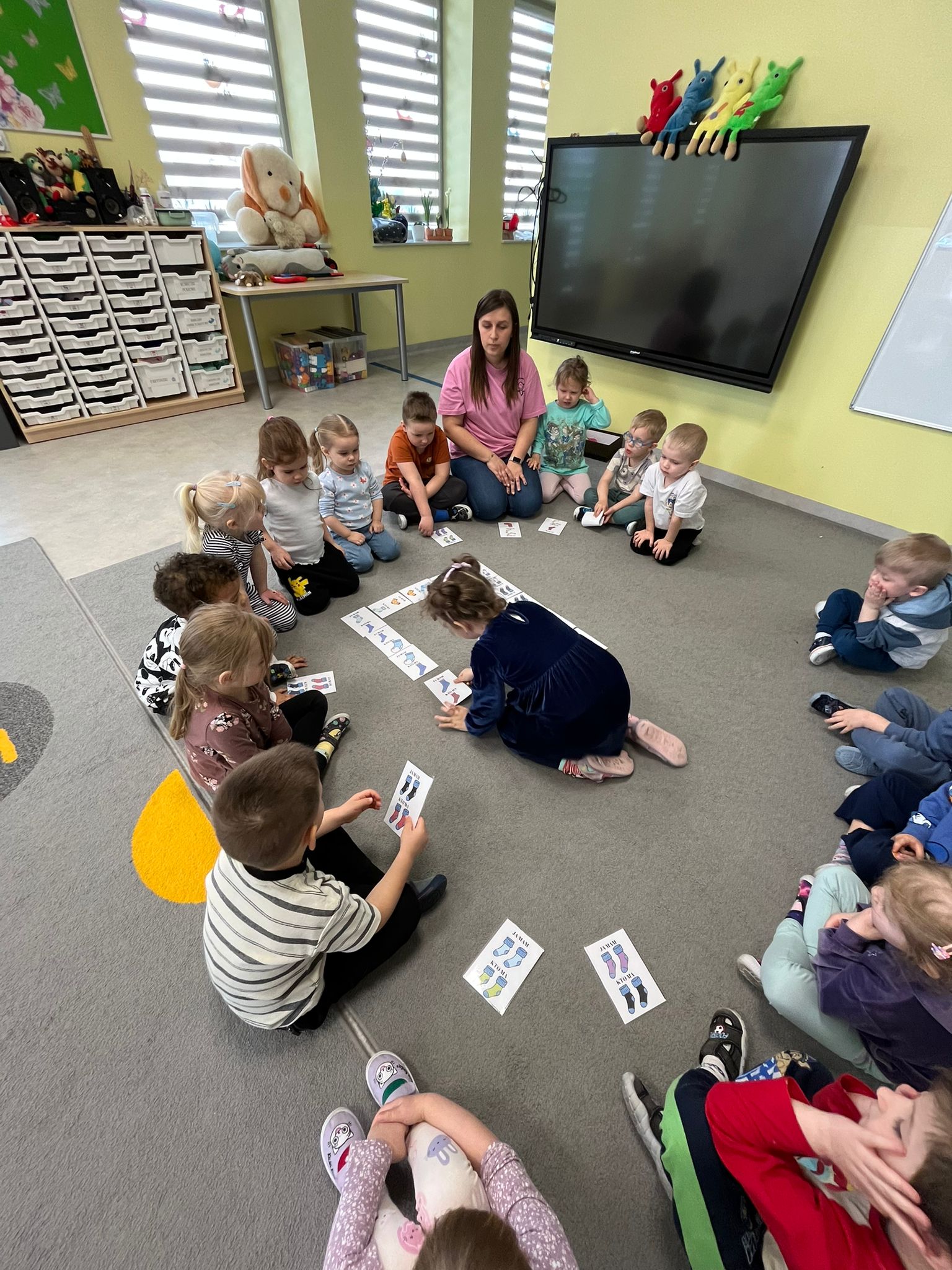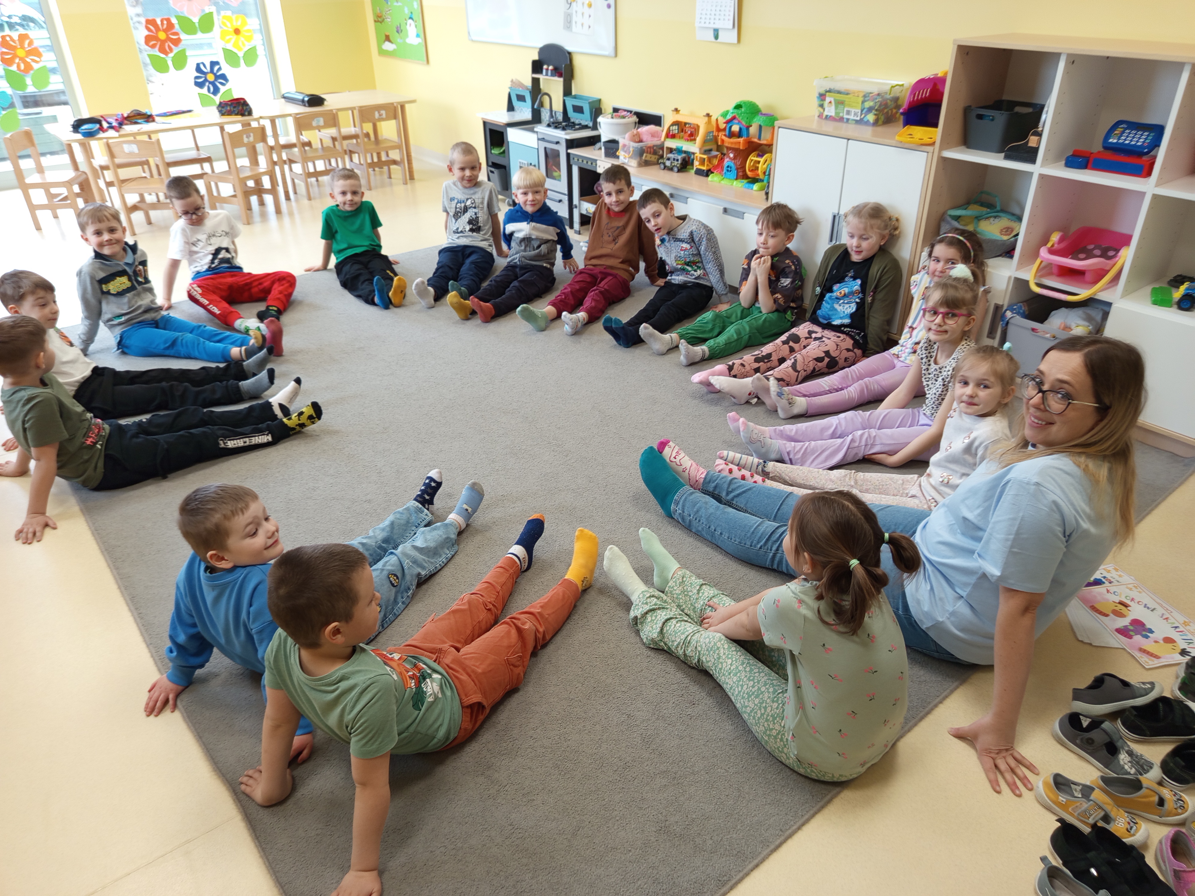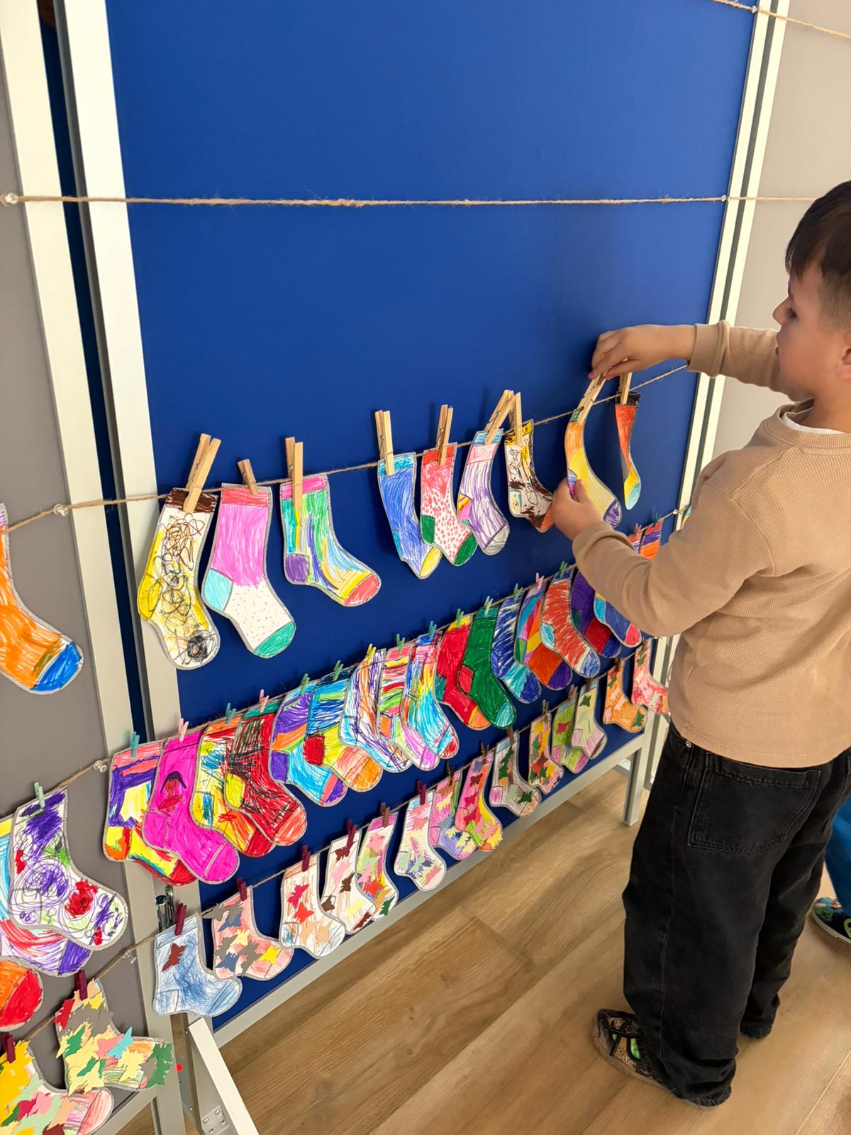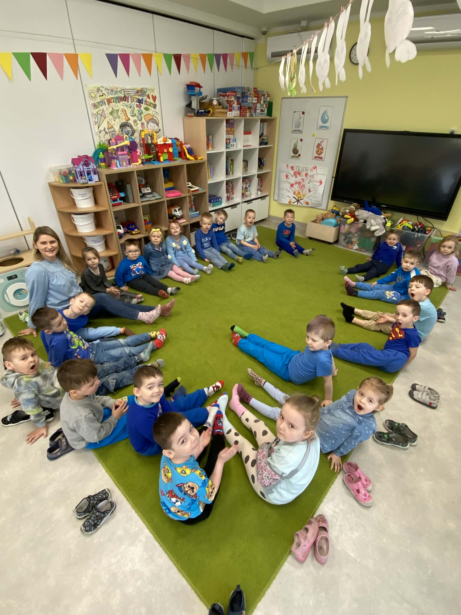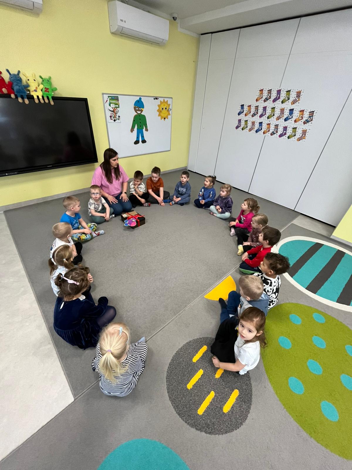 Dnia 20.03 26 roku w naszym przedszkolu obchodziliśmy Dzień Kolorowej Skarpetki – Światowy Dzień Zespołu Downa. Celem wydarzenia było zwiększenie u dzieci świadomości na temat Zespołu Downa, promowanie akceptacji i tolerancji. Wszystkie dzieci oraz pracownicy tego dnia ubrali skarpetki nie do pary, natomiast nauczycielki, odpowiedzialne za zorganizowanie tego święta odwiedziły każdy oddział, gdzie w sposób zrozumiały dla dzieci wytłumaczyły na czym polega ten dzień. Wykorzystały do tego piosenkę o kolorowych skarpetkach oraz bajkę pt.” Kolorowe skarpetki”. Następnie każda grupa miała zadanie, aby w dowolny sposób ozdobić dwie skarpetki oczywiście musiały być nie do pary. Na koniec dzieci przywiesiły swoje ozdobione skarpetki na korytarzu przedszkolnym. Dzień minął w atmosferze solidarności, radości, akceptacji i edukacji.