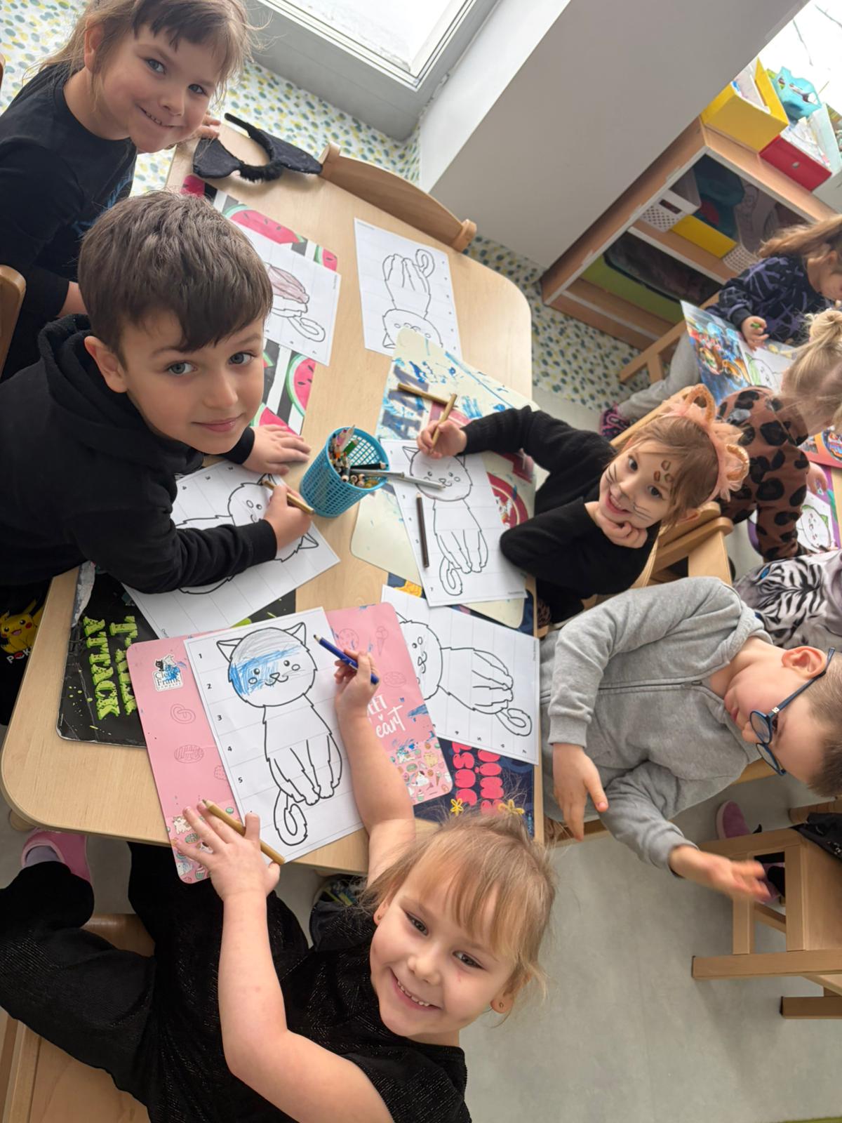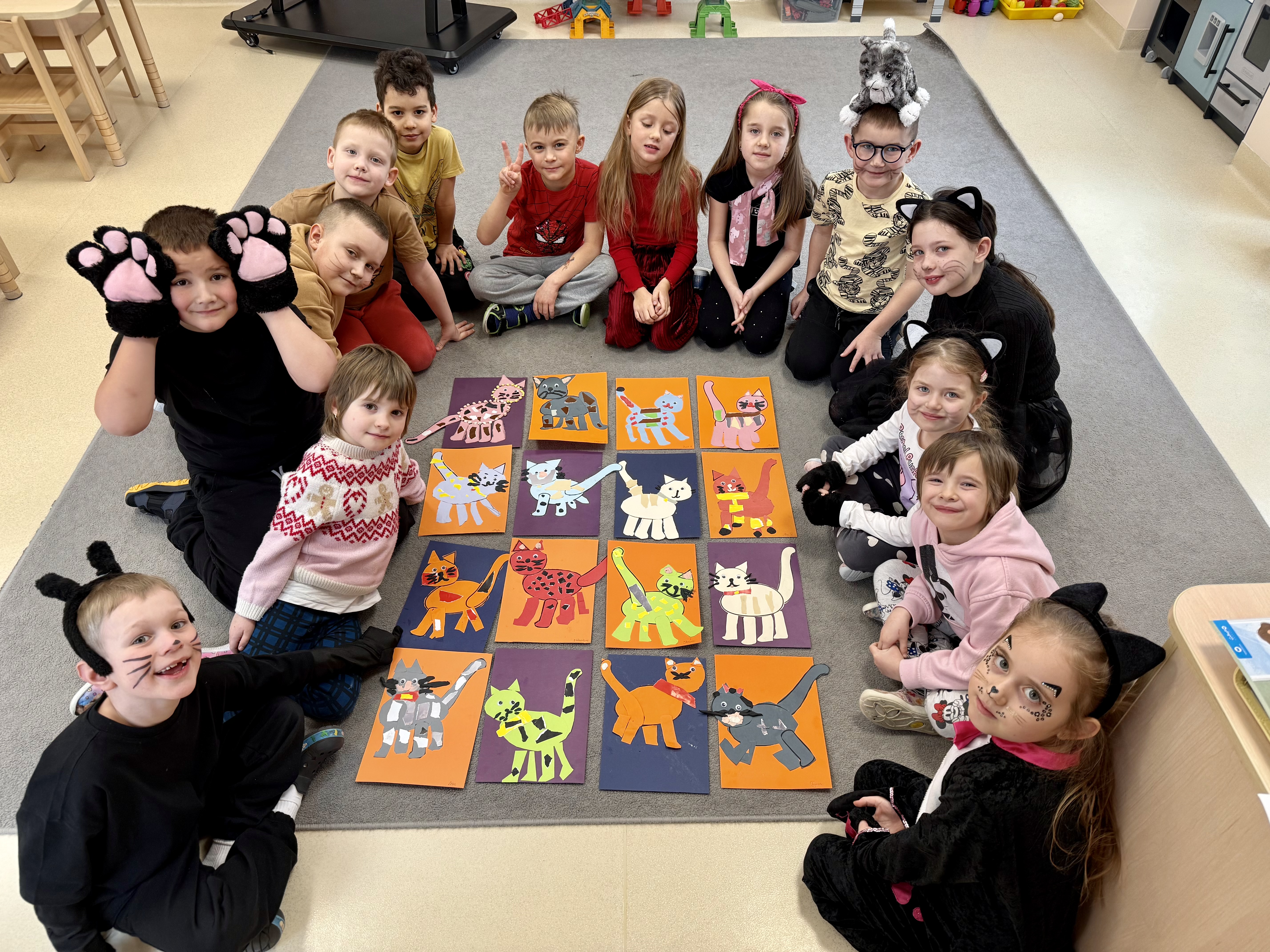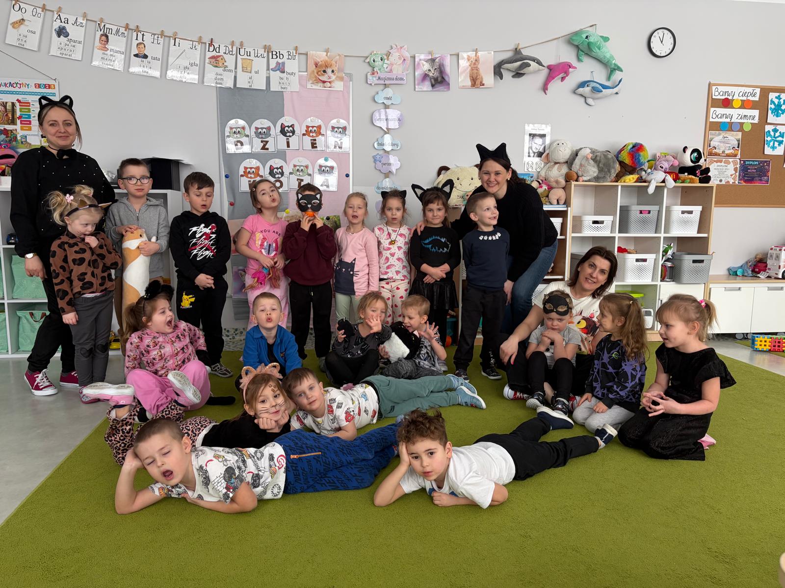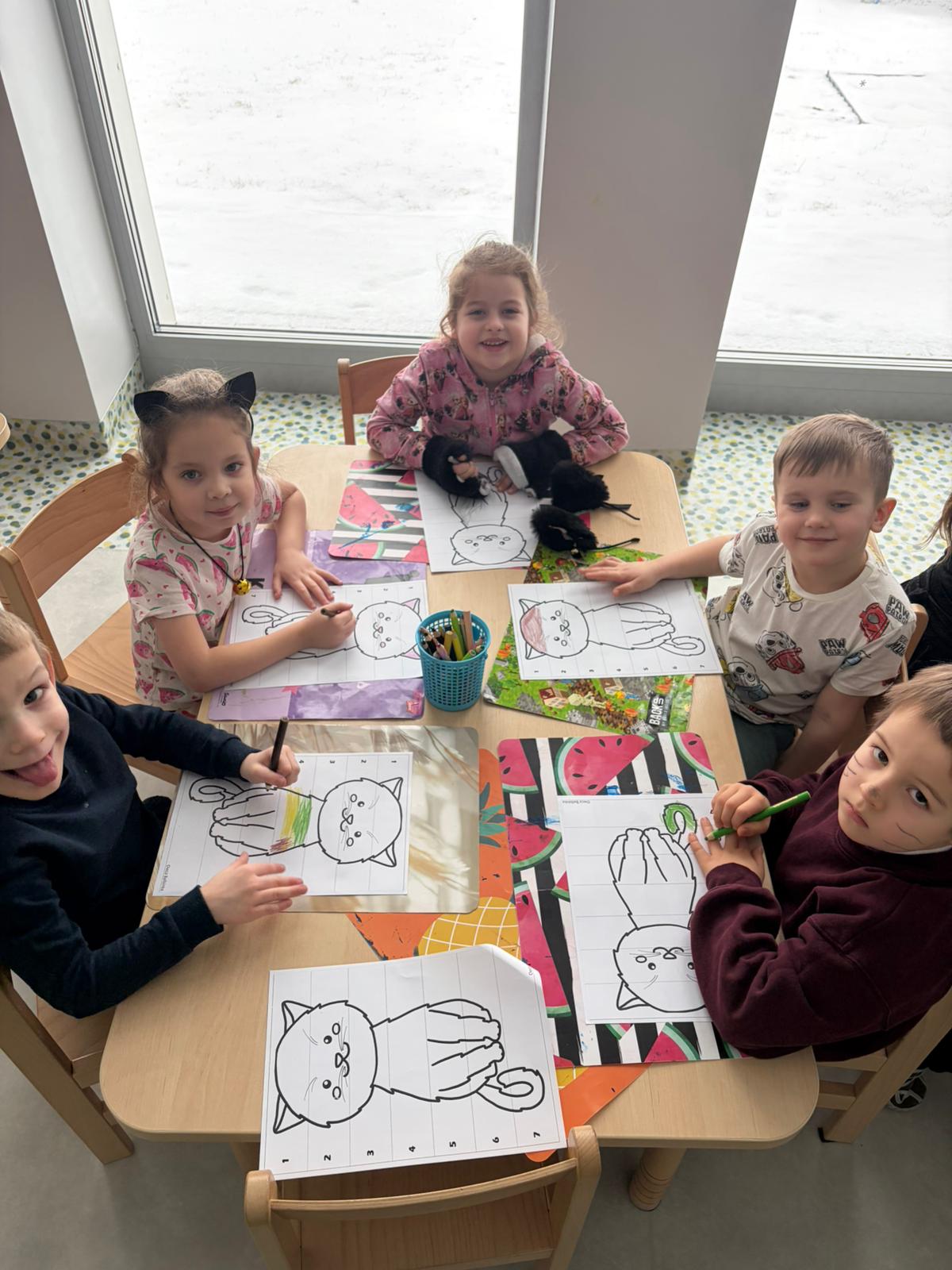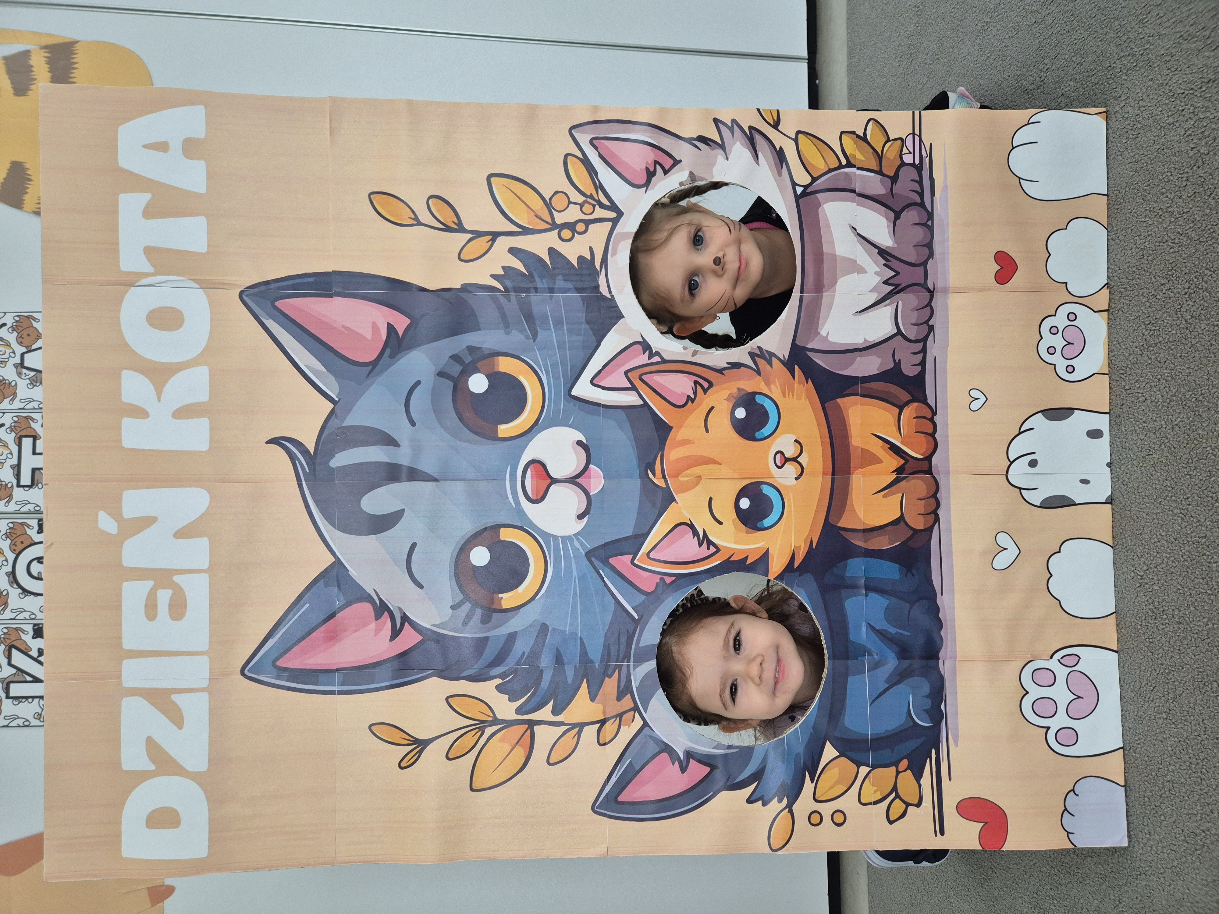 Dnia 17 lutego w naszym przedszkolu obchodziliśmy Dzień Kota. Celem zajęć było rozwijanie wrażliwości na potrzeby zwierząt oraz poszerzenie wiedzy dzieci na temat kotów. Tego dnia przedszkolaki przyszły ubrane w stroje z kocimi elementami – nie zabrakło opasek z uszkami, wąsików oraz ogonków. Dzieci z zainteresowaniem wysłuchały ciekawostek o kotach, poznały ich zwyczaje oraz dowiedziały się, jak należy dbać o domowe pupile. Rozmawialiśmy również o znanych kotach z bajek, takich jak Garfield czy Kot w Butach. Podczas zajęć plastycznych dzieci wykonały prace przedstawiające koty różnymi technikami. Nie zabrakło także zabaw ruchowych, takich jak „Kocie polowanie” oraz „Spacer kotka”, które dostarczyły wszystkim wiele radości i śmiechu. Na zakończenie dnia dzieci wspólnie śpiewały piosenki o kotach oraz obejrzały krótką bajkę edukacyjną. Był to dzień pełen uśmiechu, zabawy i nowych doświadczeń.