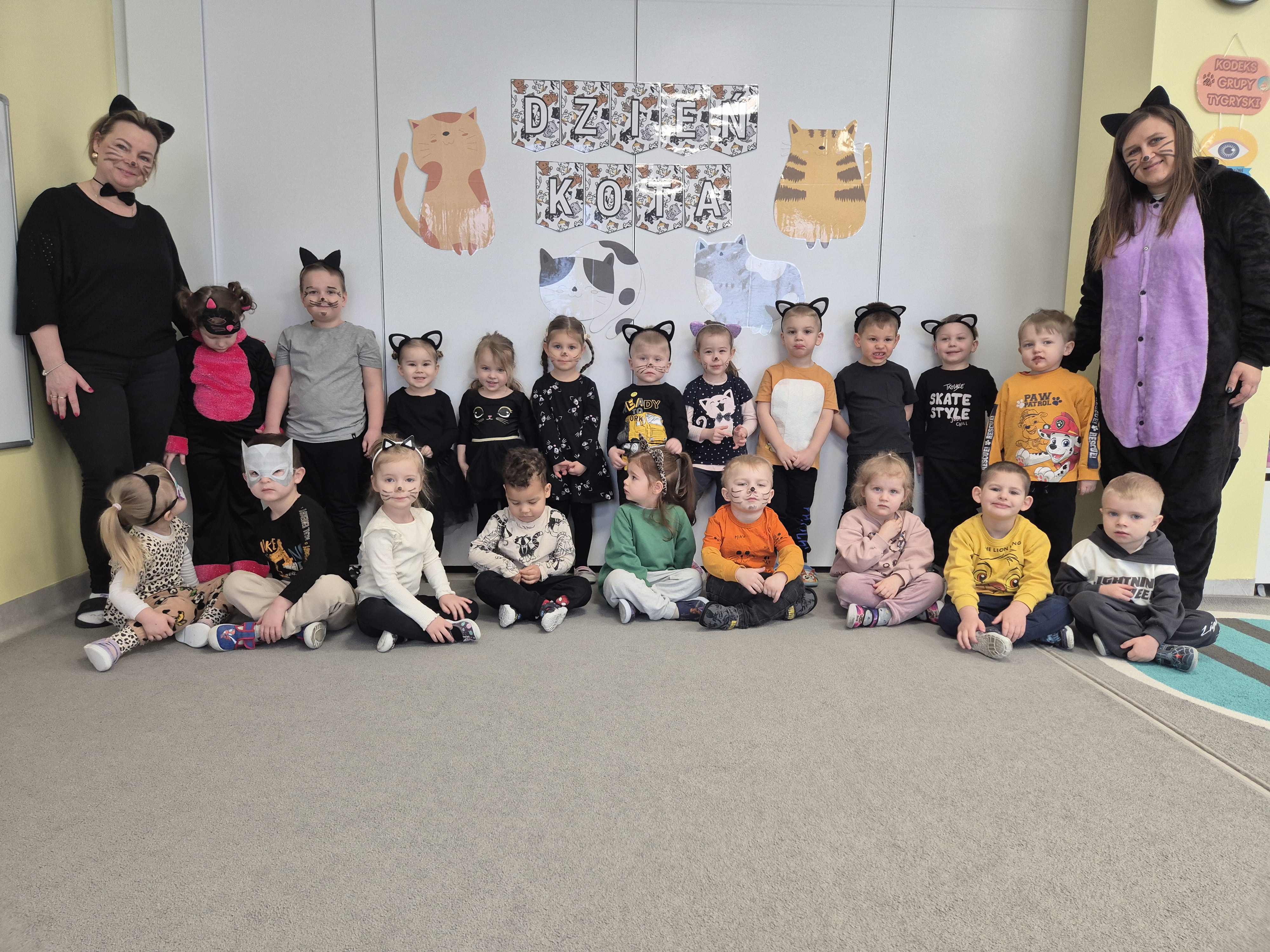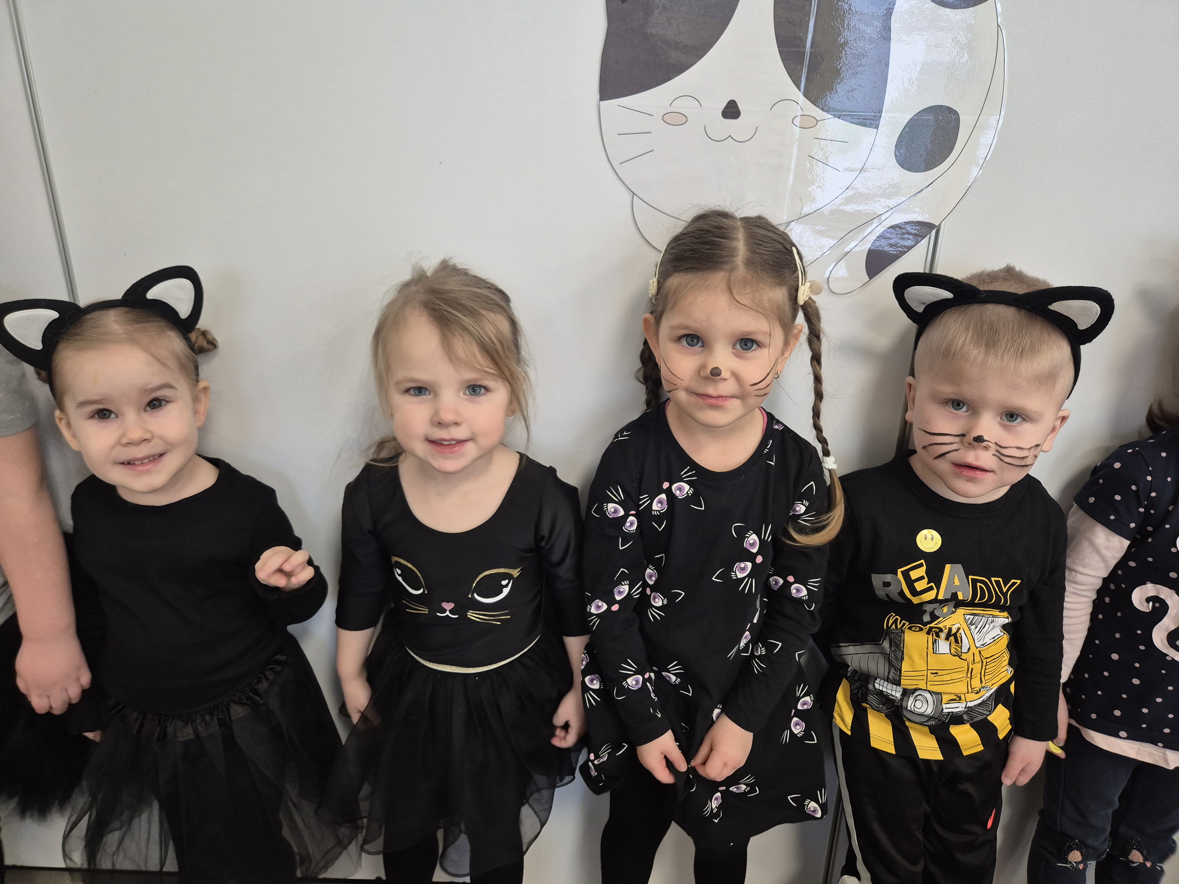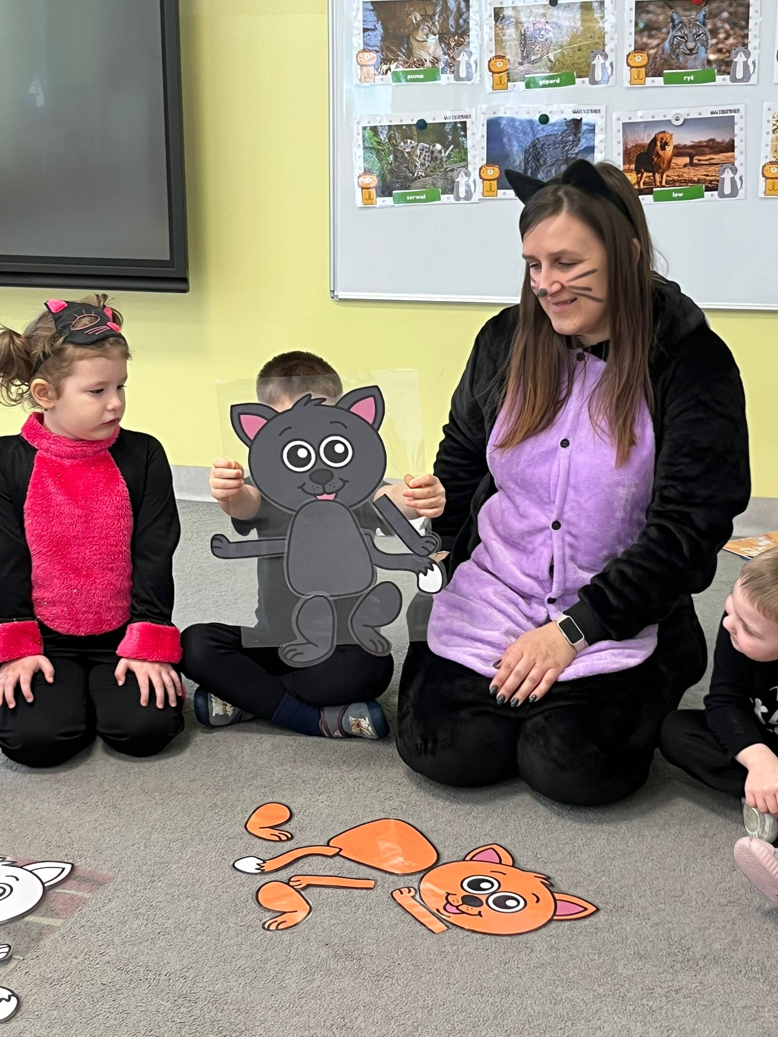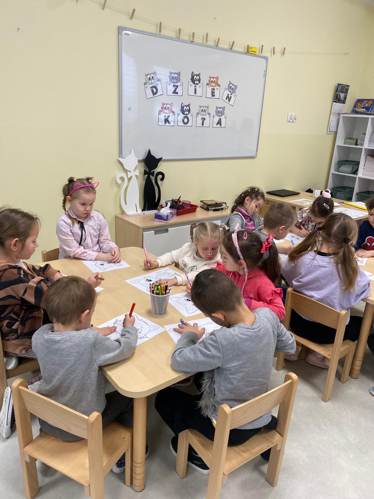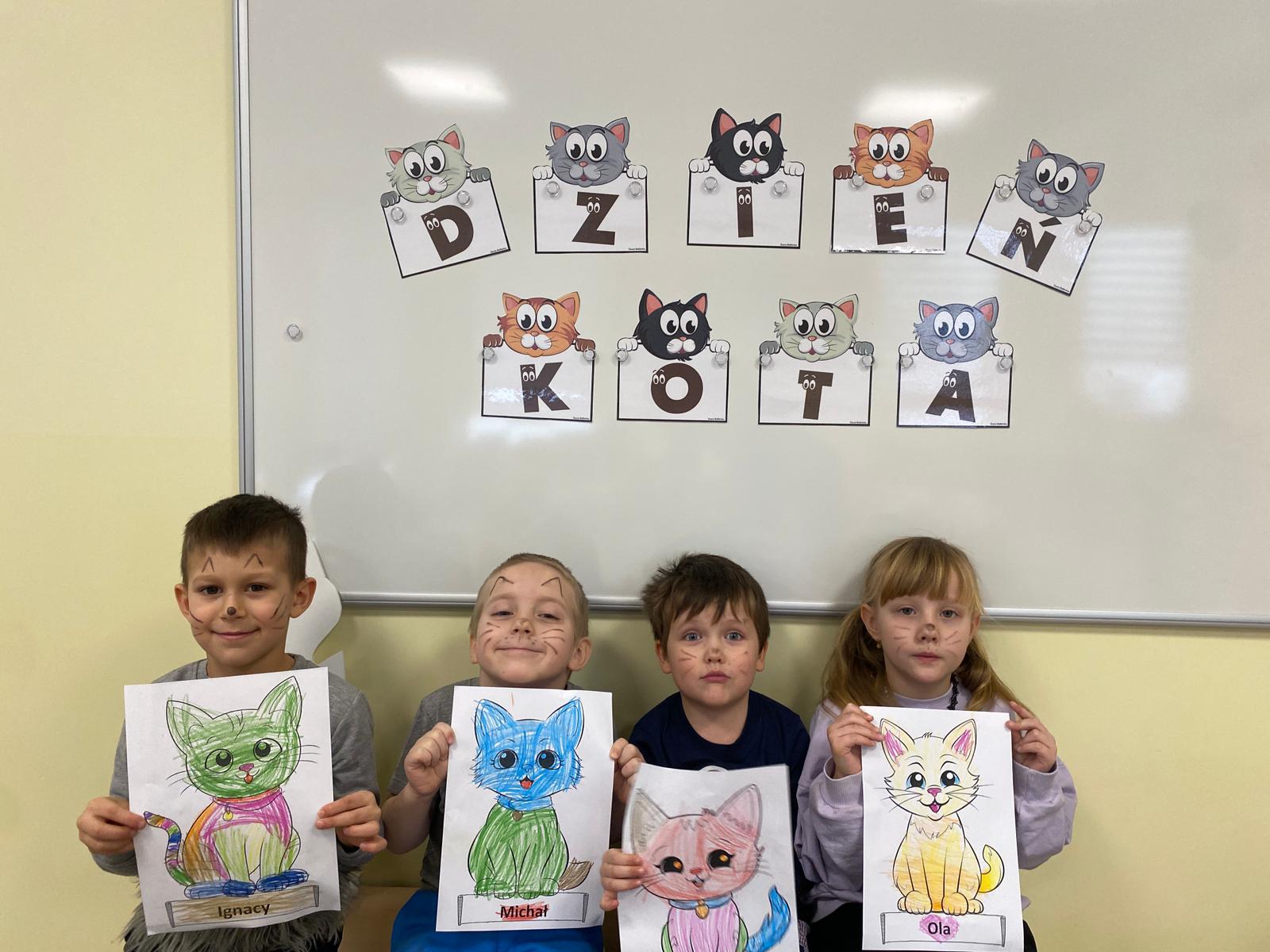 Dnia 17 lutego w naszym przedszkolu obchodziliśmy Dzień Kota. Celem zajęć było rozwijanie wrażliwości na potrzeby zwierząt oraz poszerzenie wiedzy dzieci na temat kotów. Tego dnia przedszkolaki przyszły ubrane w stroje z kocimi elementami – nie zabrakło opasek z uszkami, wąsików oraz ogonków. Dzieci z zainteresowaniem wysłuchały ciekawostek o kotach, poznały ich zwyczaje oraz dowiedziały się, jak należy dbać o domowe pupile. Rozmawialiśmy również o znanych kotach z bajek, takich jak Garfield czy Kot w Butach. Podczas zajęć plastycznych dzieci wykonały prace przedstawiające koty różnymi technikami. Nie zabrakło także zabaw ruchowych, takich jak „Kocie polowanie” oraz „Spacer kotka”, które dostarczyły wszystkim wiele radości i śmiechu. Na zakończenie dnia dzieci wspólnie śpiewały piosenki o kotach oraz obejrzały krótką bajkę edukacyjną. Był to dzień pełen uśmiechu, zabawy i nowych doświadczeń.