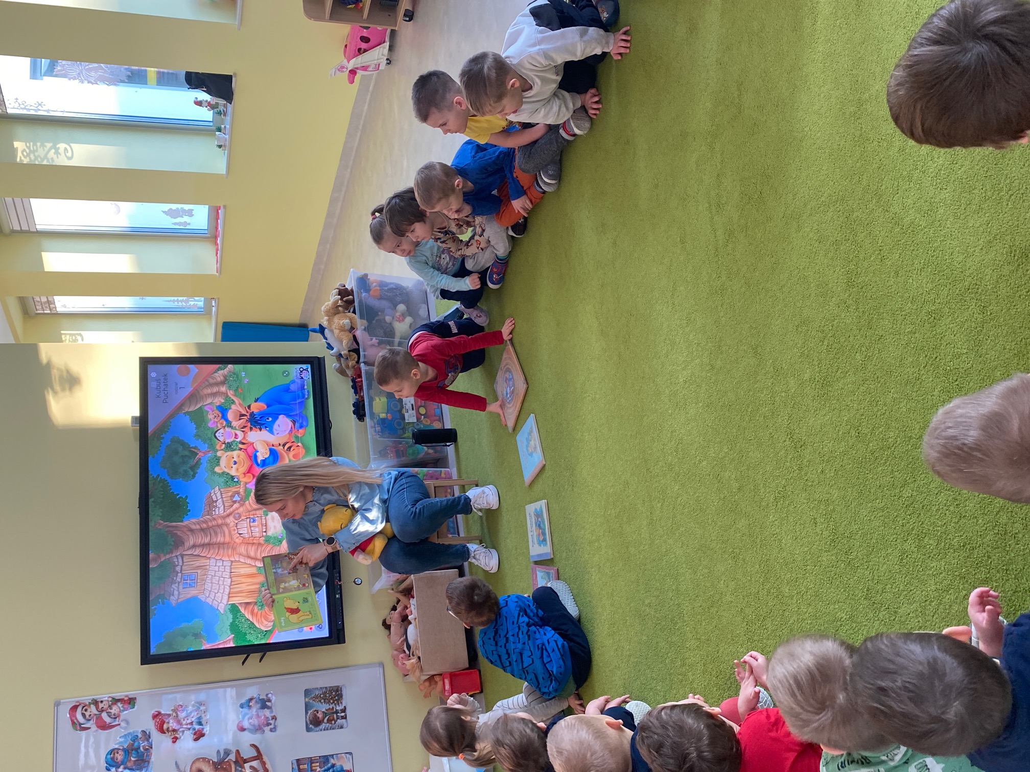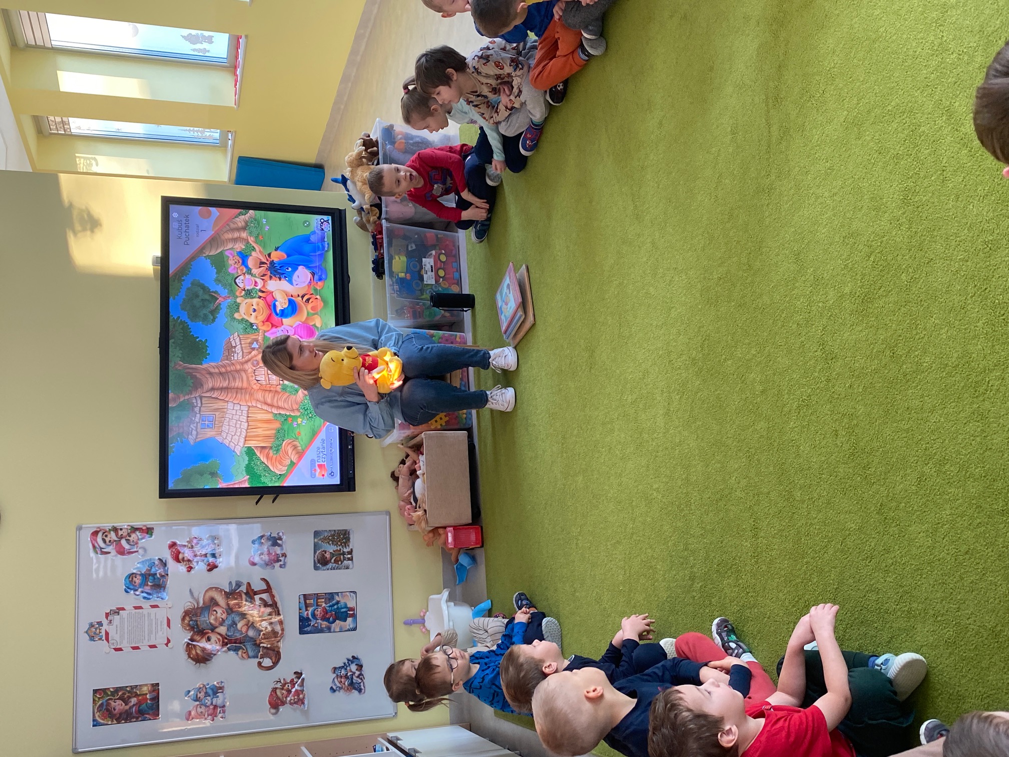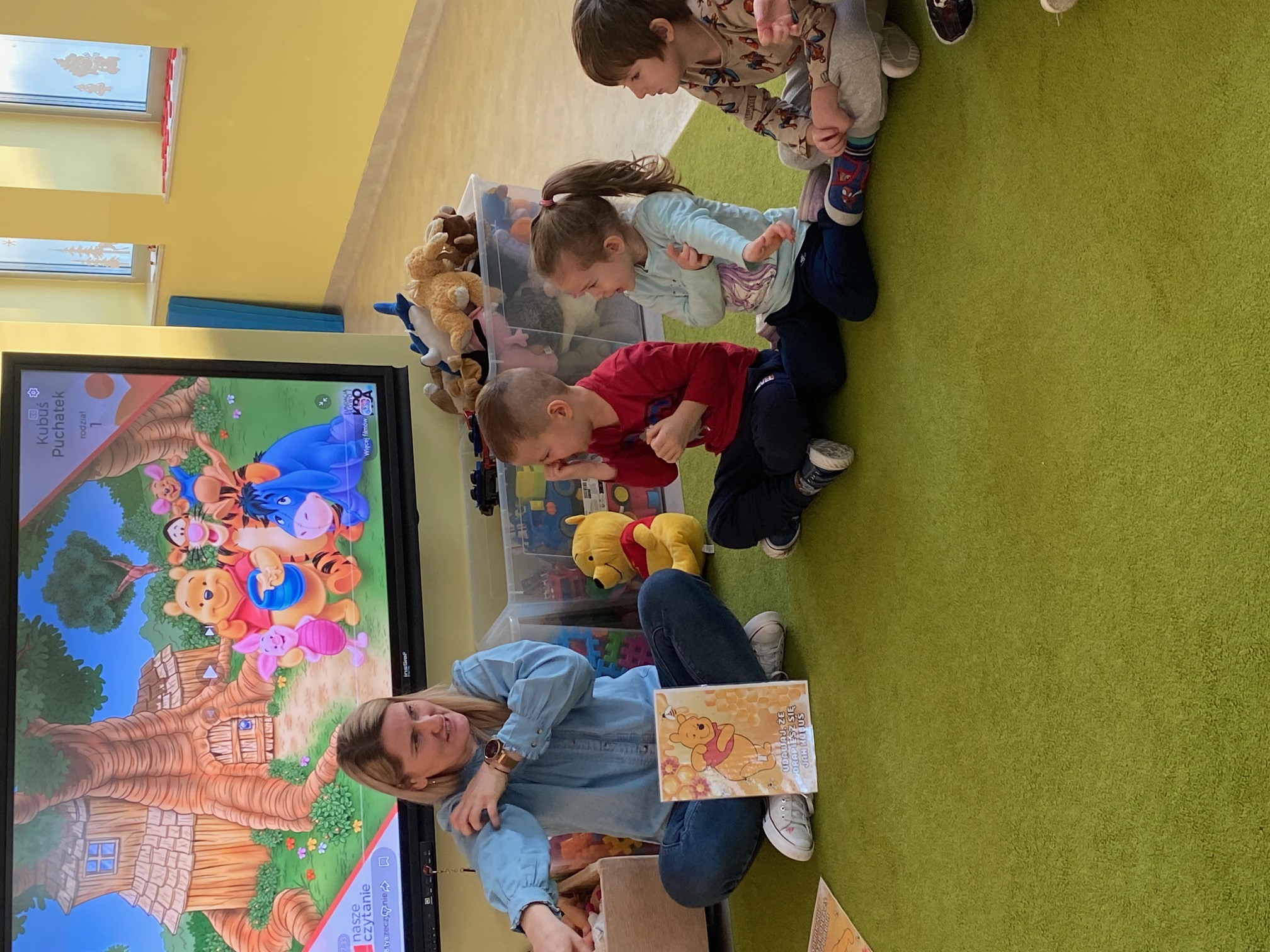 Spotkanie wypełniły zabawy przy muzyce, śpiew oraz taniec do piosenek o Kubusiu Puchatku. Dzieci z entuzjazmem uczestniczyły również w zabawach ruchowych inspirowanych przygodami bohaterów ze Stumilowego Lasu, naśladując prezentowane ruchy i aktywnie włączając się w proponowane działania.