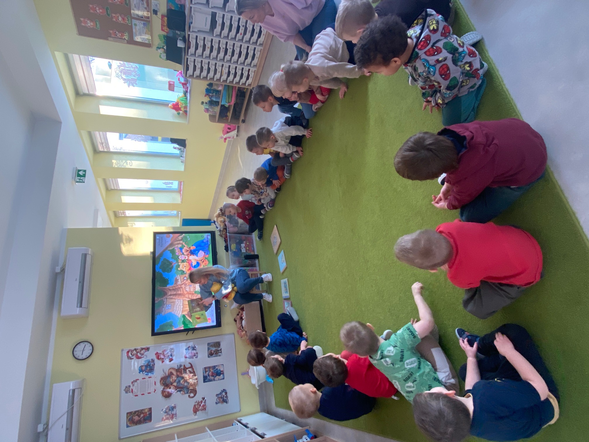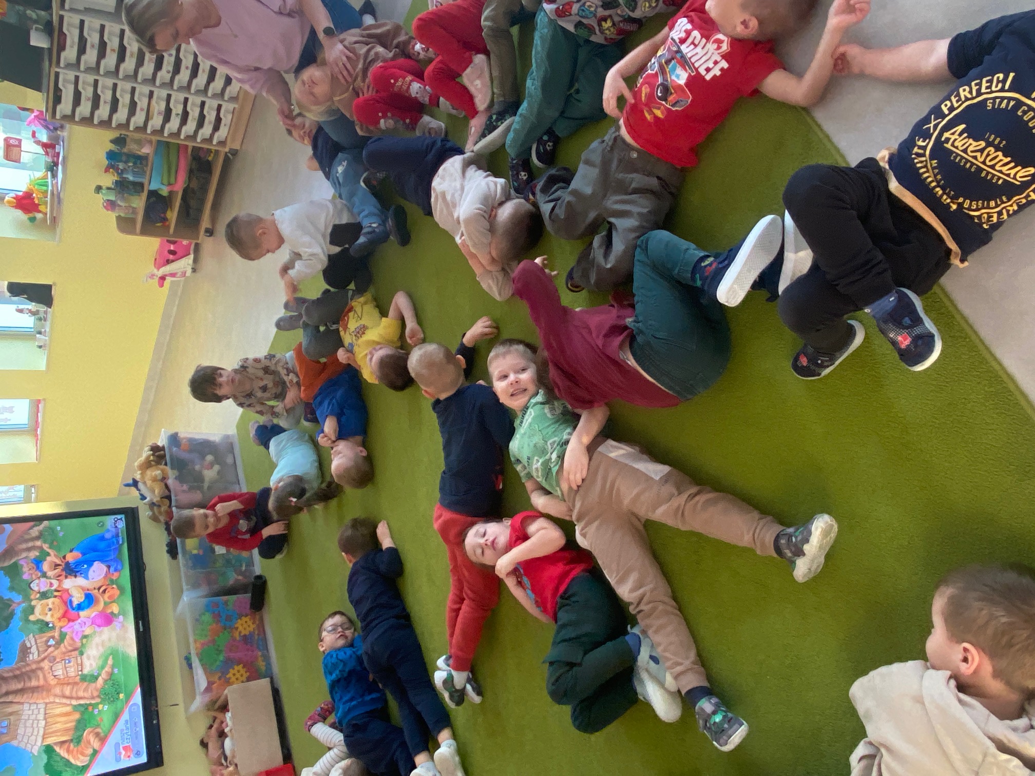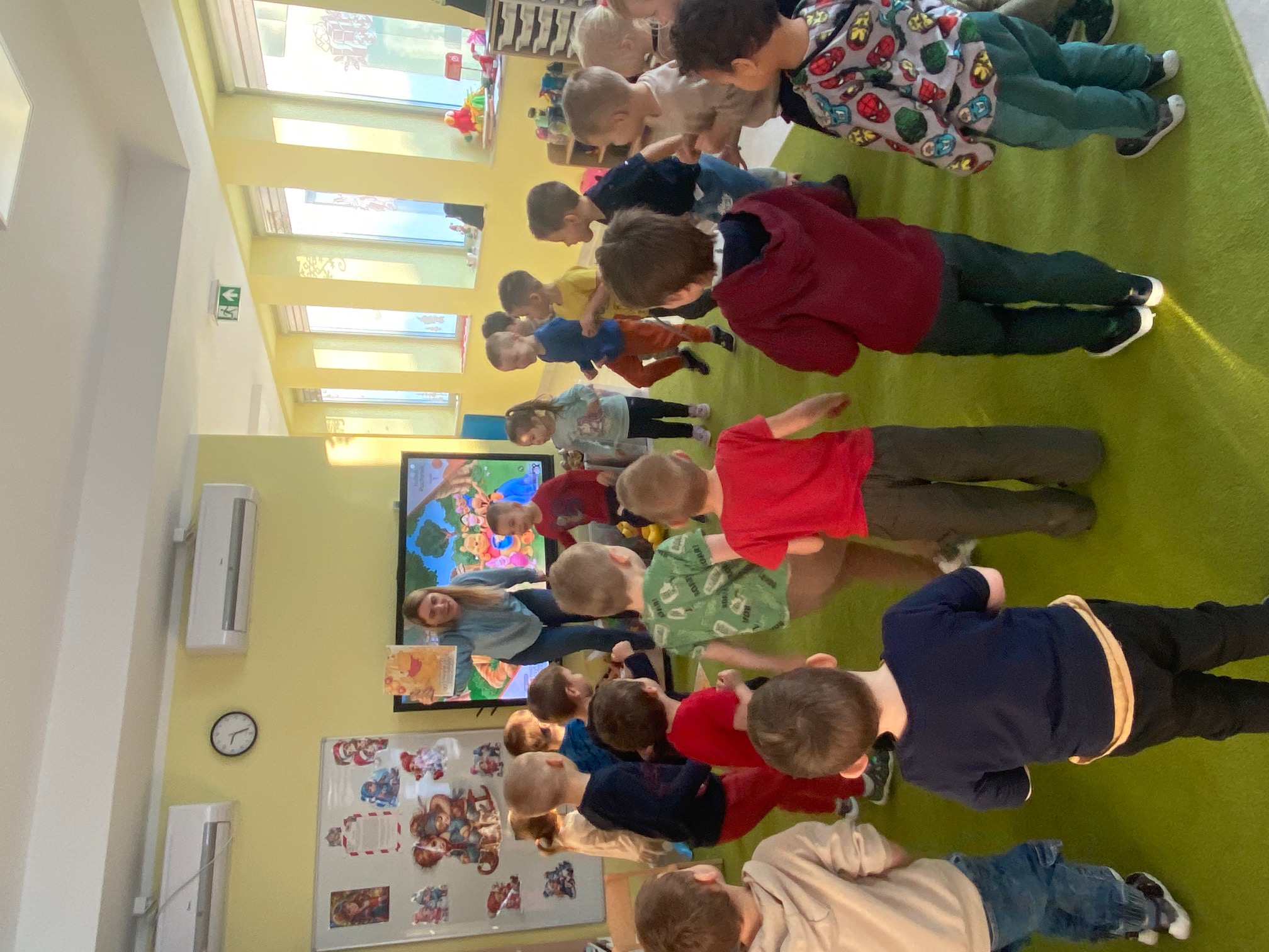 Spotkanie wypełniły zabawy przy muzyce, śpiew oraz taniec do piosenek o Kubusiu Puchatku. Dzieci z entuzjazmem uczestniczyły również w zabawach ruchowych inspirowanych przygodami bohaterów ze Stumilowego Lasu, naśladując prezentowane ruchy i aktywnie włączając się w proponowane działania.