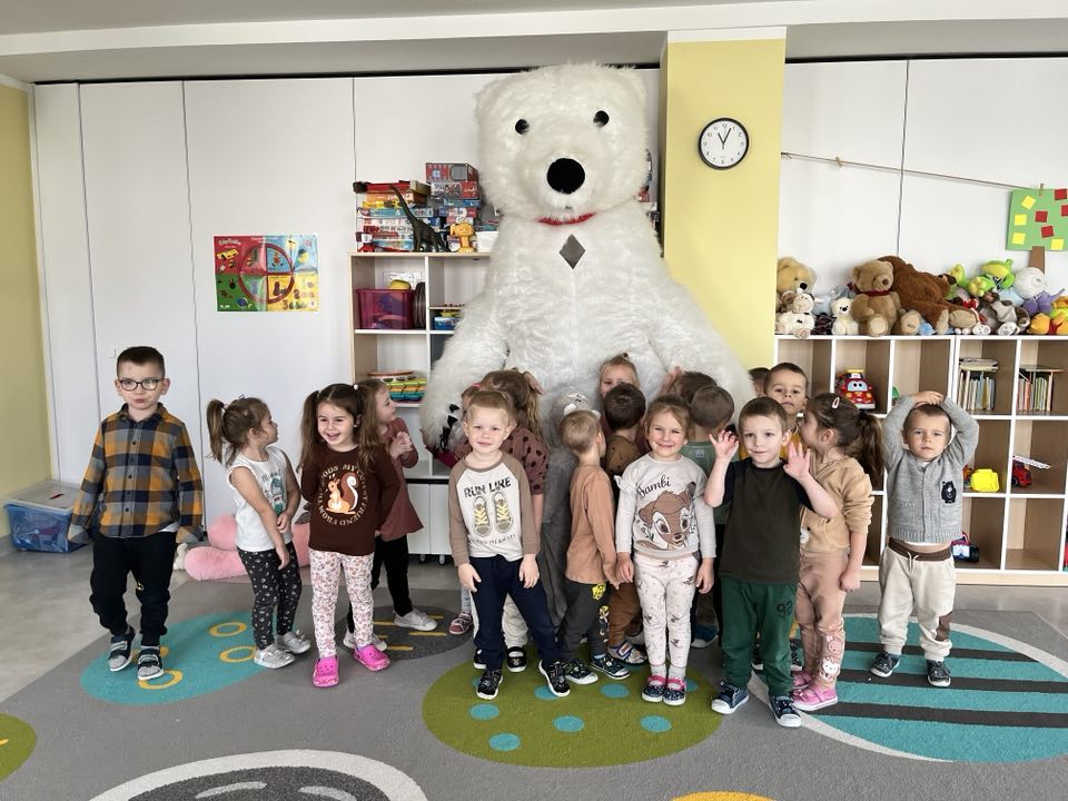 W tym radosnym dniu zawitał do nas także Miś Paweł, 2,5 metrowy biały miś który uświetnił swoją obecnością całą uroczystość. Dzieci przywitały naszego gościa piosenką pt. „Pluszowy miś”. Podczas uroczystości na holu, nasi wychowankowie mieli możliwość wzięcia udziału w różnych konkurencjach dla młodszych i starszych, takich jak: „Kim jestem?”, skakanie w worku, rzut kapeluszem, jedzenie miodu, ubieranie spodenek na czas, czy też misiowa gimnastyka dla wszystkich. Na zakończenie uroczystości został rozstrzygnięty konkurs pt. „Mój pluszowy Miś”, w którym na podium znaleźli się: