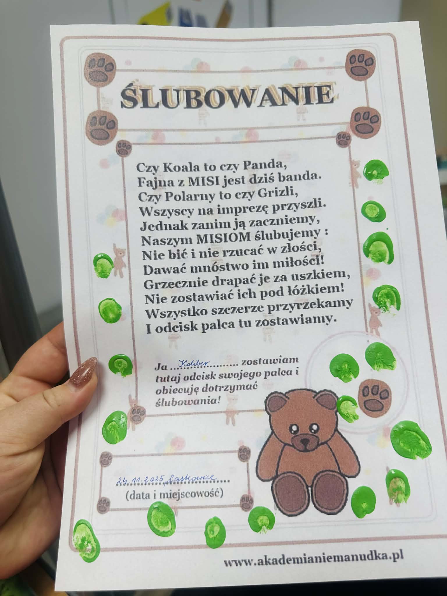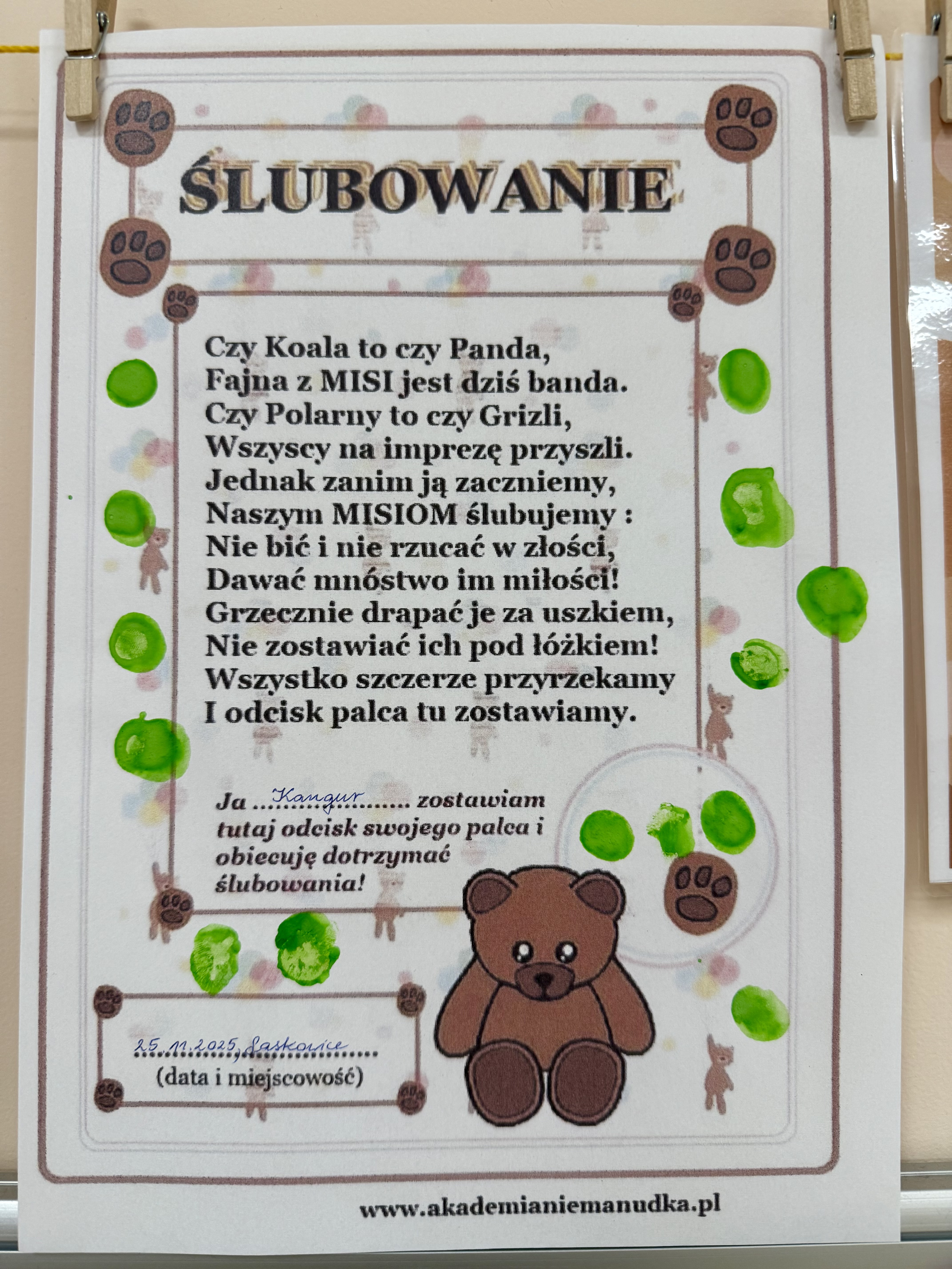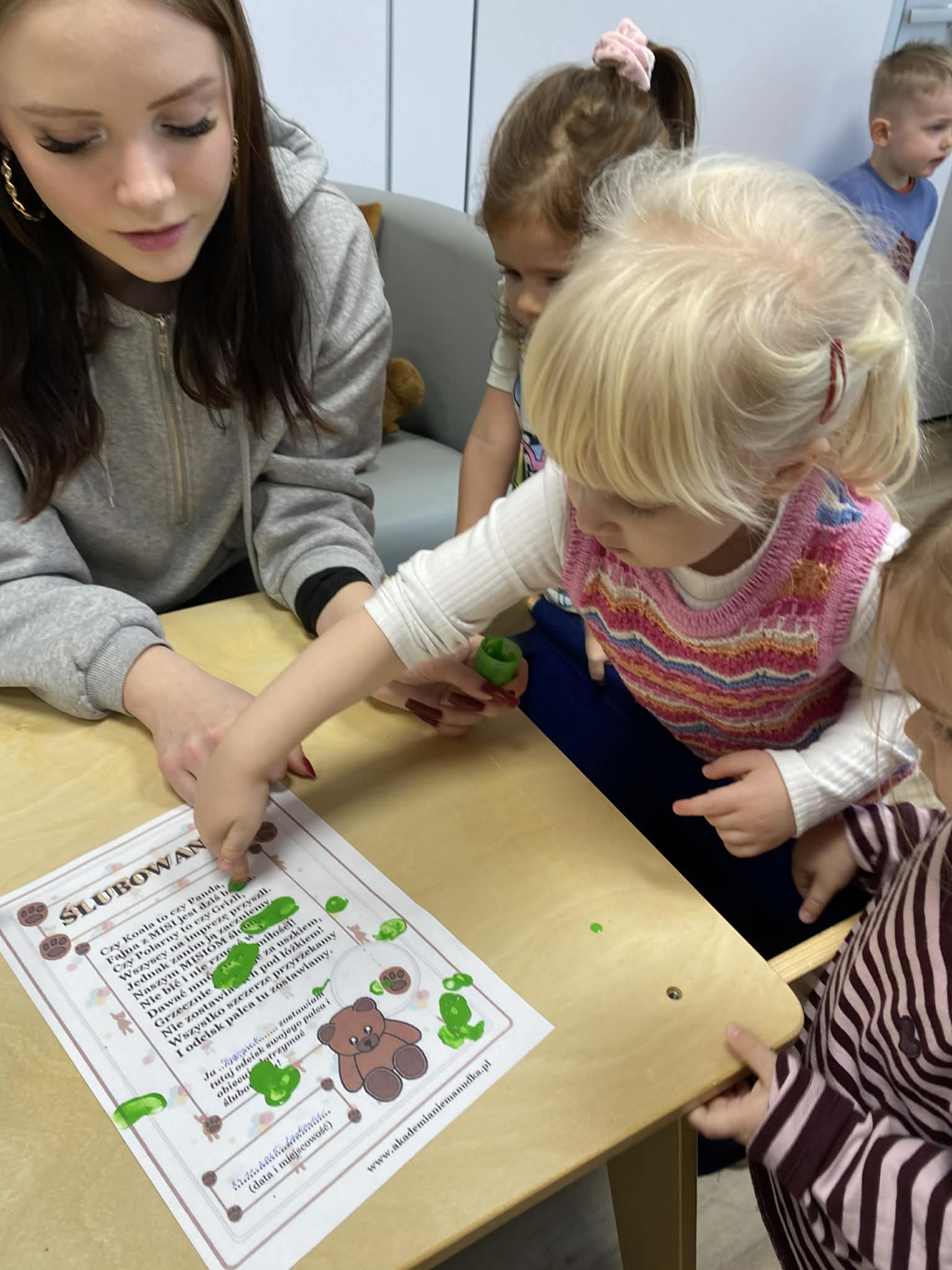 W programie znalazło się również układanie misiowych puzzli i quiz wiedzy o misiach. Na zakończenie przedszkolaki złożyły krótkie ślubowanie, w którym przyrzekały dbać o swoje misie.