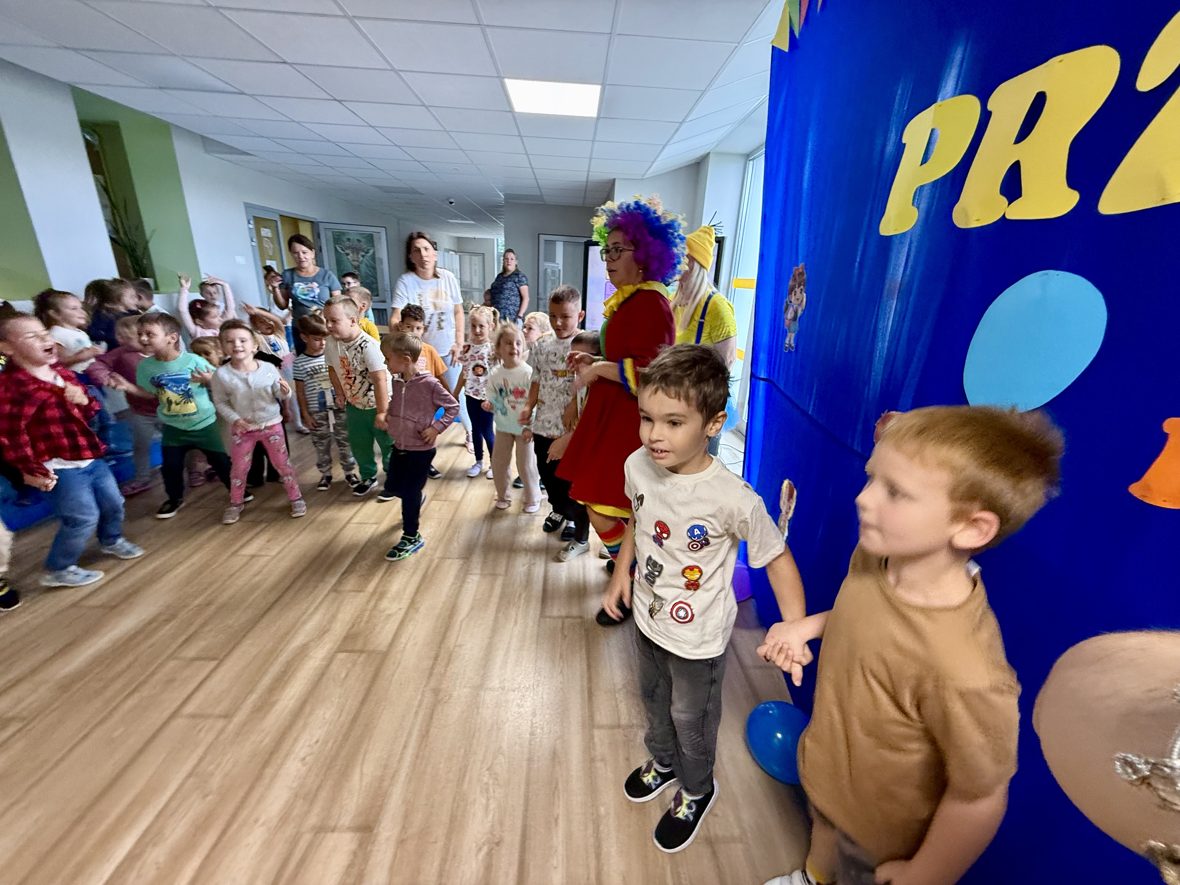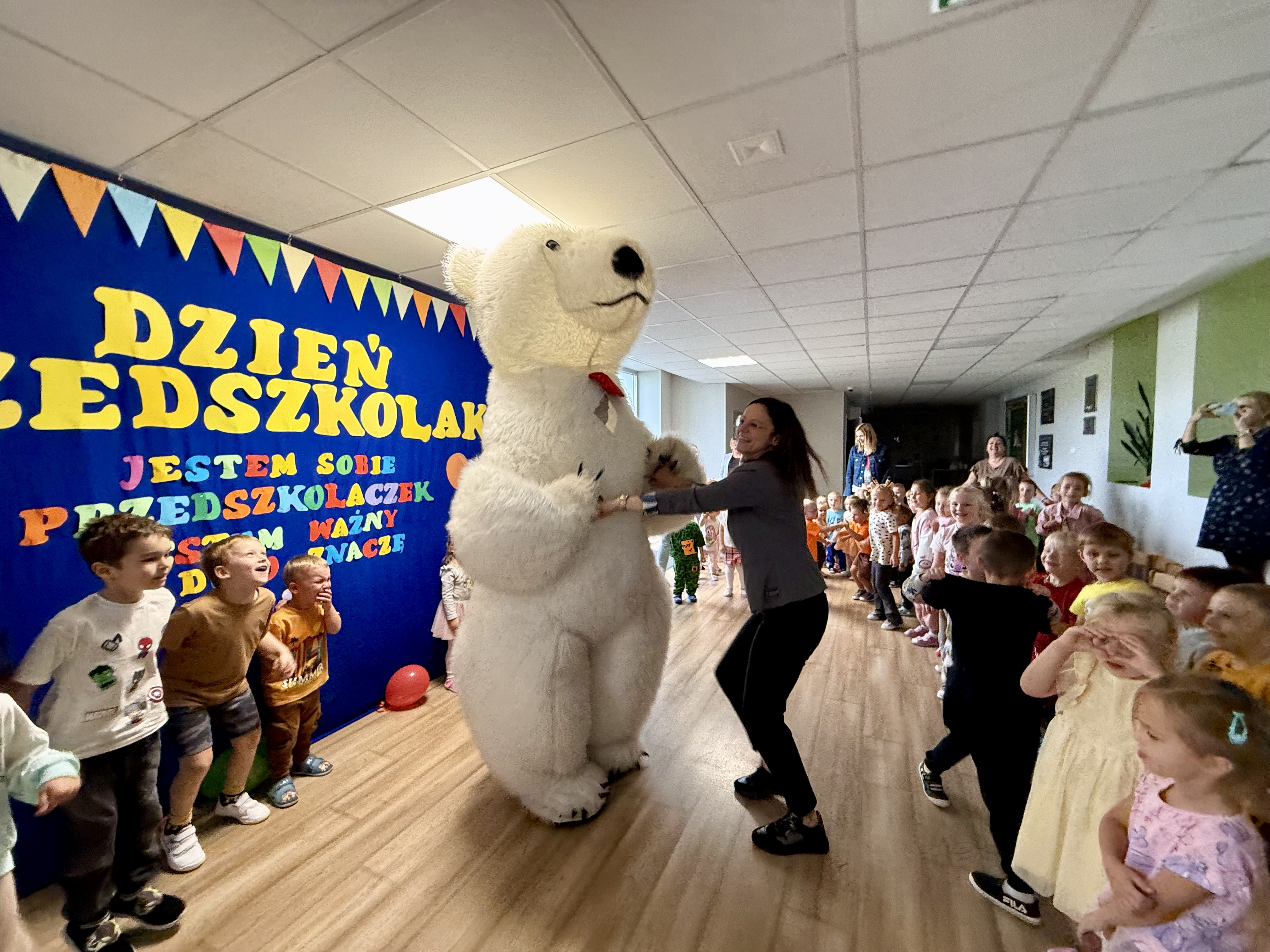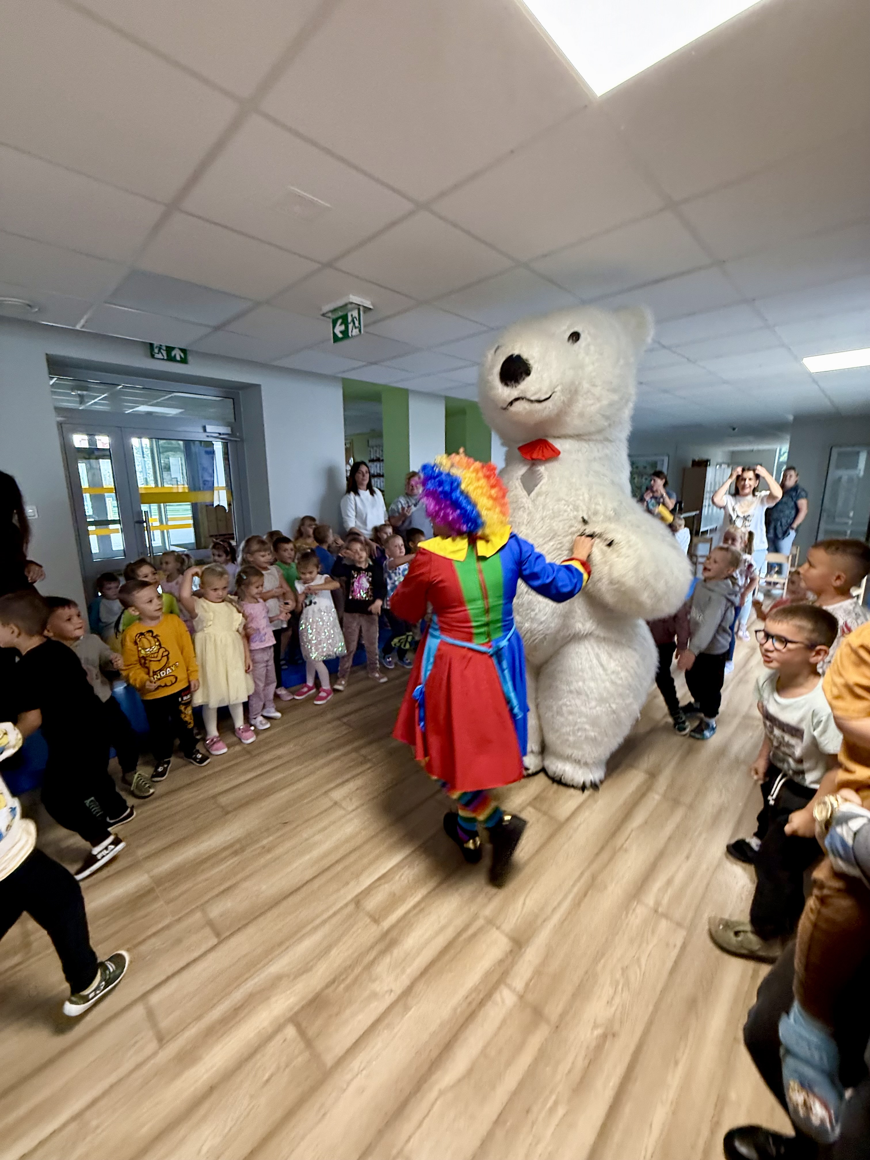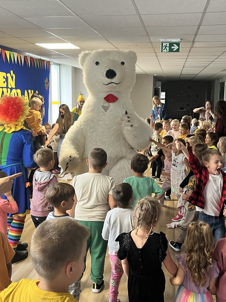 Największą niespodzianką okazała się wizyta pluszowego misia, który zaprosił dzieci do wspólnego tańca – na sali panowała prawdziwa, radosna atmosfera! Po powrocie do sal na przedszkolaków czekały małe upominki – paczuszki z prezentami i kolorowe balony, które wywołały mnóstwo uśmiechów.
