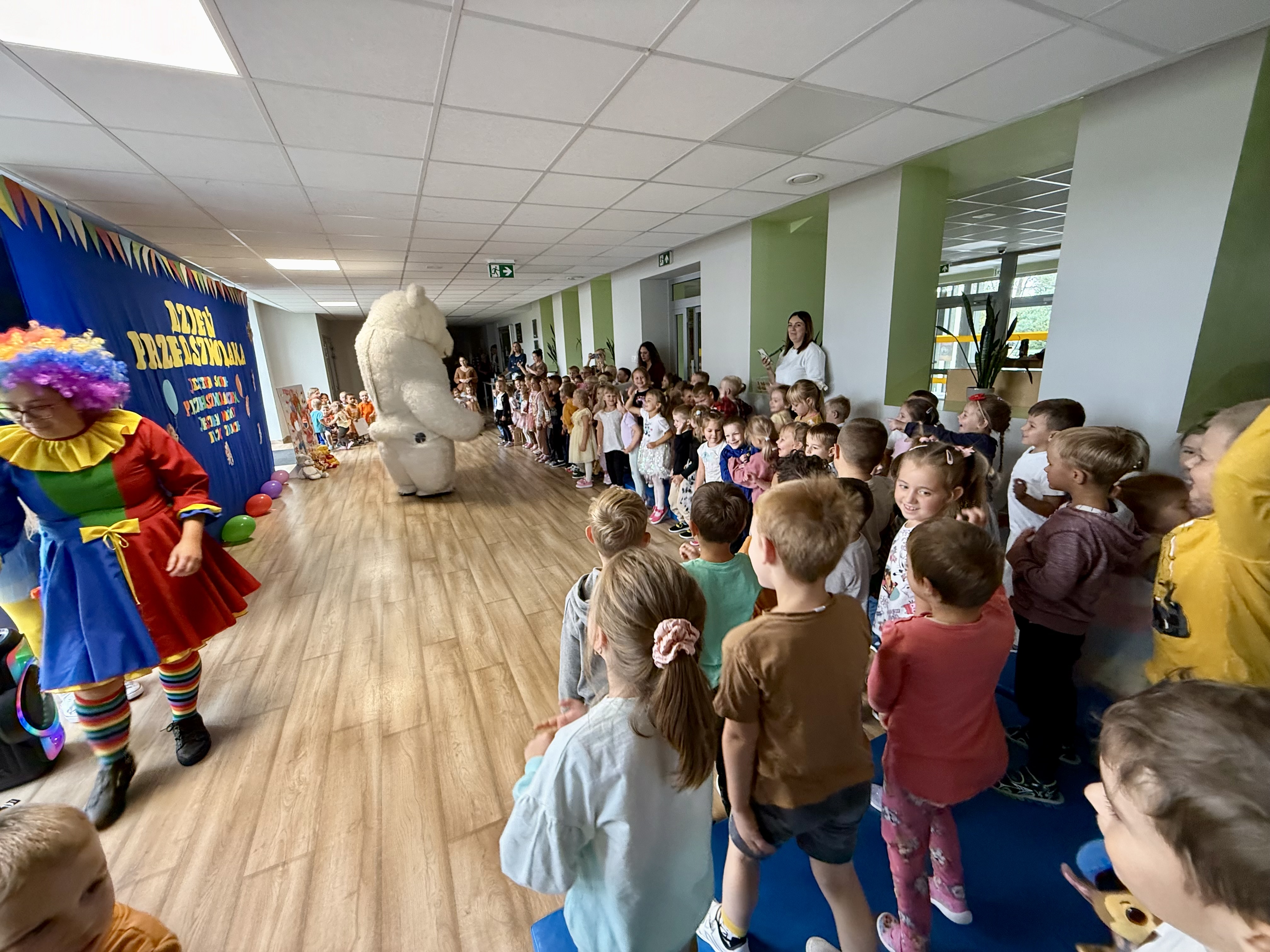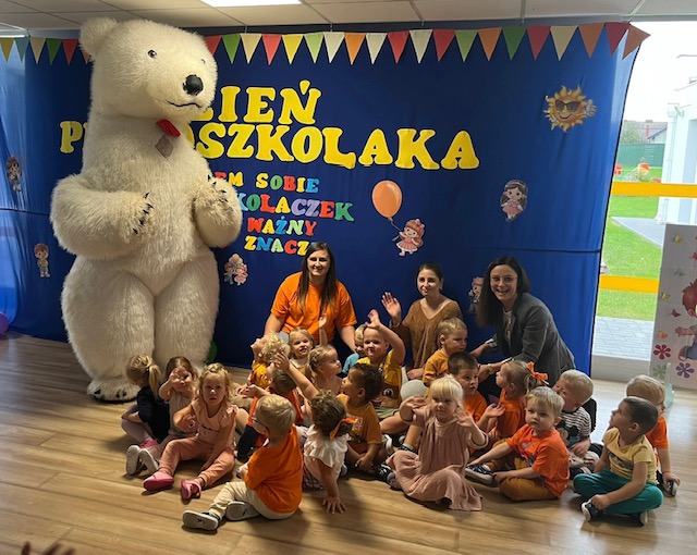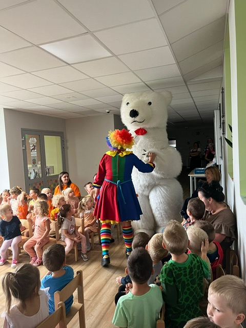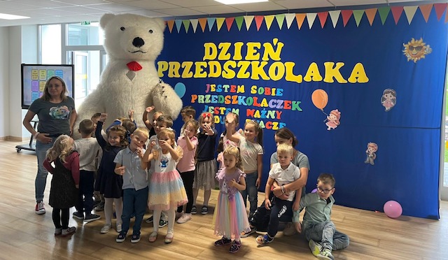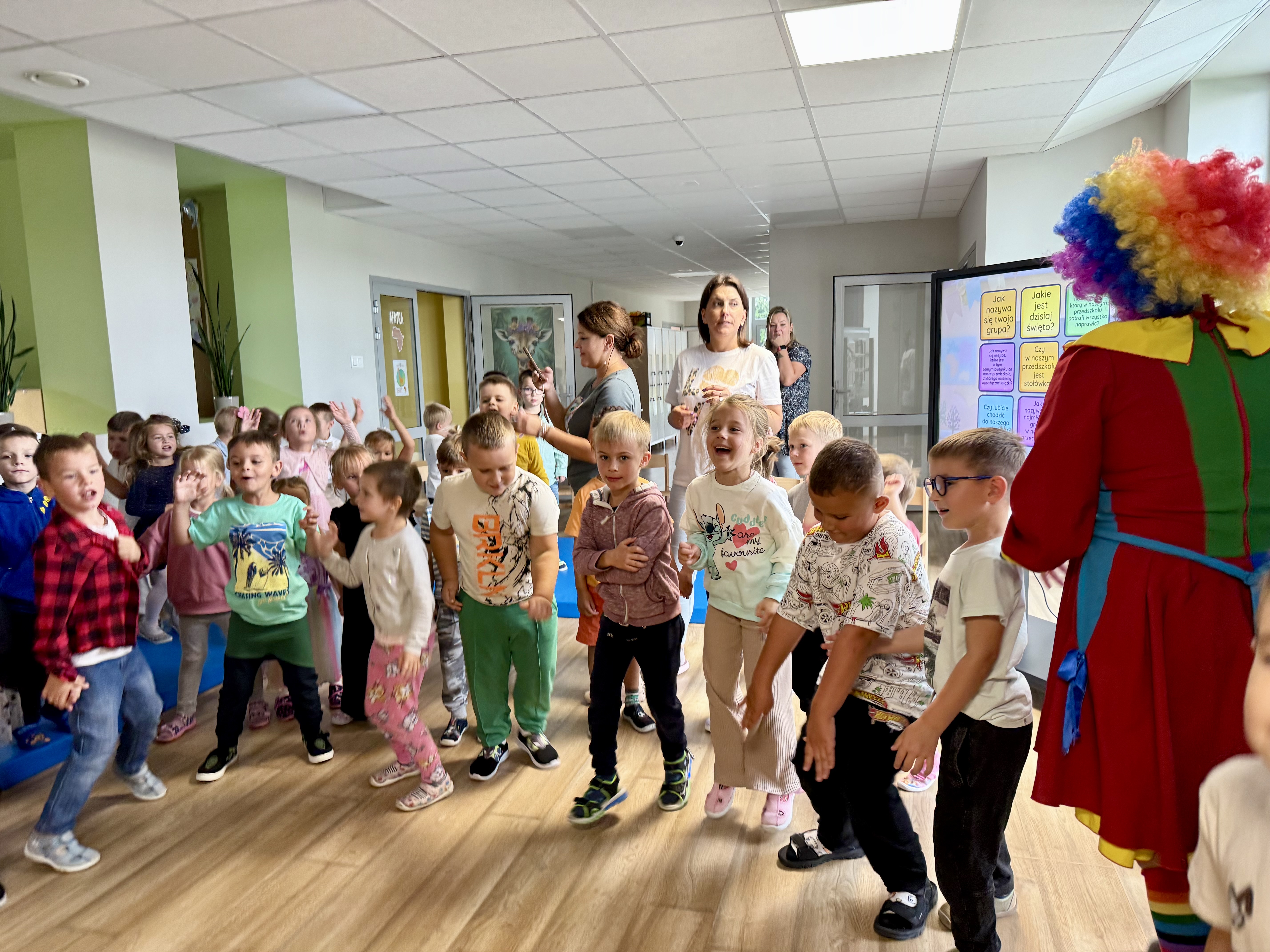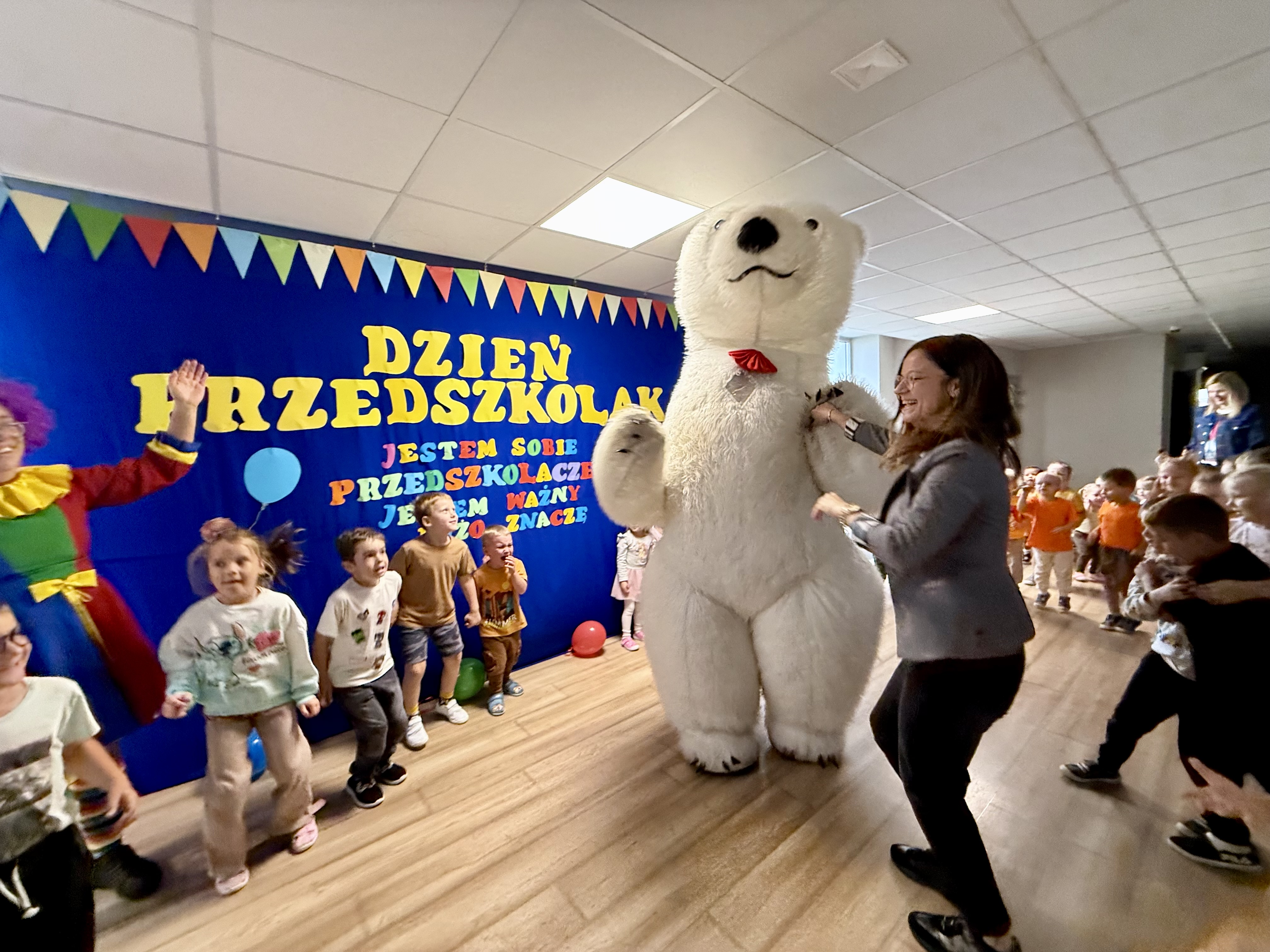 Największą niespodzianką okazała się wizyta pluszowego misia, który zaprosił dzieci do wspólnego tańca – na sali panowała prawdziwa, radosna atmosfera! Po powrocie do sal na przedszkolaków czekały małe upominki – paczuszki z prezentami i kolorowe balony, które wywołały mnóstwo uśmiechów.