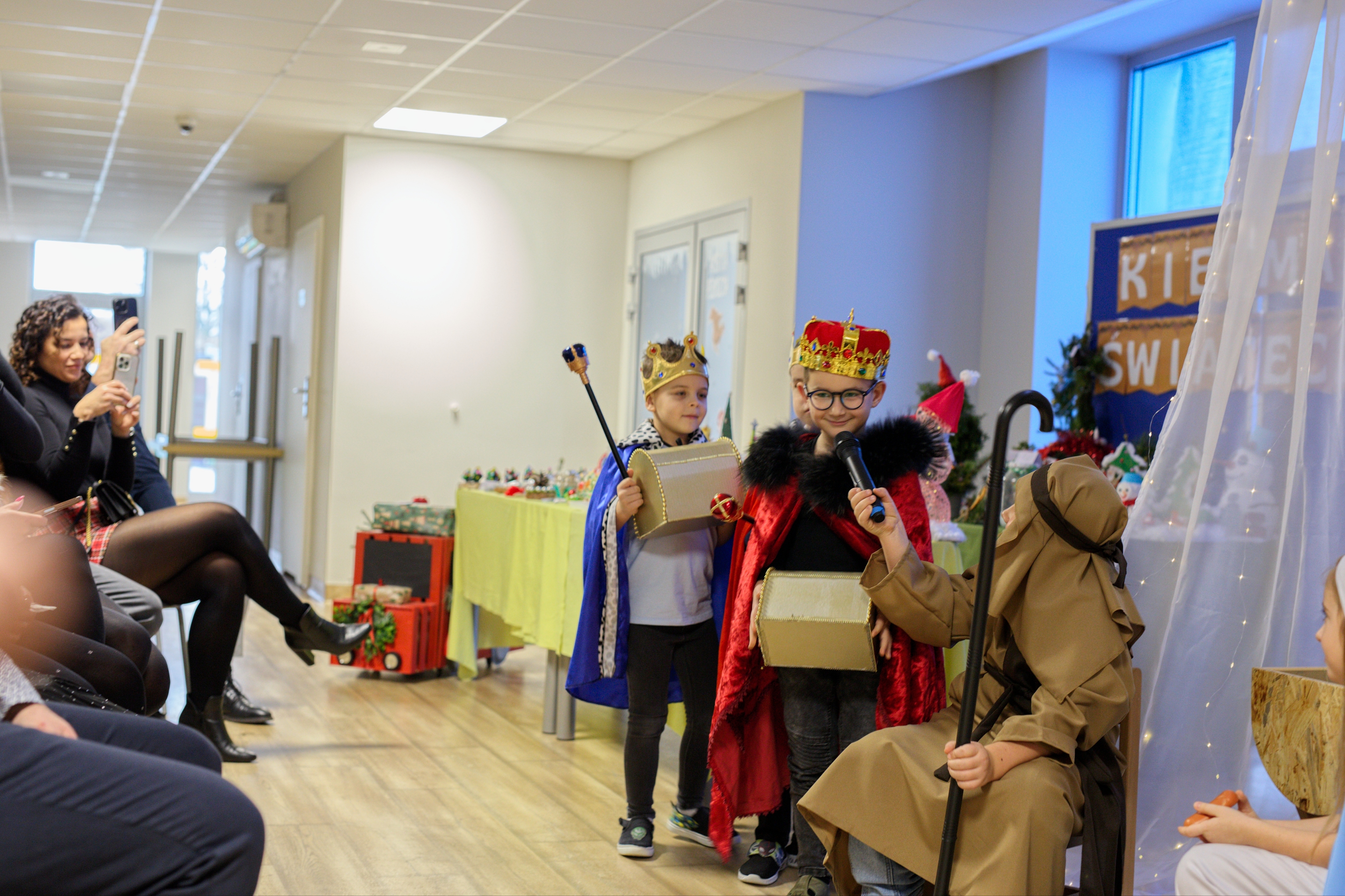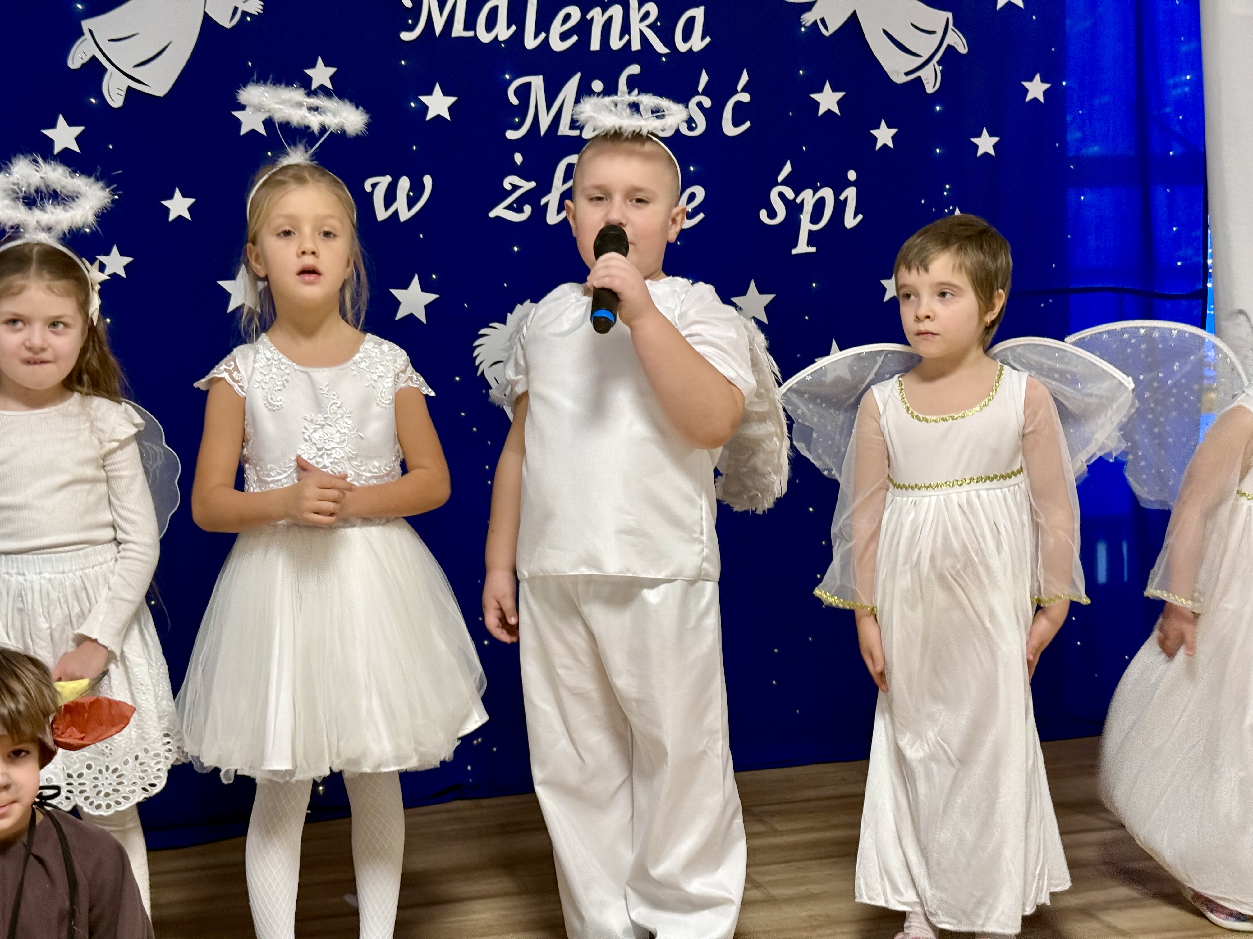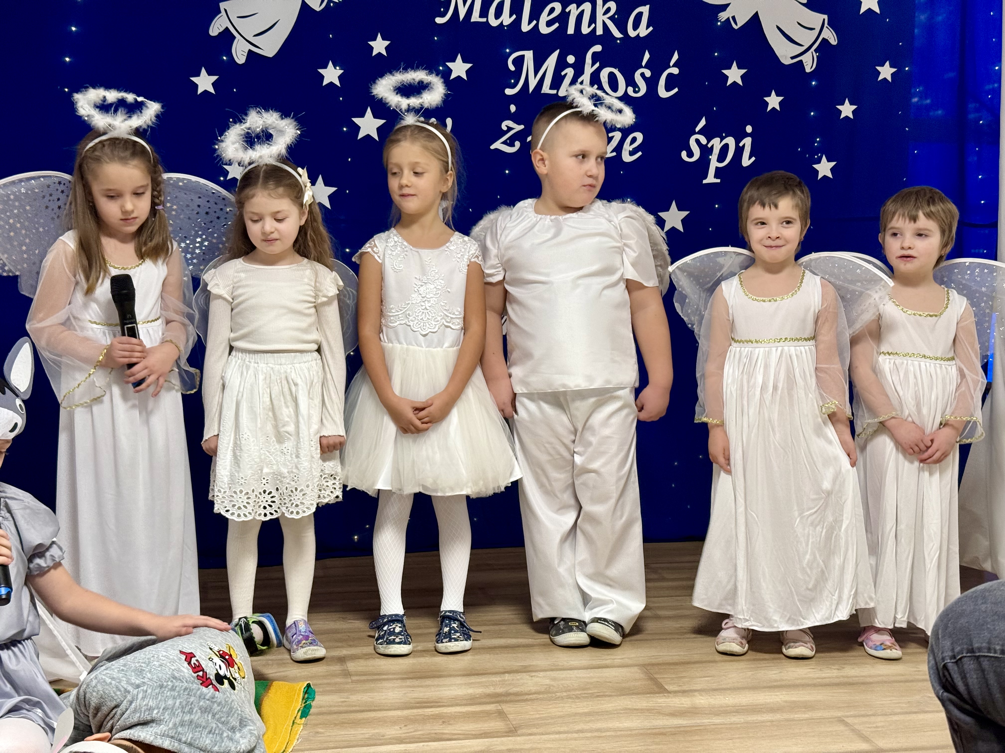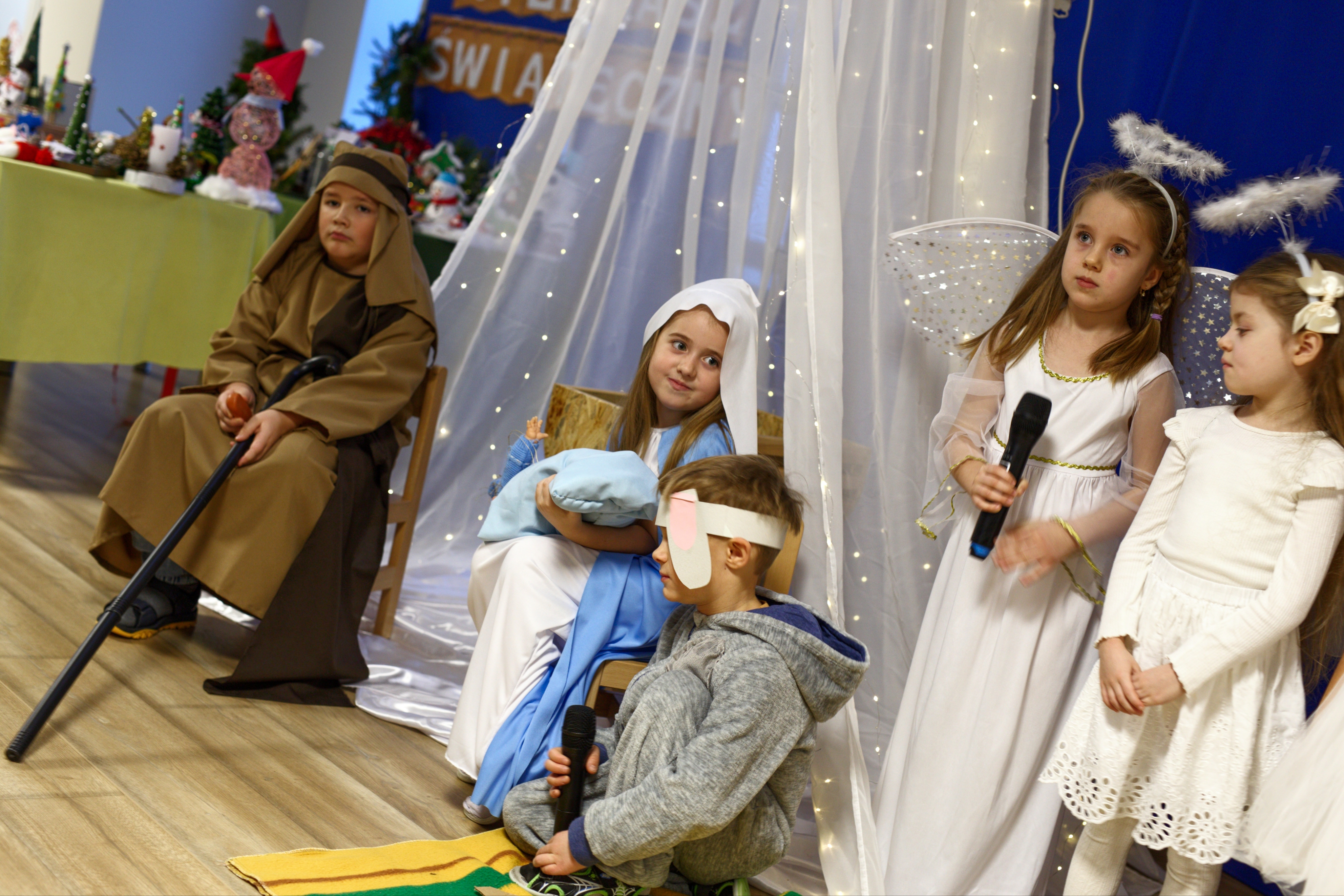 W trakcie występu zaprezentowano także krótki teatrzyk żywych cieni, dodający całemu widowisku odrobiny tajemniczości oraz niezwykłego klimatu. Nie zabrakło również muzyki. Hol wypełniła spokojna, kojąca kołysanka, tradycyjne polskie kolędy, a także piosenka w języku angielskim, która dodała przedstawieniu nowoczesnego i radosnego brzmienia. Całość zakończyła się gromkimi brawami, a na twarzach wszystkich zebranych pojawiły się uśmiechy i wzruszenie. Po występie dzieci z dumą wręczyły rodzicom własnoręcznie wykonane upominki, które stały się piękną pamiątką tego wyjątkowego dnia.
