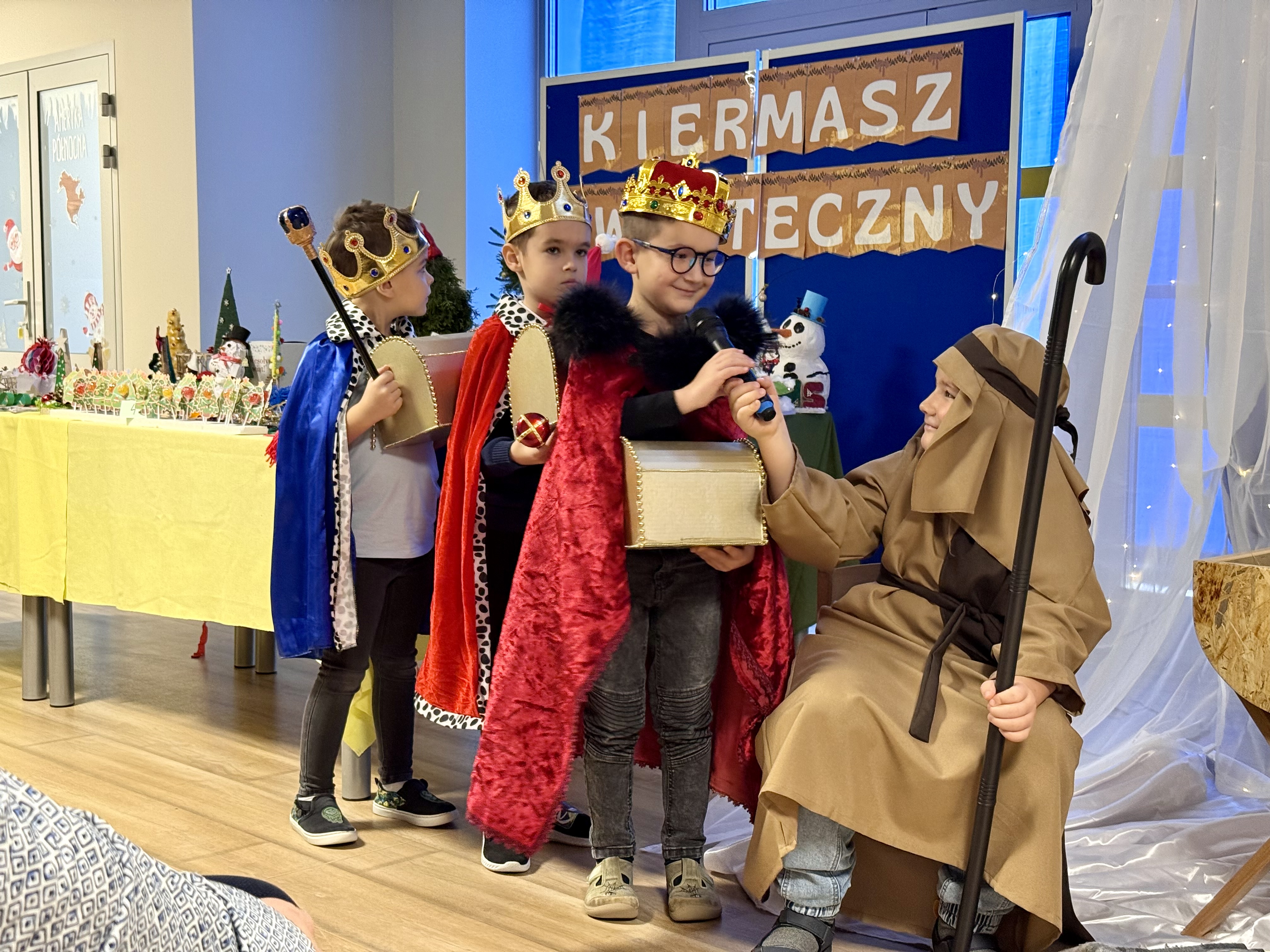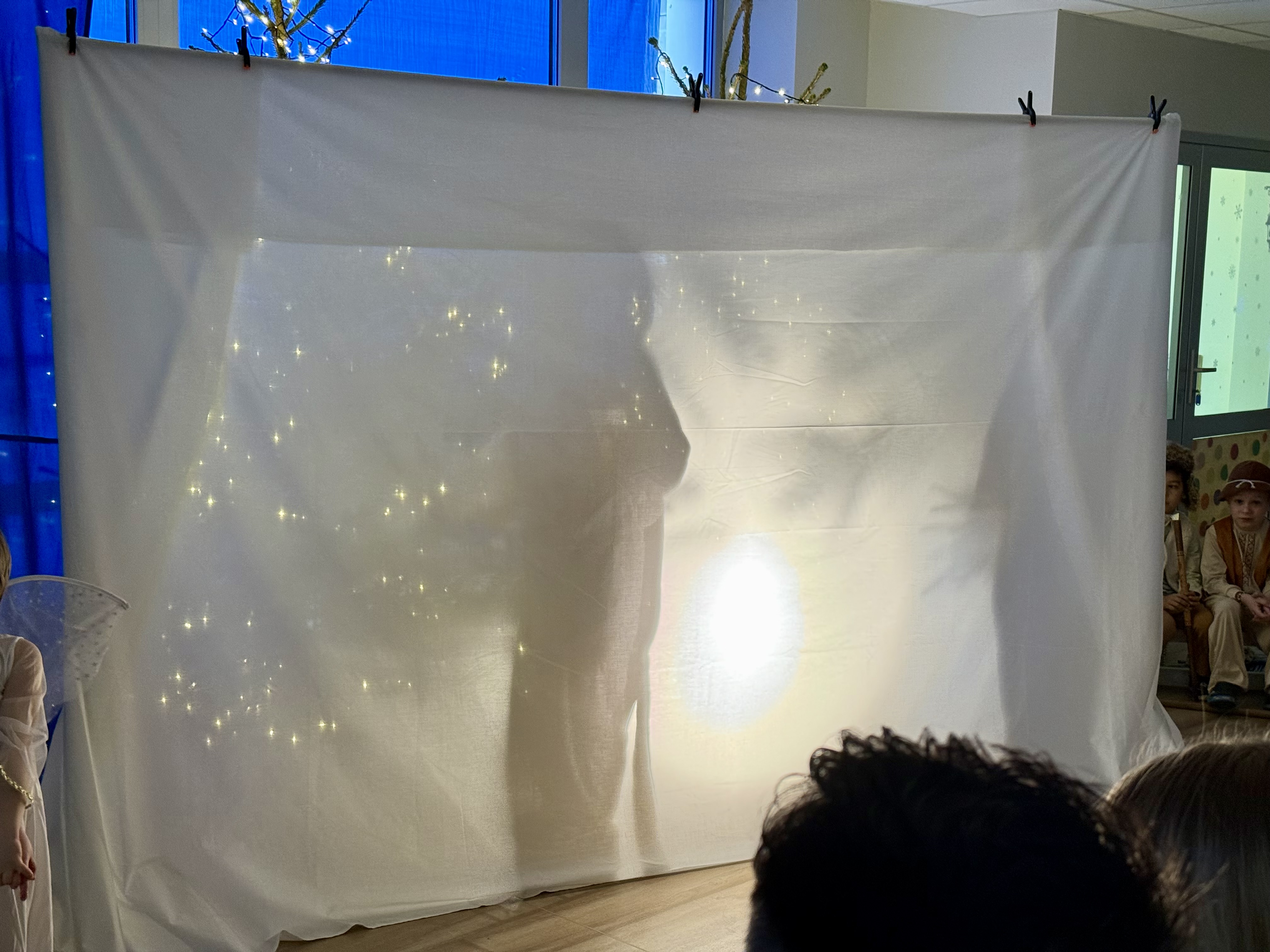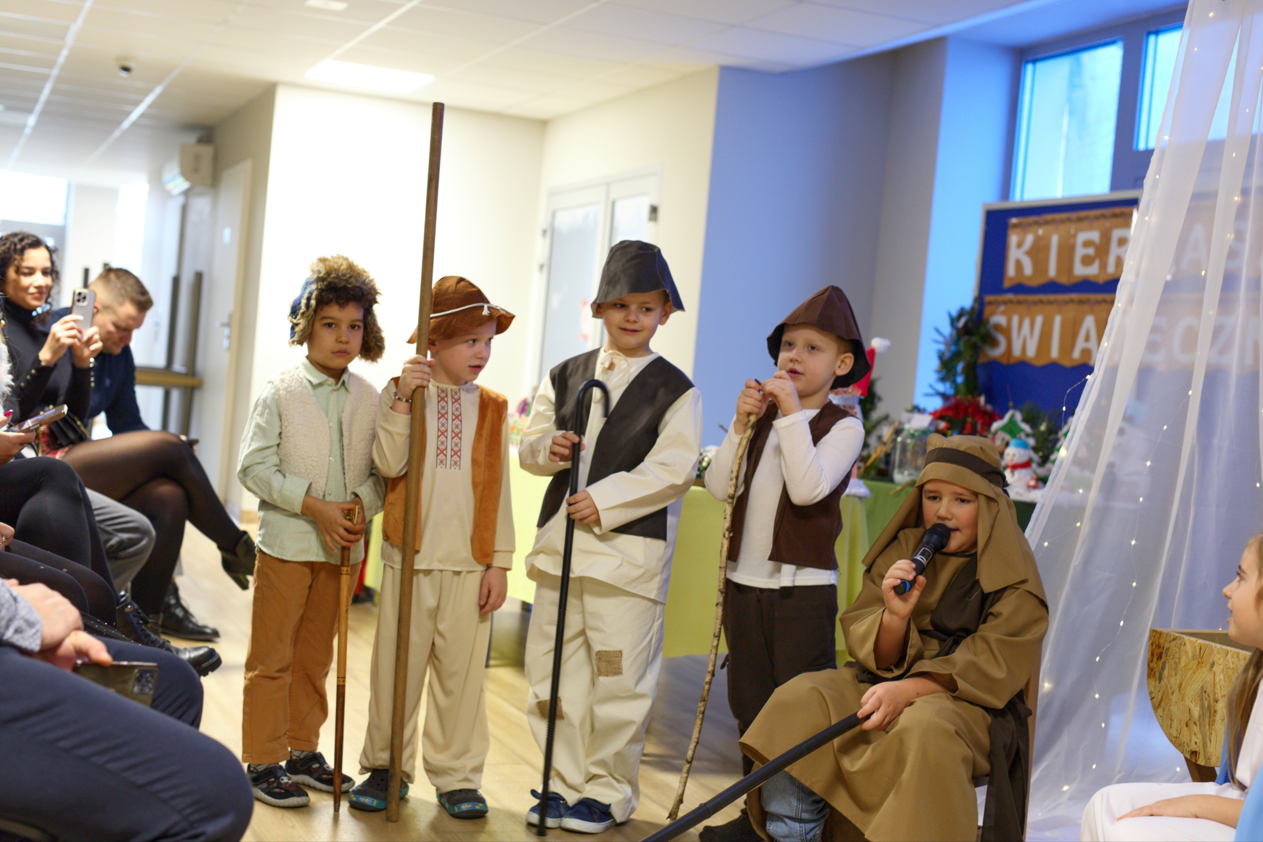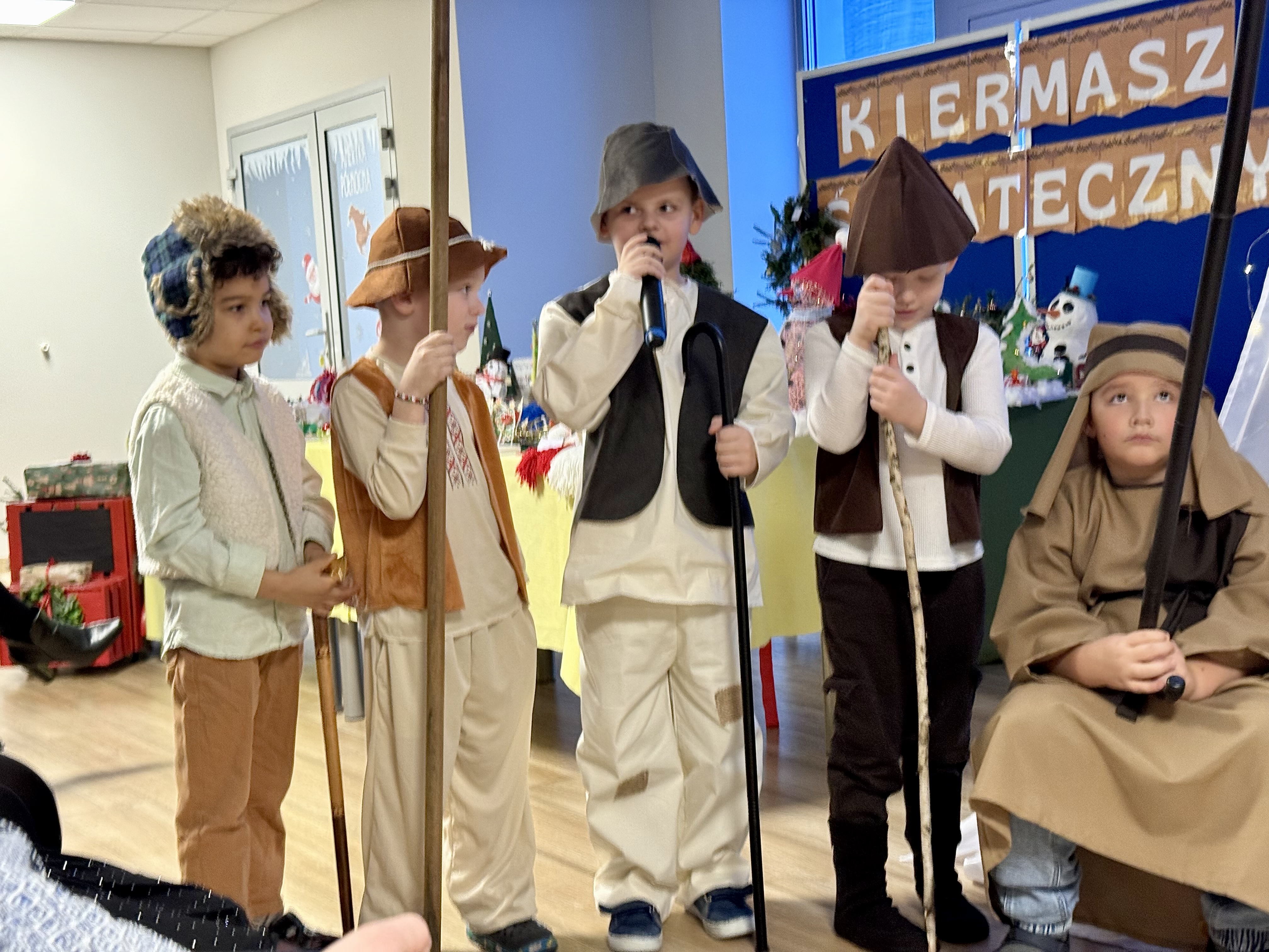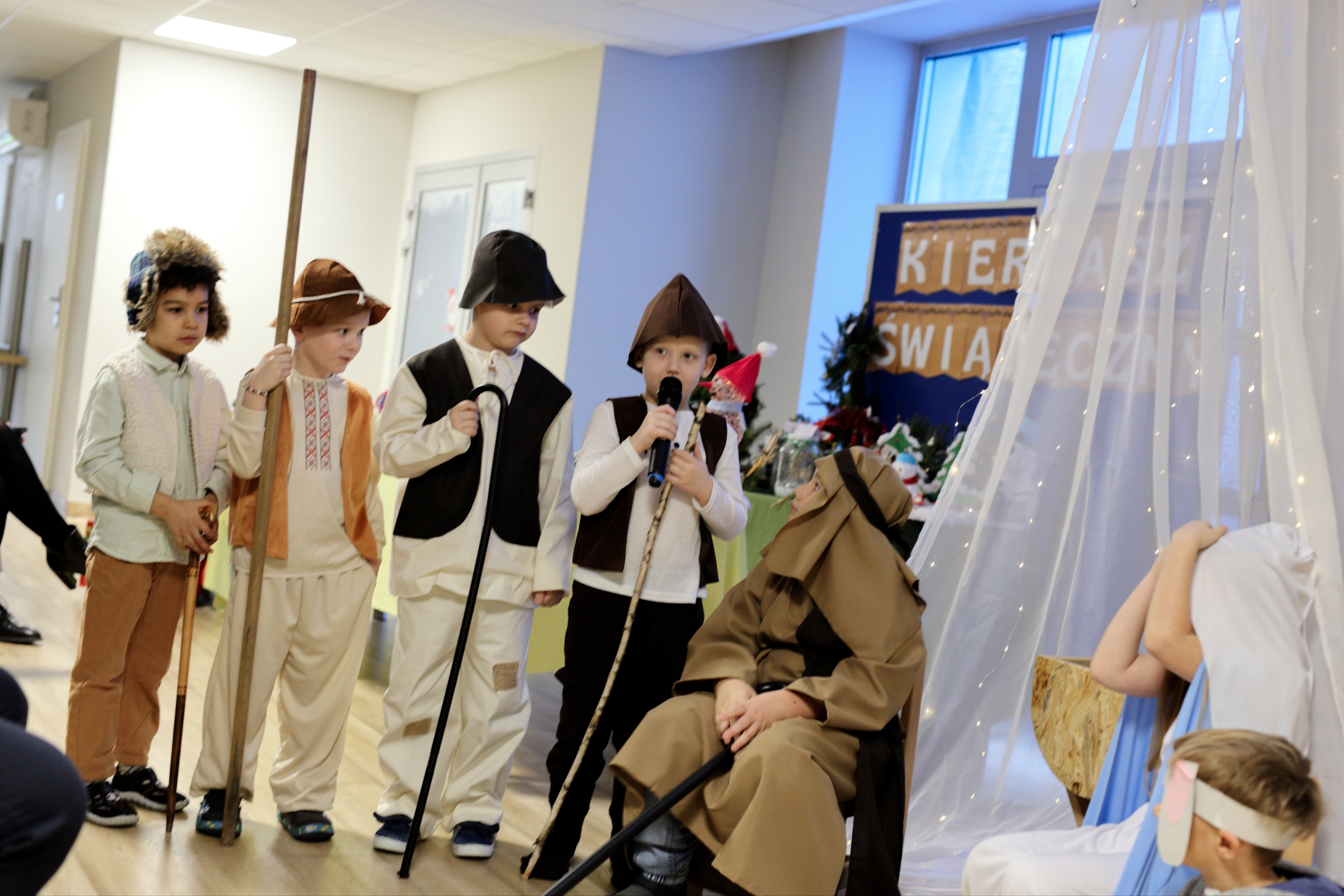 W trakcie występu zaprezentowano także krótki teatrzyk żywych cieni, dodający całemu widowisku odrobiny tajemniczości oraz niezwykłego klimatu. Nie zabrakło również muzyki. Hol wypełniła spokojna, kojąca kołysanka, tradycyjne polskie kolędy, a także piosenka w języku angielskim, która dodała przedstawieniu nowoczesnego i radosnego brzmienia. Całość zakończyła się gromkimi brawami, a na twarzach wszystkich zebranych pojawiły się uśmiechy i wzruszenie. Po występie dzieci z dumą wręczyły rodzicom własnoręcznie wykonane upominki, które stały się piękną pamiątką tego wyjątkowego dnia.