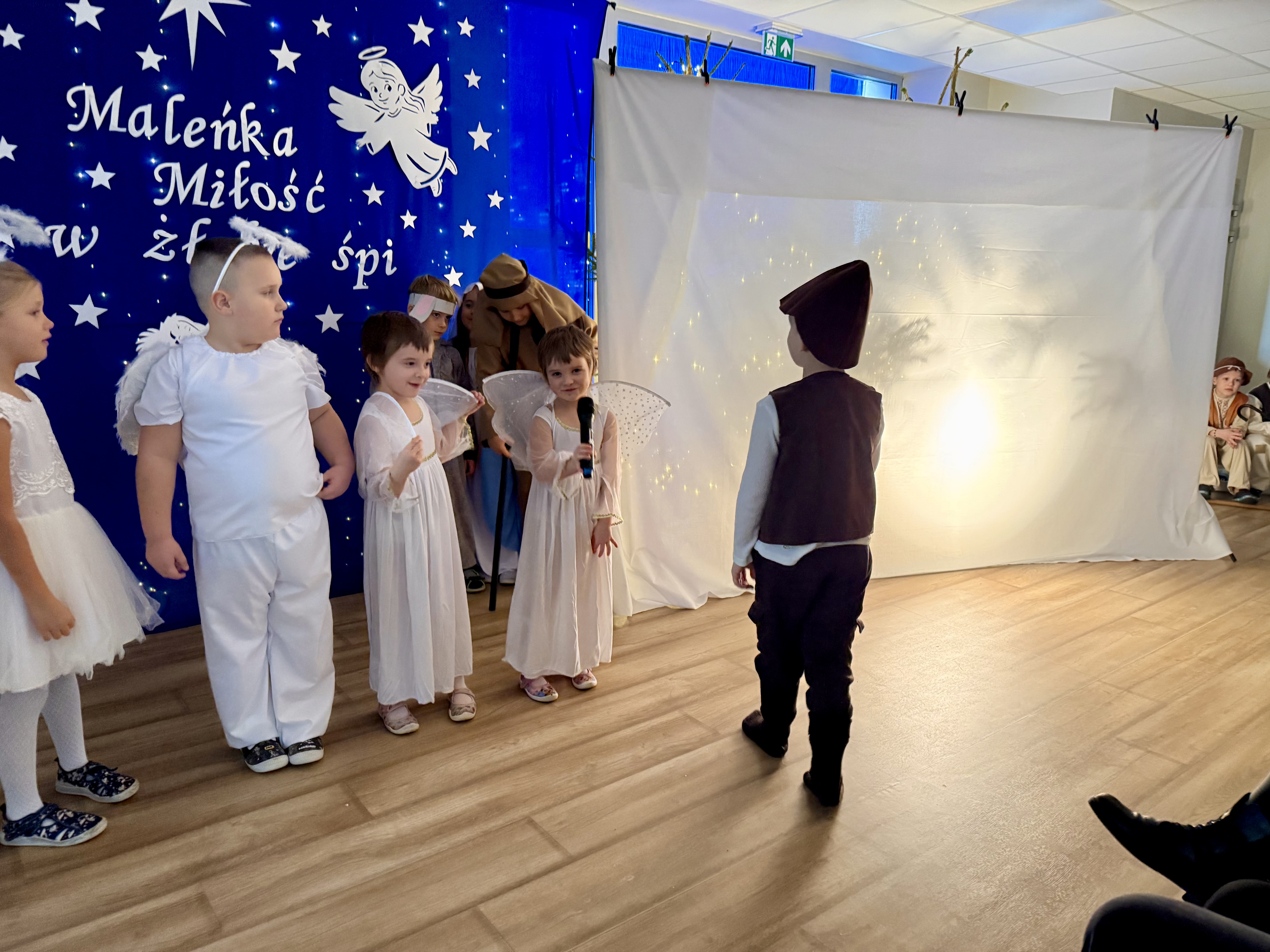 Dnia 9 grudnia 2025 r. hol naszego przedszkola zamienił się w betlejemską stajenkę. To właśnie w takiej scenerii dzieci z grupy „Kangury” wystąpiły przed rodzicami i Panią dyrektor, prezentując historię sprzed ponad dwóch tysięcy lat.