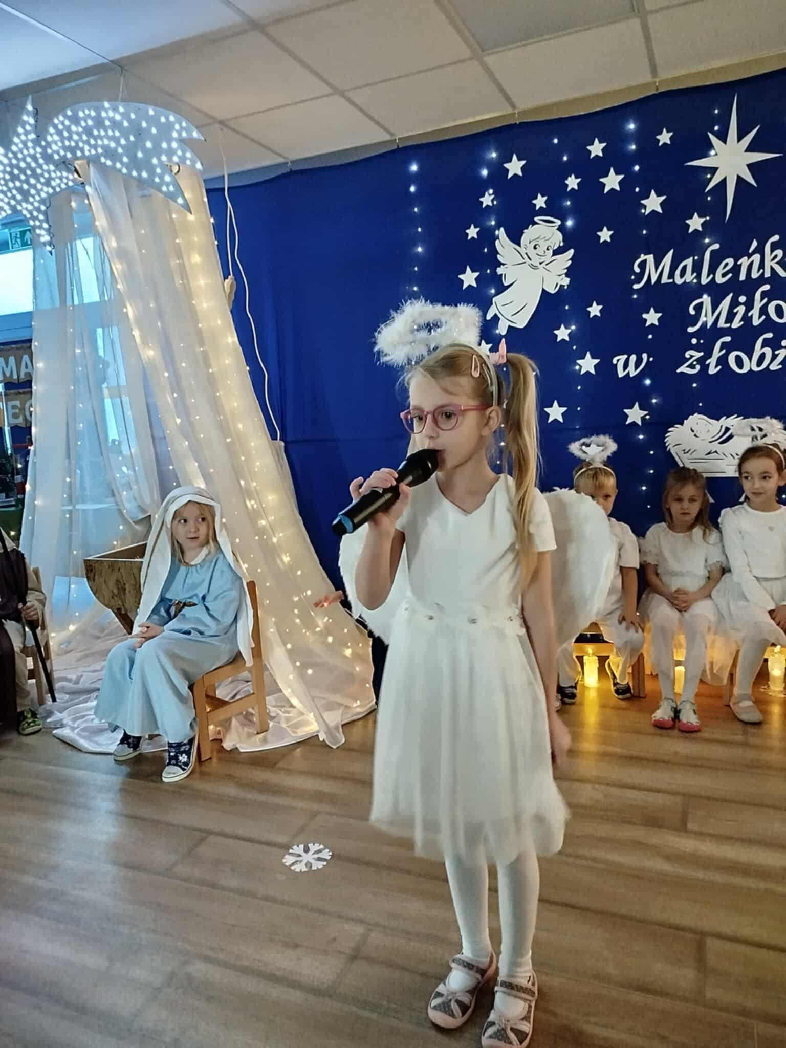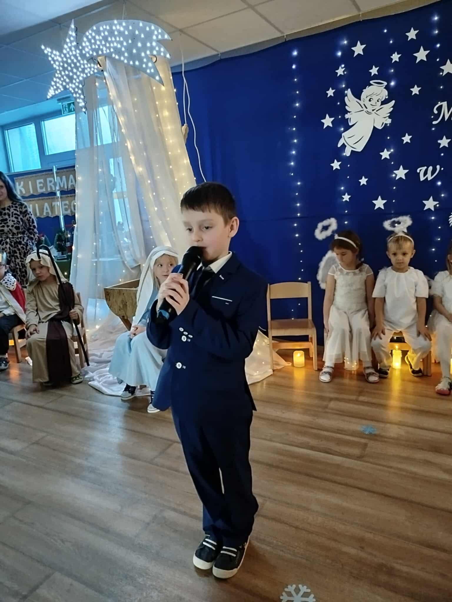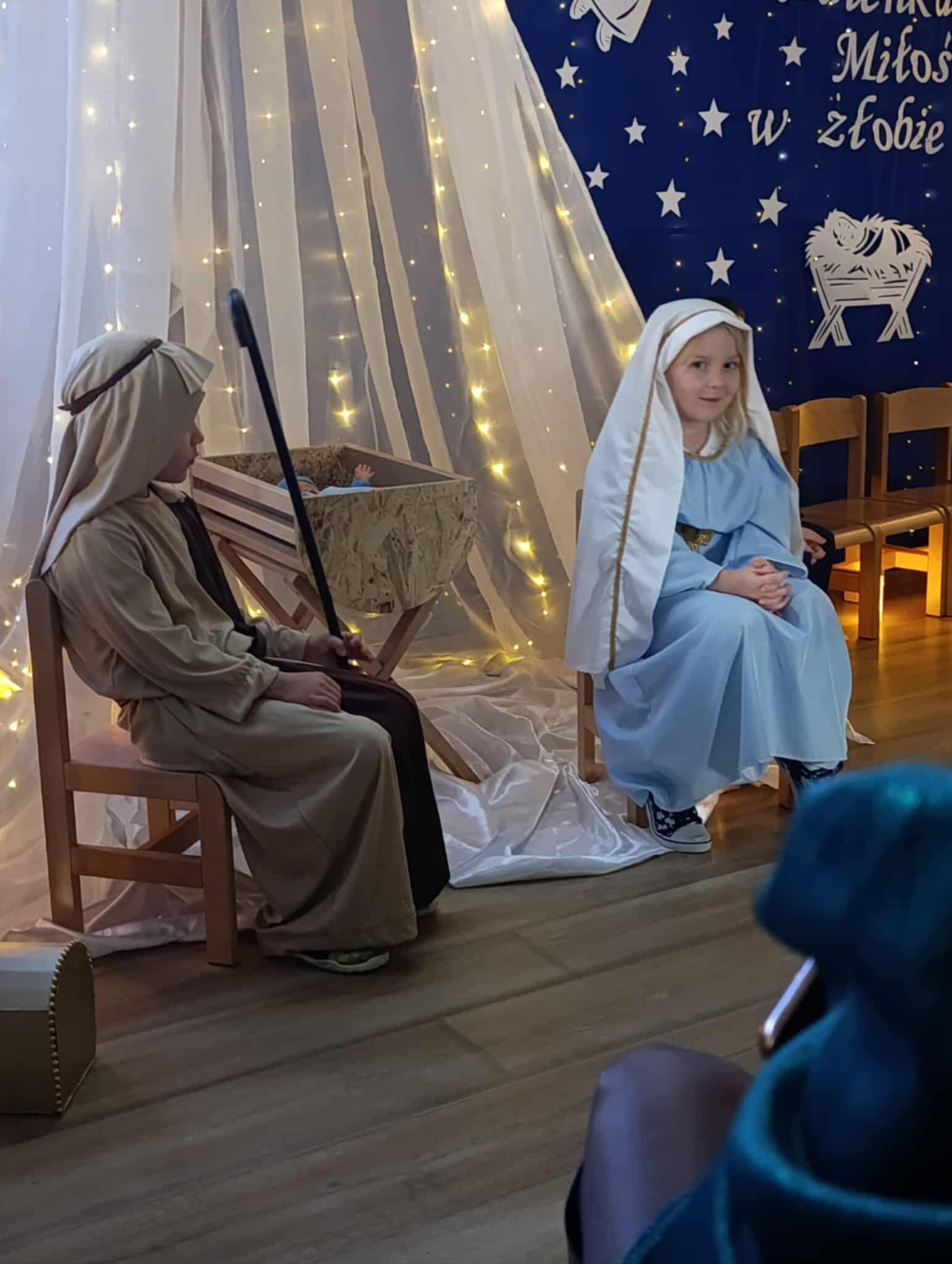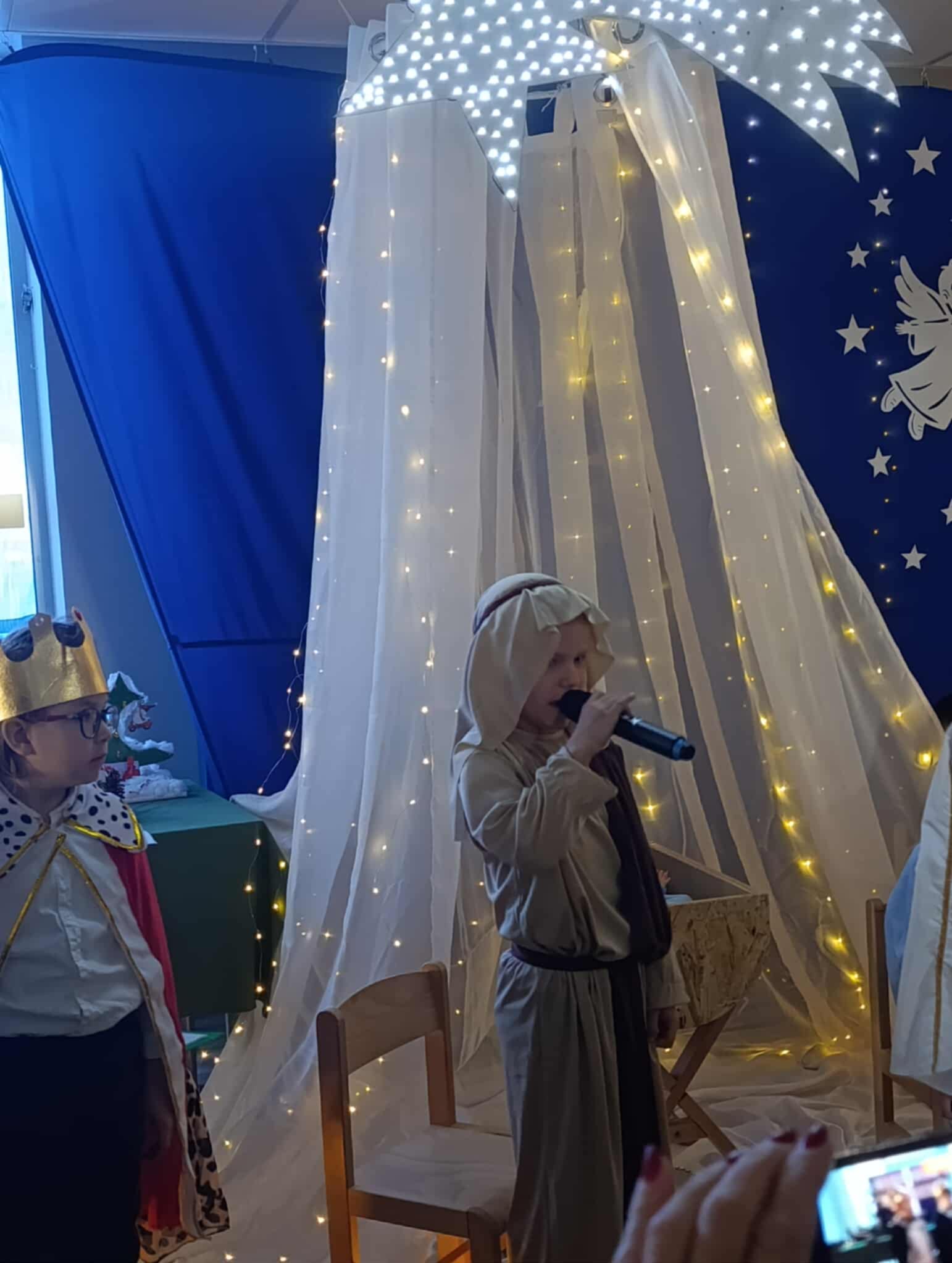 Na scenie pojawili się Józef i Maryja, otoczeni przez rozświetlone Anioły, dzielnych Pasterzy, dostojnych Króli oraz wspaniałego prowadzącego, który z uśmiechem towarzyszył całemu przedstawieniu. Mali artyści z ogromnym zaangażowaniem odegrali swoje role, tworząc piękną opowieść o Narodzeniu Jezusa.