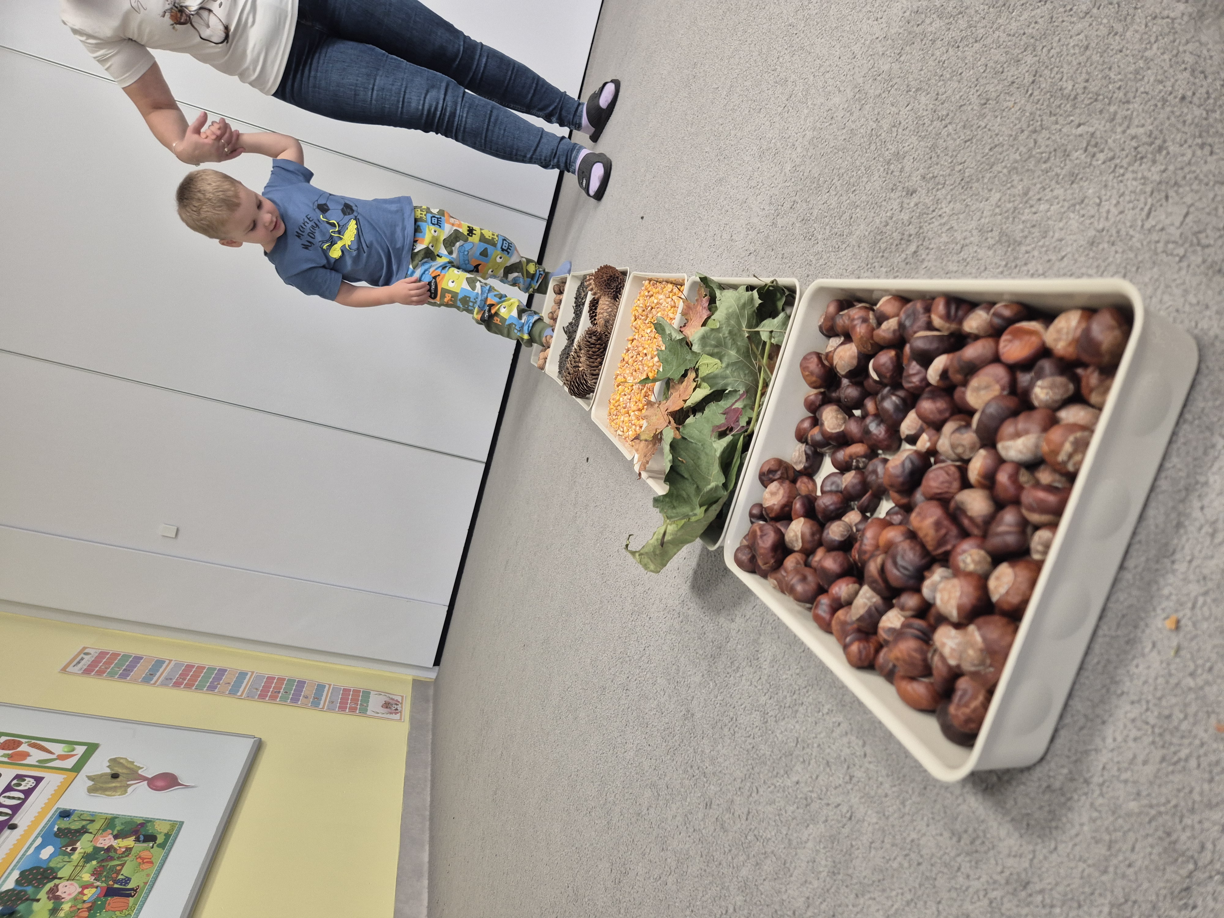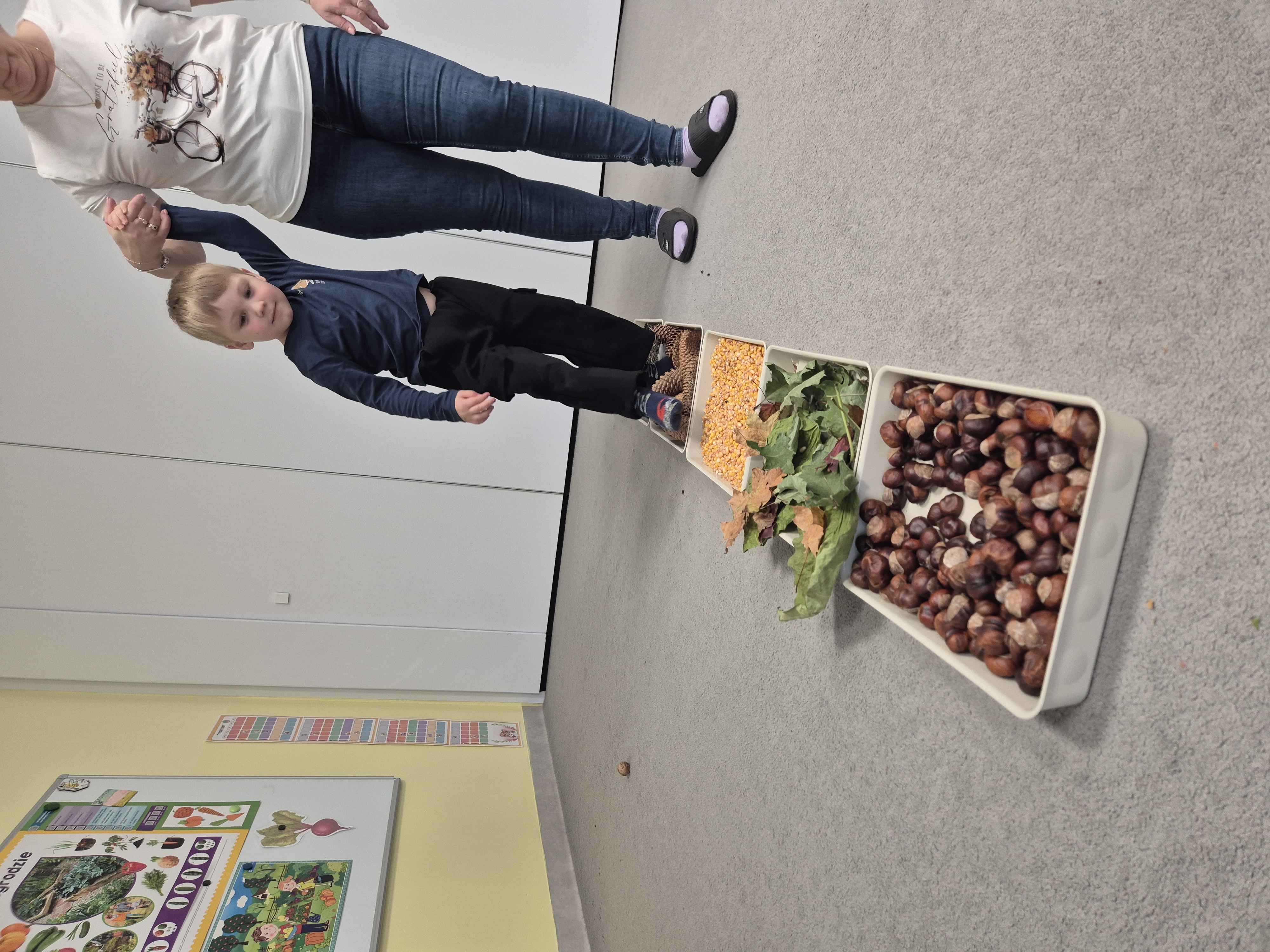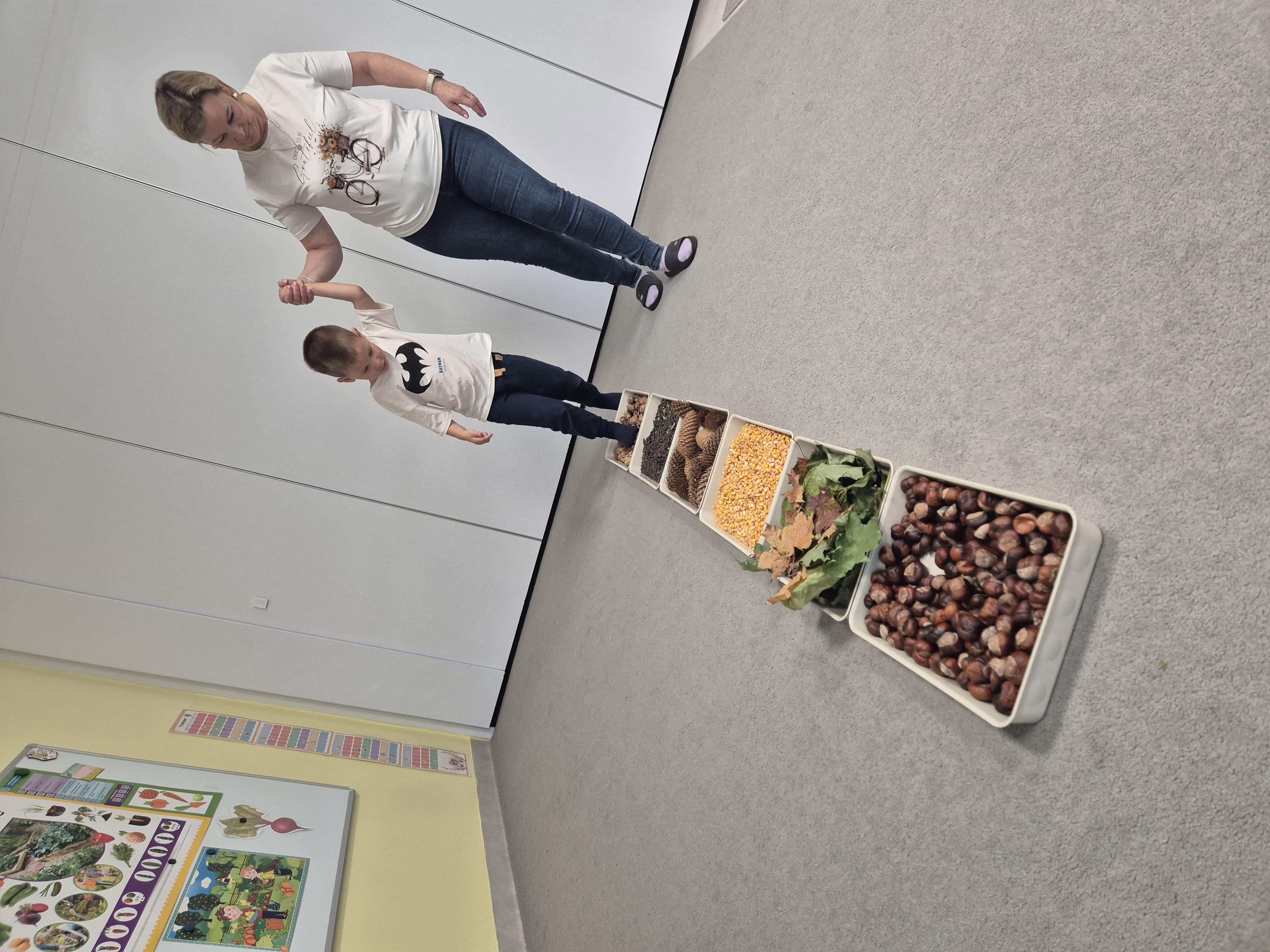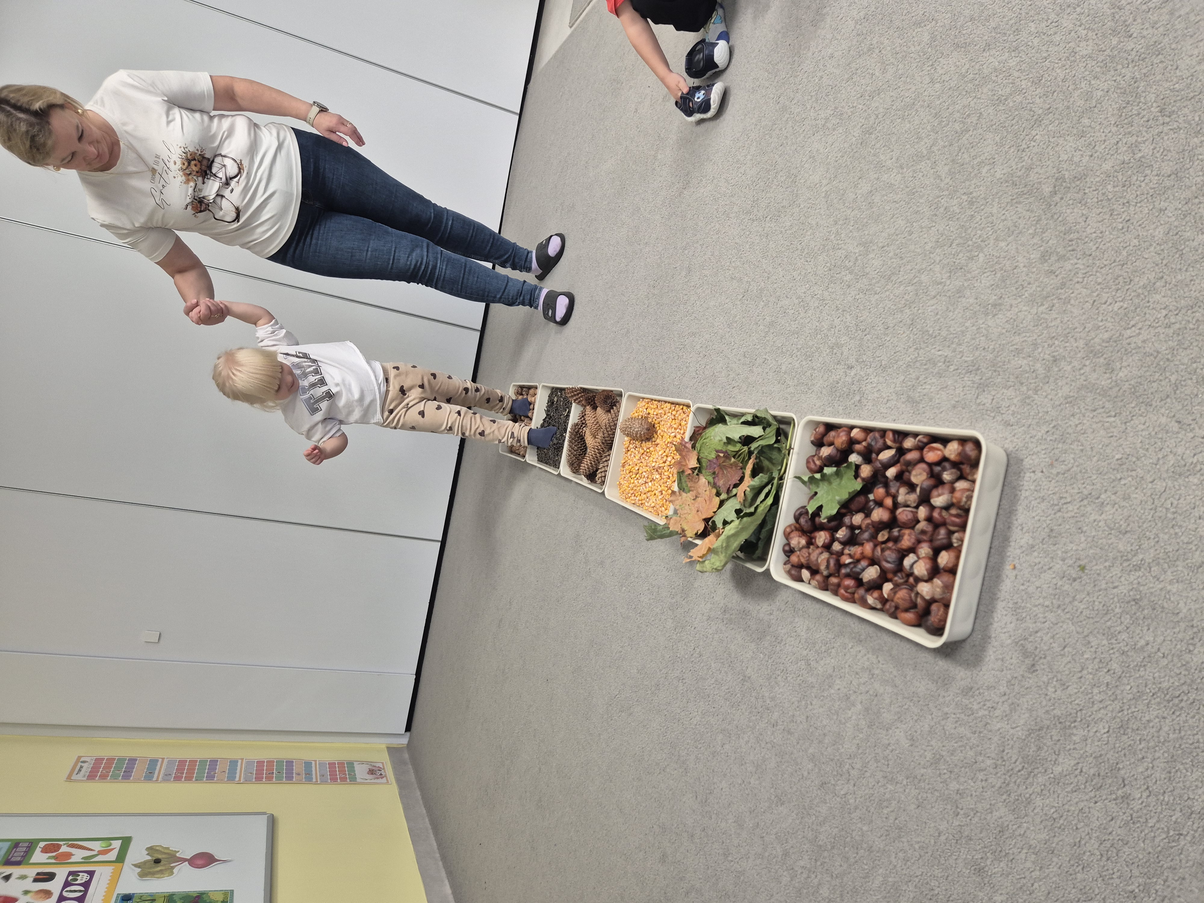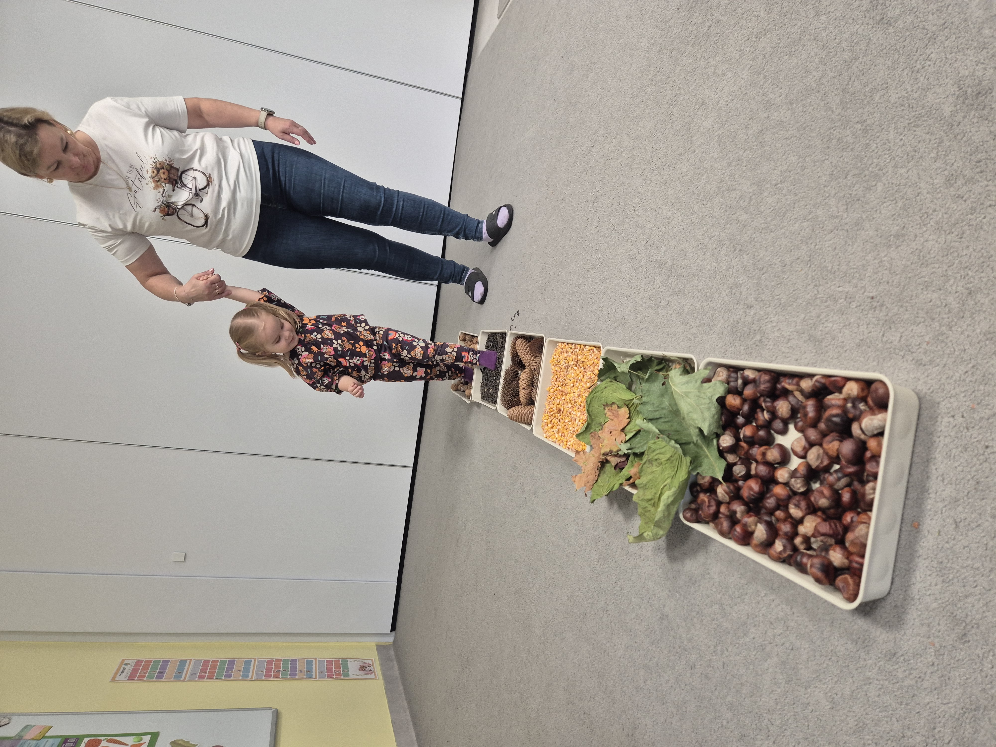 W ramach projektu „Gramy zmysłami” wykonaliśmy pierwsze zadanie październikowe – jesienną ścieżkę sensoryczną. Do jej przygotowania wykorzystaliśmy naturalne dary jesieni: kasztany, orzechy, szyszki, kukurydzę, słonecznik, liście oraz żołędzie. Podczas zabawy Tygryski mogły poznawać jesień wszystkimi zmysłami: dotykały, oglądały i wąchały naturalne materiały, rozwijając w ten sposób swoją wrażliwość sensoryczną i ciekawość świata.