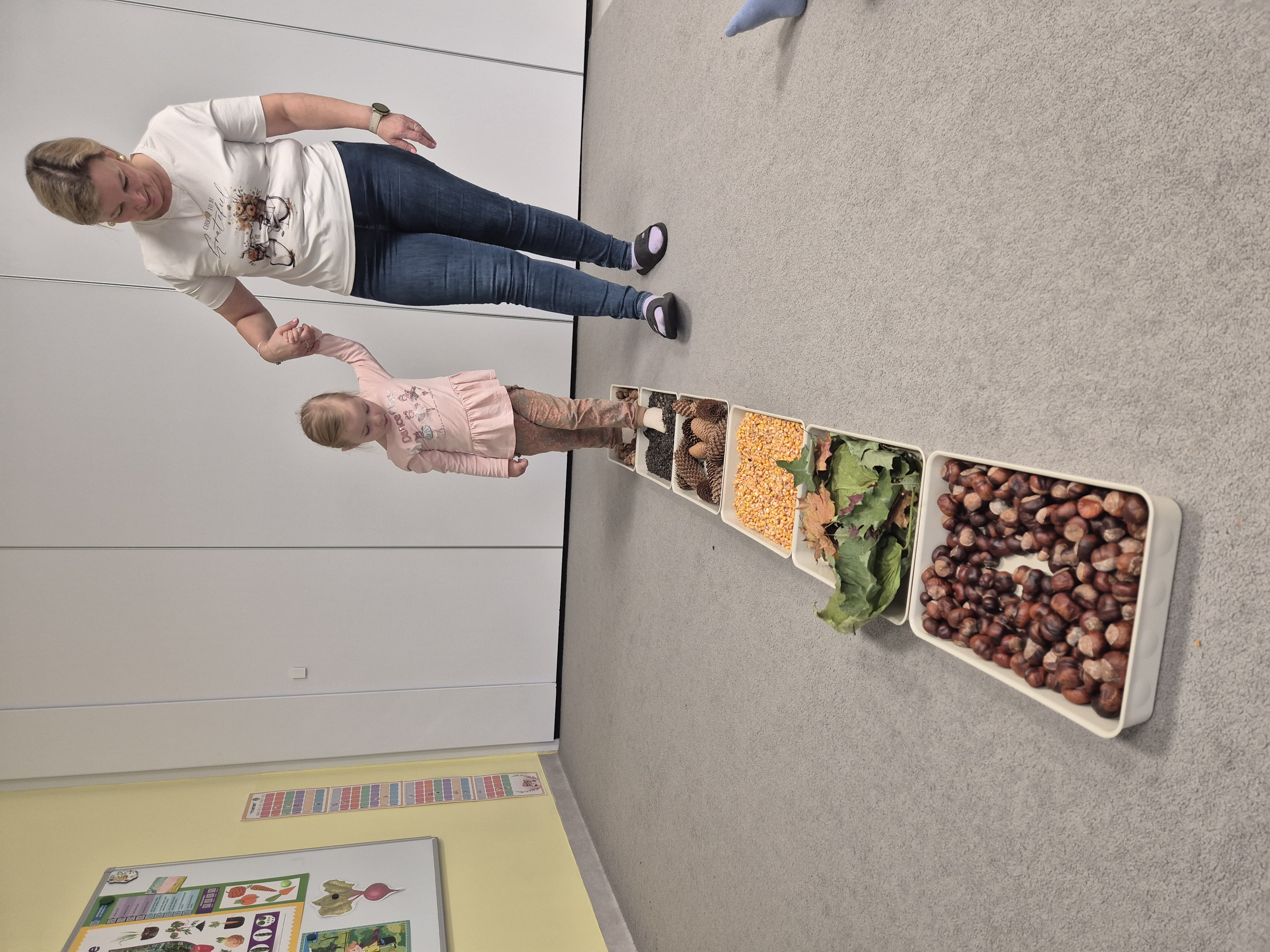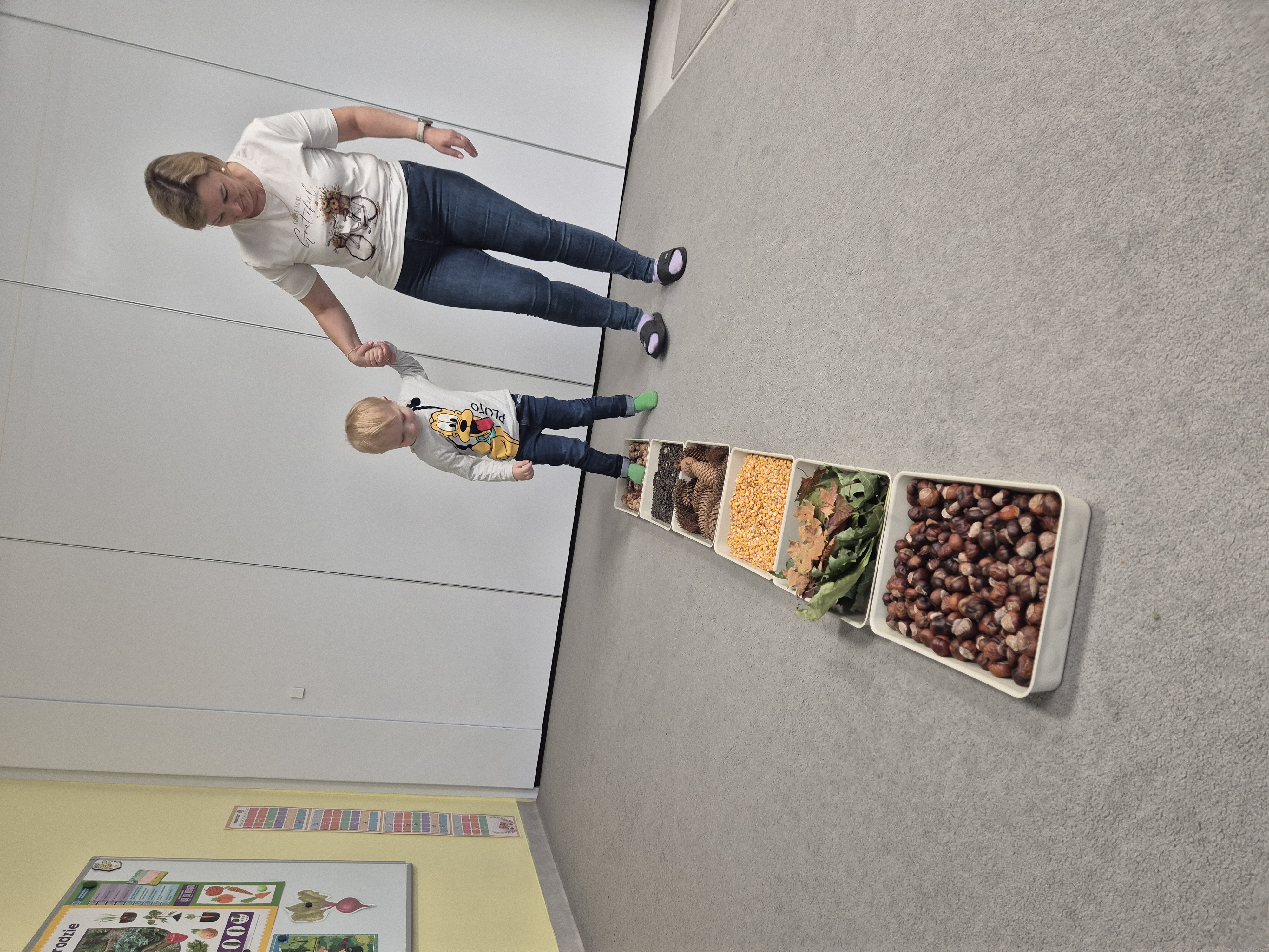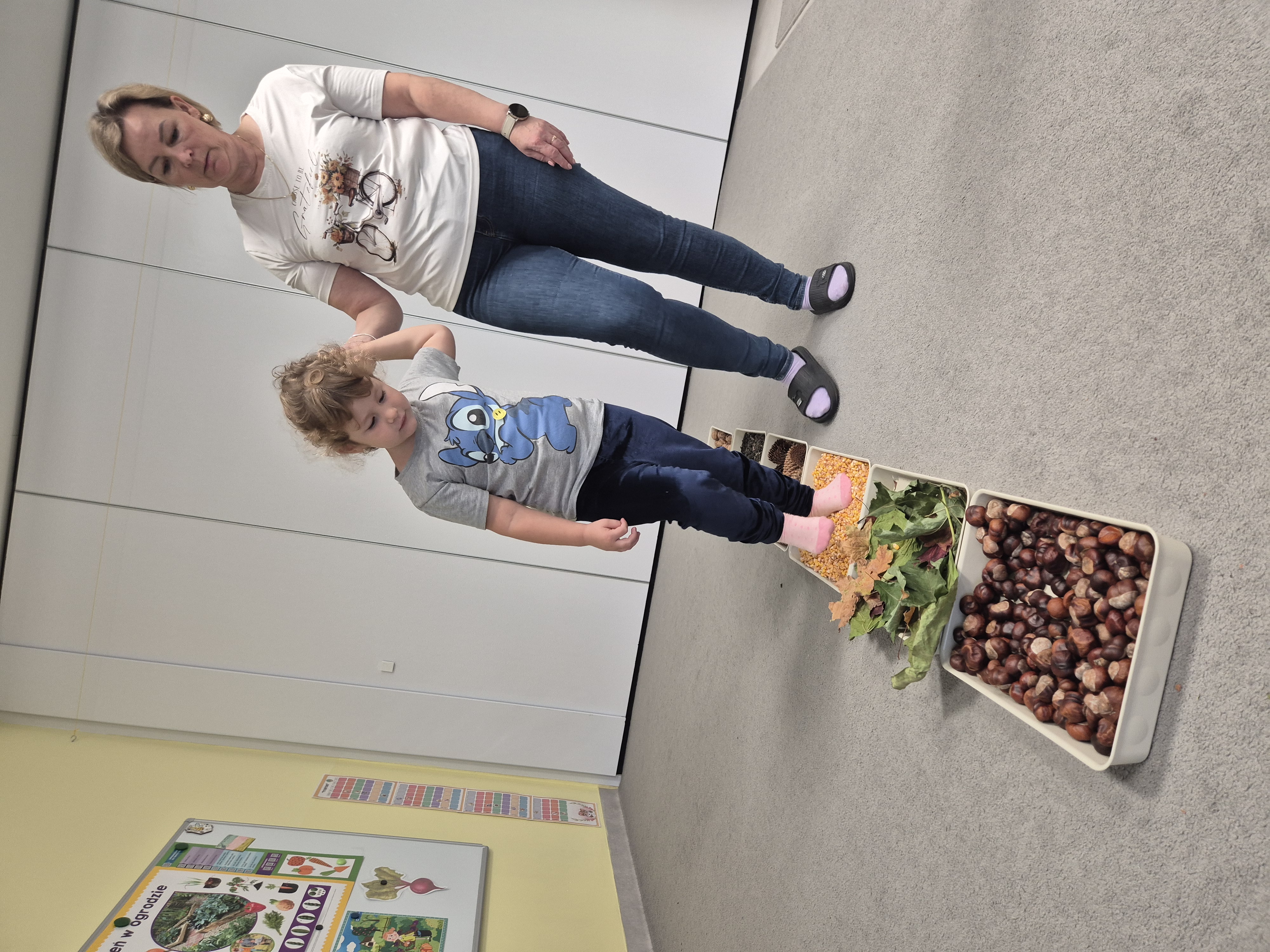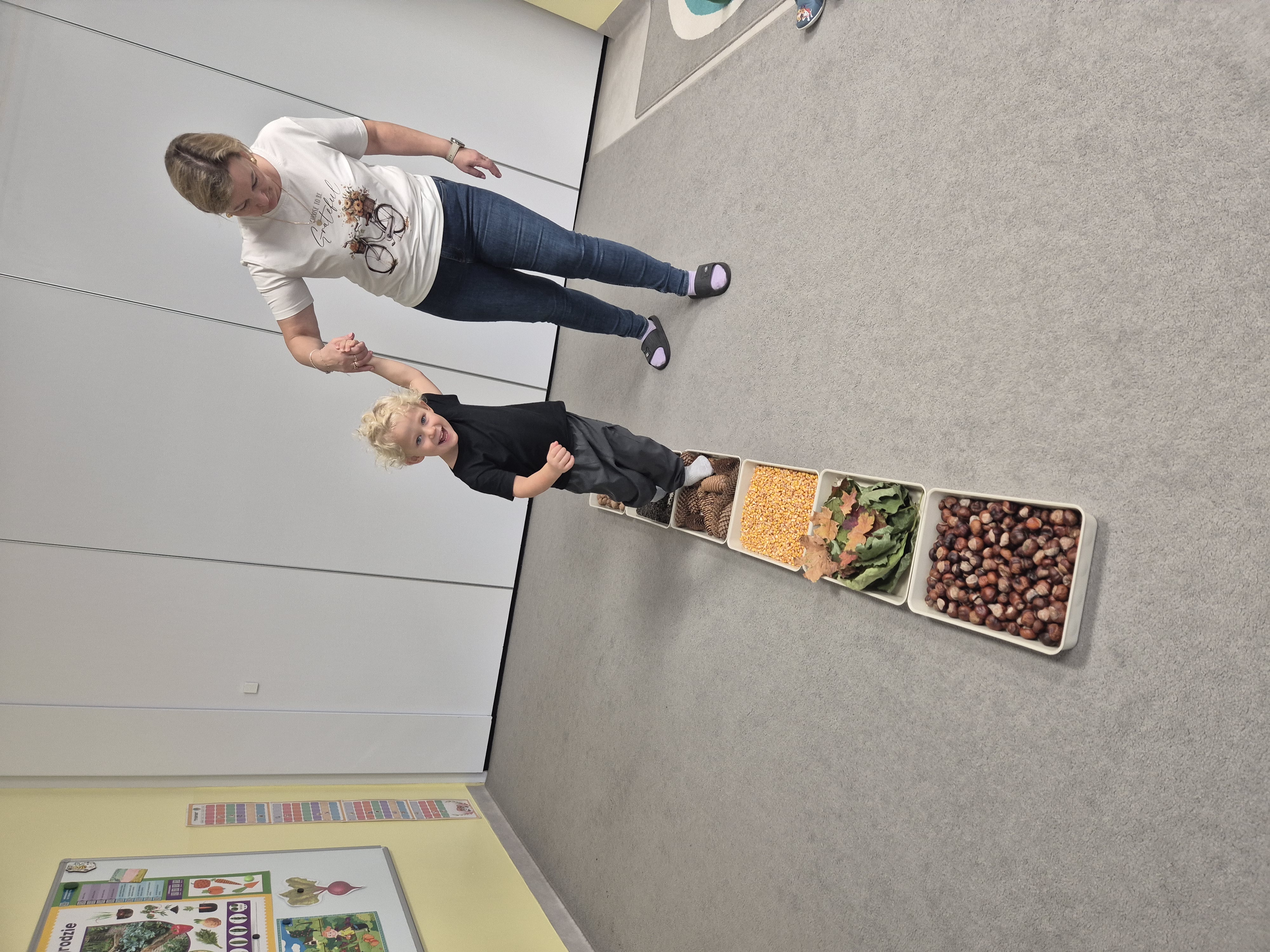 W ramach projektu „Gramy zmysłami” wykonaliśmy pierwsze zadanie październikowe – jesienną ścieżkę sensoryczną. Do jej przygotowania wykorzystaliśmy naturalne dary jesieni: kasztany, orzechy, szyszki, kukurydzę, słonecznik, liście oraz żołędzie. Podczas zabawy Tygryski mogły poznawać jesień wszystkimi zmysłami: dotykały, oglądały i wąchały naturalne materiały, rozwijając w ten sposób swoją wrażliwość sensoryczną i ciekawość świata.