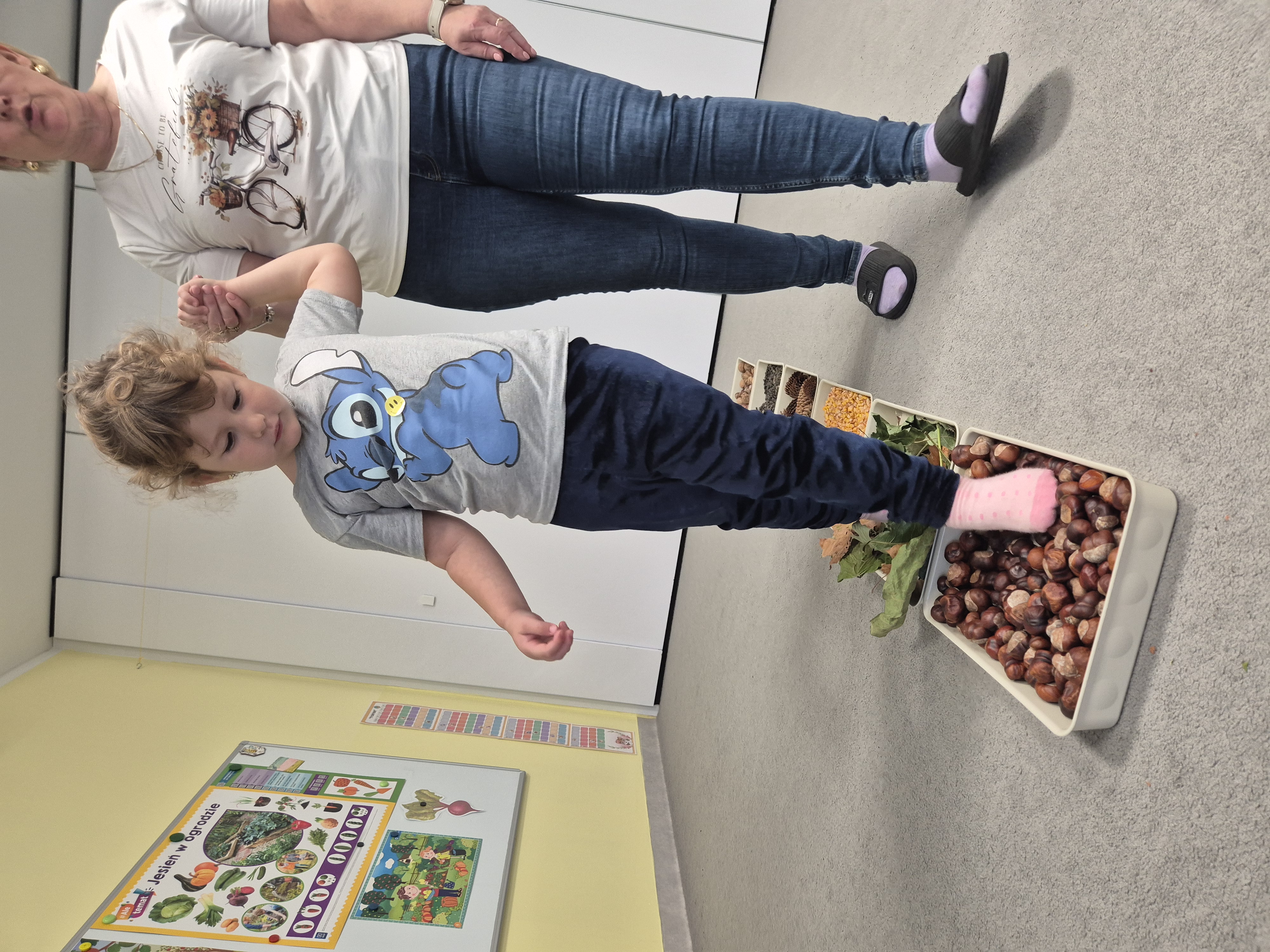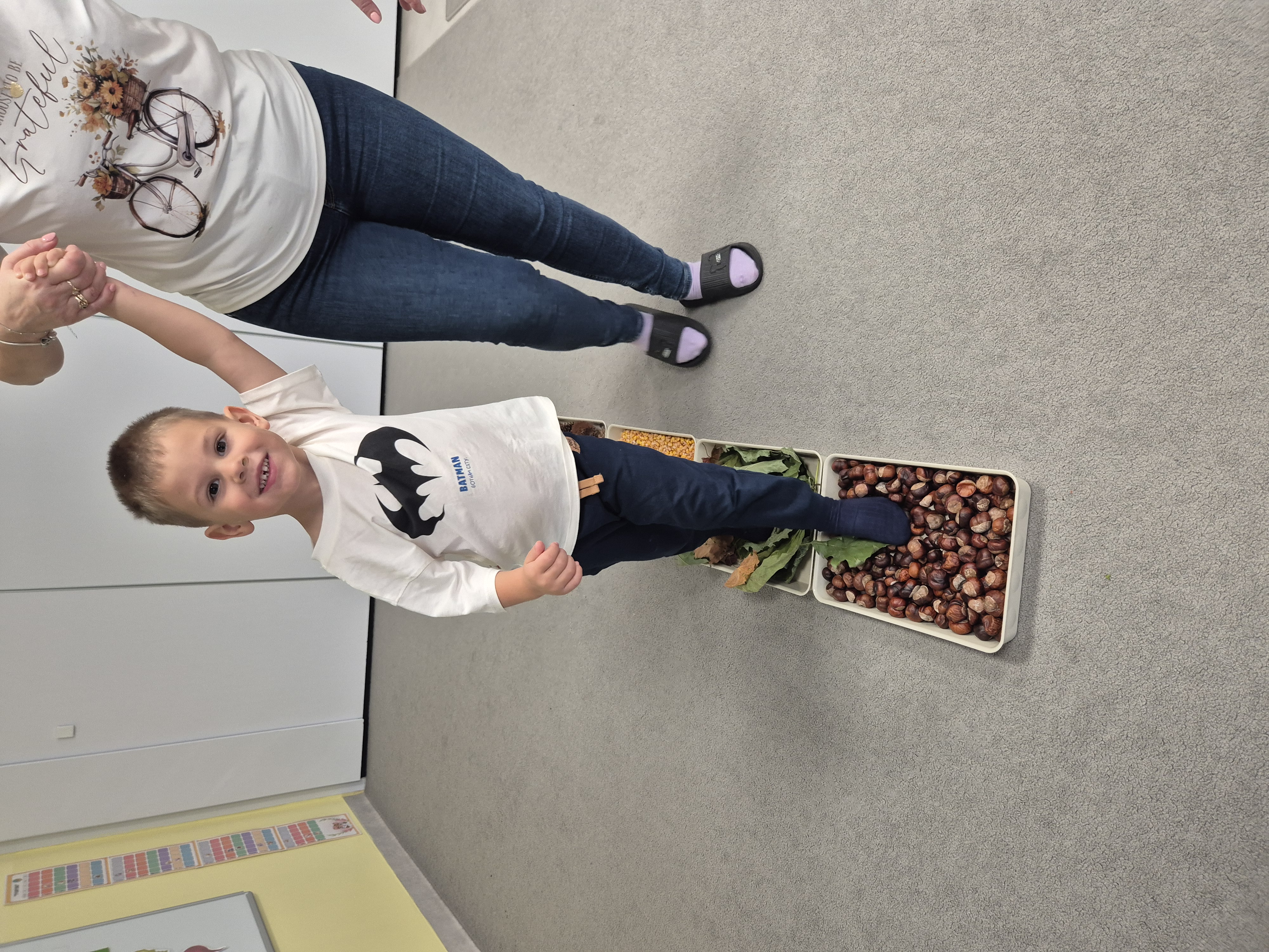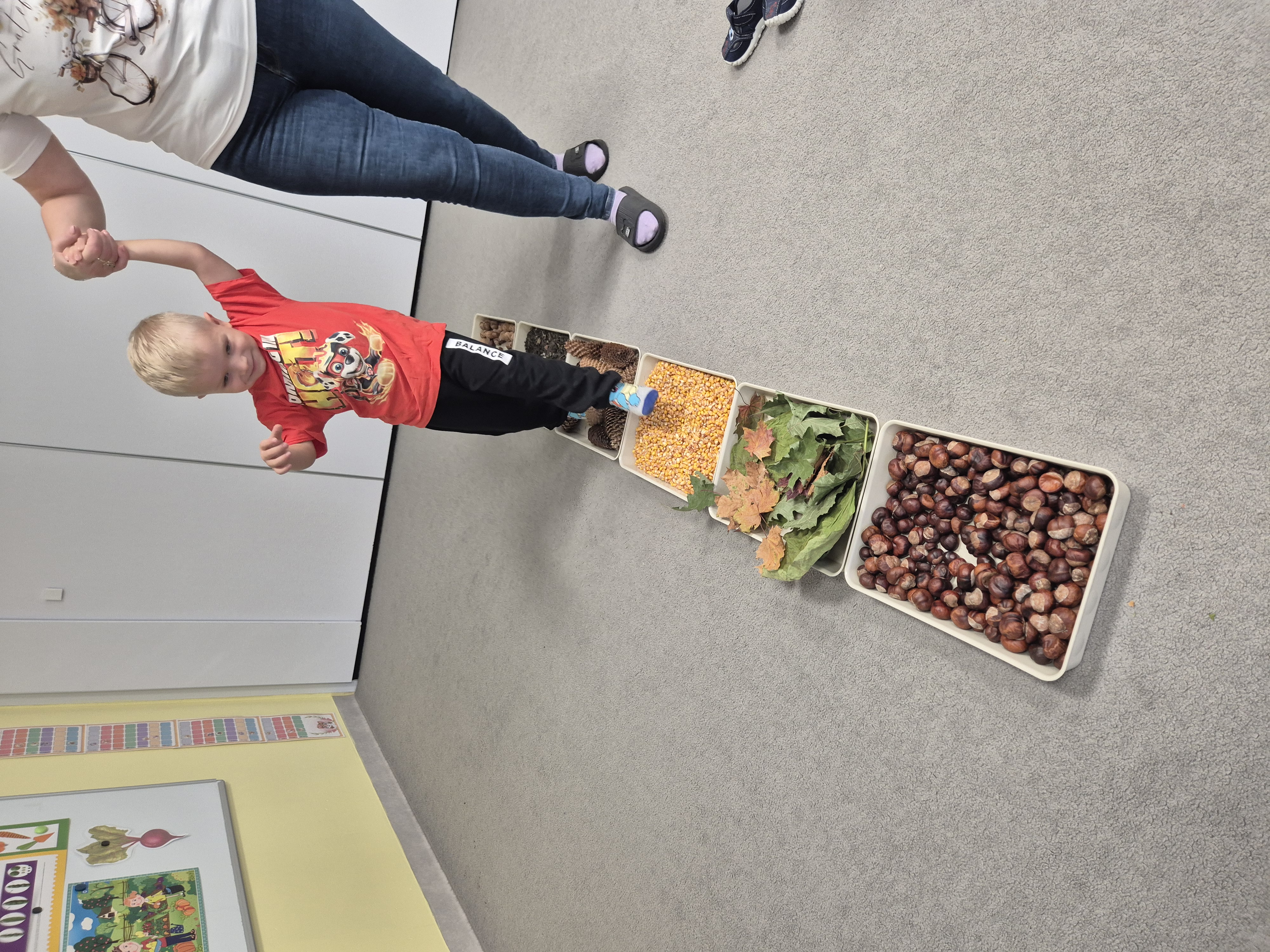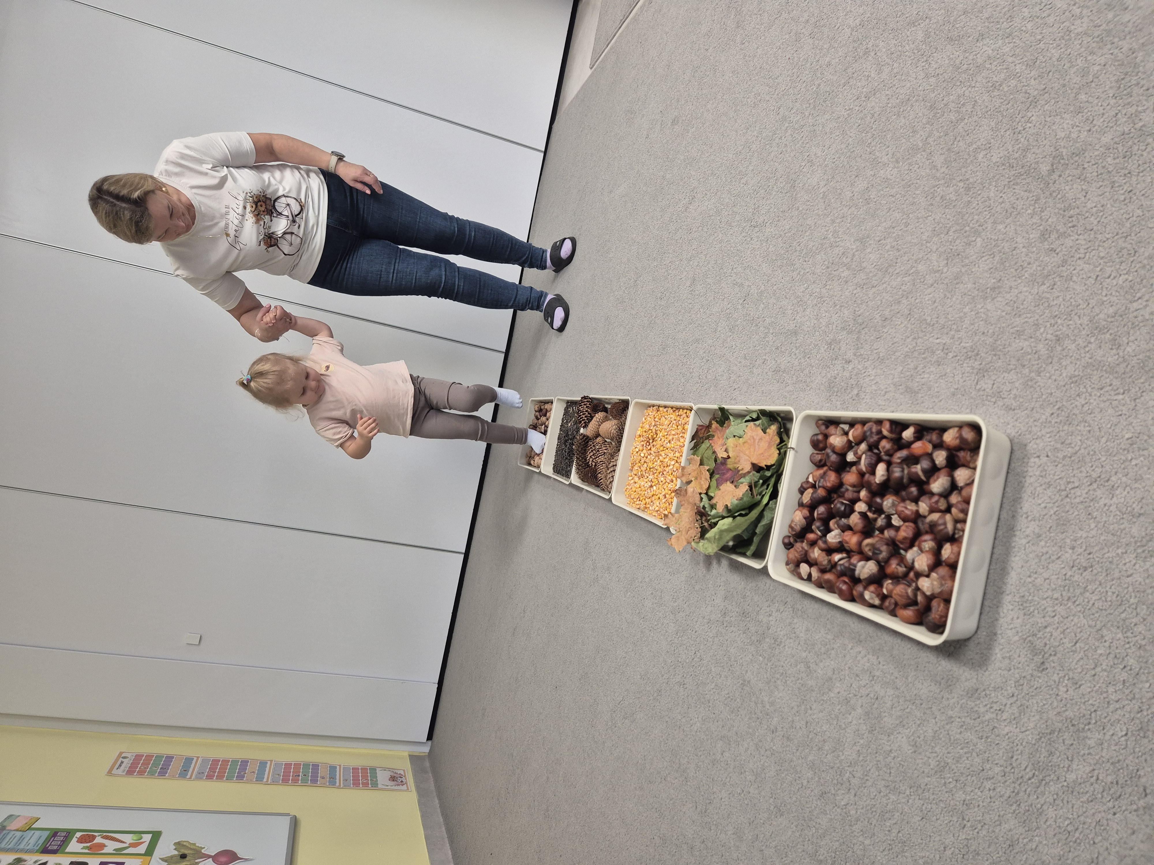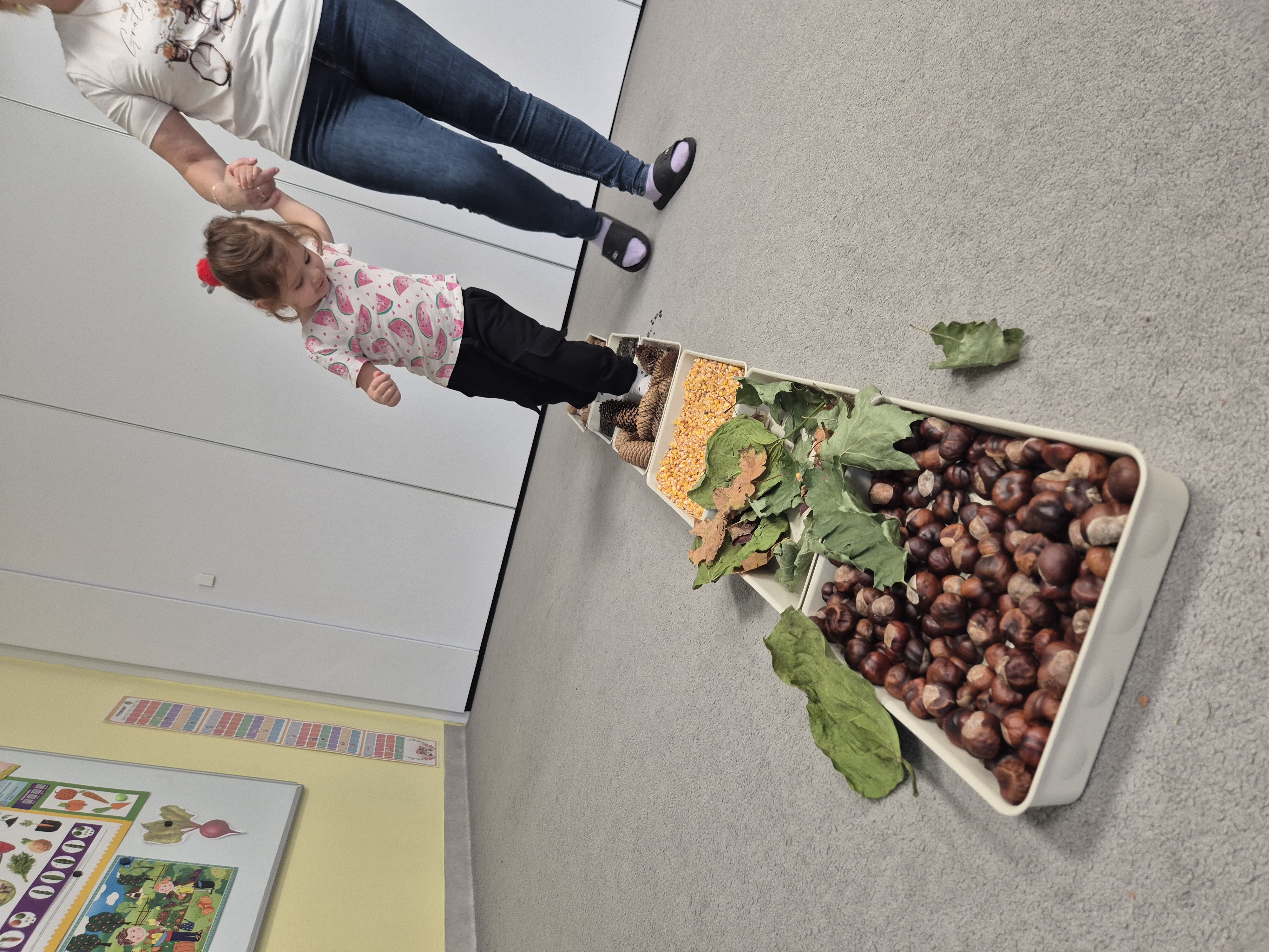 W ramach projektu „Gramy zmysłami” wykonaliśmy pierwsze zadanie październikowe – jesienną ścieżkę sensoryczną. Do jej przygotowania wykorzystaliśmy naturalne dary jesieni: kasztany, orzechy, szyszki, kukurydzę, słonecznik, liście oraz żołędzie. Podczas zabawy Tygryski mogły poznawać jesień wszystkimi zmysłami: dotykały, oglądały i wąchały naturalne materiały, rozwijając w ten sposób swoją wrażliwość sensoryczną i ciekawość świata.