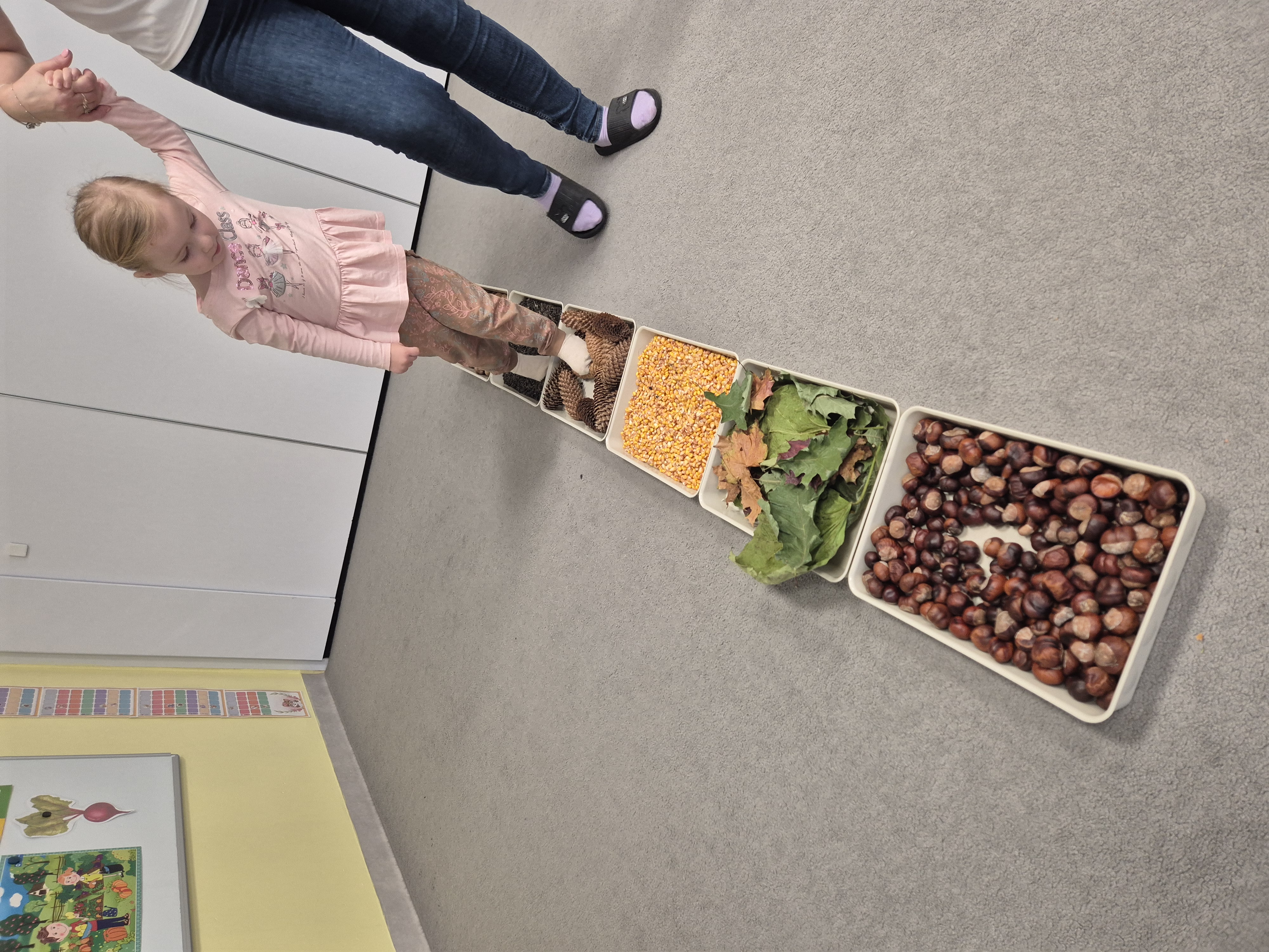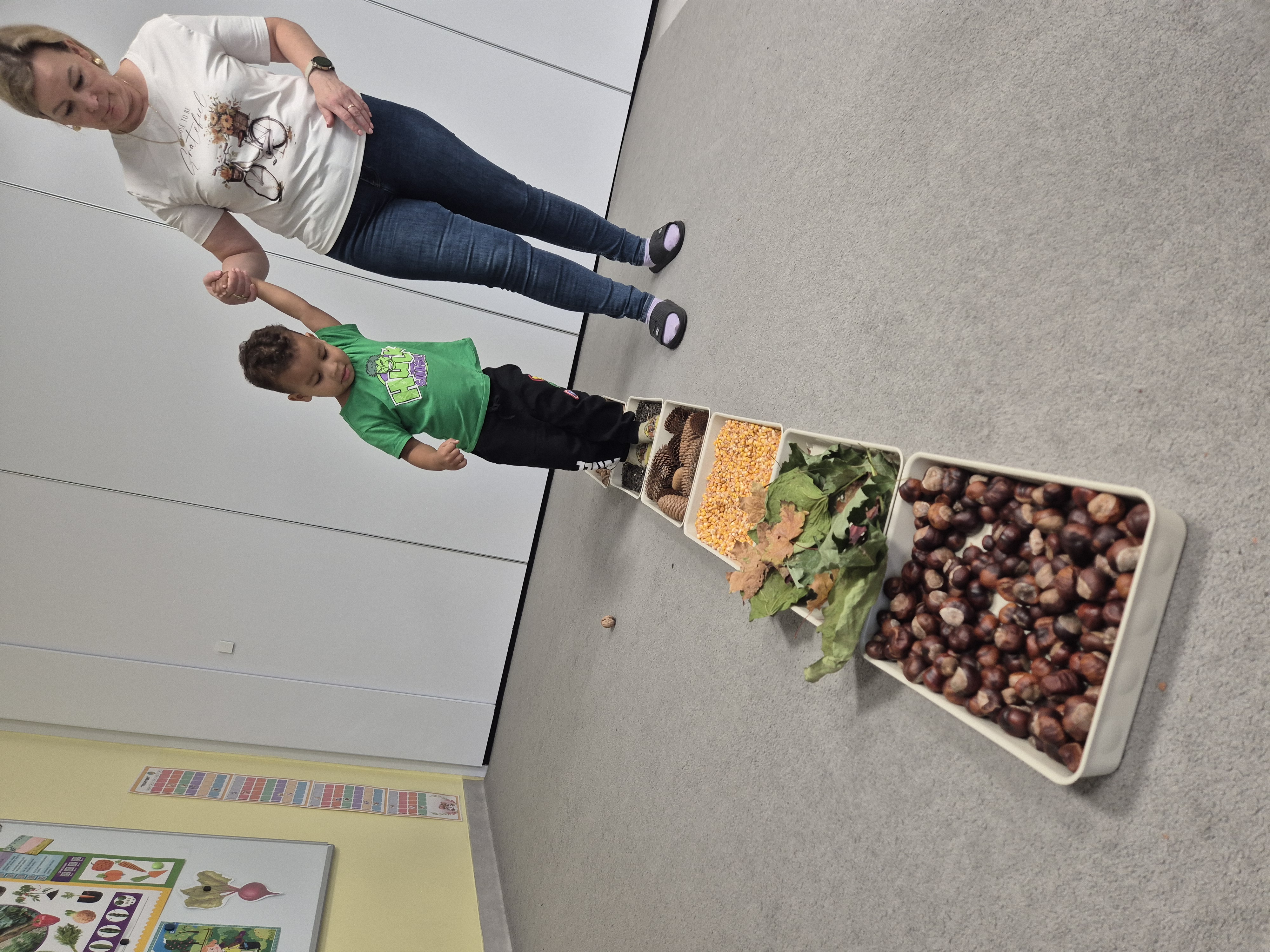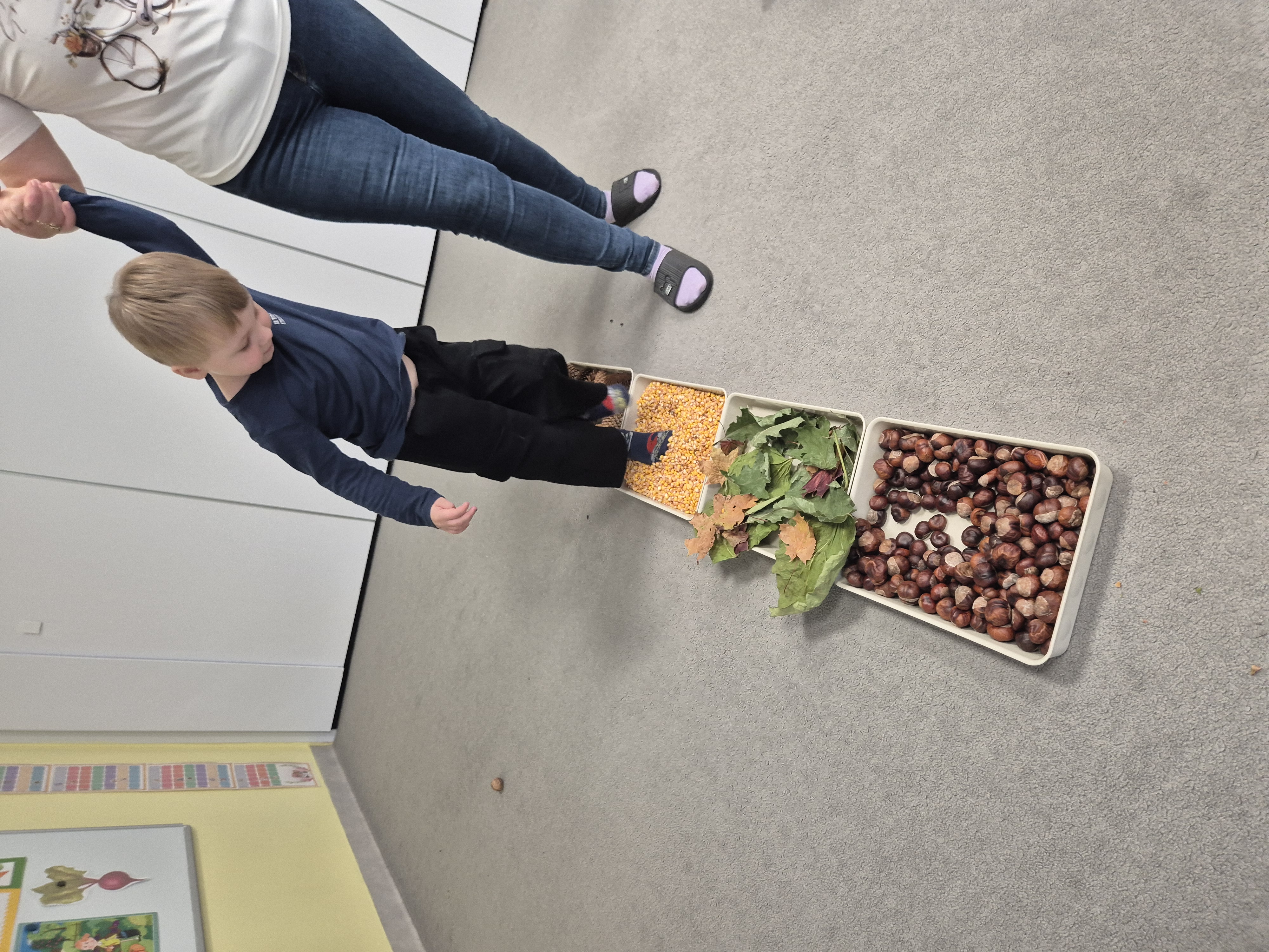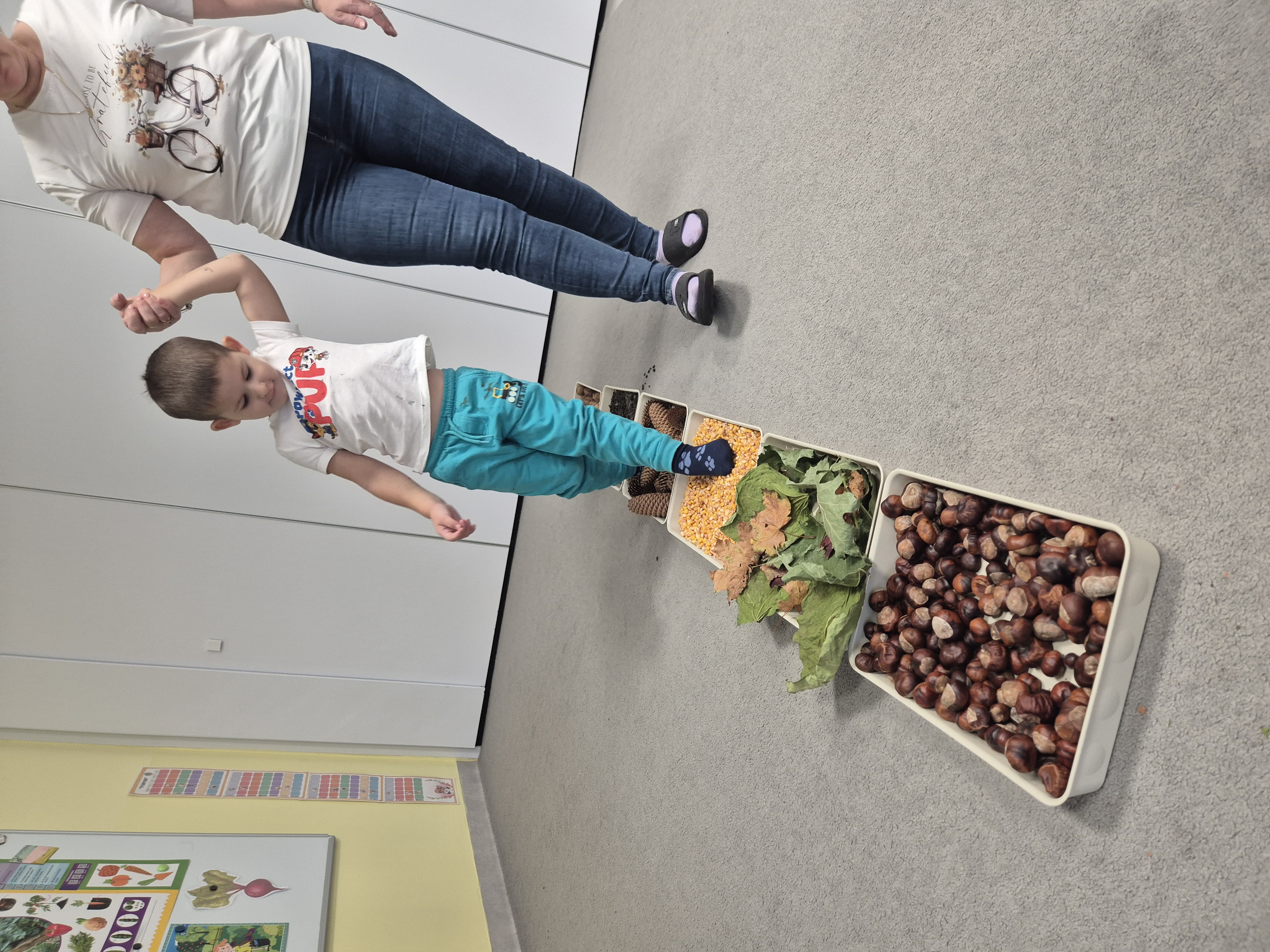 W ramach projektu „Gramy zmysłami” wykonaliśmy pierwsze zadanie październikowe – jesienną ścieżkę sensoryczną. Do jej przygotowania wykorzystaliśmy naturalne dary jesieni: kasztany, orzechy, szyszki, kukurydzę, słonecznik, liście oraz żołędzie. Podczas zabawy Tygryski mogły poznawać jesień wszystkimi zmysłami: dotykały, oglądały i wąchały naturalne materiały, rozwijając w ten sposób swoją wrażliwość sensoryczną i ciekawość świata.