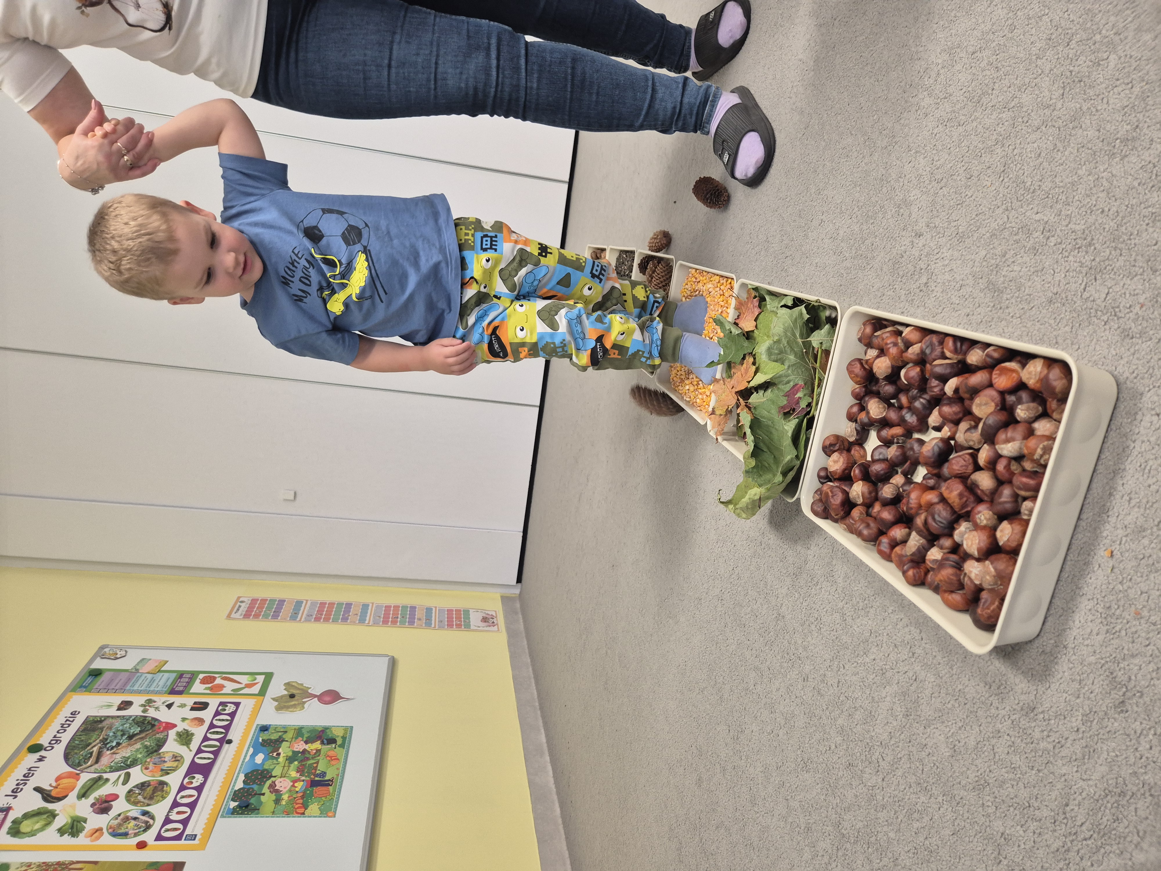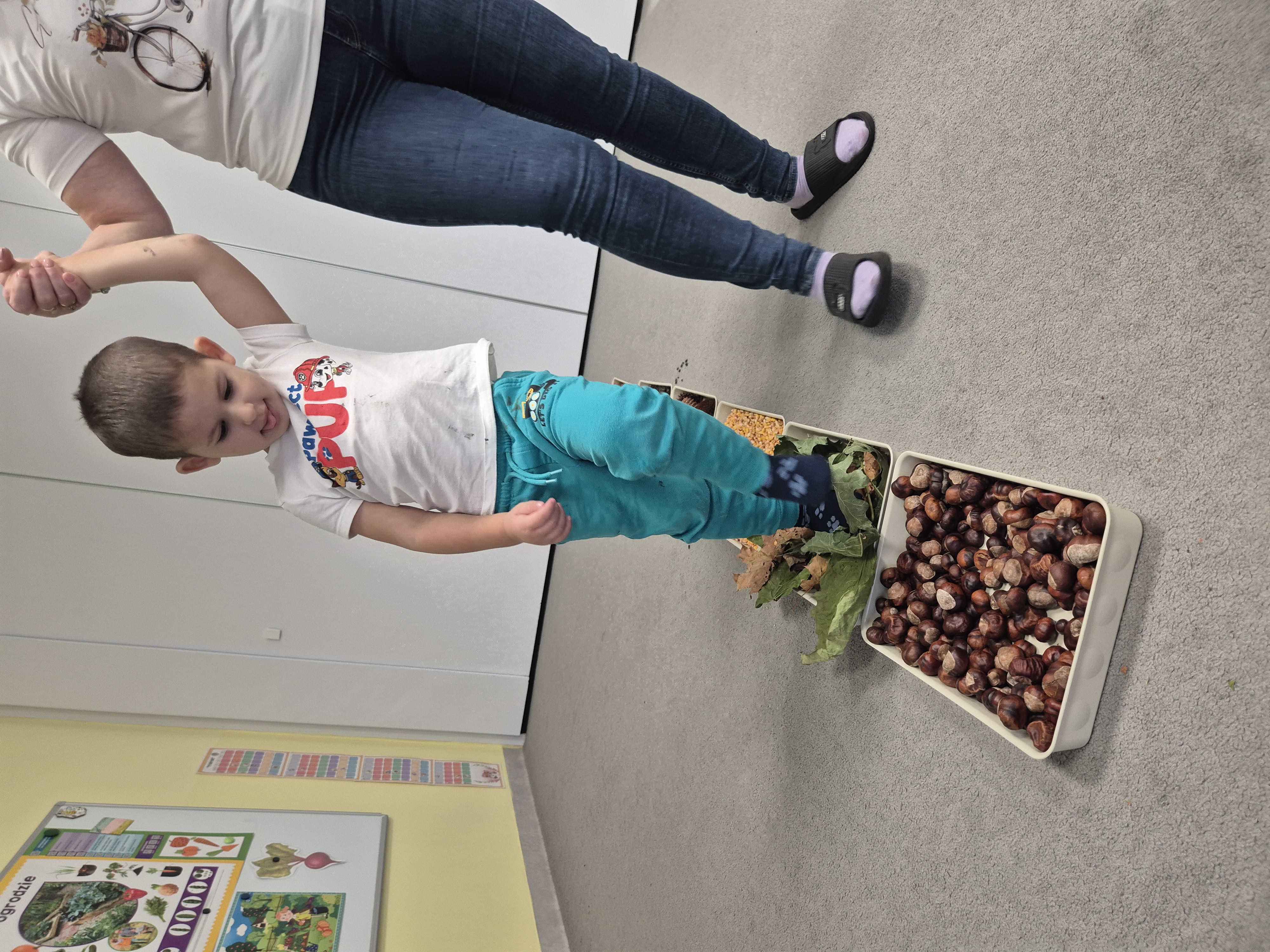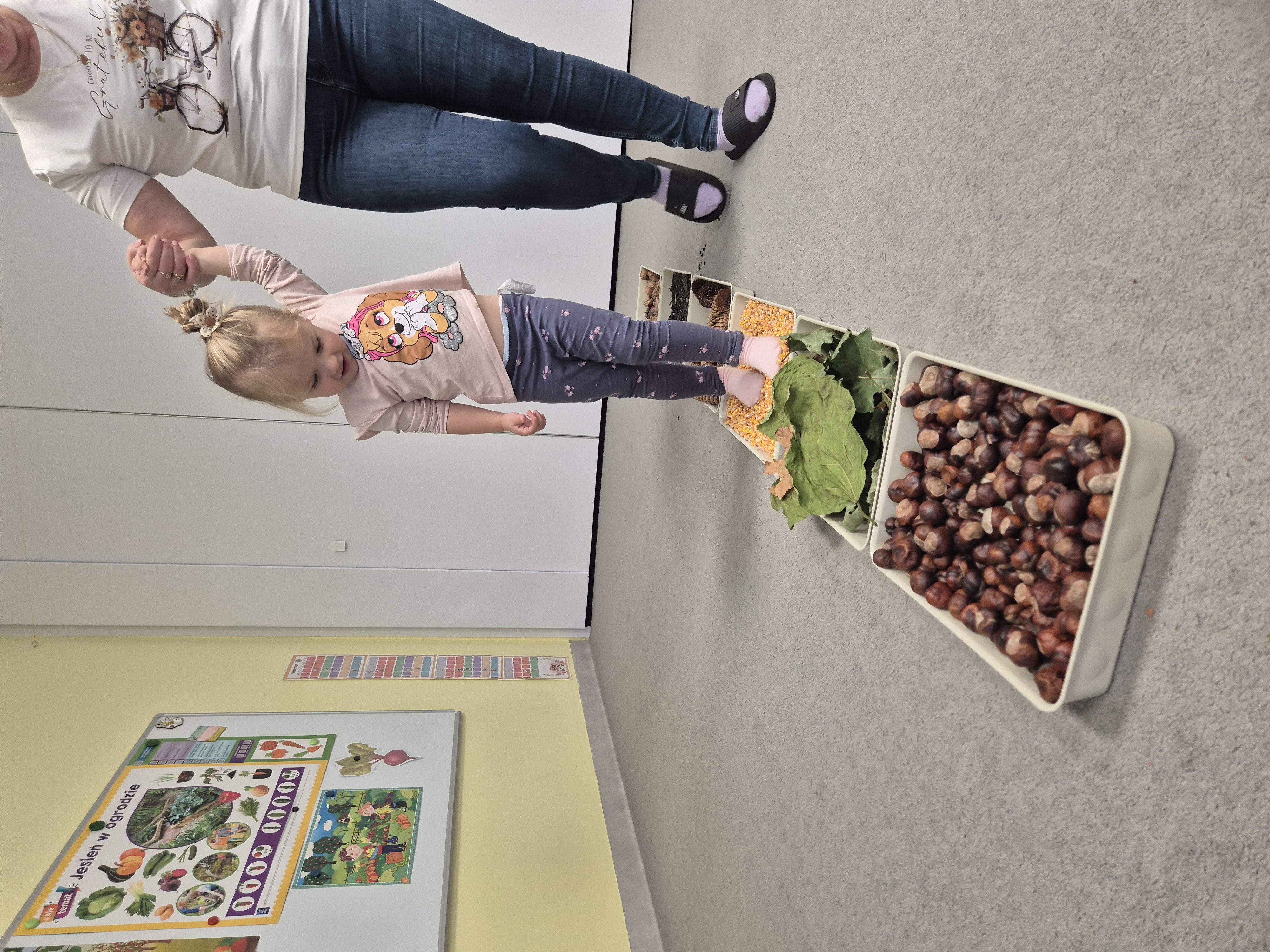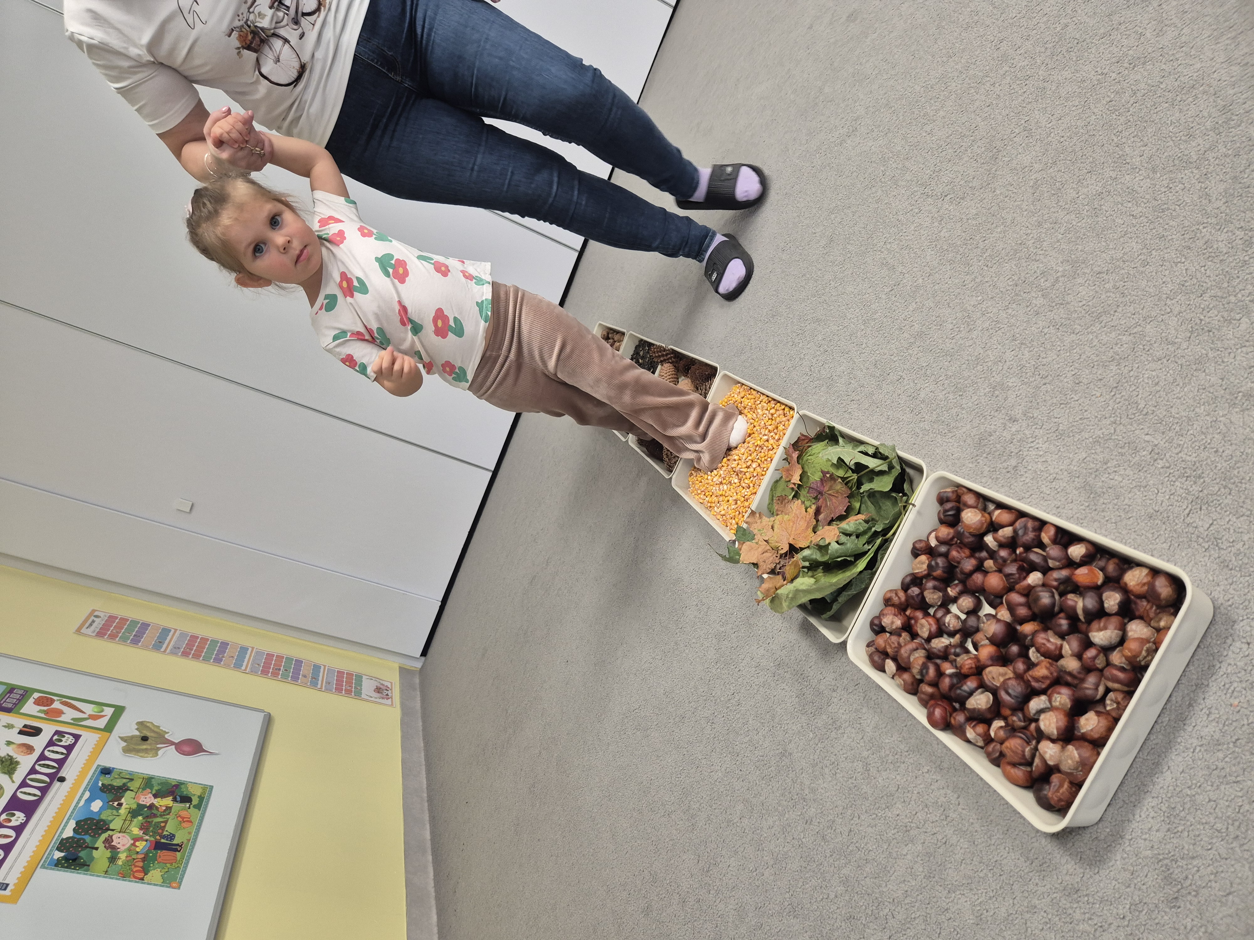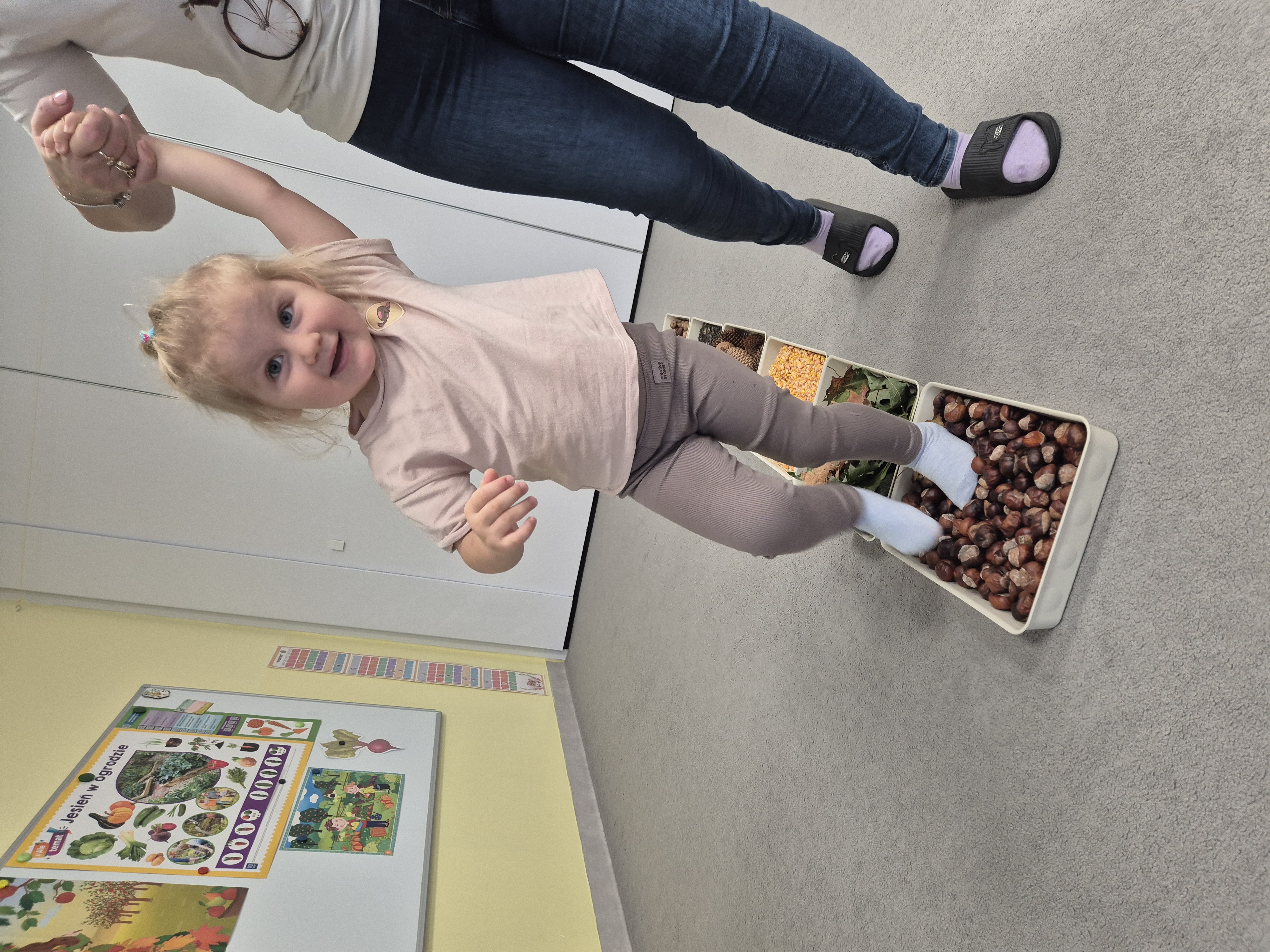 W ramach projektu „Gramy zmysłami” wykonaliśmy pierwsze zadanie październikowe – jesienną ścieżkę sensoryczną. Do jej przygotowania wykorzystaliśmy naturalne dary jesieni: kasztany, orzechy, szyszki, kukurydzę, słonecznik, liście oraz żołędzie. Podczas zabawy Tygryski mogły poznawać jesień wszystkimi zmysłami: dotykały, oglądały i wąchały naturalne materiały, rozwijając w ten sposób swoją wrażliwość sensoryczną i ciekawość świata.