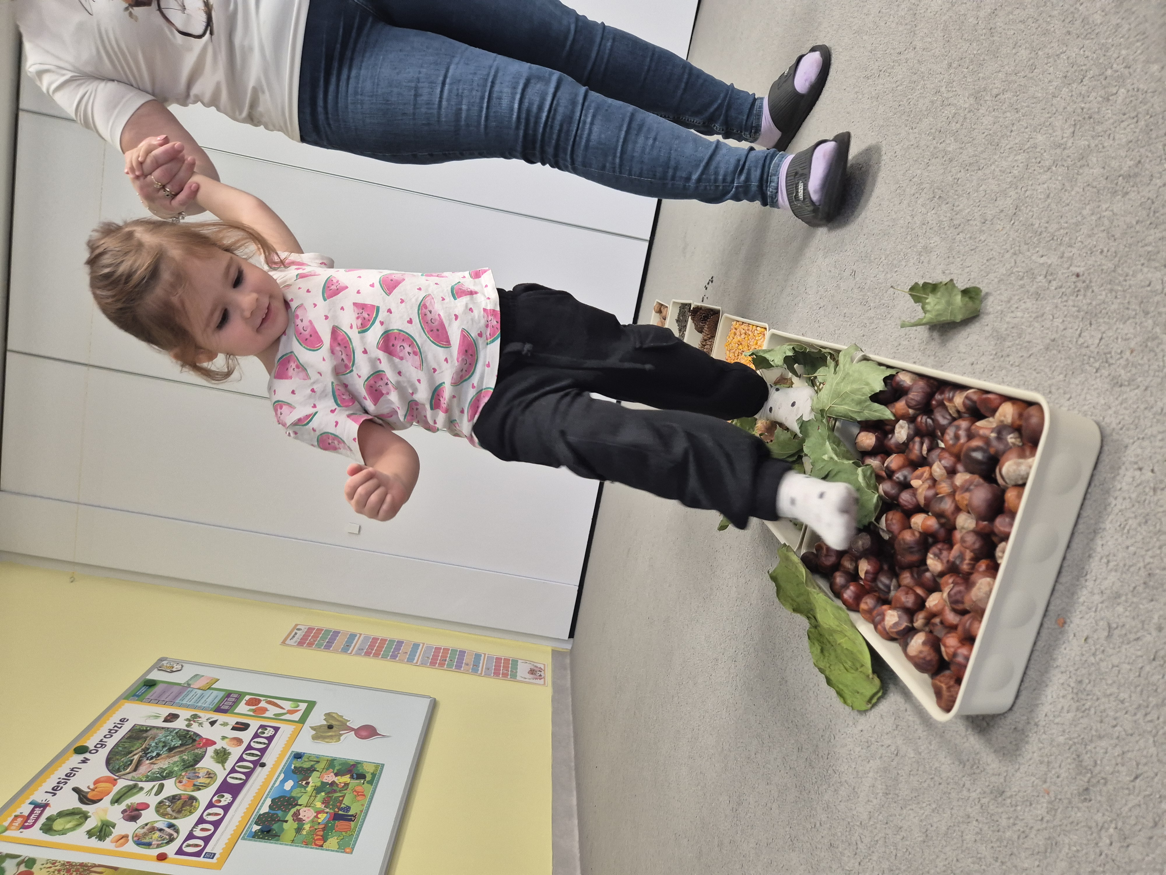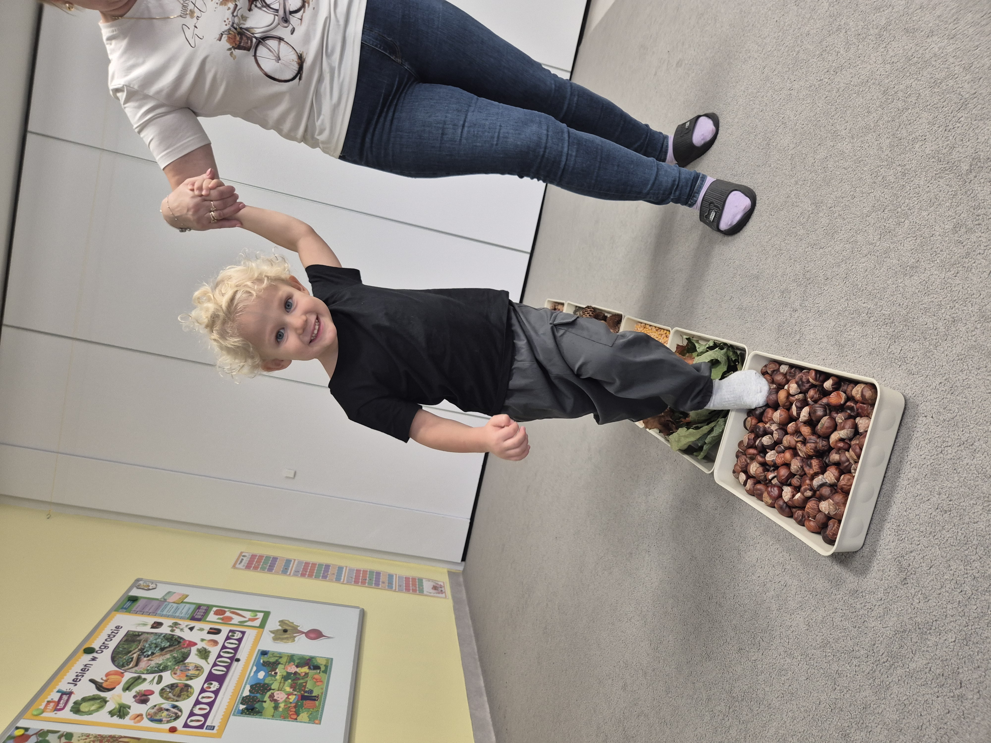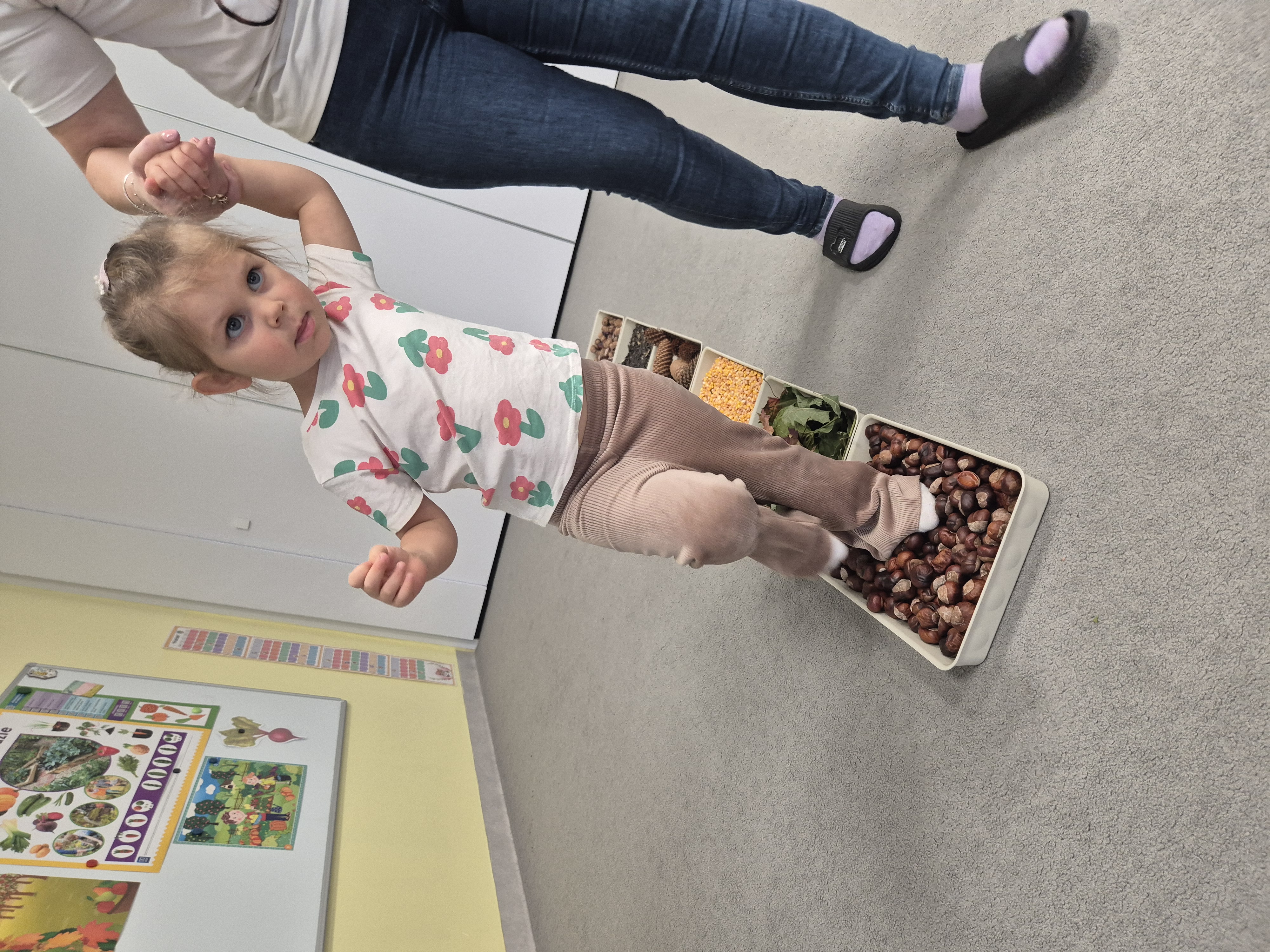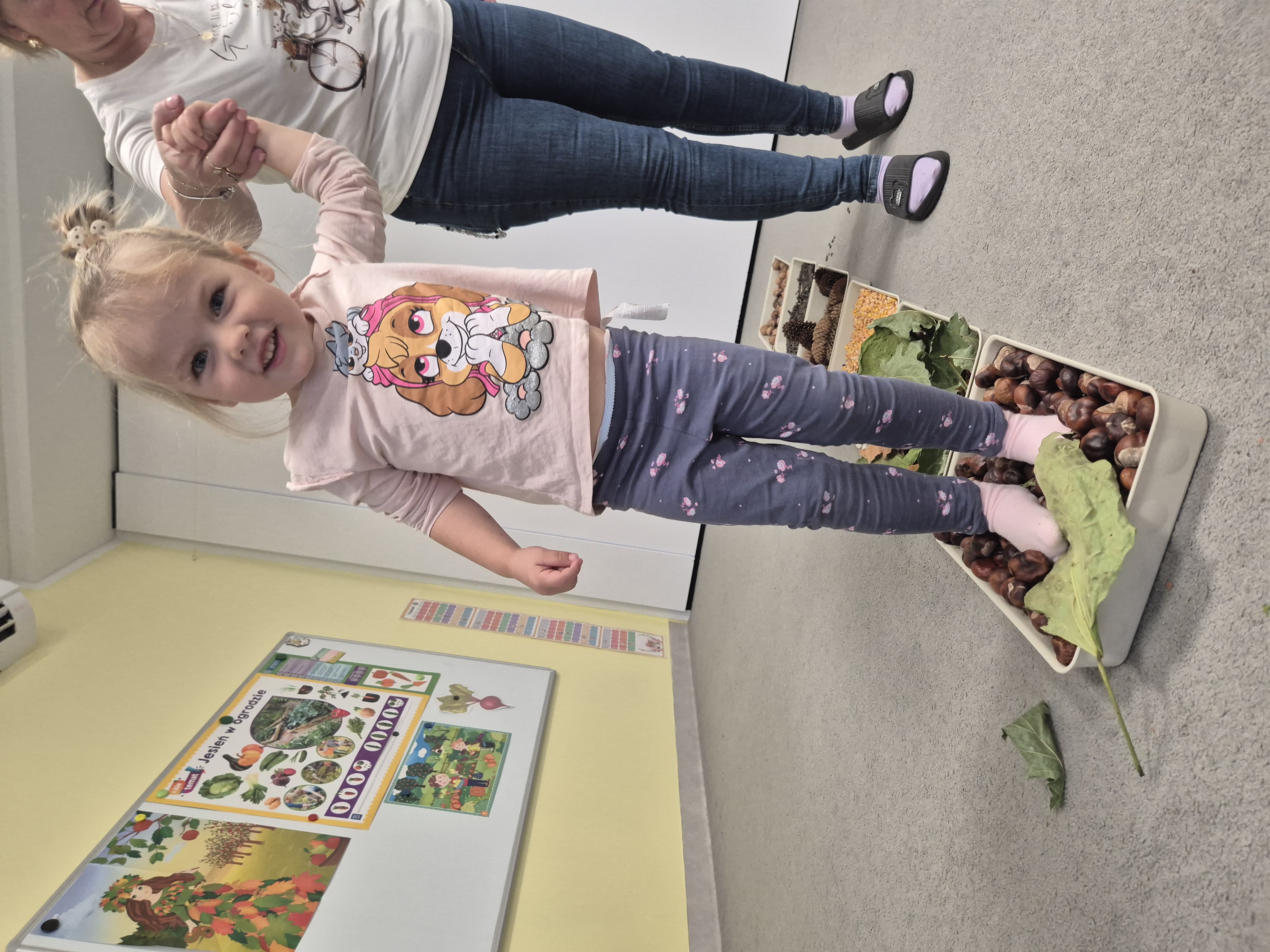 W ramach projektu „Gramy zmysłami” wykonaliśmy pierwsze zadanie październikowe – jesienną ścieżkę sensoryczną. Do jej przygotowania wykorzystaliśmy naturalne dary jesieni: kasztany, orzechy, szyszki, kukurydzę, słonecznik, liście oraz żołędzie. Podczas zabawy Tygryski mogły poznawać jesień wszystkimi zmysłami: dotykały, oglądały i wąchały naturalne materiały, rozwijając w ten sposób swoją wrażliwość sensoryczną i ciekawość świata.