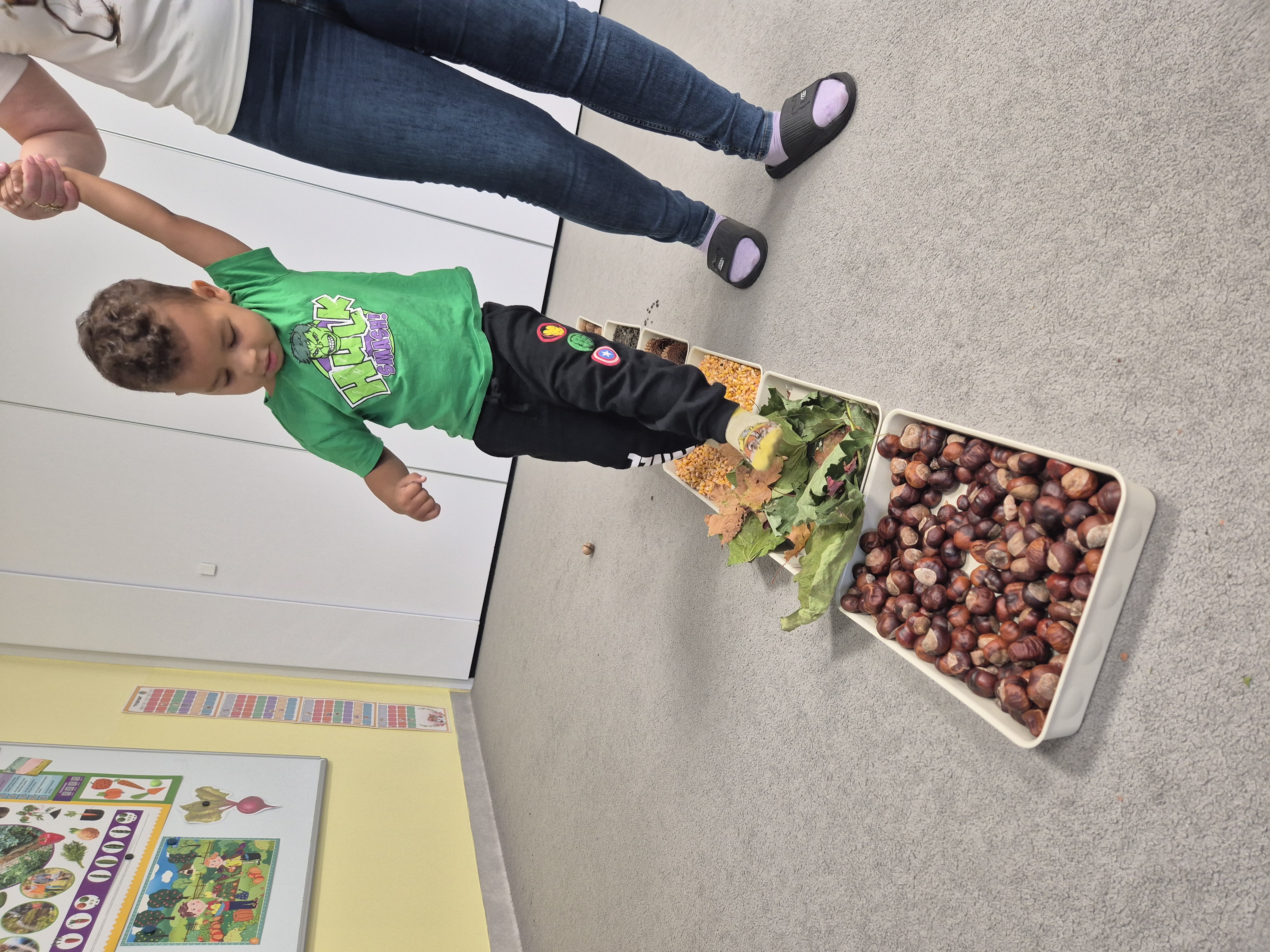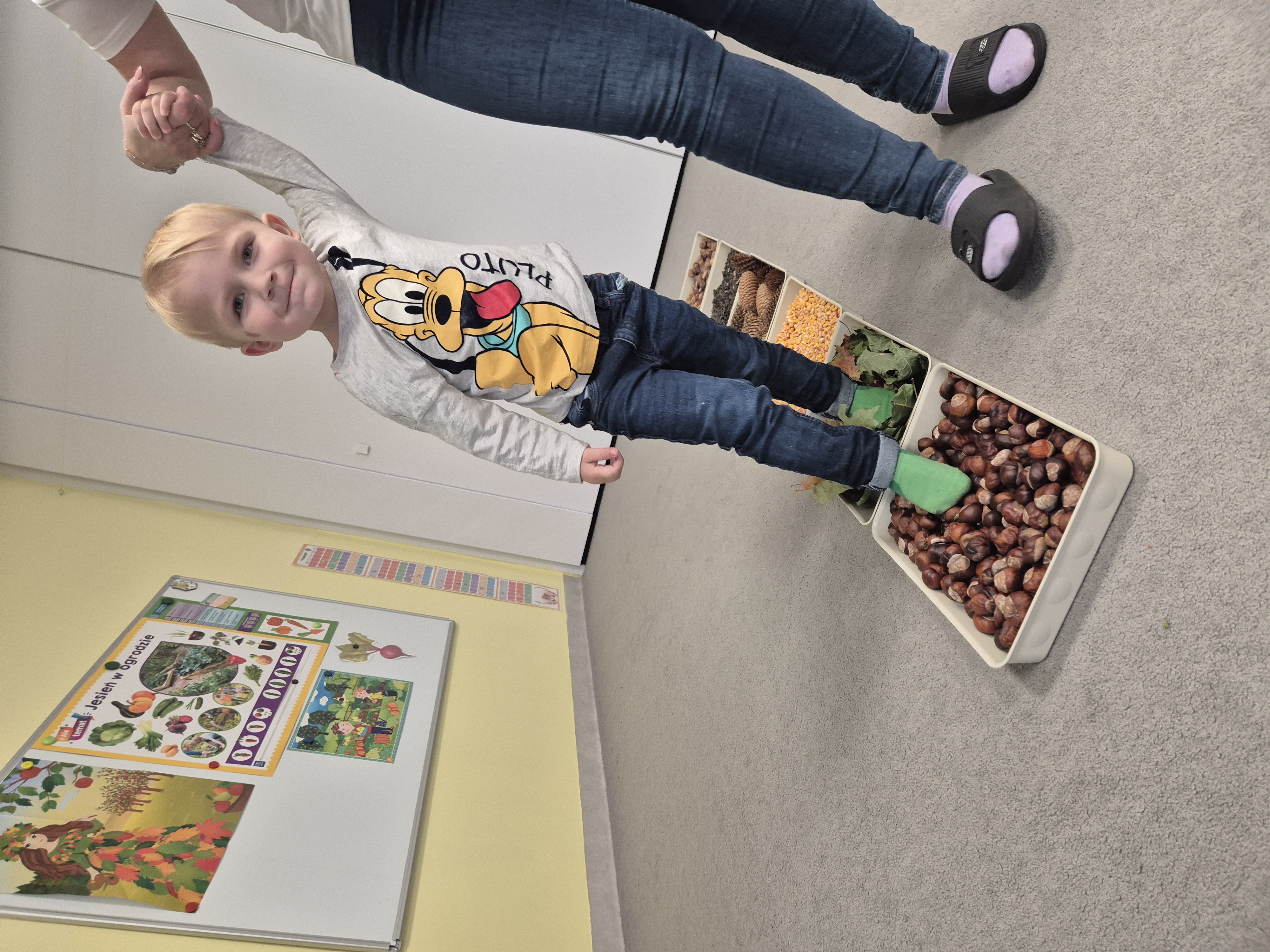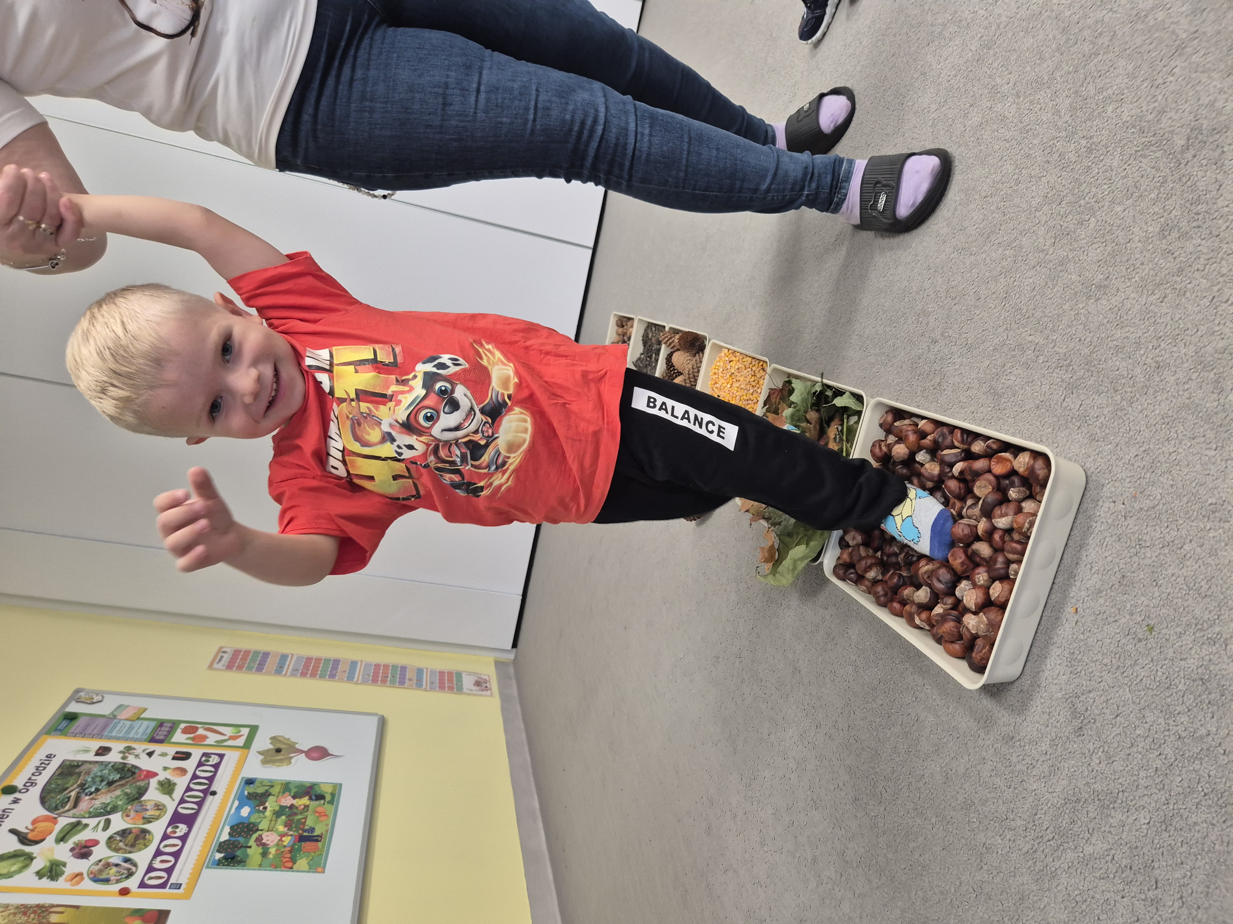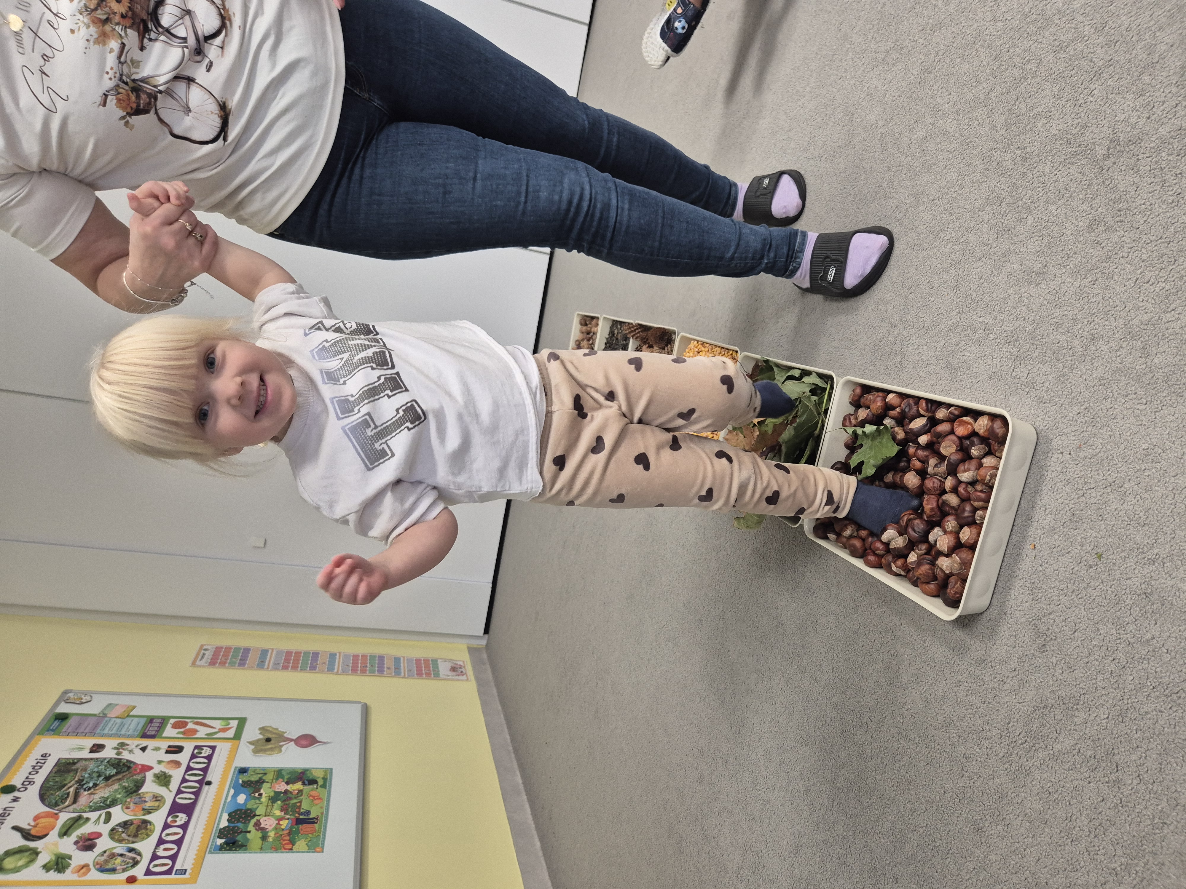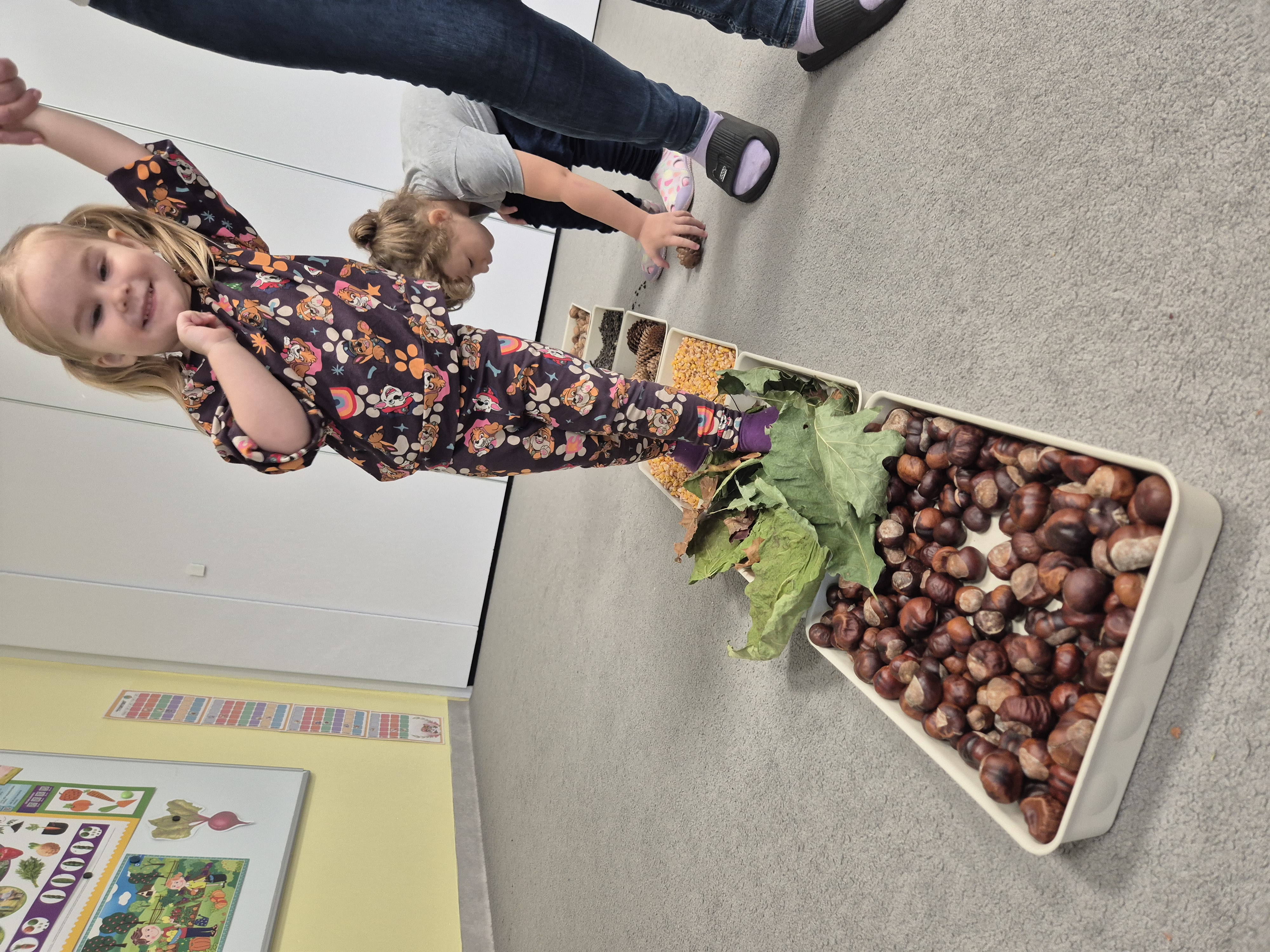 W ramach projektu „Gramy zmysłami” wykonaliśmy pierwsze zadanie październikowe – jesienną ścieżkę sensoryczną. Do jej przygotowania wykorzystaliśmy naturalne dary jesieni: kasztany, orzechy, szyszki, kukurydzę, słonecznik, liście oraz żołędzie. Podczas zabawy Tygryski mogły poznawać jesień wszystkimi zmysłami: dotykały, oglądały i wąchały naturalne materiały, rozwijając w ten sposób swoją wrażliwość sensoryczną i ciekawość świata.