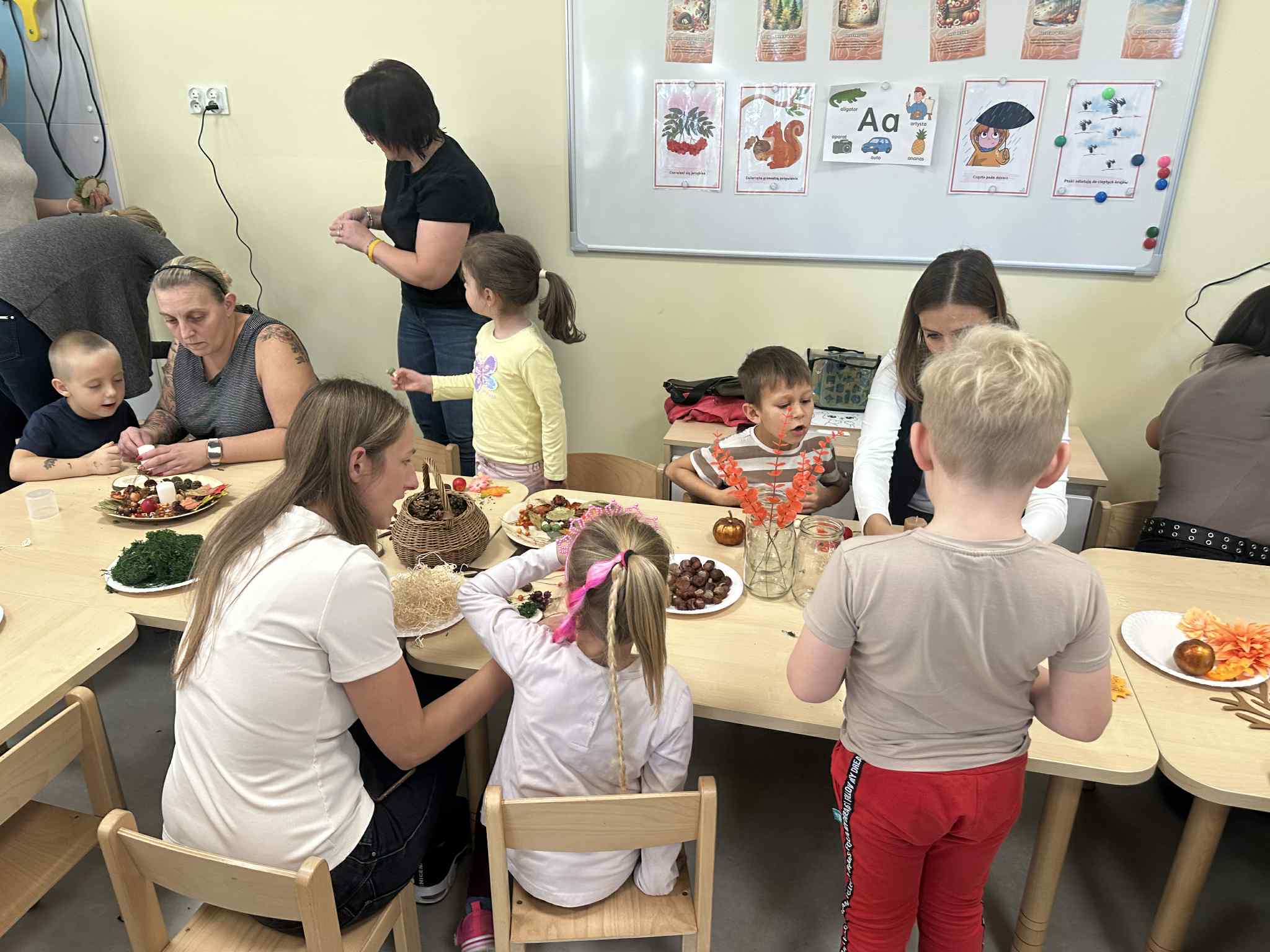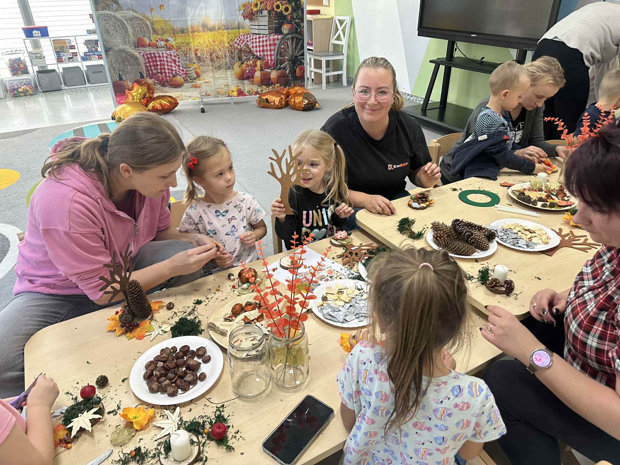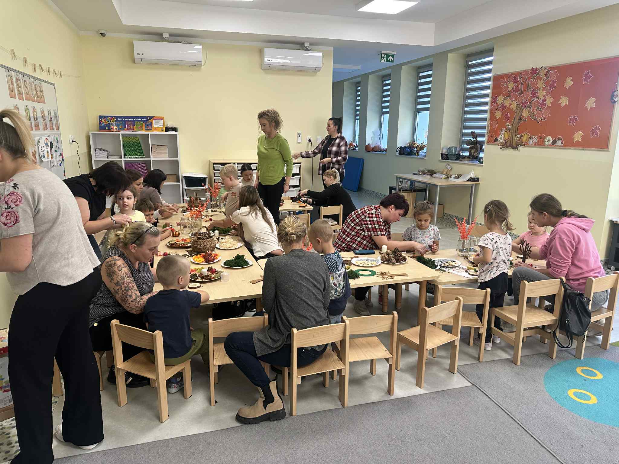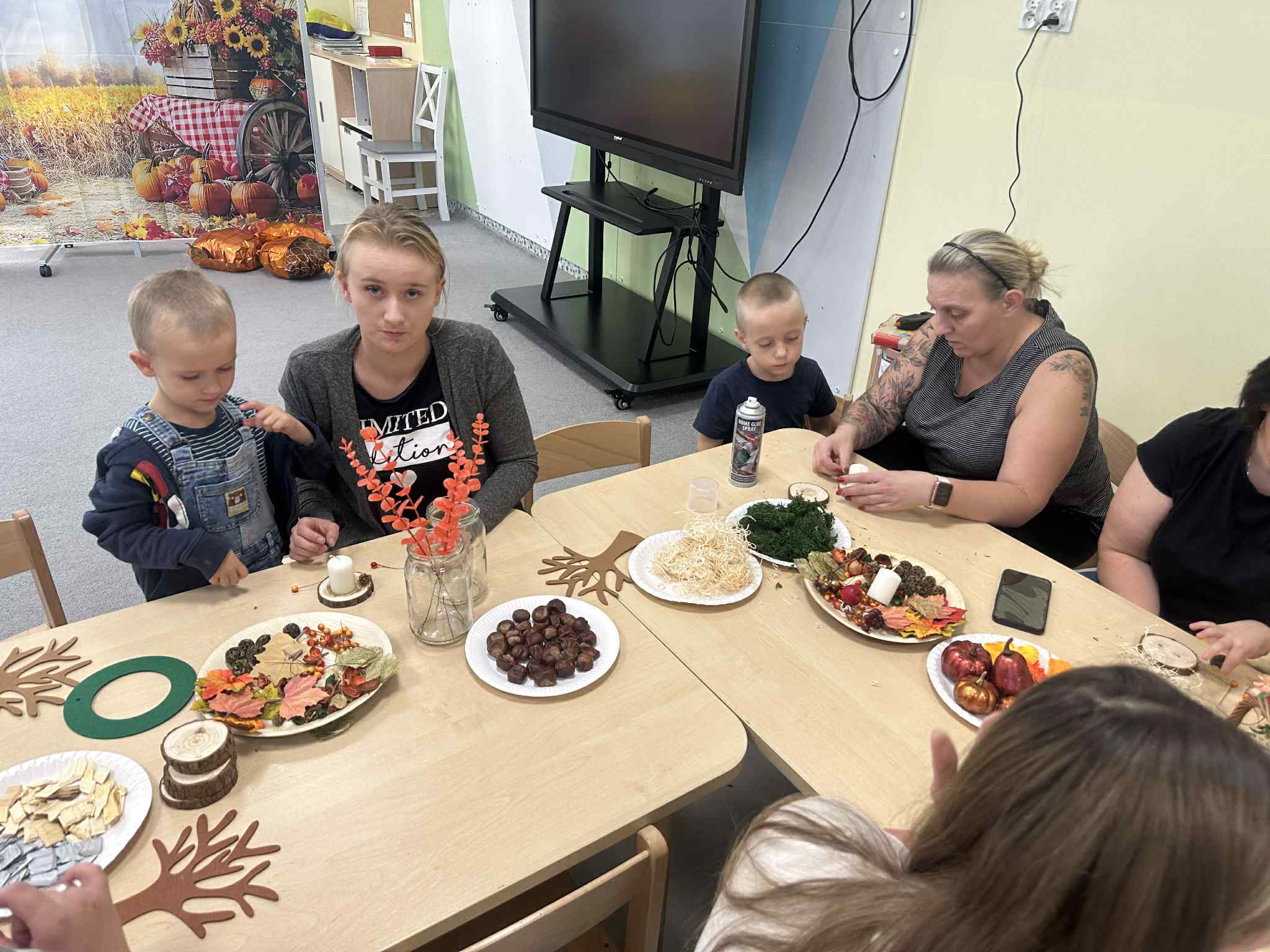 Wspólne tworzenie sprawiło wszystkim mnóstwo radości — było dużo śmiechu, rozmów, ciepłej, rodzinnej atmosfery. Dzieci z zapałem dobierały kolorowe liście, szyszki i kasztany, a mamy z dumą pomagały w komponowaniu jesiennych dekoracji. Efekty pracy były zachwycające — każdy stroik miał swój niepowtarzalny urok!