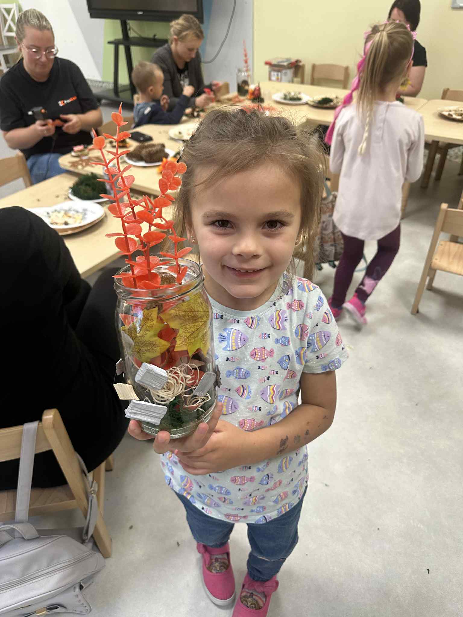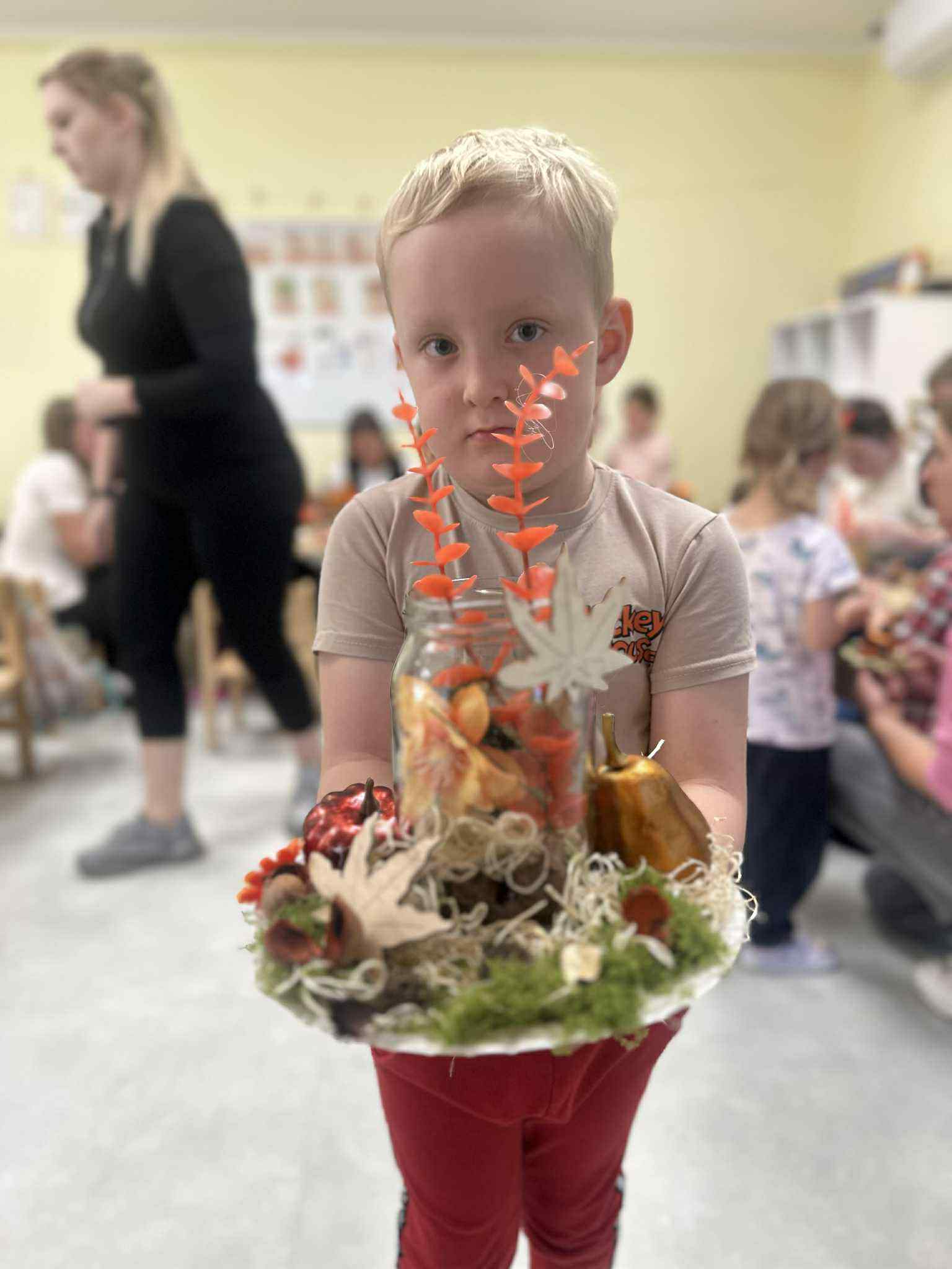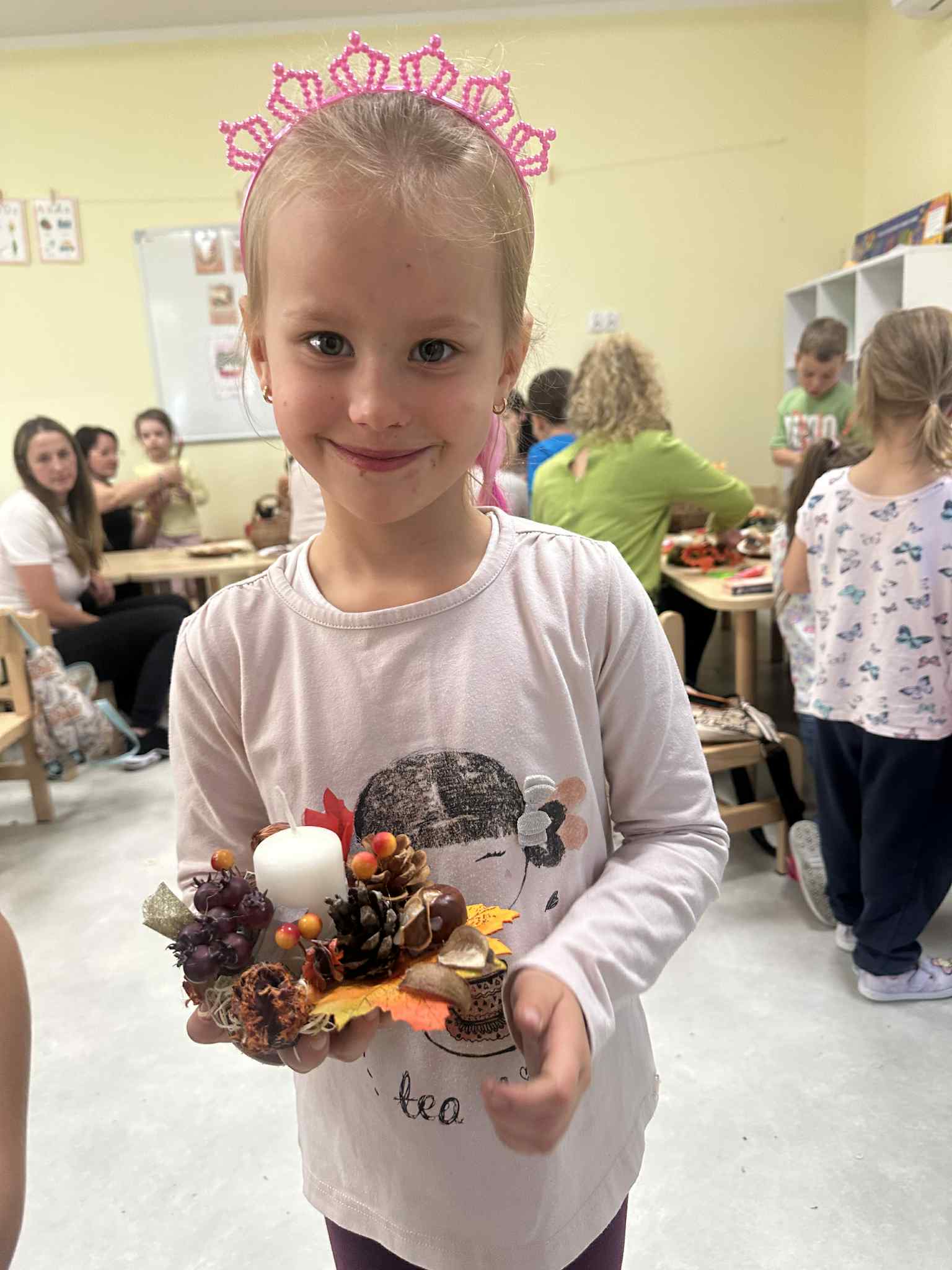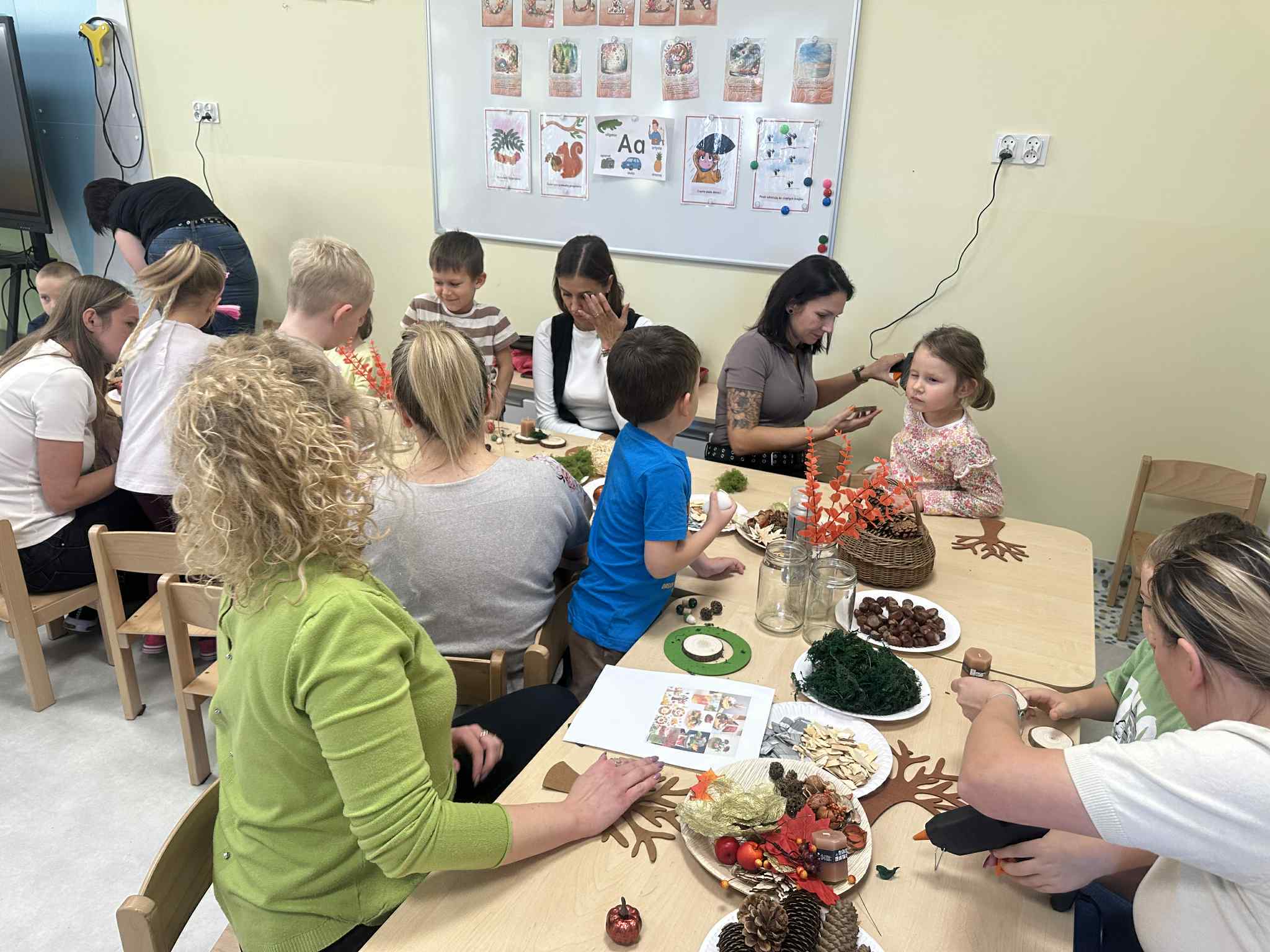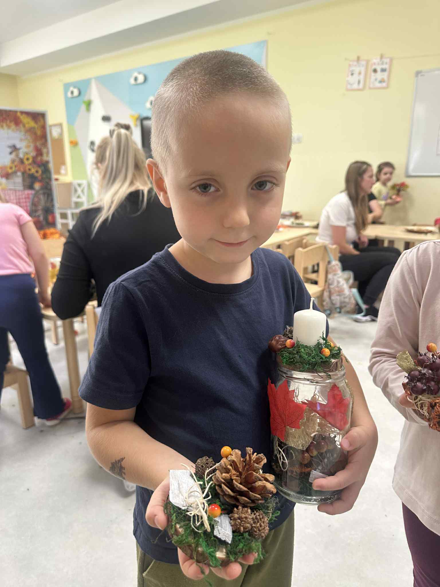 Wspólne tworzenie sprawiło wszystkim mnóstwo radości — było dużo śmiechu, rozmów, ciepłej, rodzinnej atmosfery. Dzieci z zapałem dobierały kolorowe liście, szyszki i kasztany, a mamy z dumą pomagały w komponowaniu jesiennych dekoracji. Efekty pracy były zachwycające — każdy stroik miał swój niepowtarzalny urok!