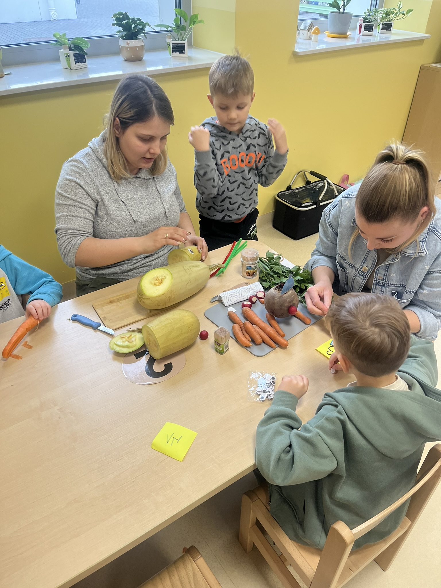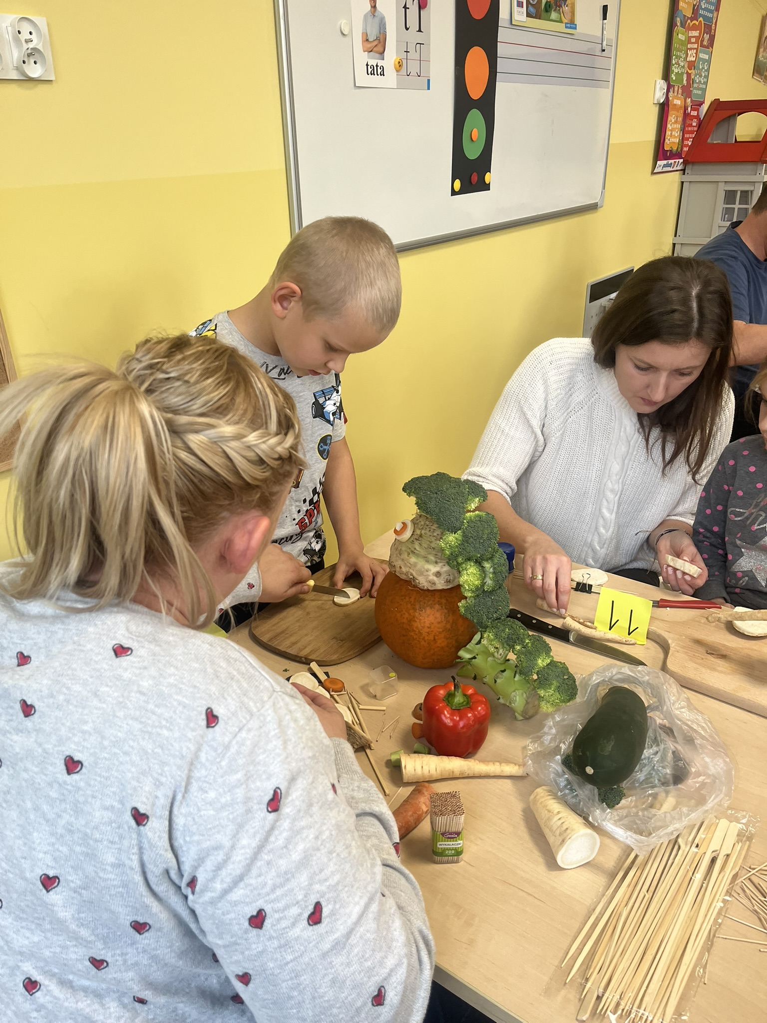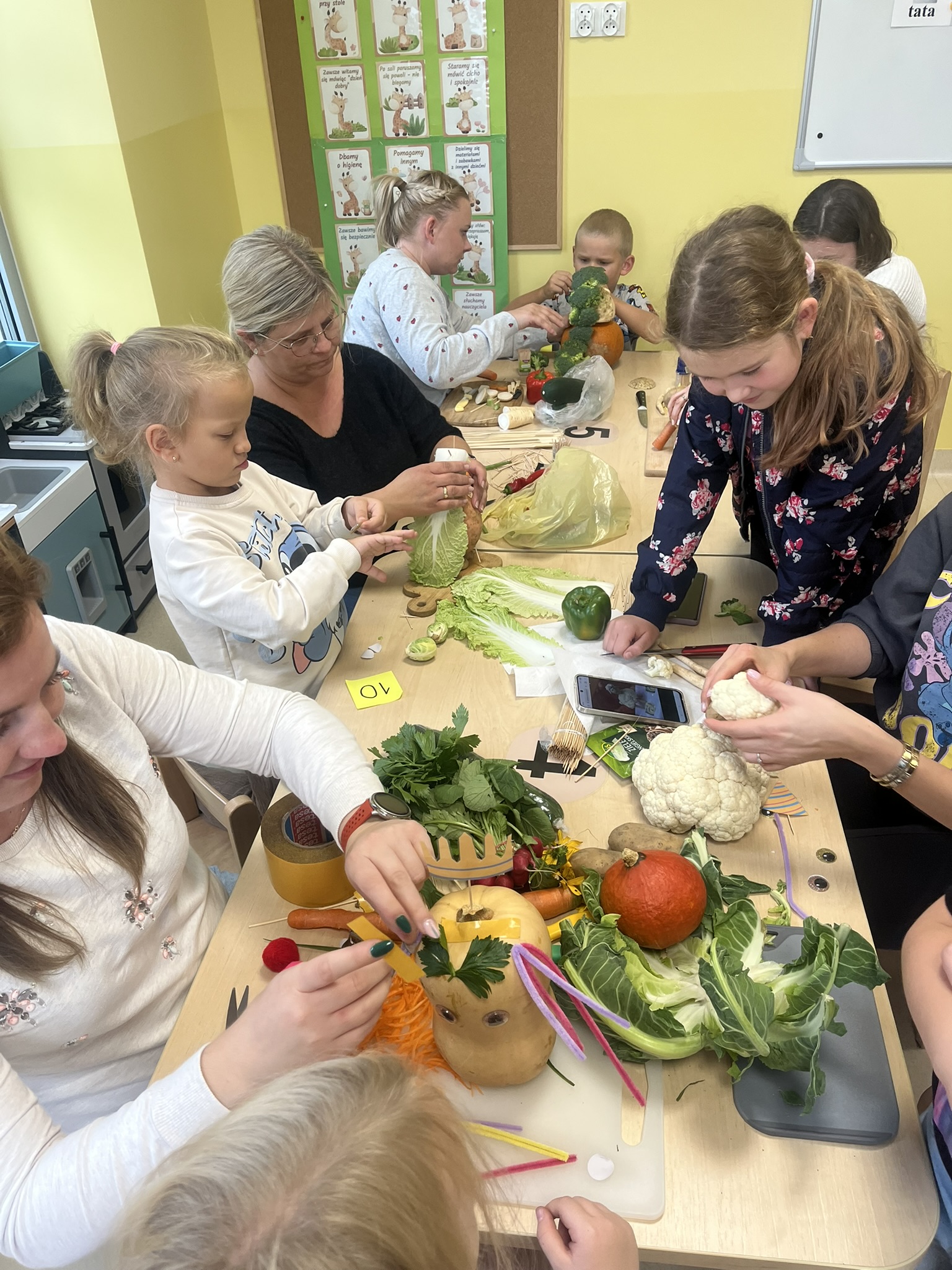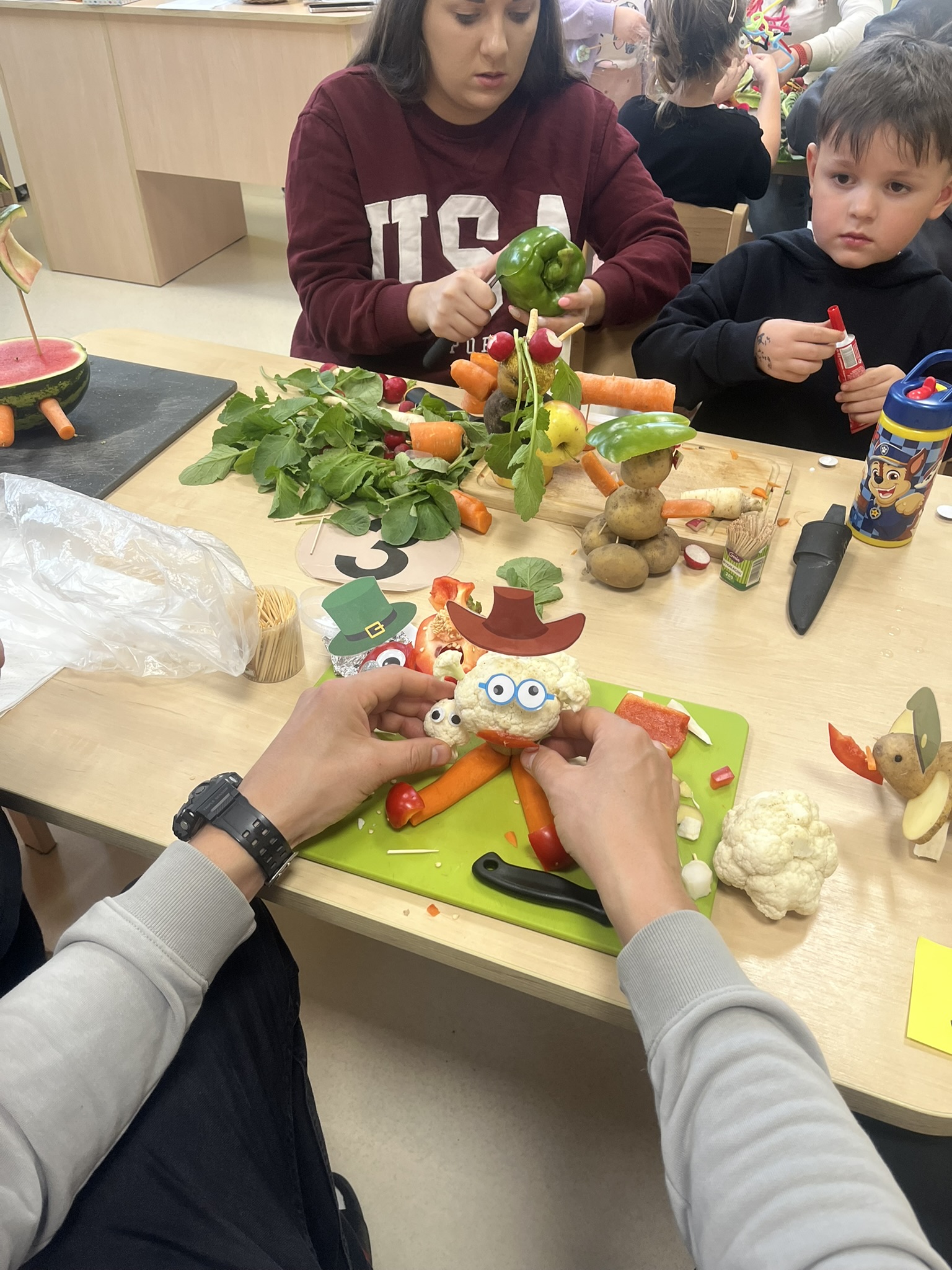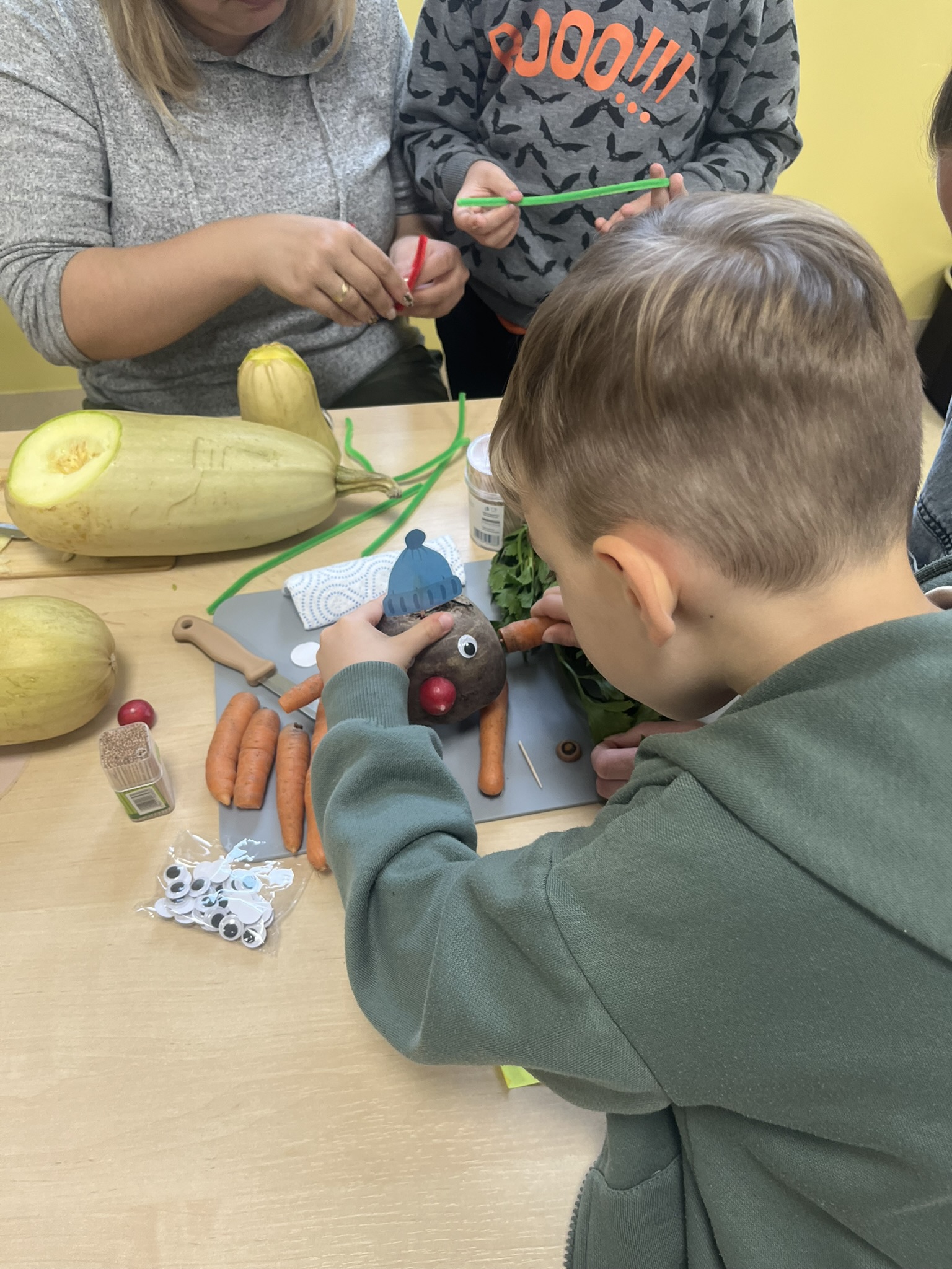 Na stołach królowały marchewki z uśmiechami, cukiniowe wieloryby, ziemniaczane potworki i kalafiorowe owce. W ruch poszły wykałaczki, ziarna, liście sałaty i mnóstwo fantazji! Nie brakowało śmiechu, a każda nowa postać budziła zachwyt i... czasem mały głód.
