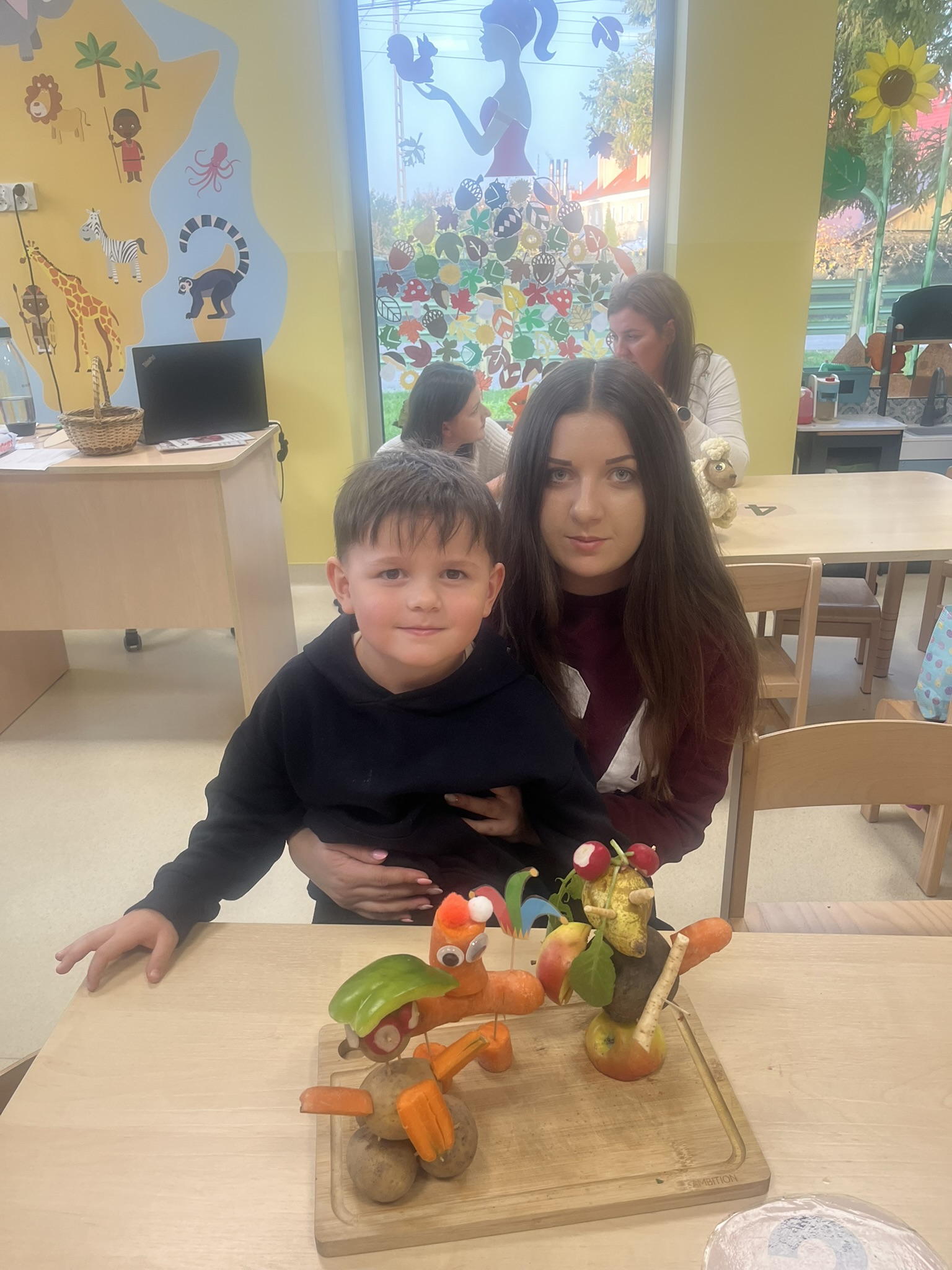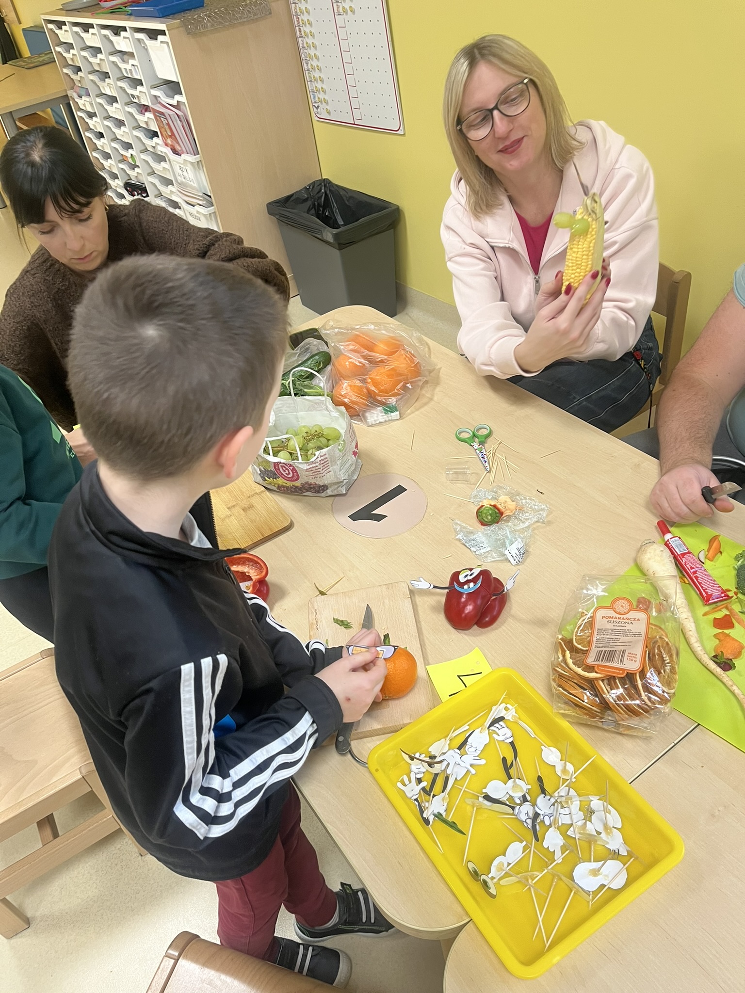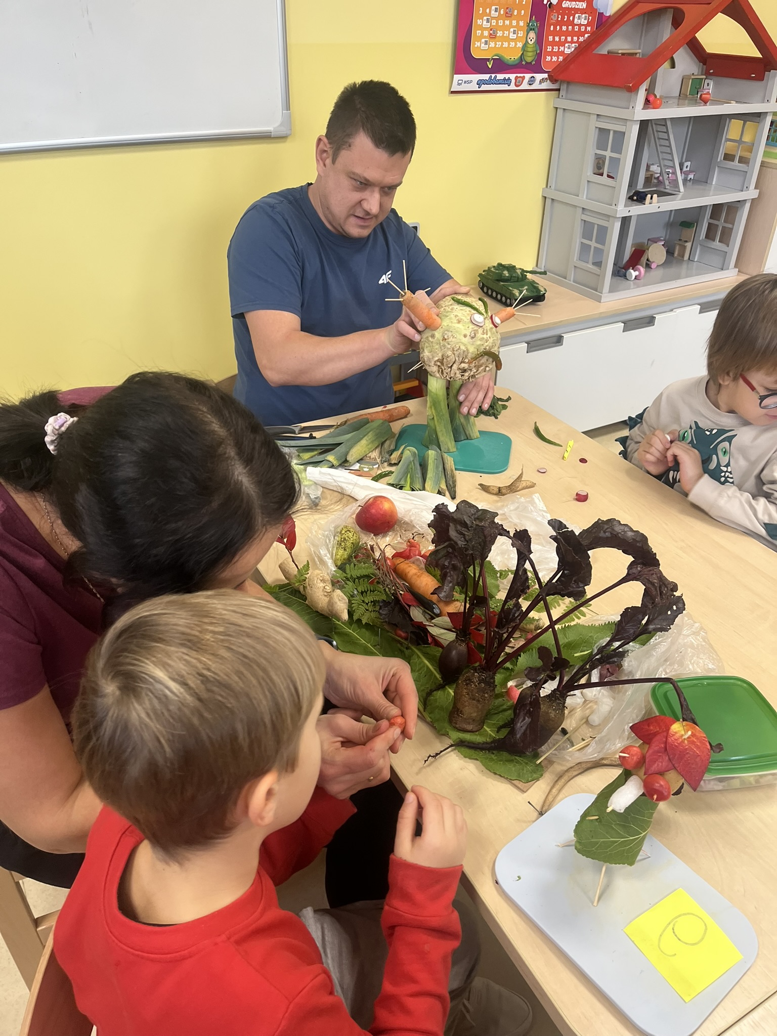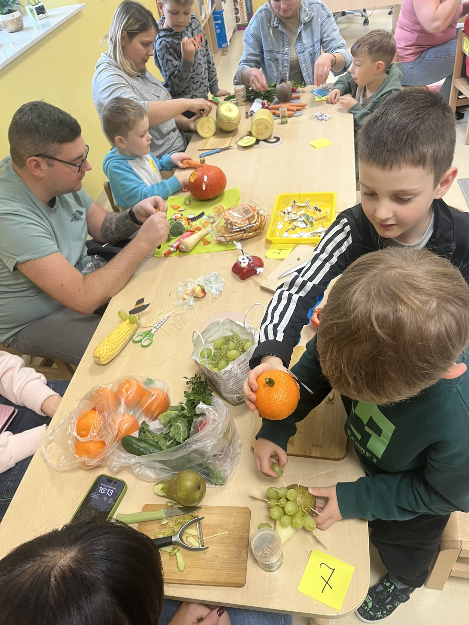 Na stołach królowały marchewki z uśmiechami, cukiniowe wieloryby, ziemniaczane potworki i kalafiorowe owce. W ruch poszły wykałaczki, ziarna, liście sałaty i mnóstwo fantazji! Nie brakowało śmiechu, a każda nowa postać budziła zachwyt i... czasem mały głód.