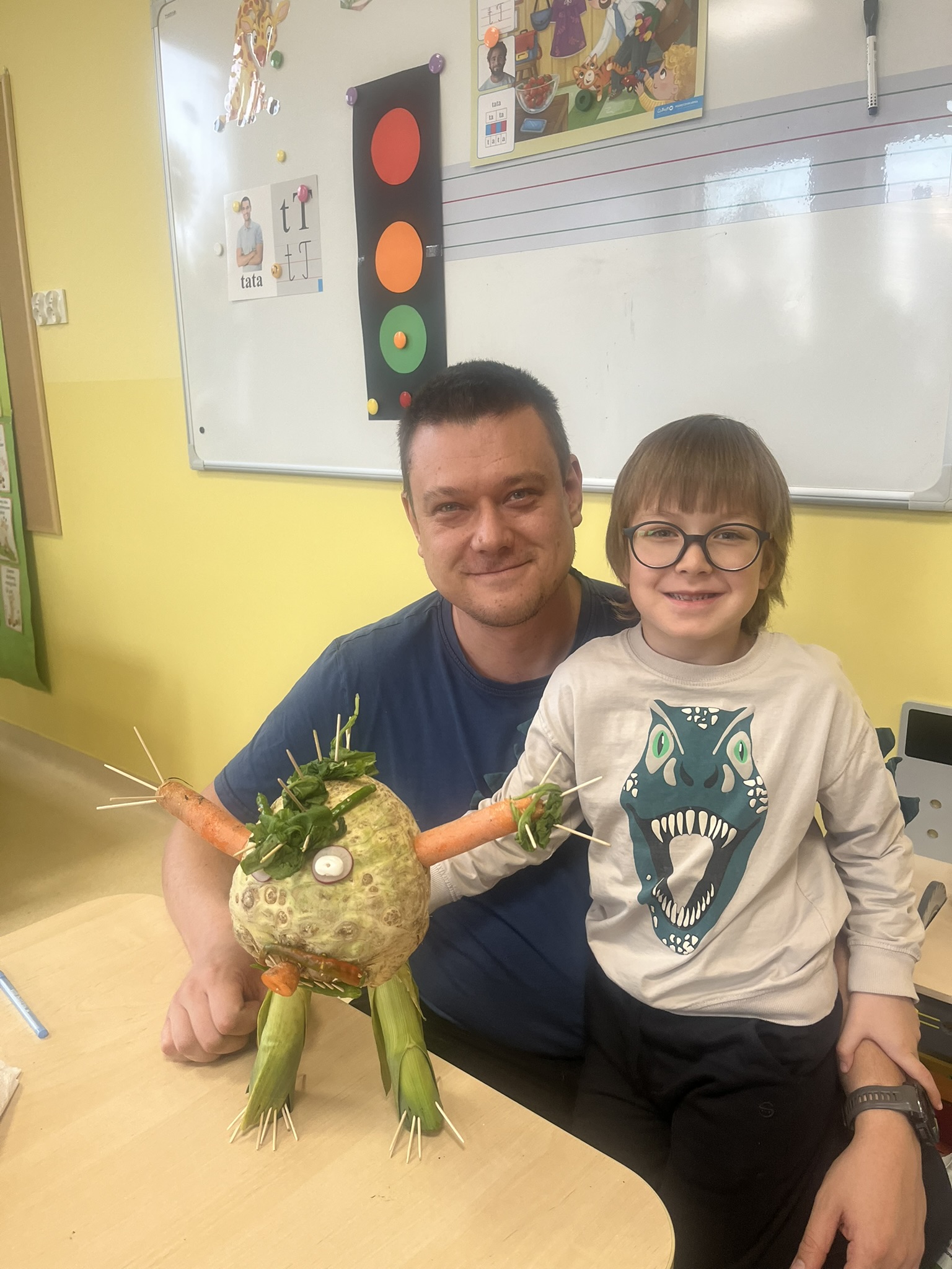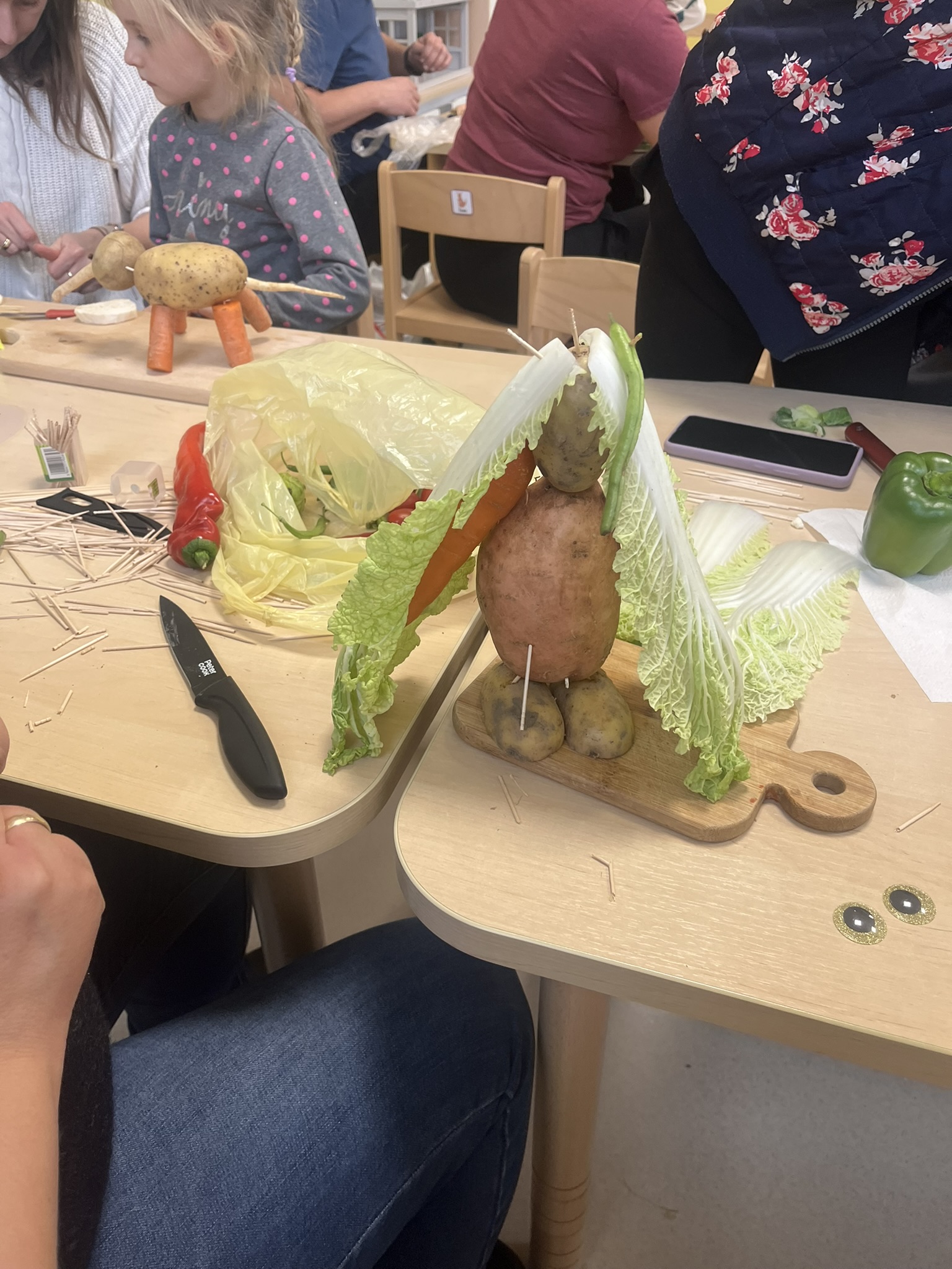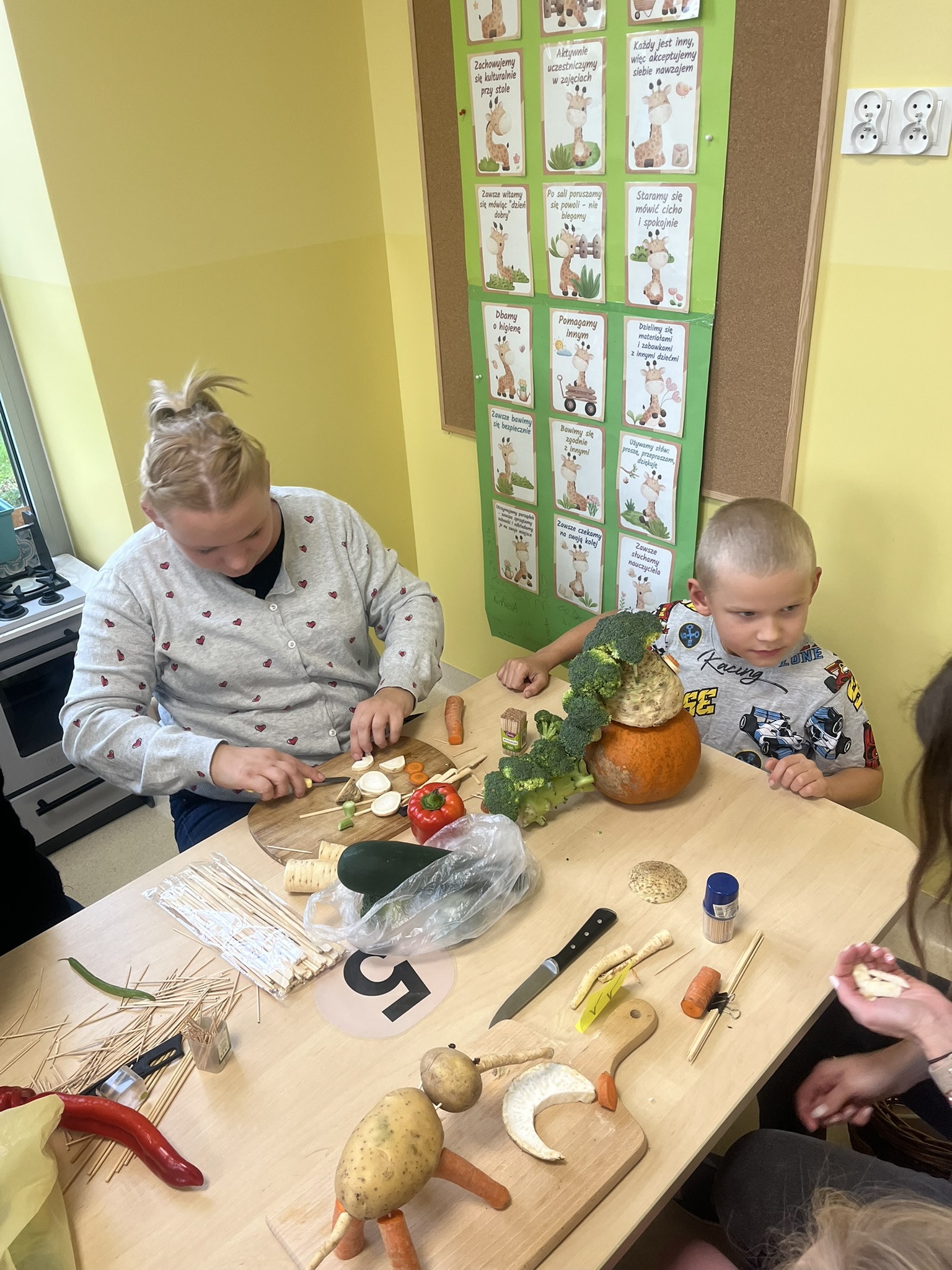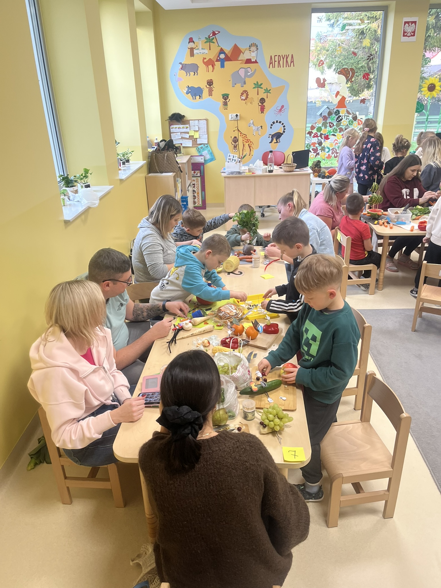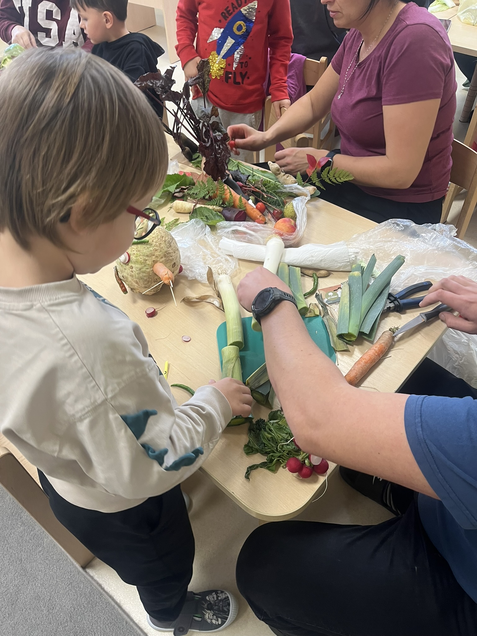 Na stołach królowały marchewki z uśmiechami, cukiniowe wieloryby, ziemniaczane potworki i kalafiorowe owce. W ruch poszły wykałaczki, ziarna, liście sałaty i mnóstwo fantazji! Nie brakowało śmiechu, a każda nowa postać budziła zachwyt i... czasem mały głód.