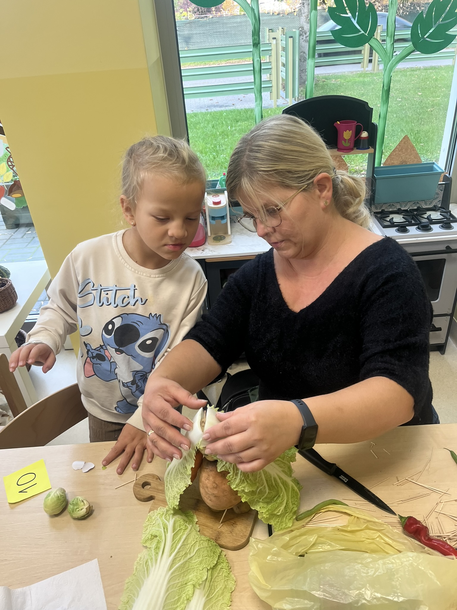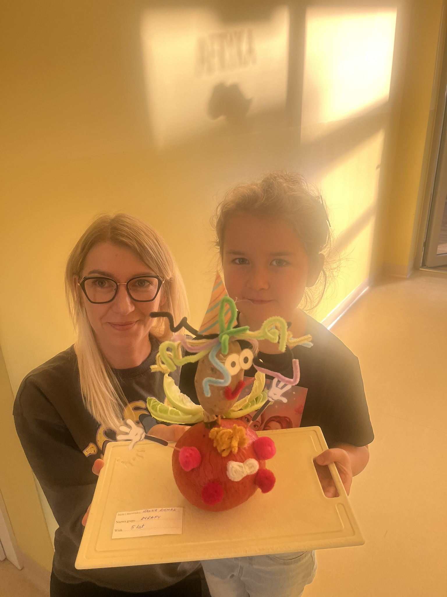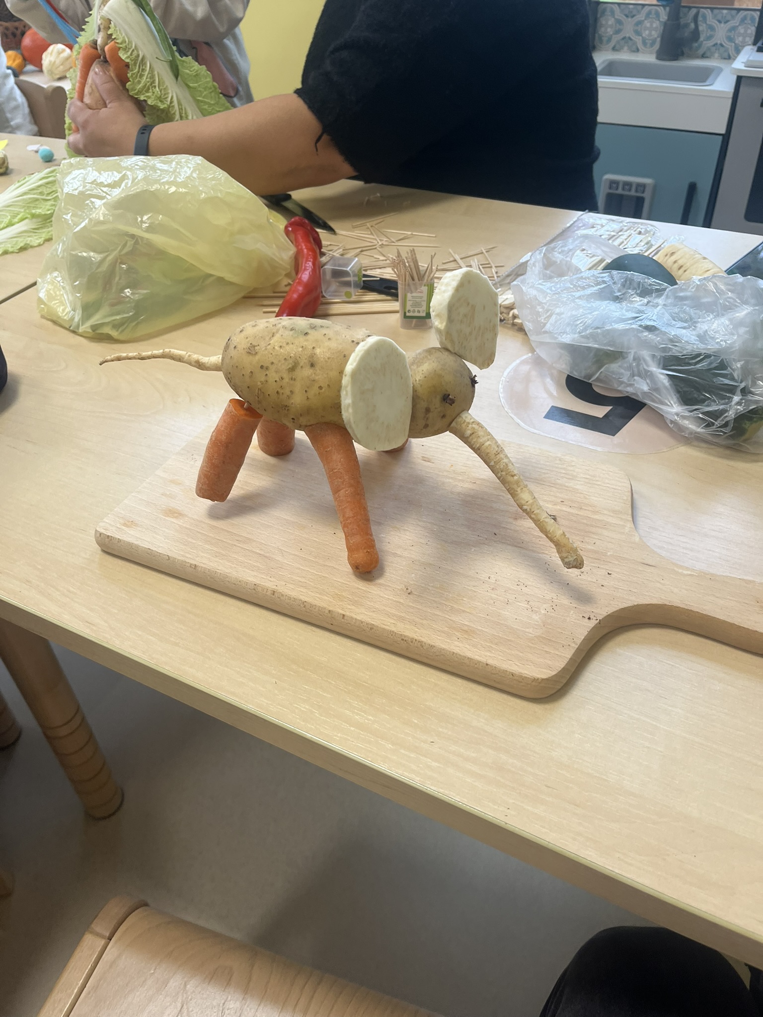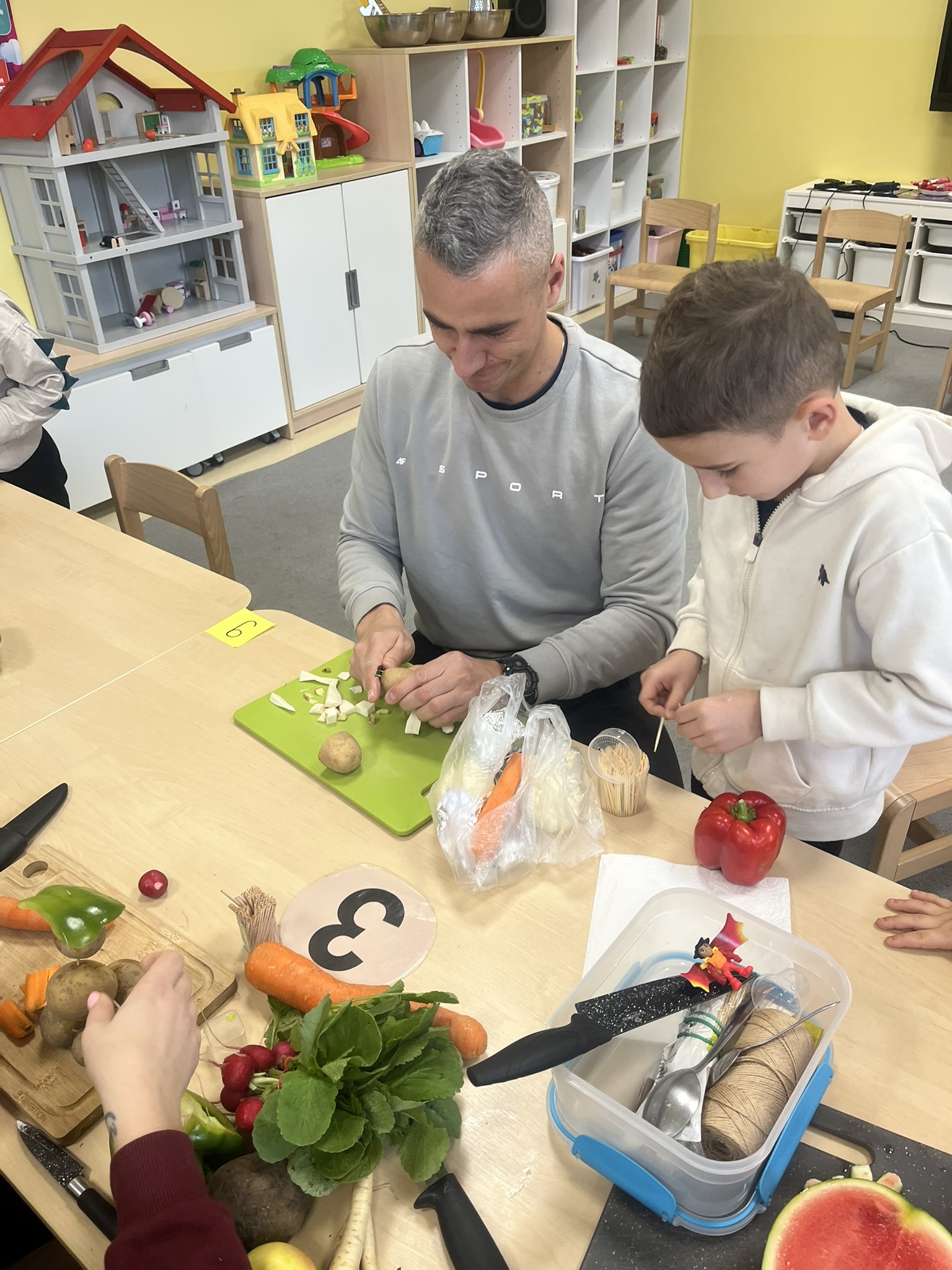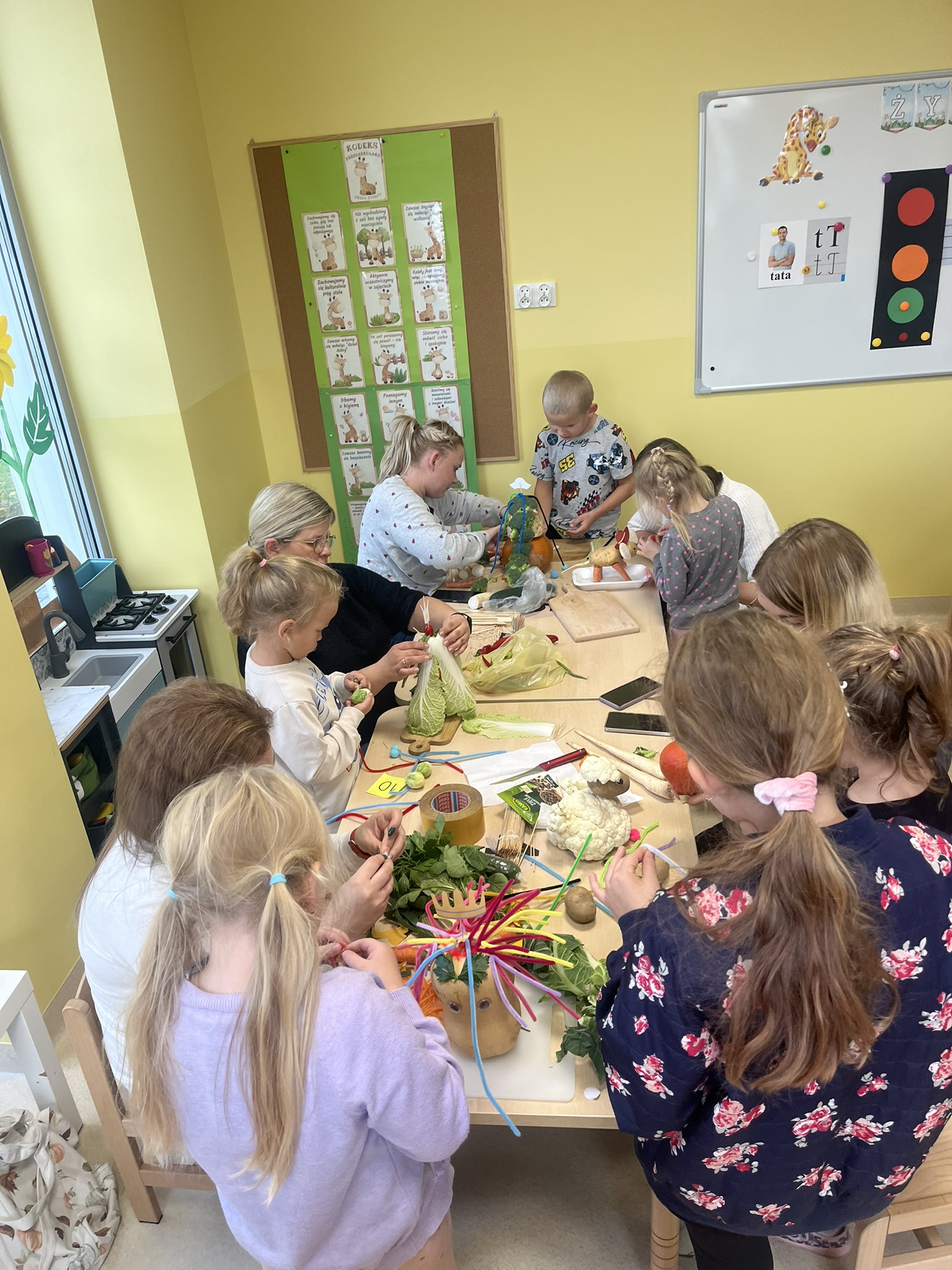 Na stołach królowały marchewki z uśmiechami, cukiniowe wieloryby, ziemniaczane potworki i kalafiorowe owce. W ruch poszły wykałaczki, ziarna, liście sałaty i mnóstwo fantazji! Nie brakowało śmiechu, a każda nowa postać budziła zachwyt i... czasem mały głód.