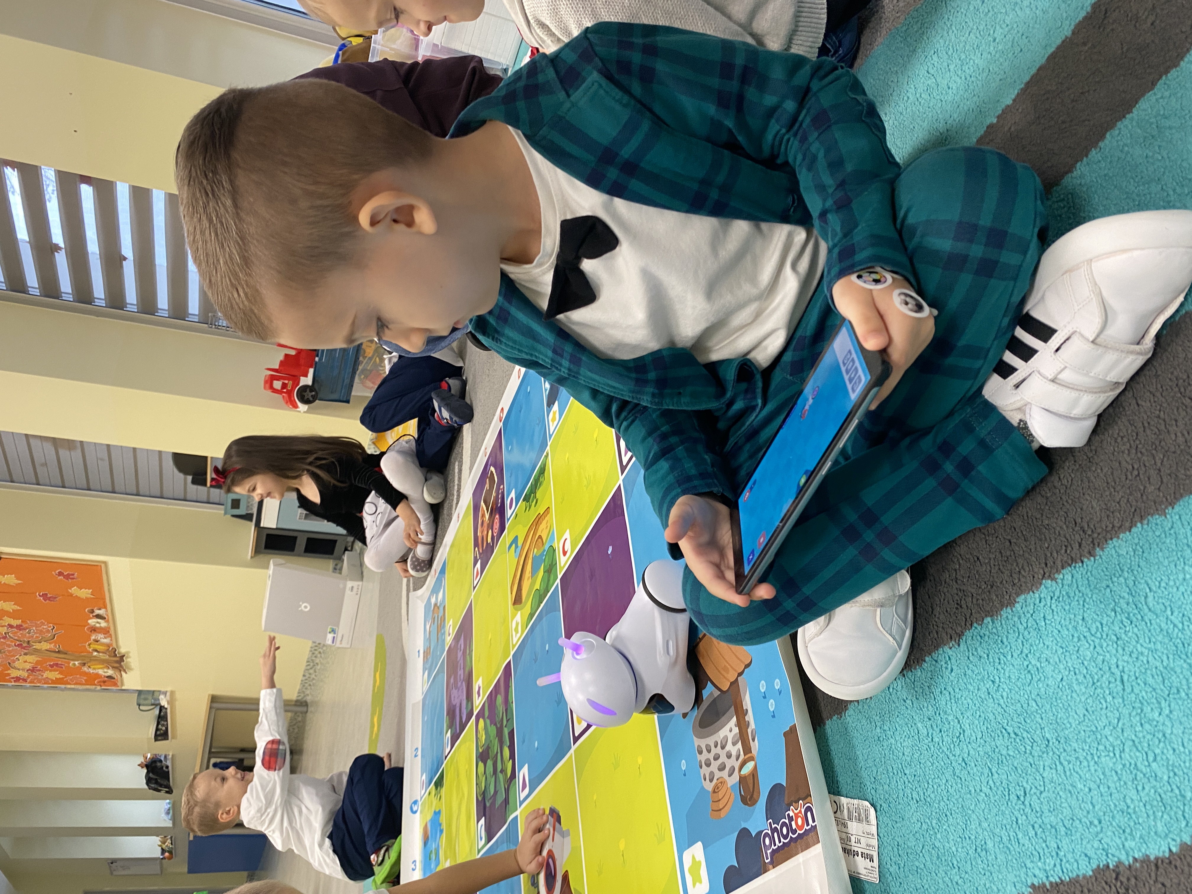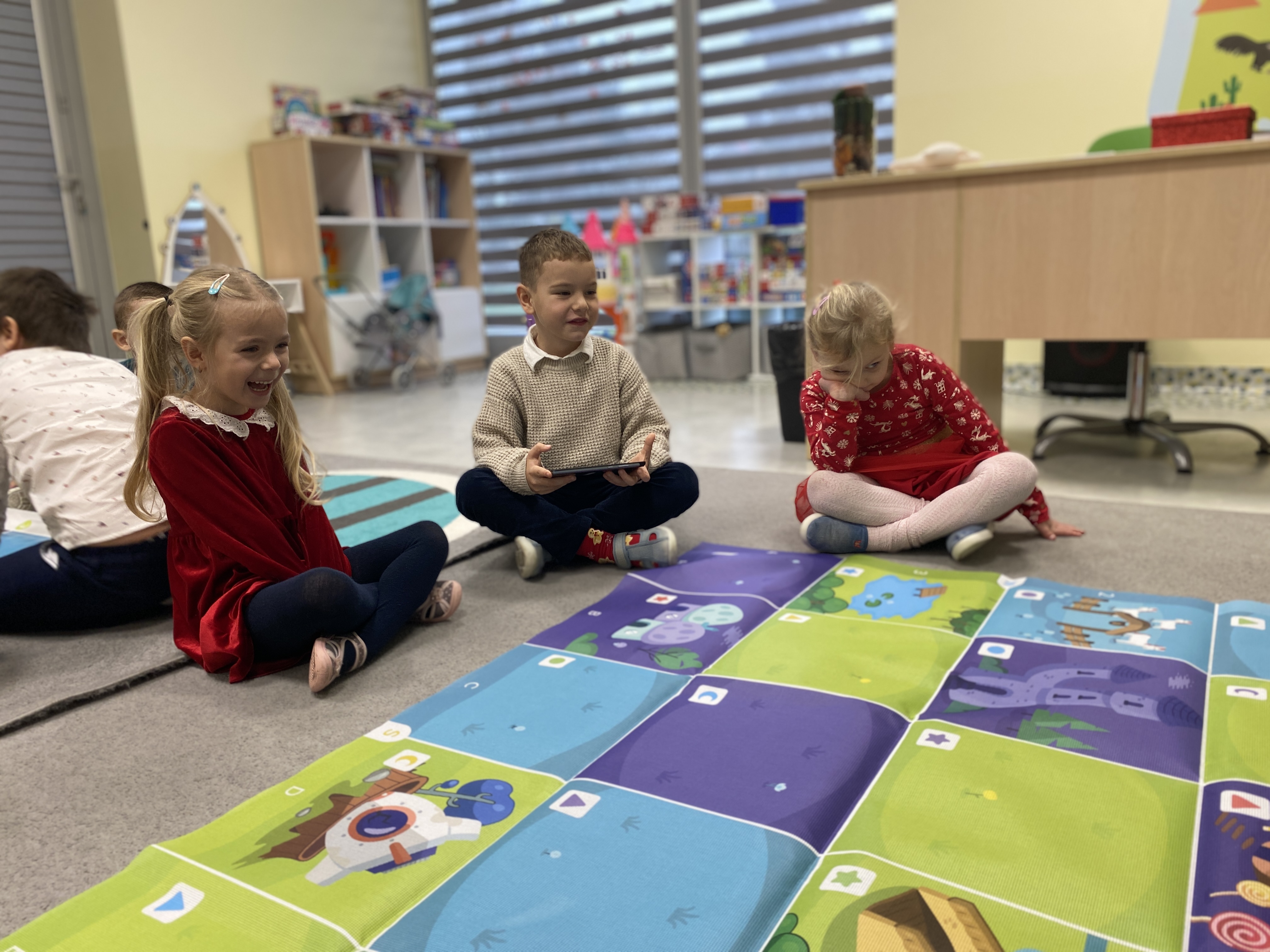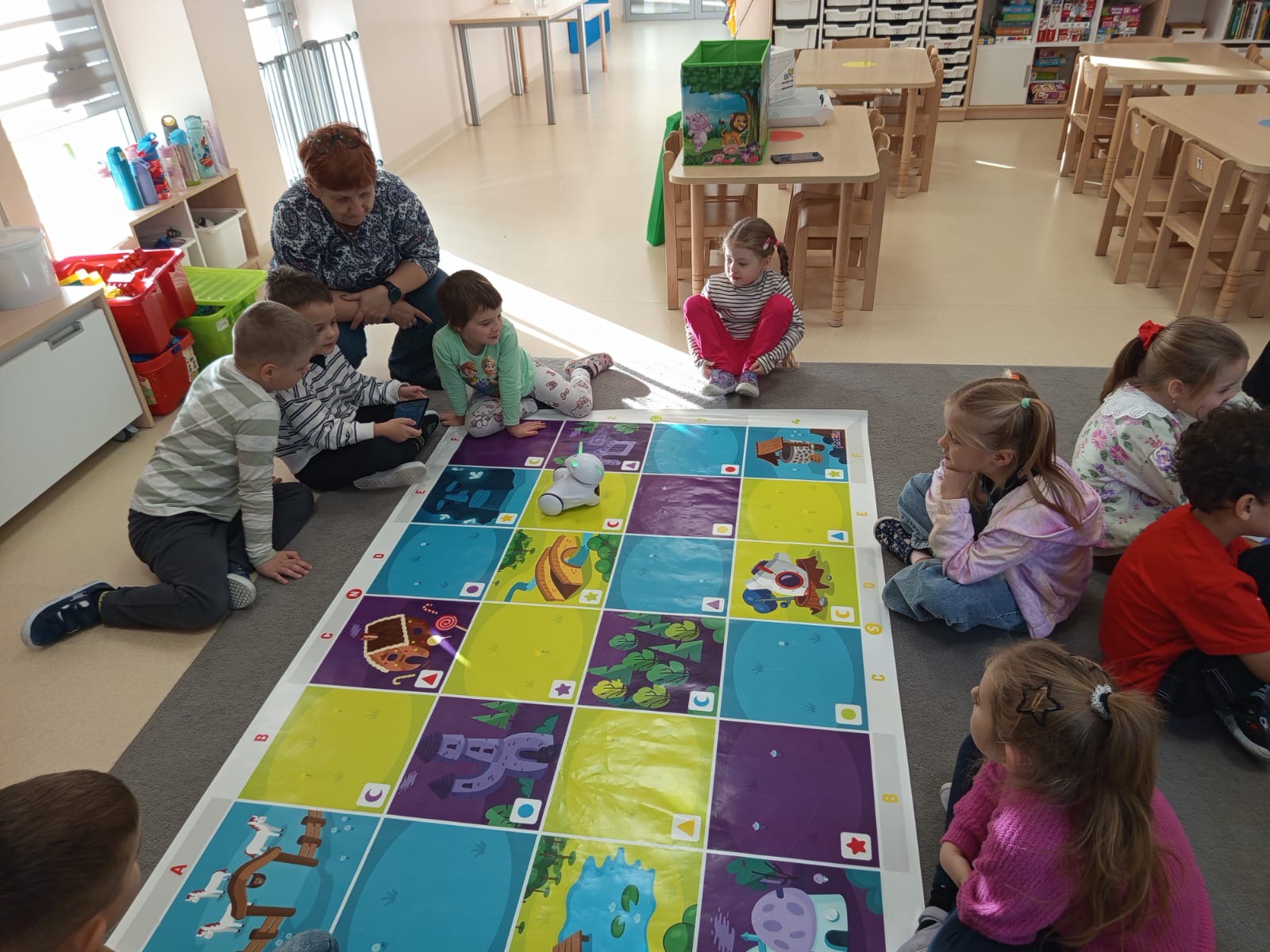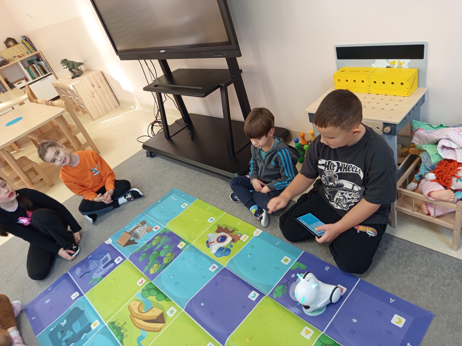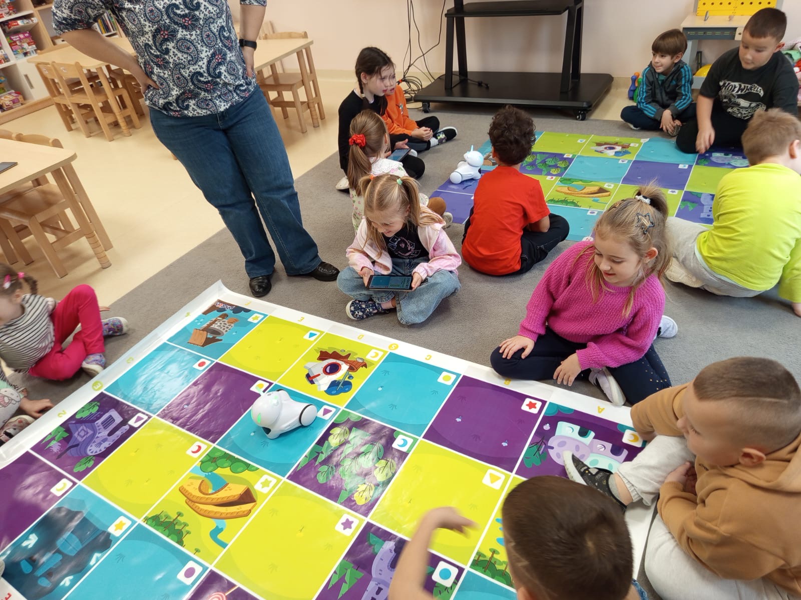 Podczas zajęć przedszkolaki pracowały na specjalnych matach edukacyjnych, gdzie przeliczały pola oraz wyznaczały trasy dla poznanych wcześniej robotów Photonów. Jednym z zadań było również zaplanowanie drogi prowadzącej do kolegów