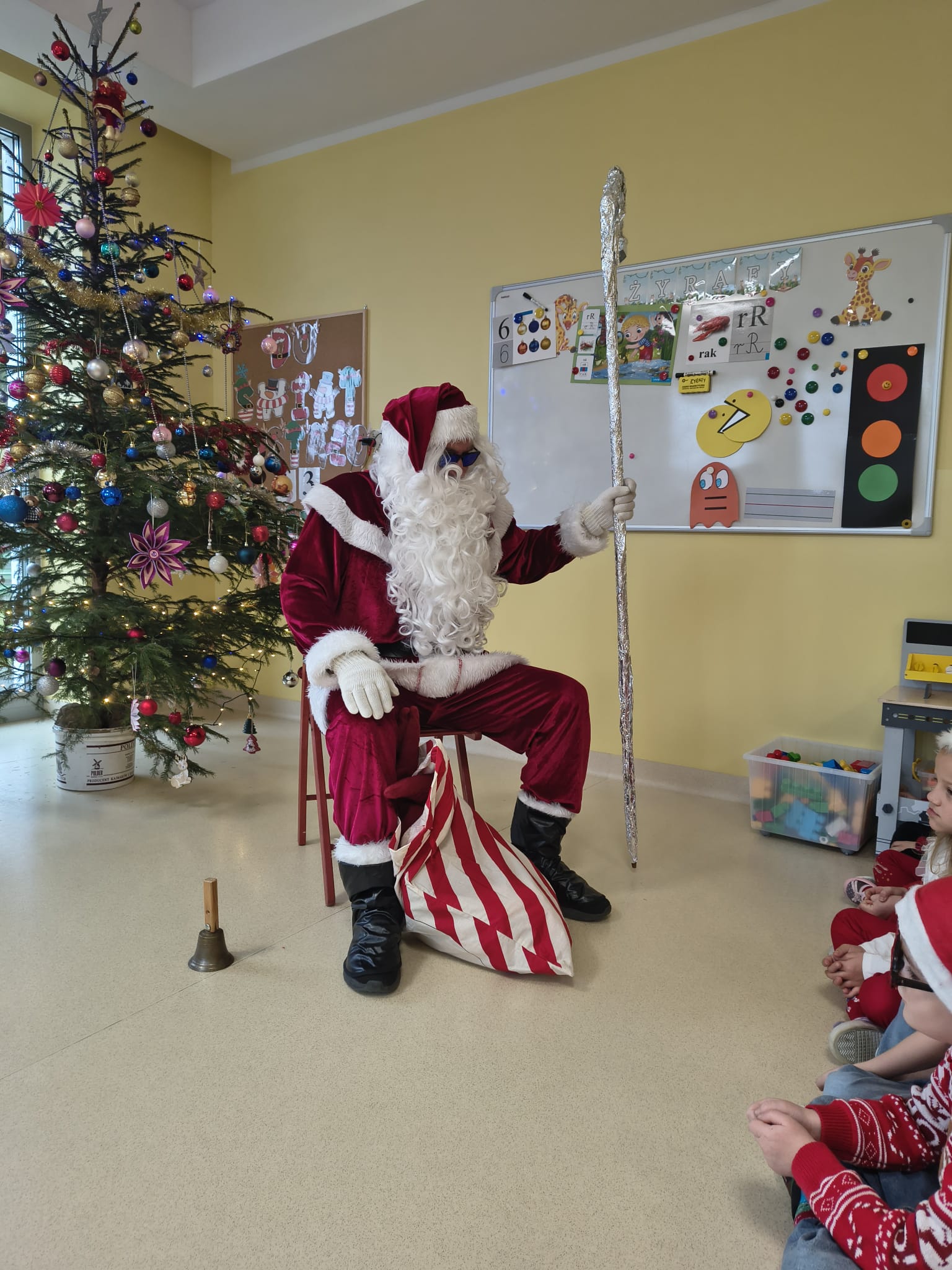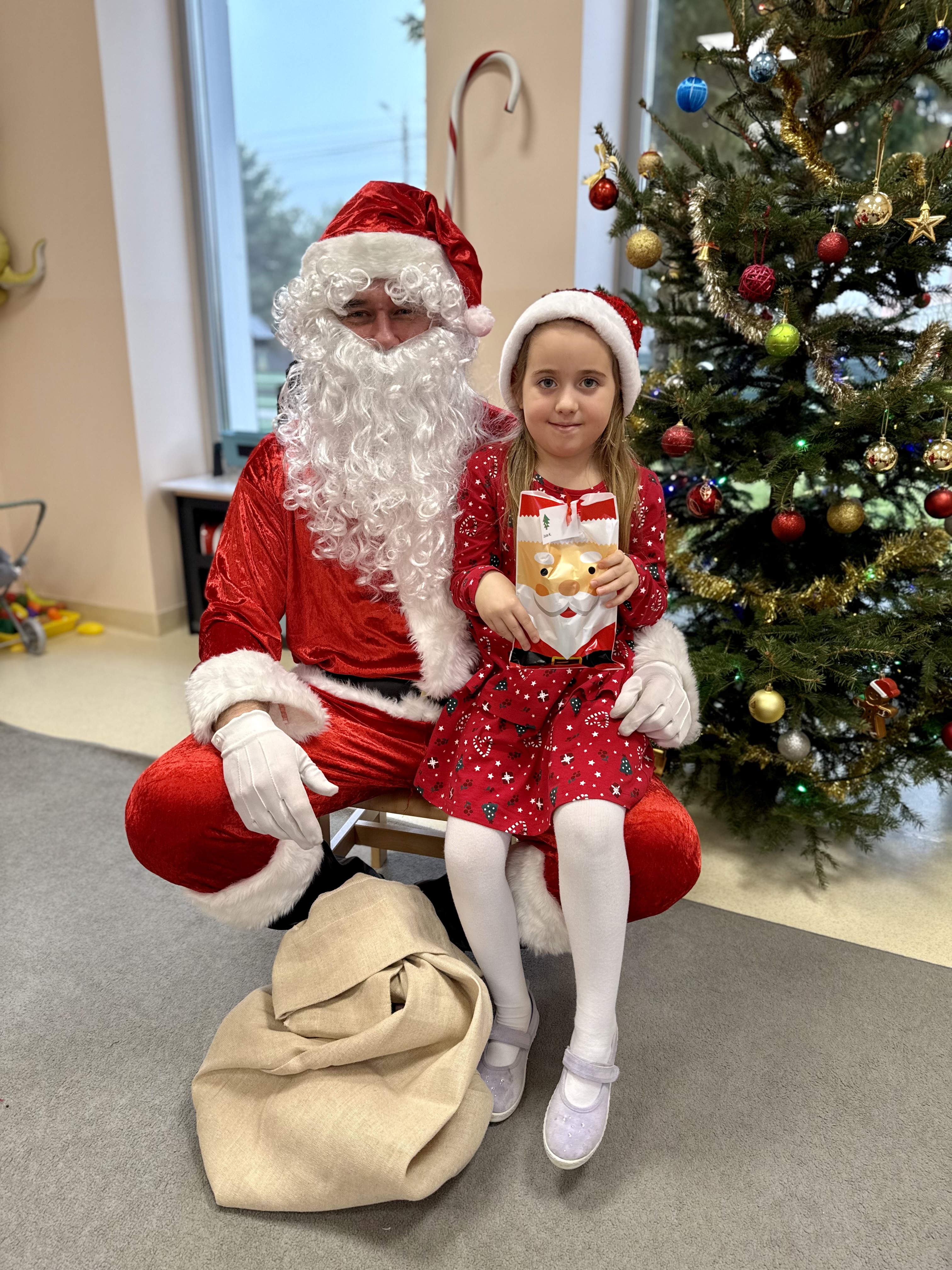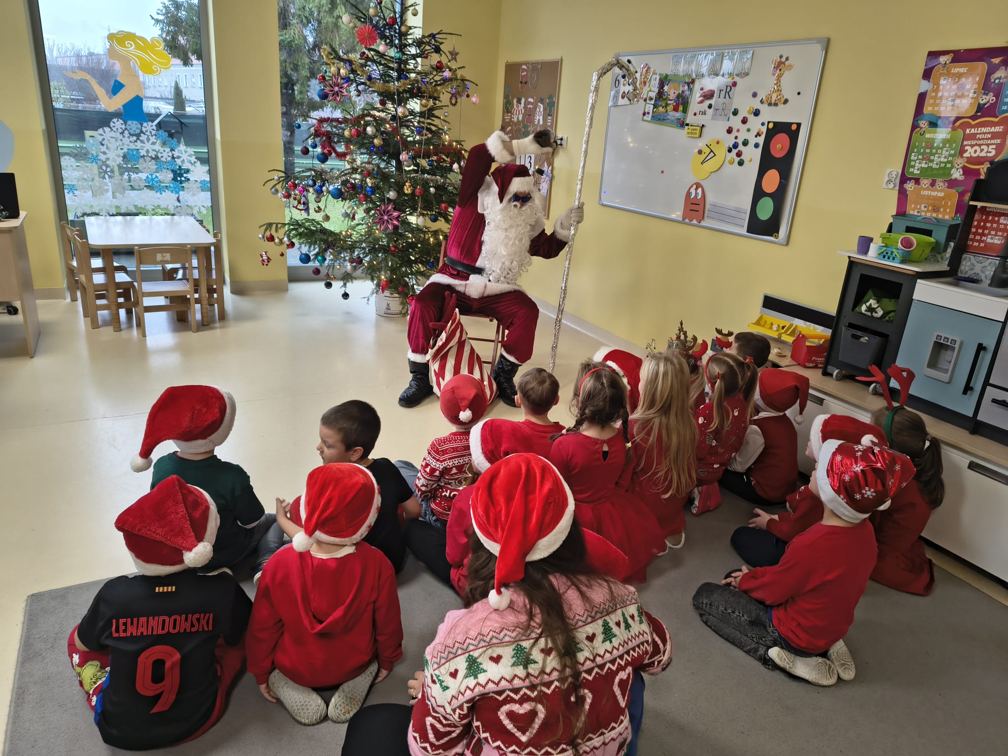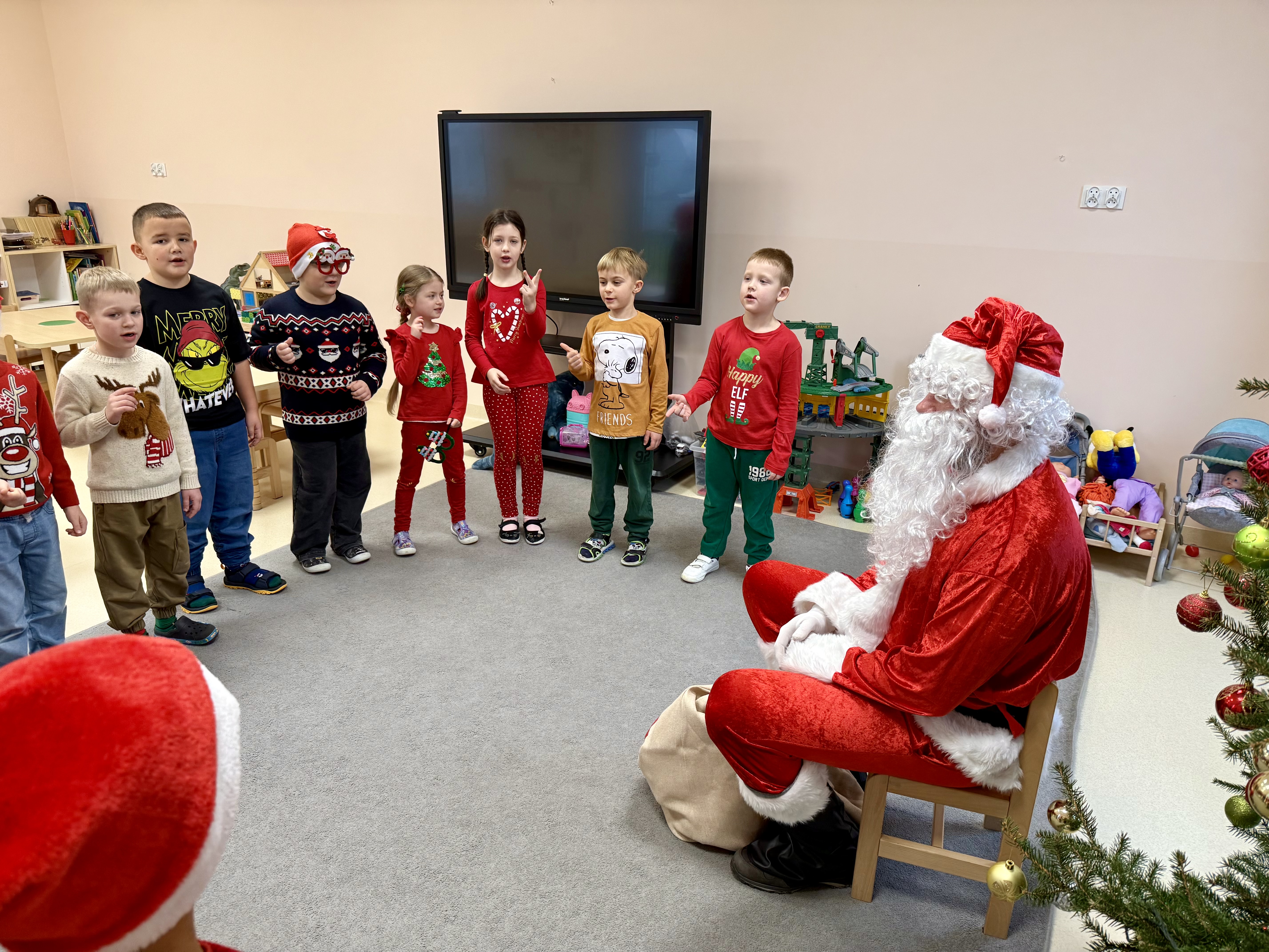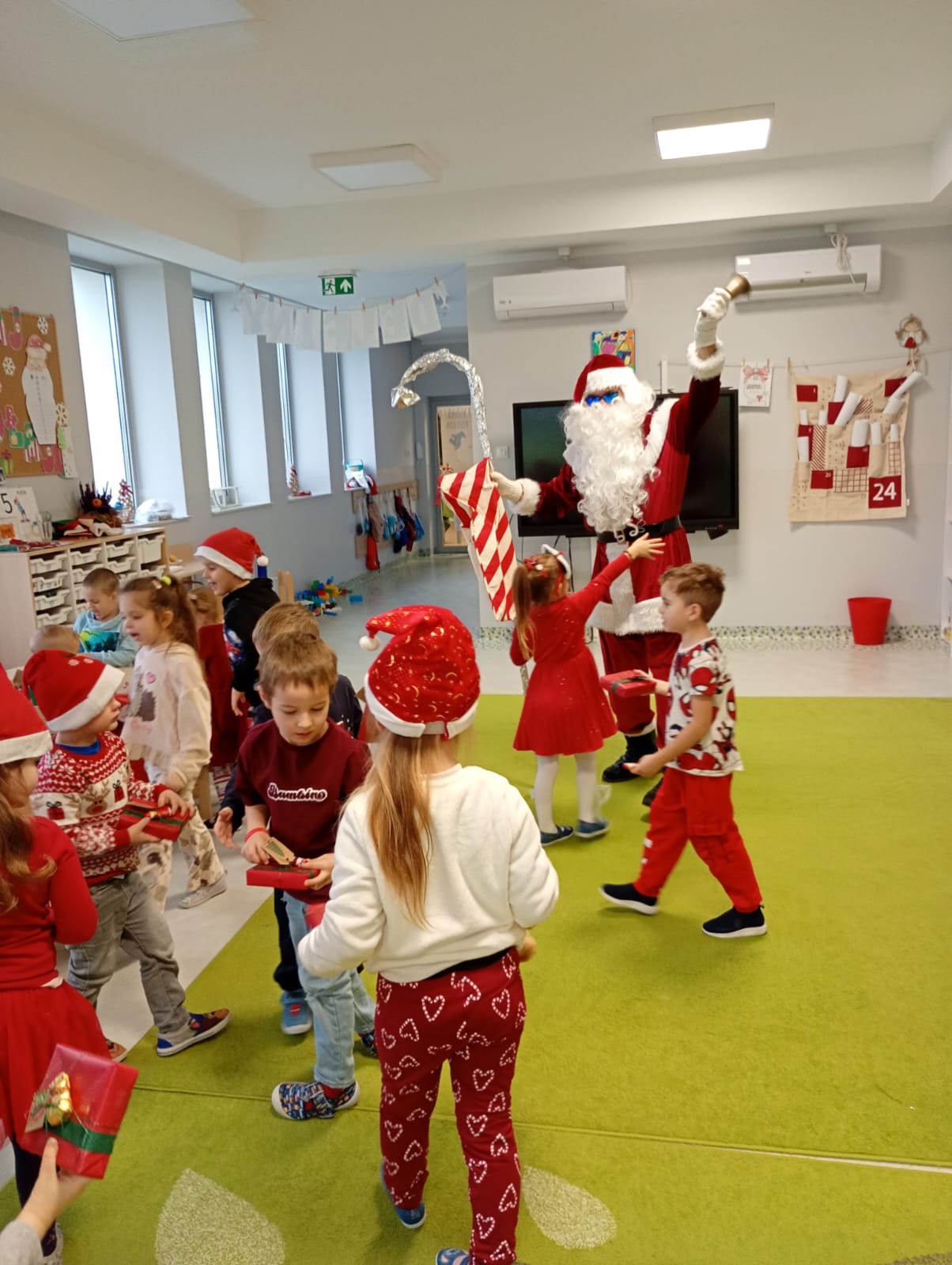 Za oknami delikatnie wirowały płatki śniegu, a w salach słychać było ciche rozmowy dzieci zastanawiających się, czy dziś pojawi się ten wyjątkowy gość. I nagle — jak w bajce — rozbrzmiał dźwięk dzwoneczków.