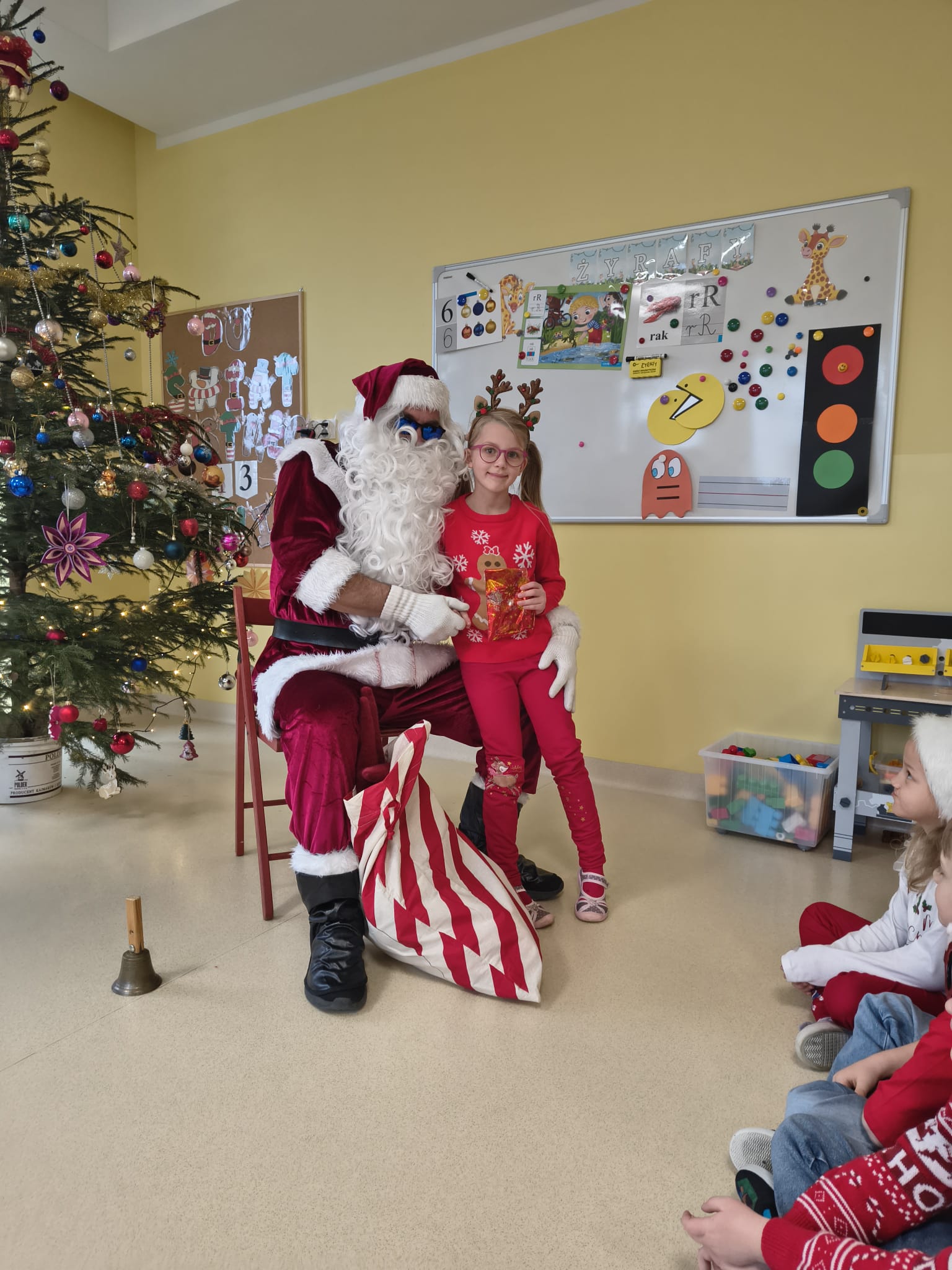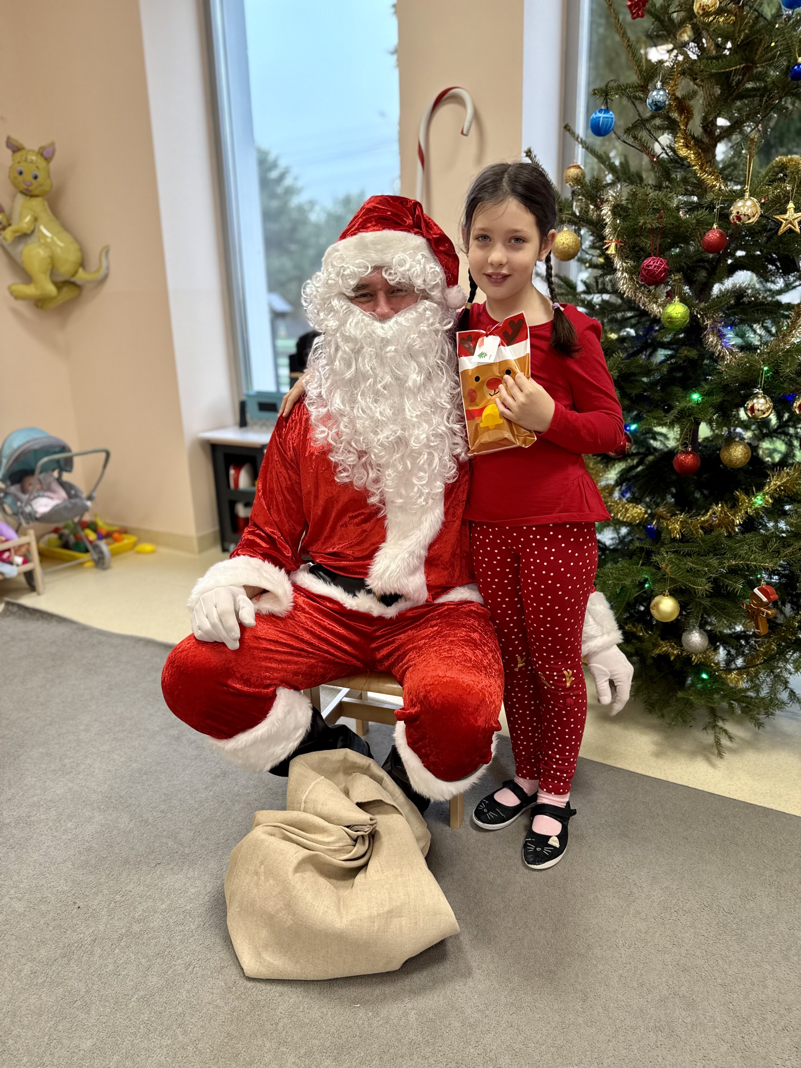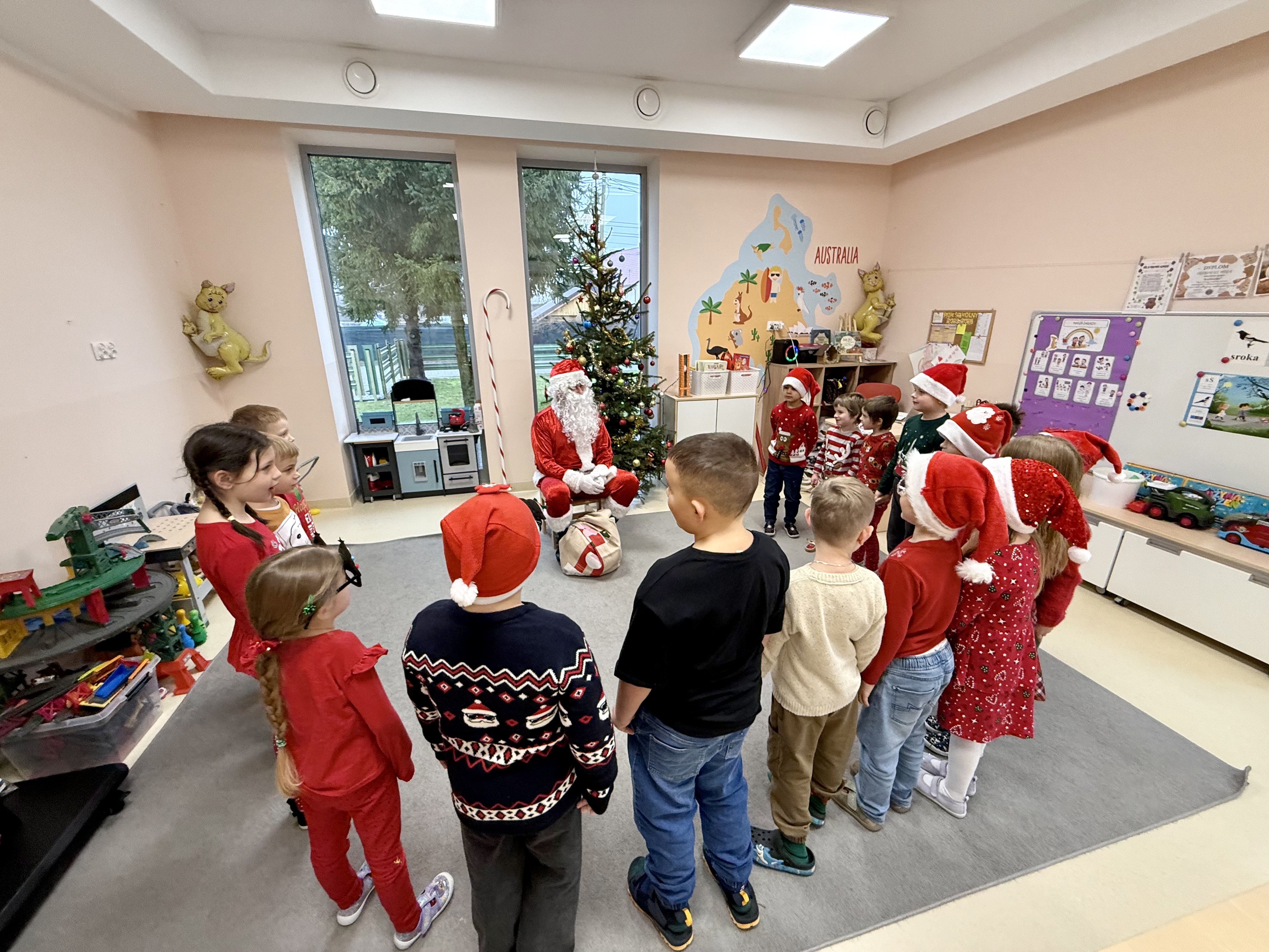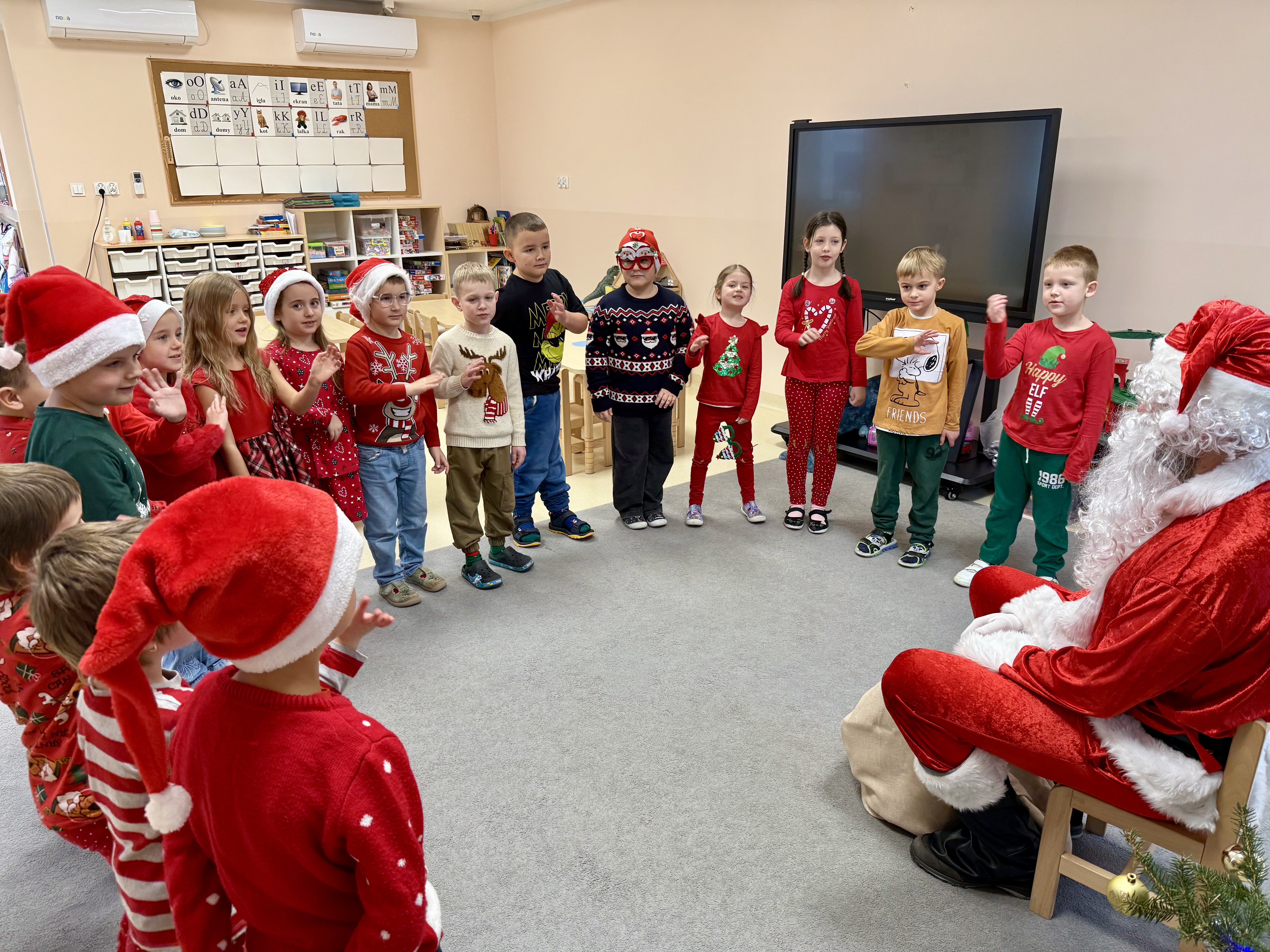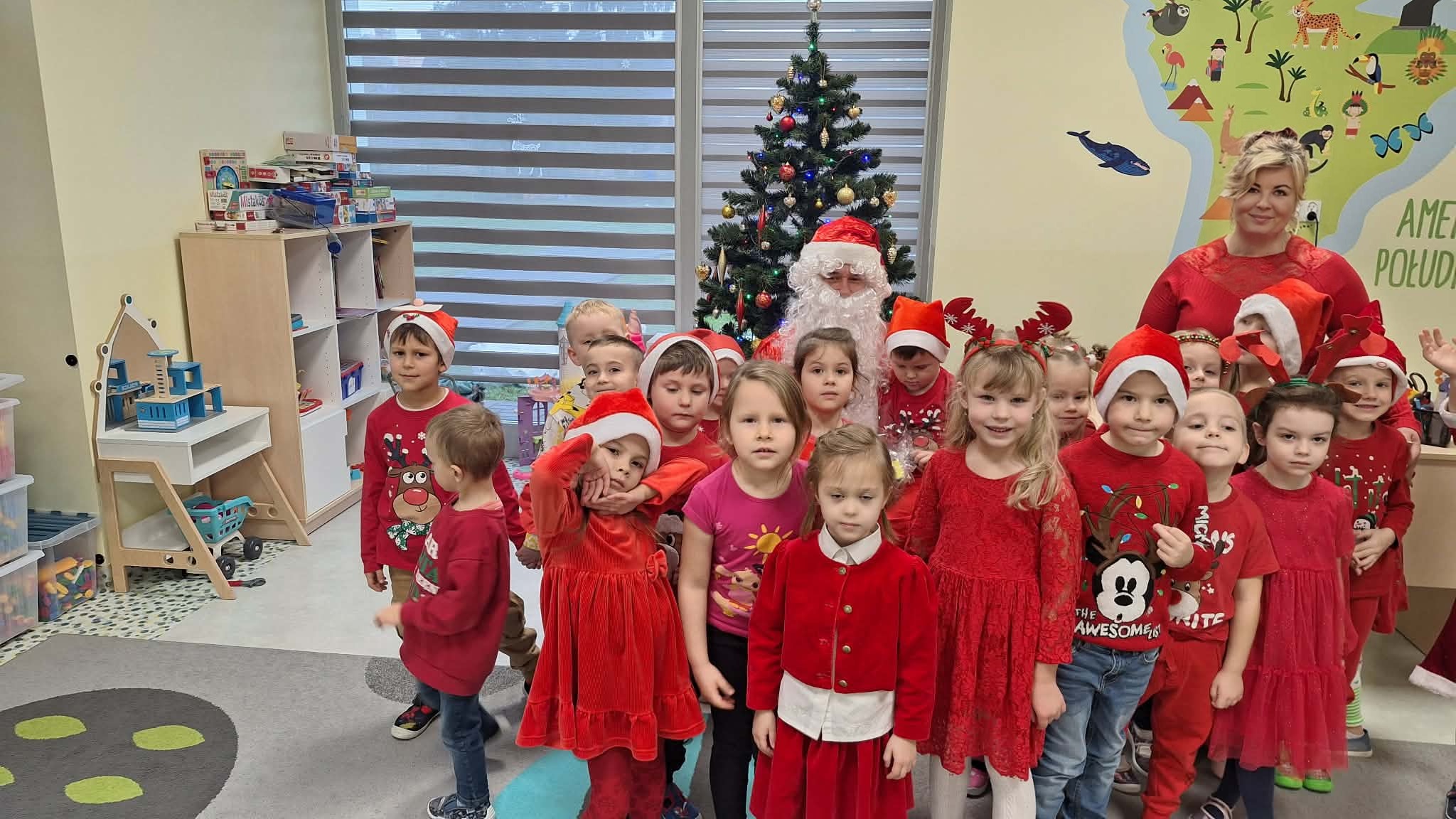 Za oknami delikatnie wirowały płatki śniegu, a w salach słychać było ciche rozmowy dzieci zastanawiających się, czy dziś pojawi się ten wyjątkowy gość. I nagle — jak w bajce — rozbrzmiał dźwięk dzwoneczków.