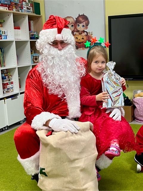 Po występach nadszedł długo wyczekiwany moment wręczania prezentów. Na twarzach dzieci pojawiły się szerokie uśmiechy, a w oczach błyszczała czysta, nieudawana radość. Te wyjątkowe chwile zostały uwiecznione na zdjęciach, które będą pamiątką wspólnego, grudniowego świętowania. Tego dnia nasze przedszkole stało się miejscem pełnym światła, serdeczności i magii.