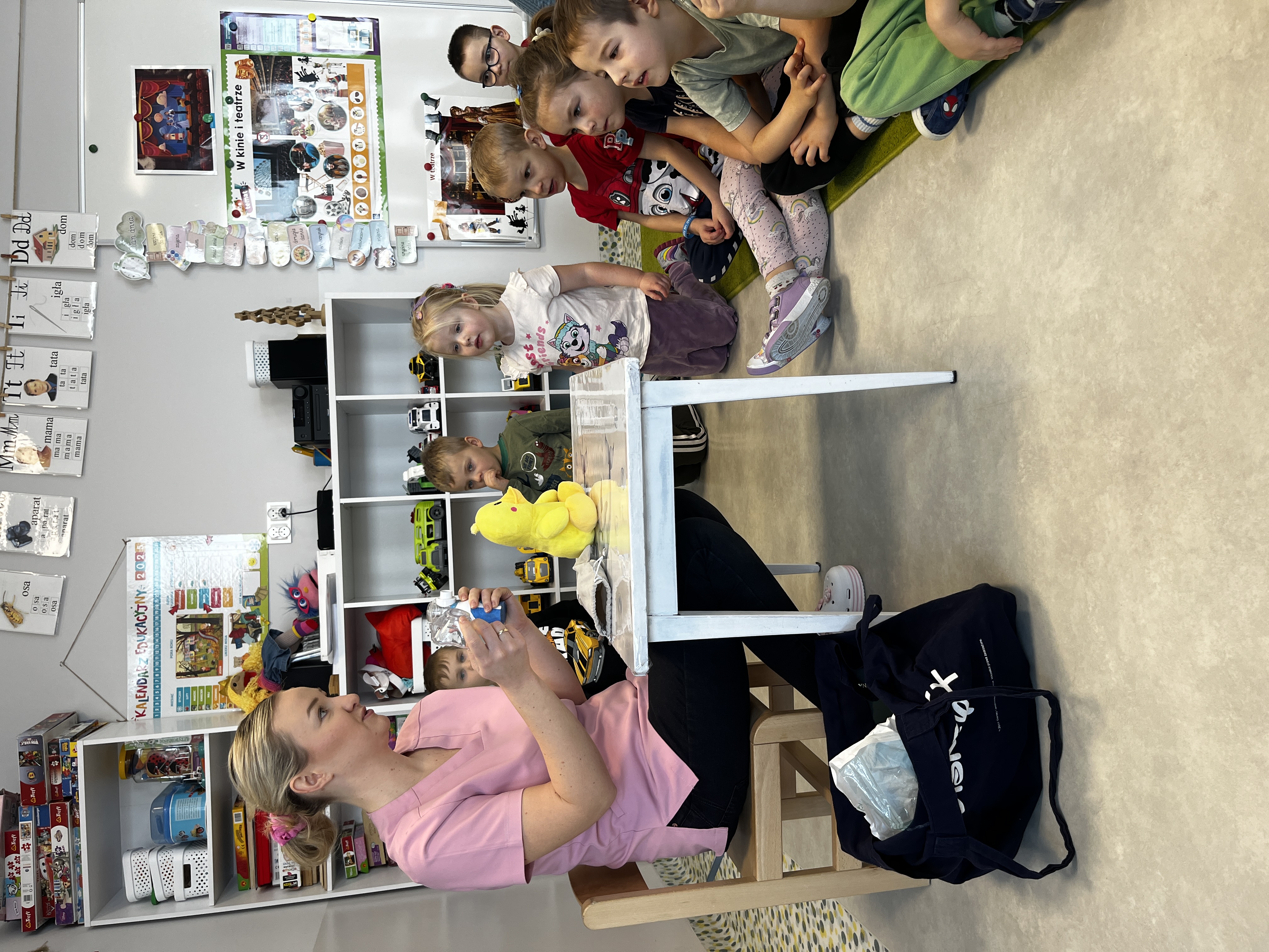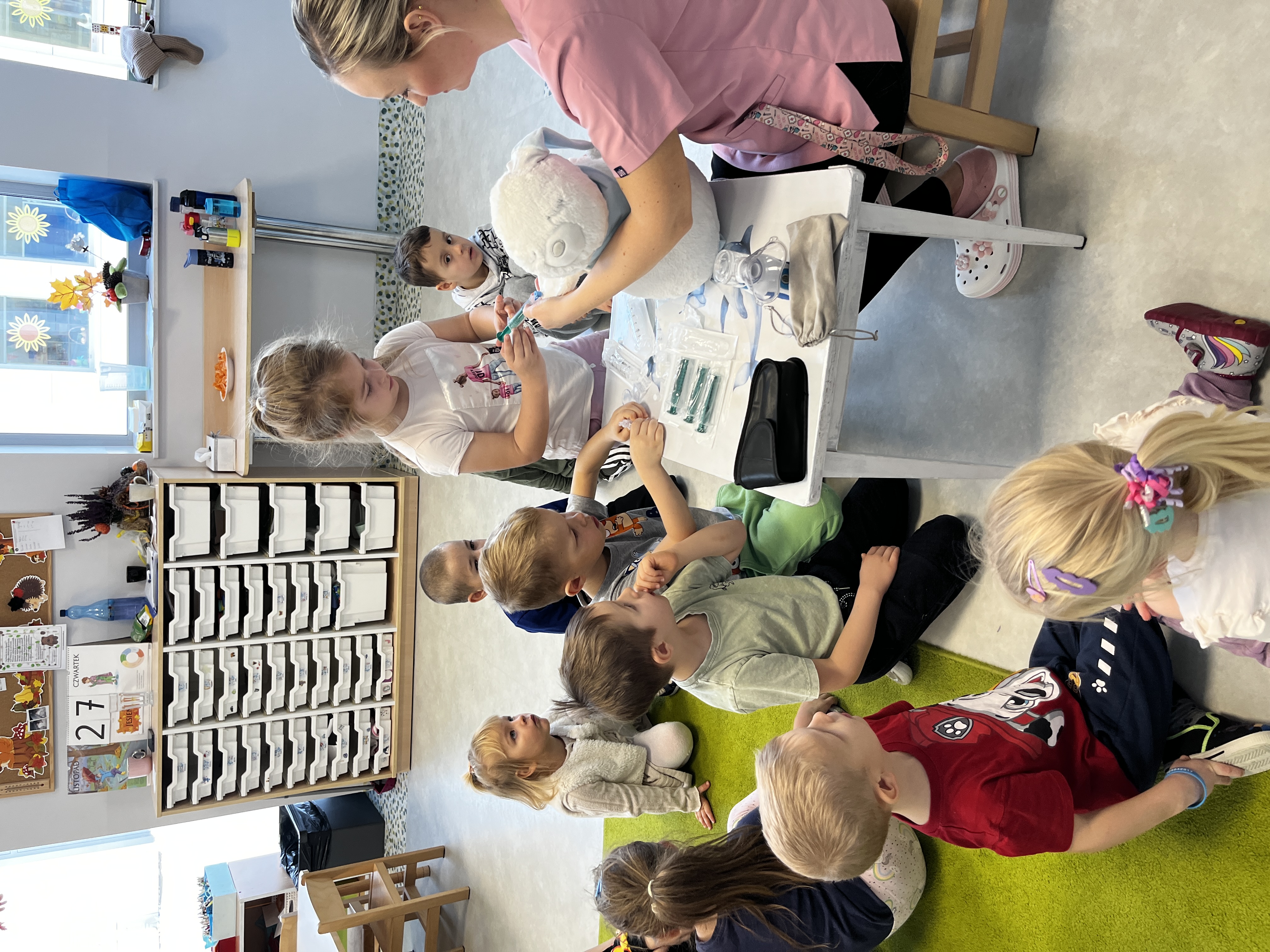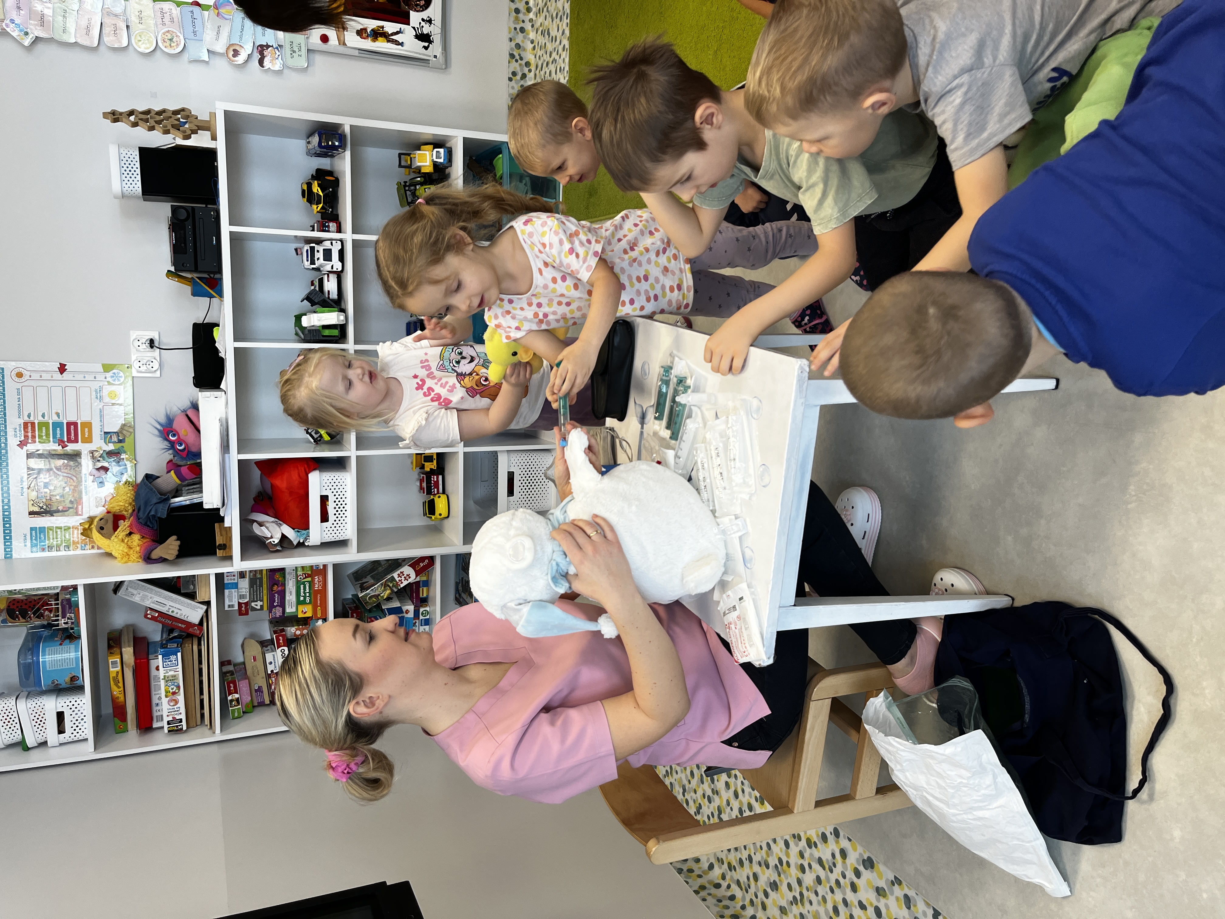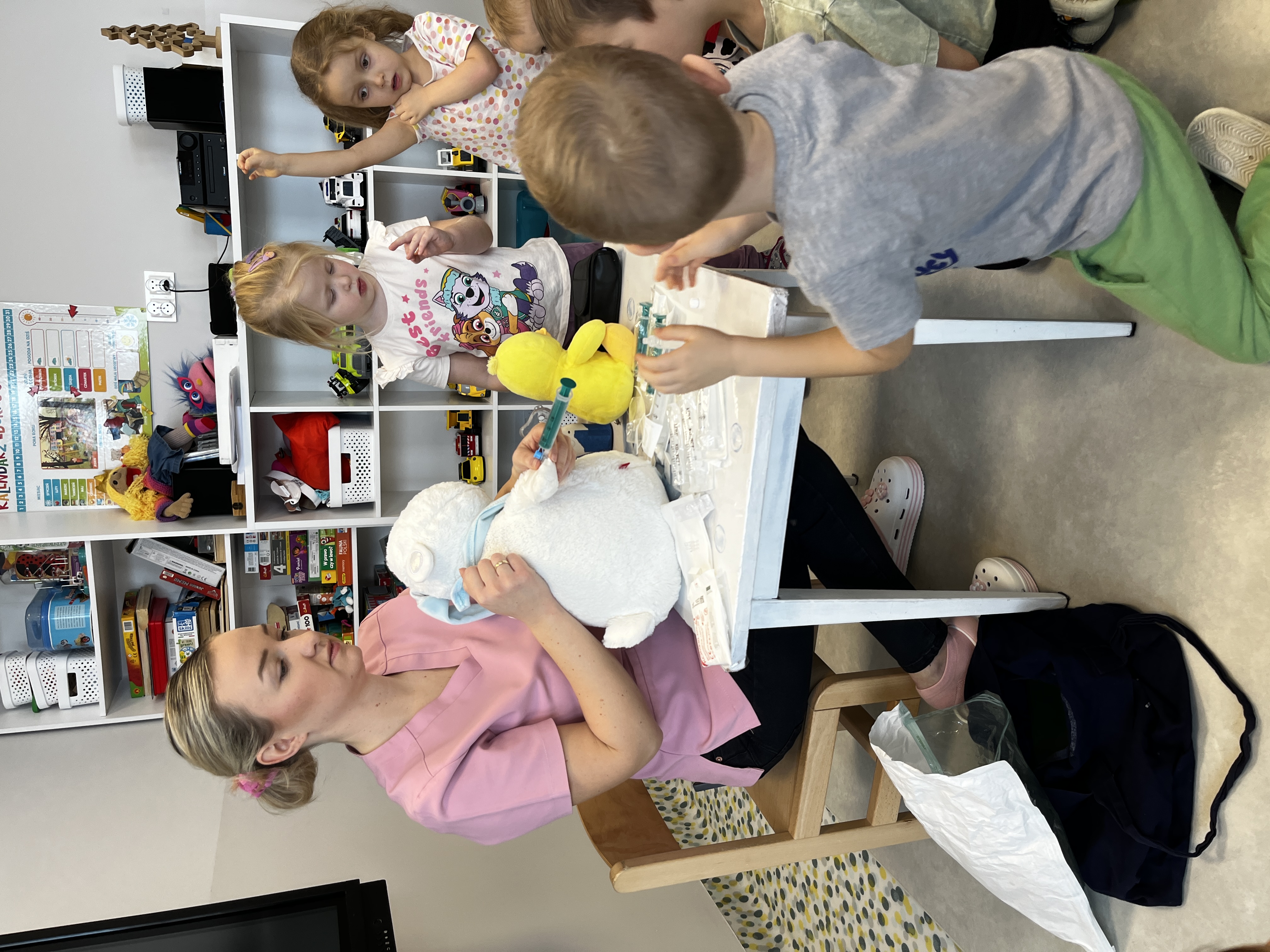 „Mogę być pielęgniarką” - Grupę odwiedziła mama Jadwigi - Pani Marta, która jest pielęgniarką. Podczas spotkania opowiedziała dzieciom, na czym polega jej zawód oraz jak wygląda praca pielęgniarki w szpitalu. Przedszkolaki zapoznały się z podstawowym sprzętem pielęgniarskim, takim jak strzykawki, igły, wenflony, inhalator, gaziki, plastry, a także z ubiorem ochronnym i identyfikatorem pielęgniarki. Dużą radość sprawiła dzieciom wspólna zabawa strzykawkami oraz termometrem. Dzieci robiły „zastrzyki” maskotkom oraz mierzyły sobie nawzajem temperaturę. Pani Marta zaznajomiła przedszkolaki z podstawowymi zasadami higieny osobistej oraz opowiedziała, jak dbać o zdrowie. Na zakończenie dzieci dla naszego gościa kolorowały tematyczne obrazki. Było to bardzo miłe i pouczające spotkanie.