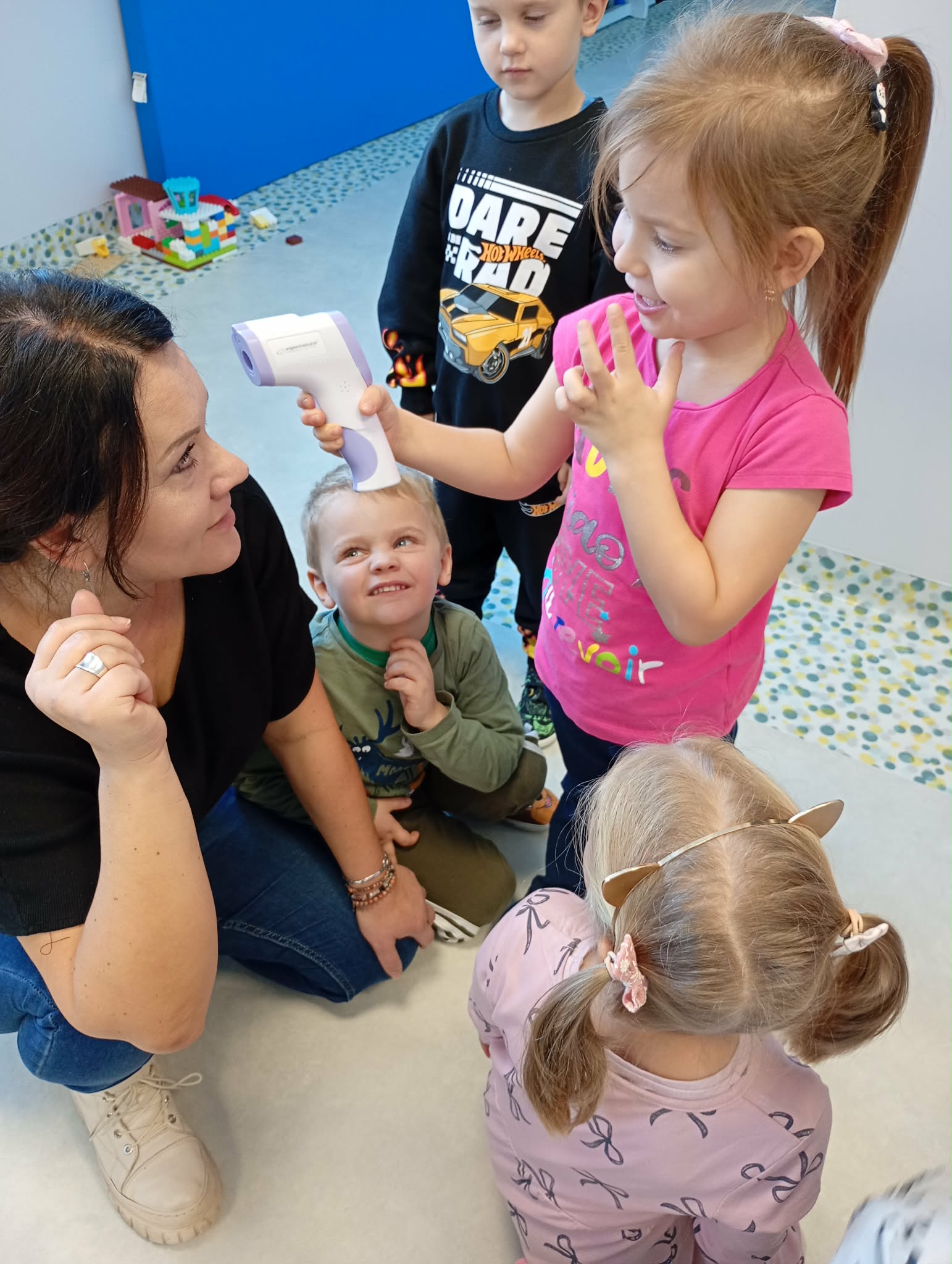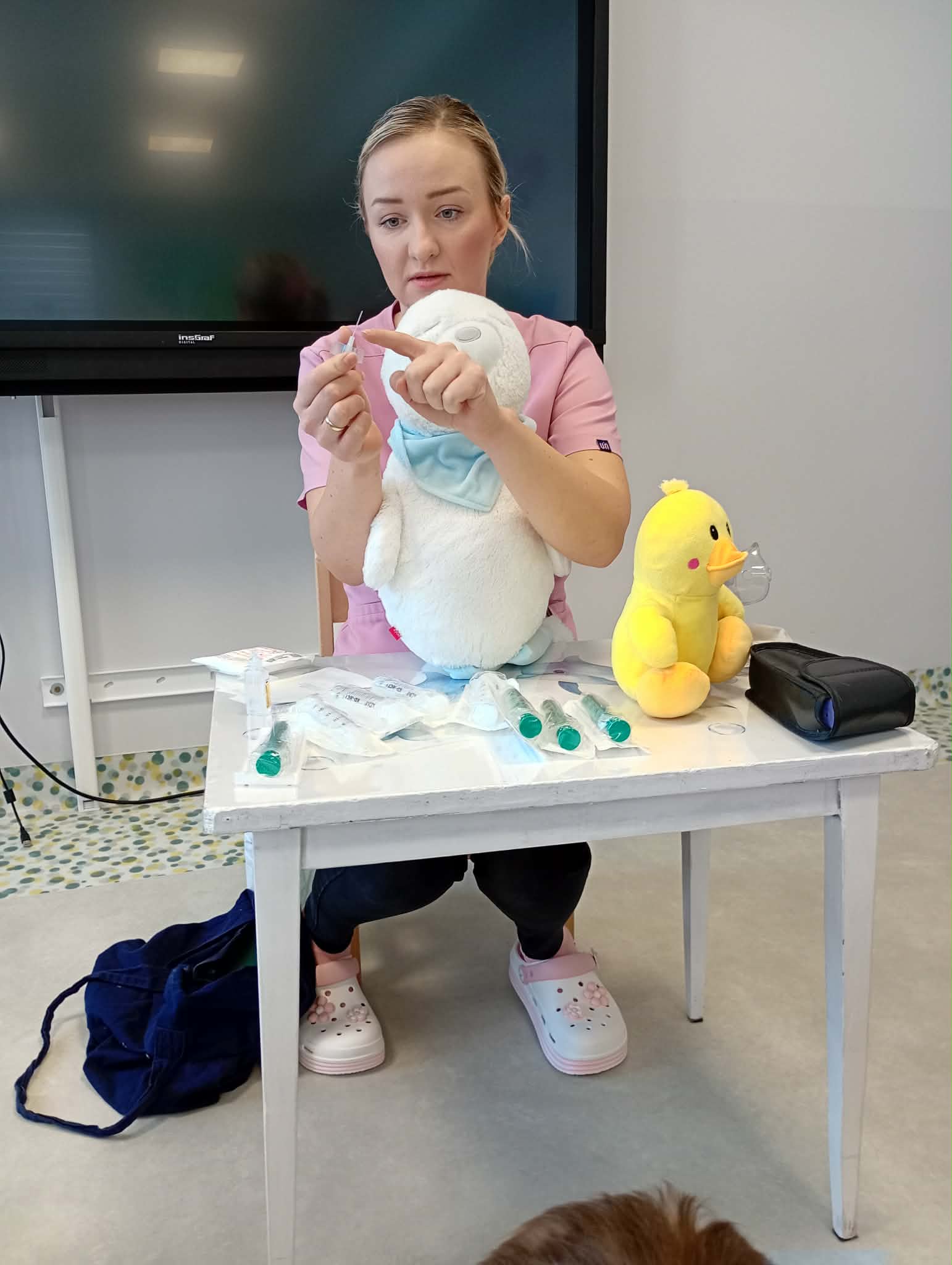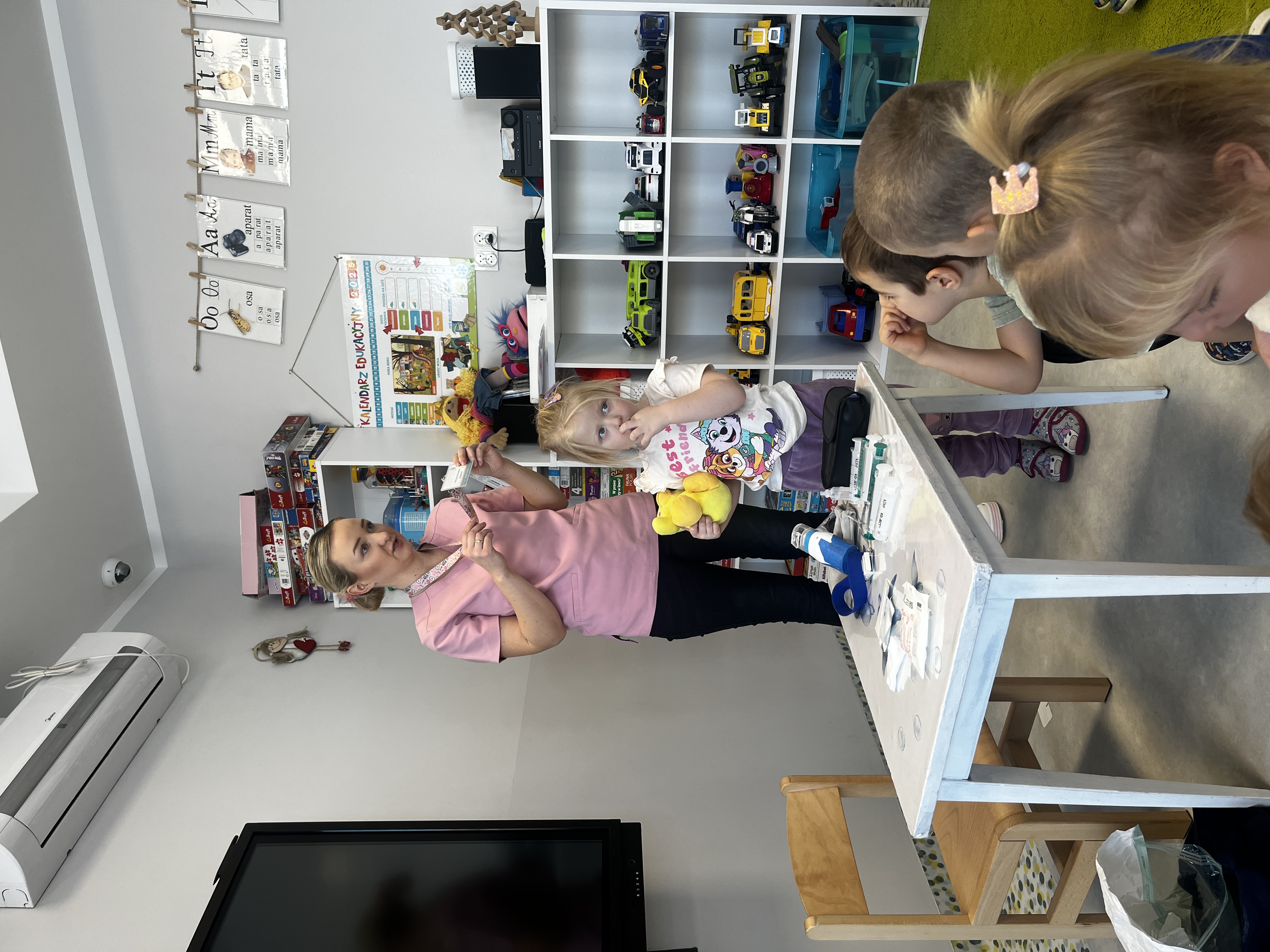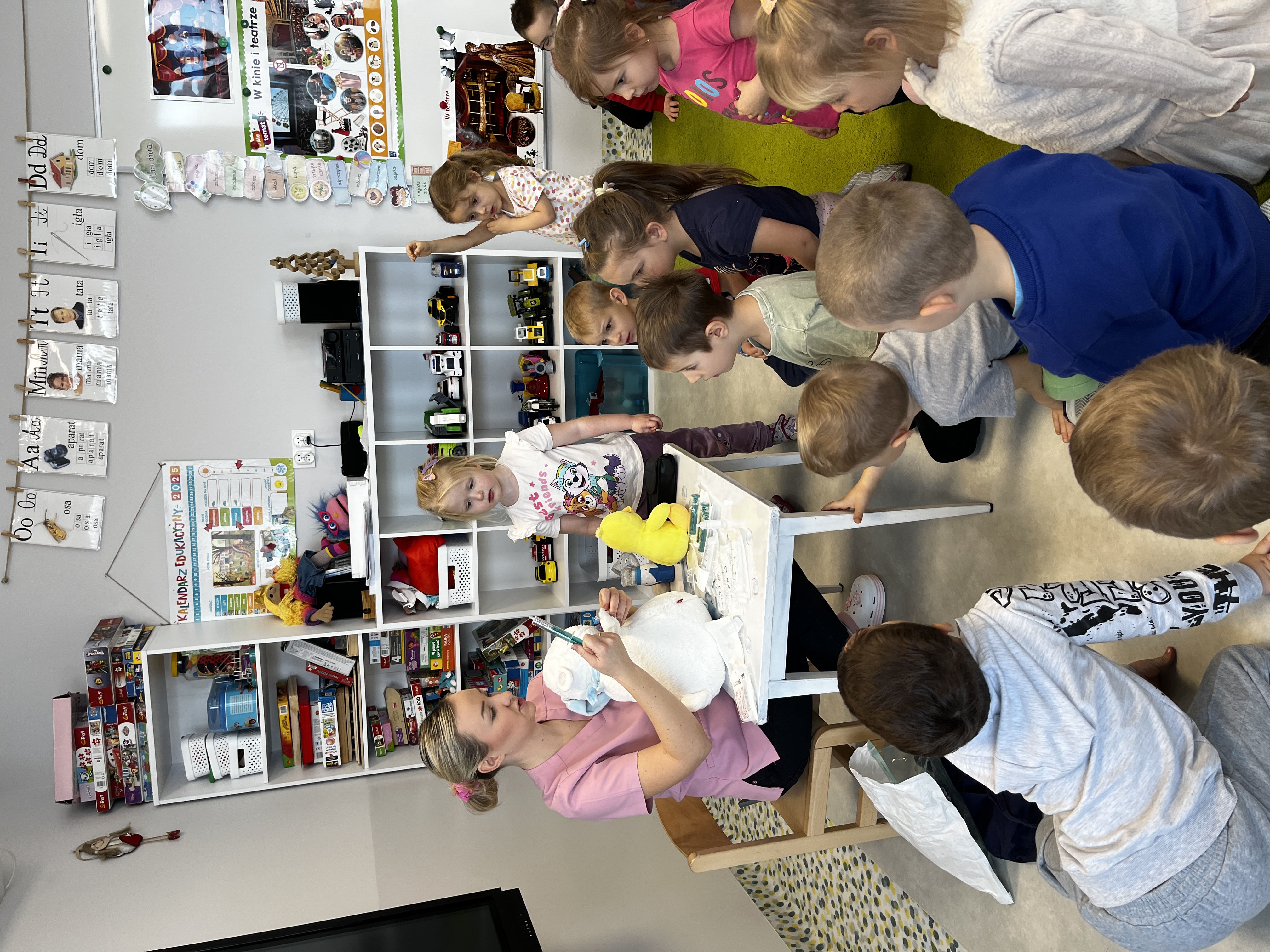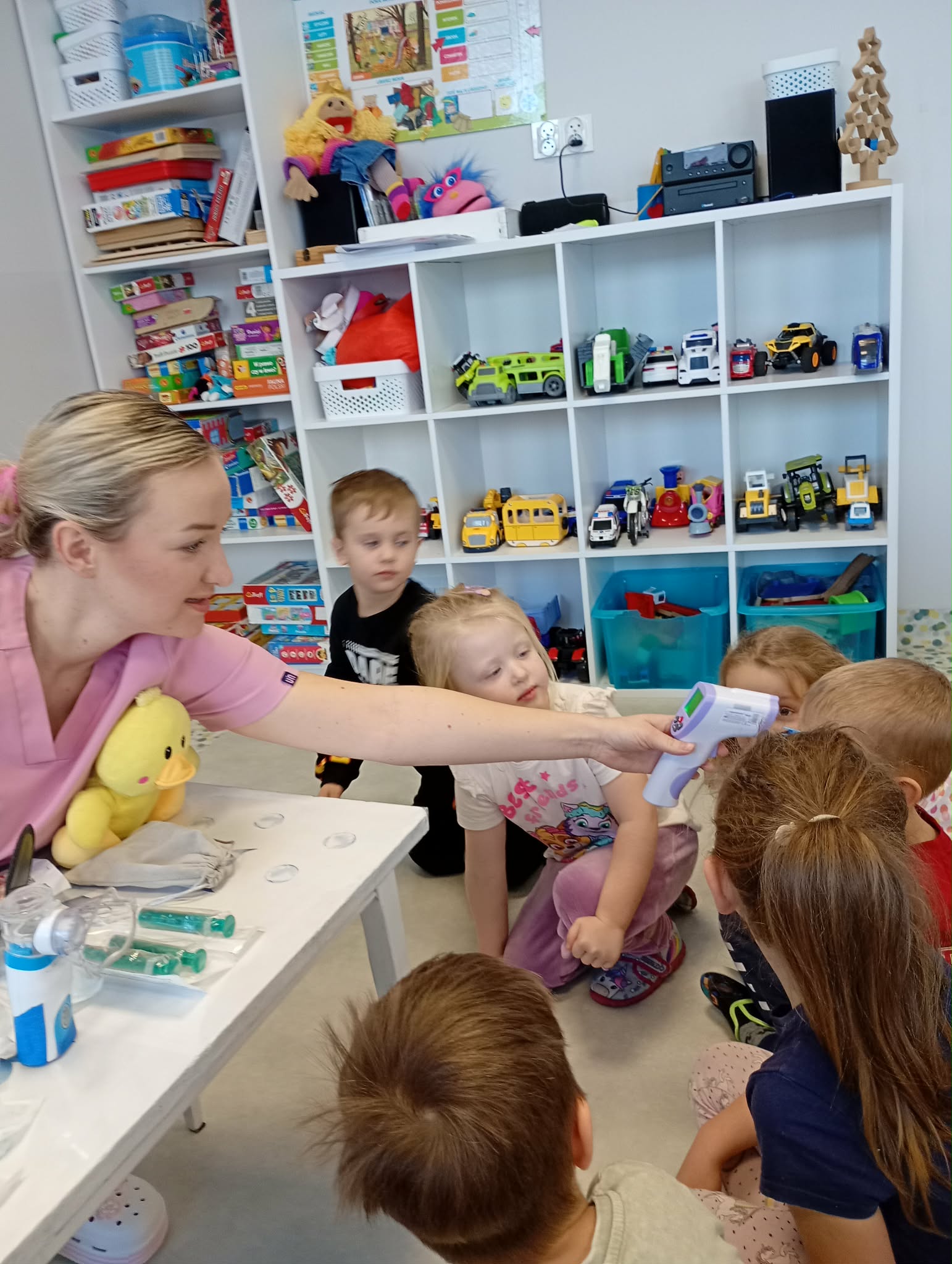 „Mogę być pielęgniarką” - Grupę odwiedziła mama Jadwigi - Pani Marta, która jest pielęgniarką. Podczas spotkania opowiedziała dzieciom, na czym polega jej zawód oraz jak wygląda praca pielęgniarki w szpitalu. Przedszkolaki zapoznały się z podstawowym sprzętem pielęgniarskim, takim jak strzykawki, igły, wenflony, inhalator, gaziki, plastry, a także z ubiorem ochronnym i identyfikatorem pielęgniarki. Dużą radość sprawiła dzieciom wspólna zabawa strzykawkami oraz termometrem. Dzieci robiły „zastrzyki” maskotkom oraz mierzyły sobie nawzajem temperaturę. Pani Marta zaznajomiła przedszkolaki z podstawowymi zasadami higieny osobistej oraz opowiedziała, jak dbać o zdrowie. Na zakończenie dzieci dla naszego gościa kolorowały tematyczne obrazki. Było to bardzo miłe i pouczające spotkanie.