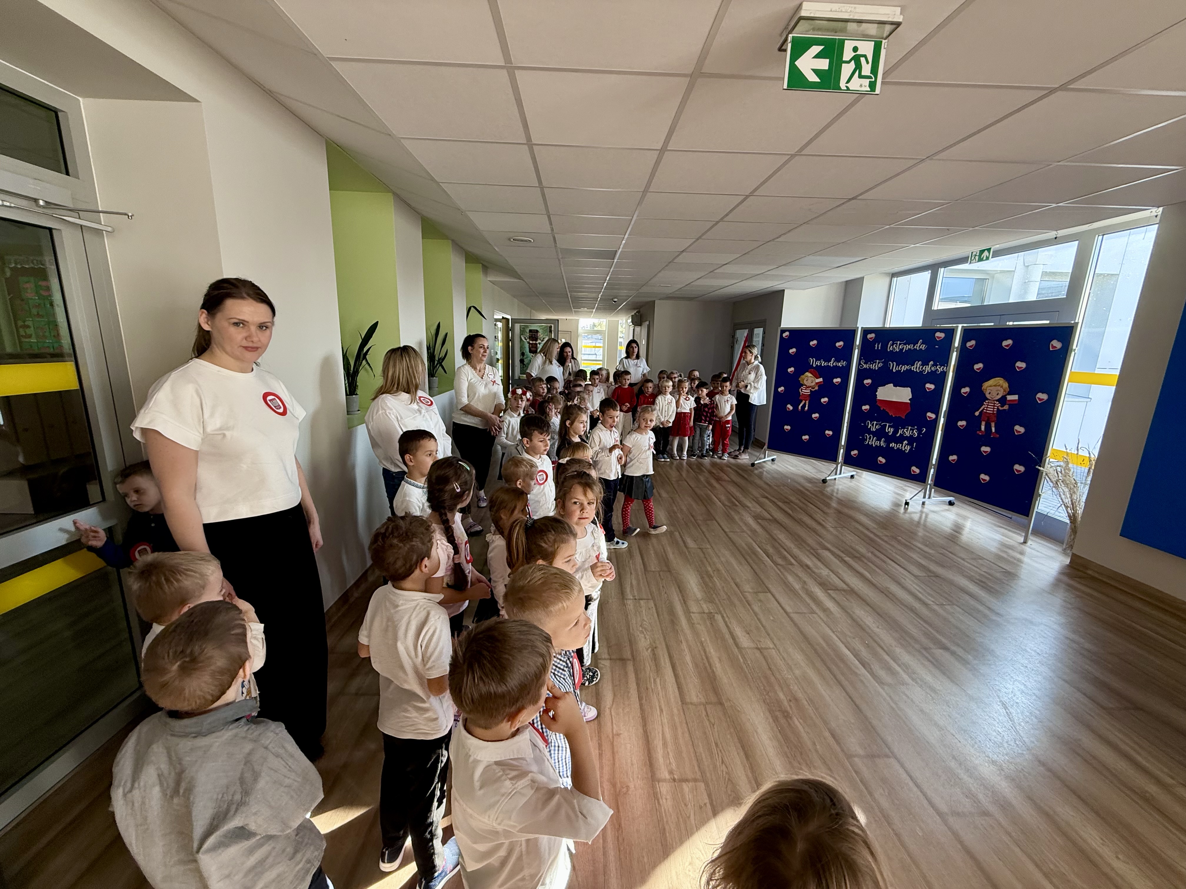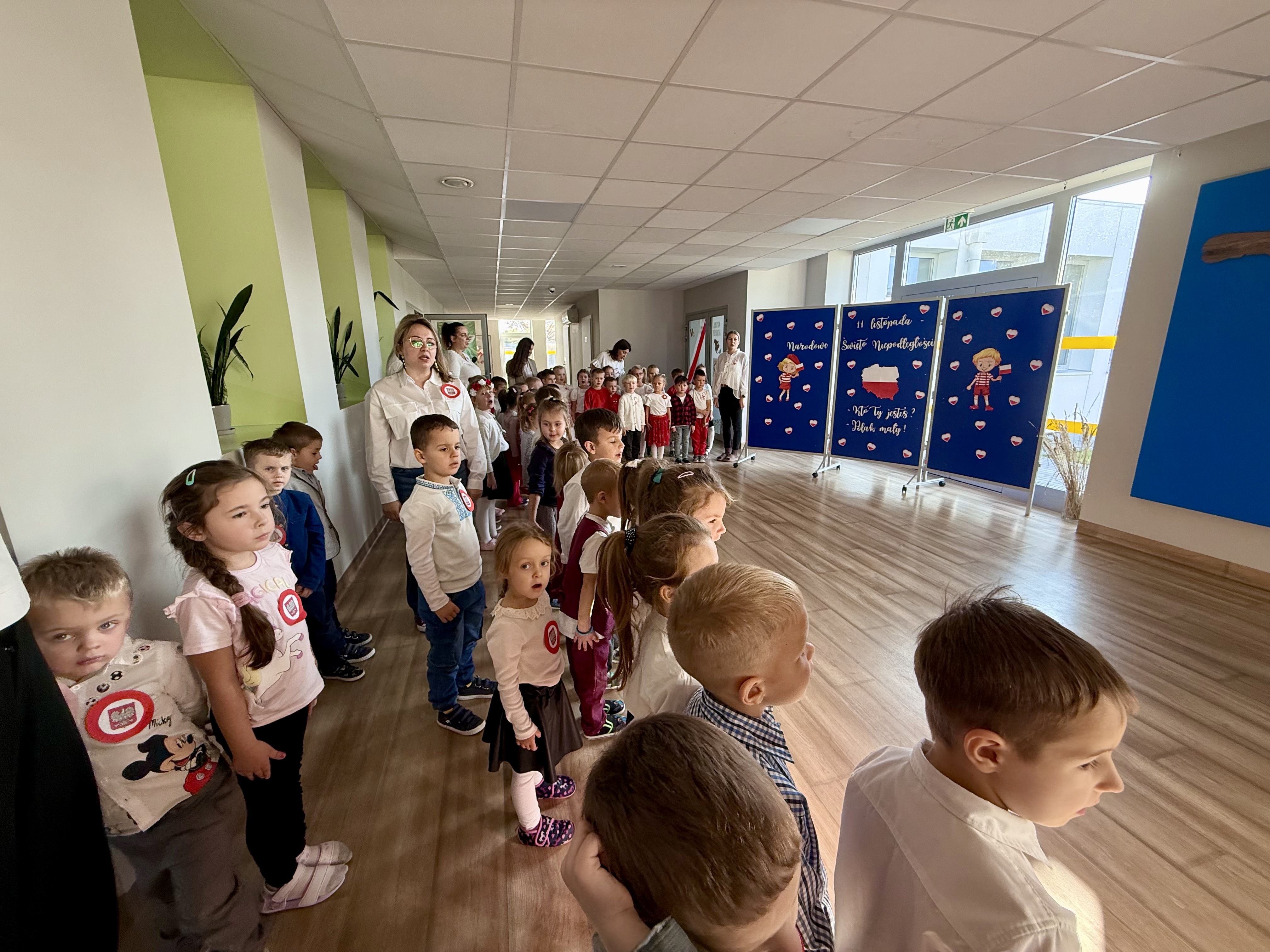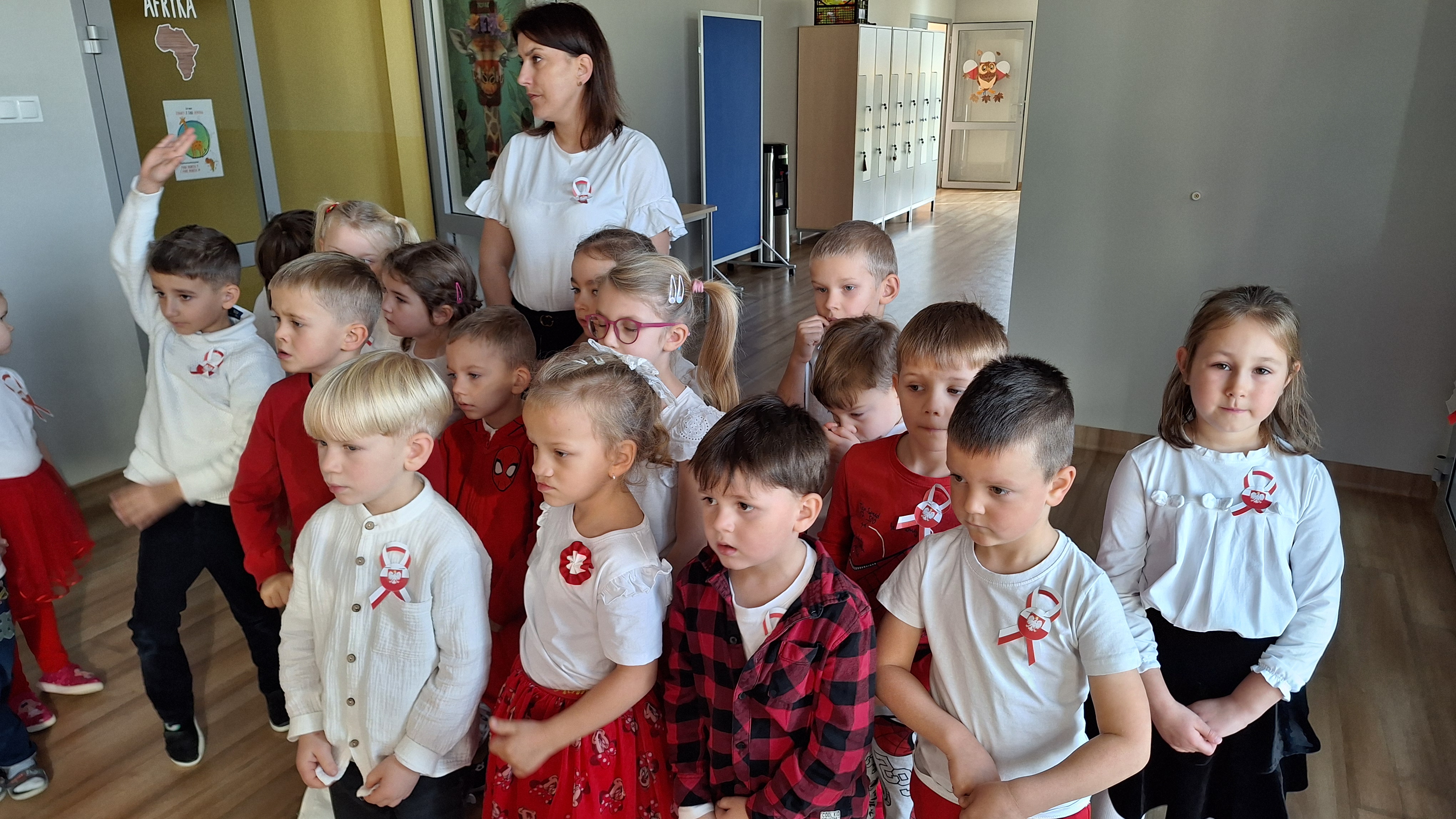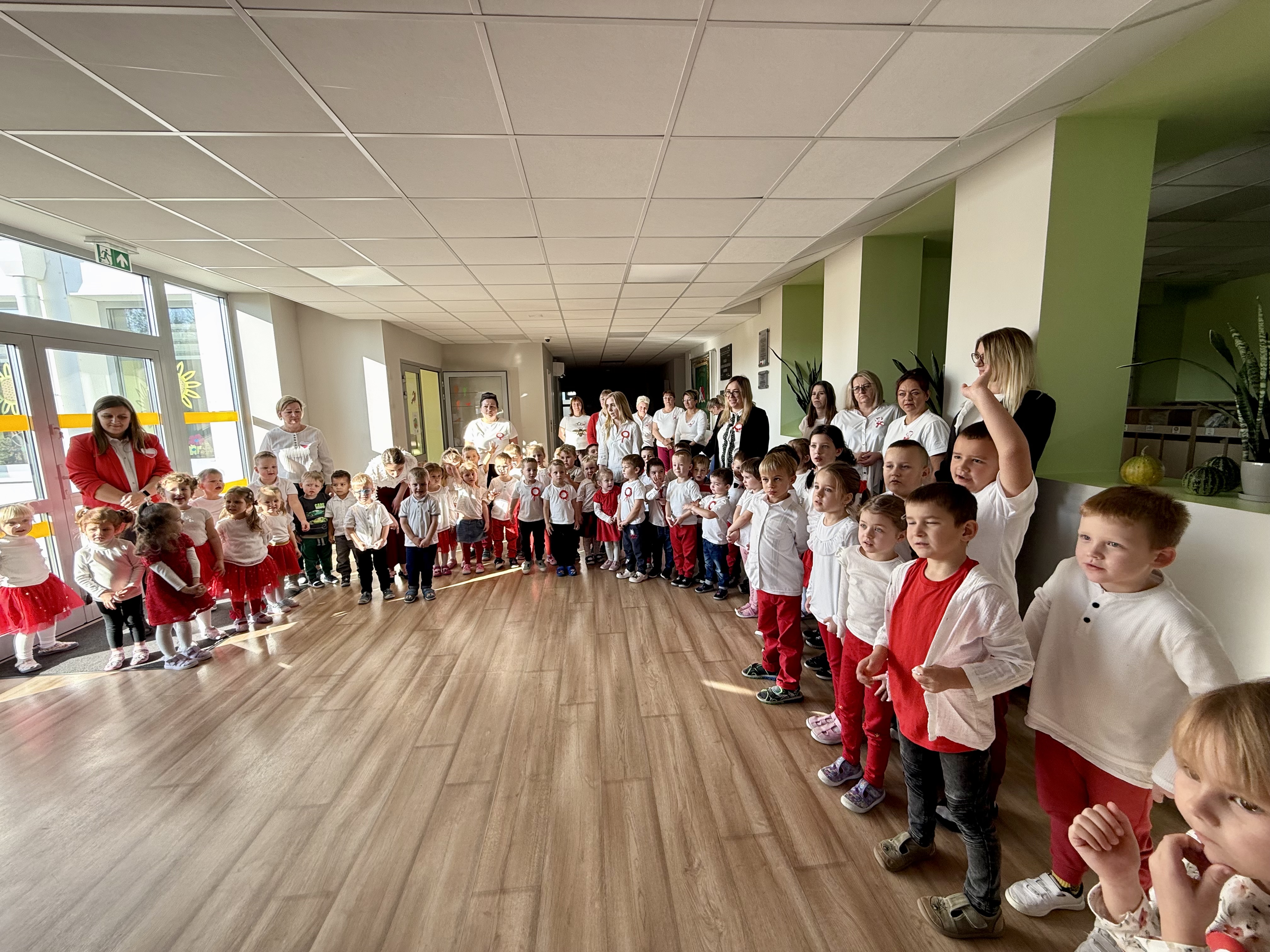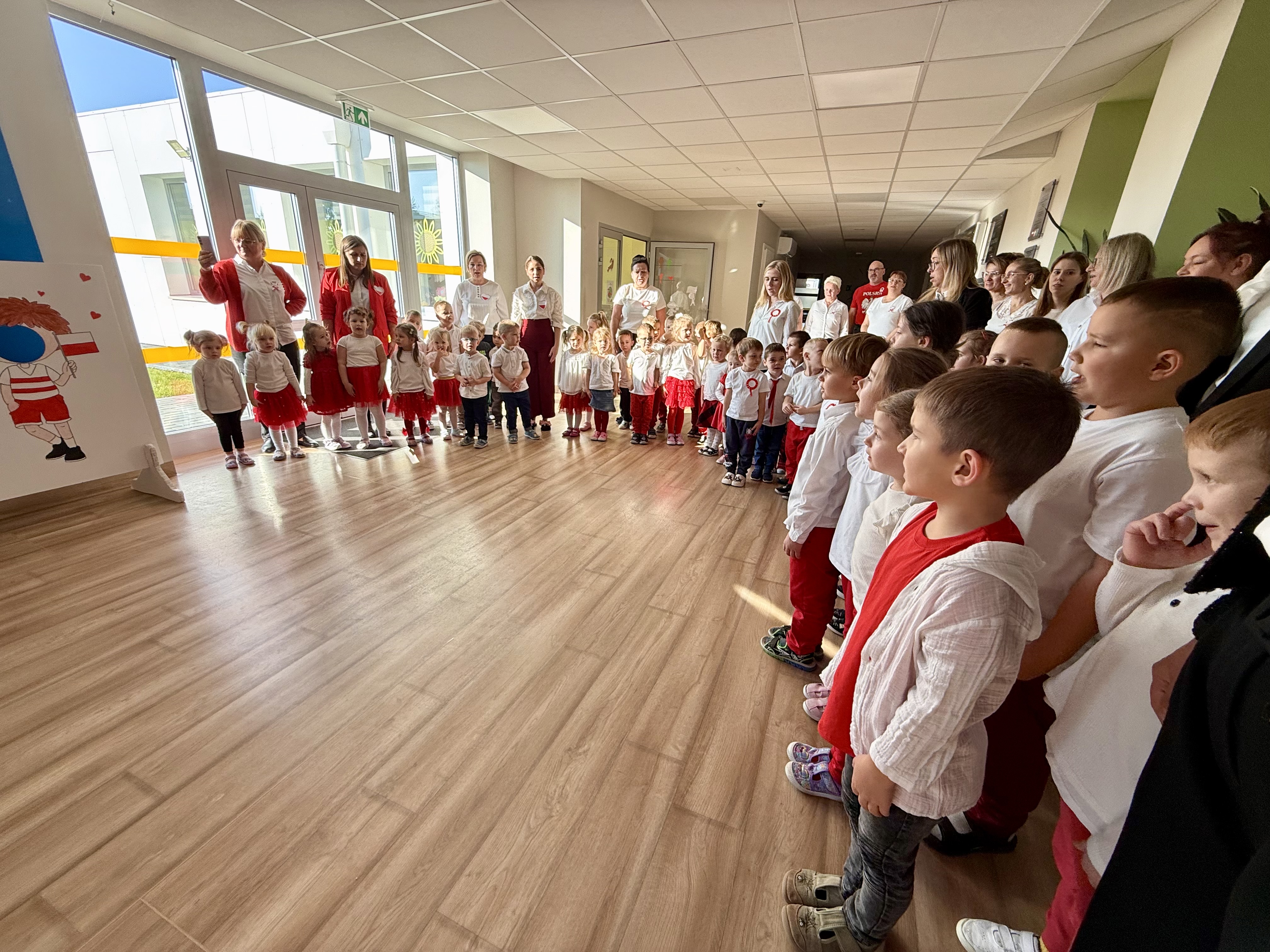 Ostatnim zadaniem w grze i jednocześnie najbardziej uroczystym momentem było wspólne spotkanie wszystkich grup o godz. 11:11 na przedszkolnym korytarzu. W powadze i skupieniu dzieci wraz z pracownikami przedszkola odśpiewały „Mazurek Dąbrowskiego”. Była to wzruszająca chwila jedności, dumy i pięknego przeżywania święta.