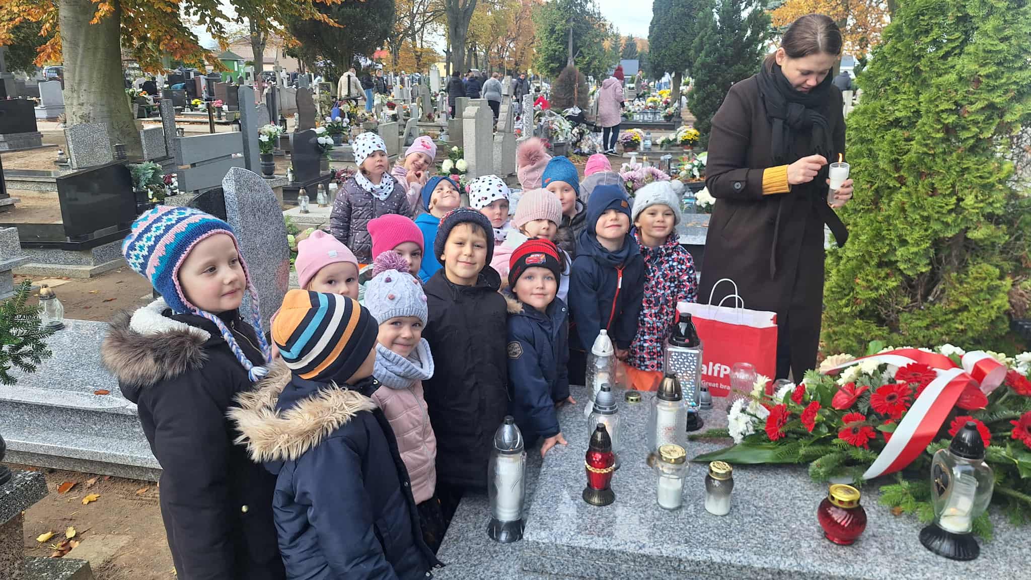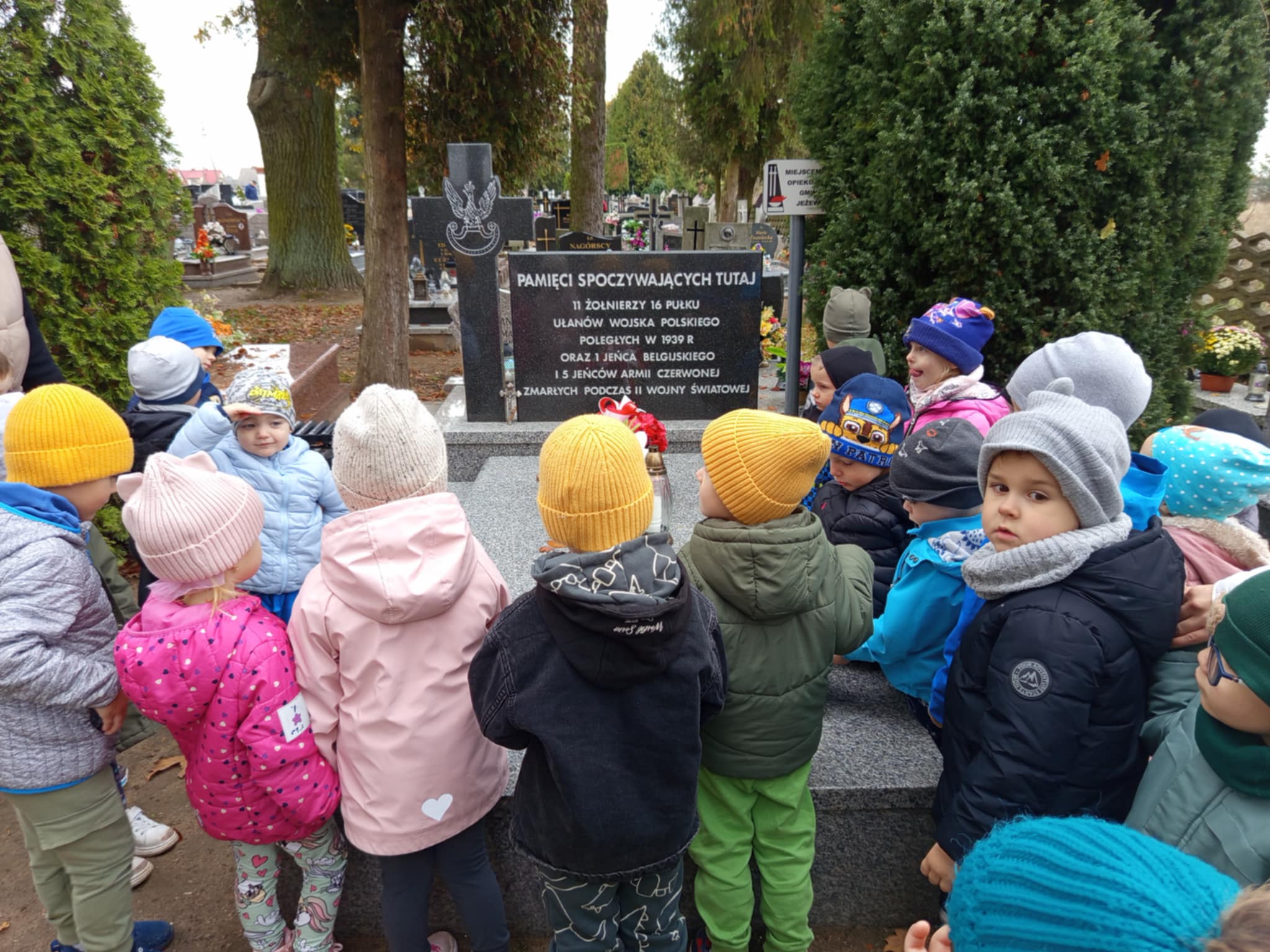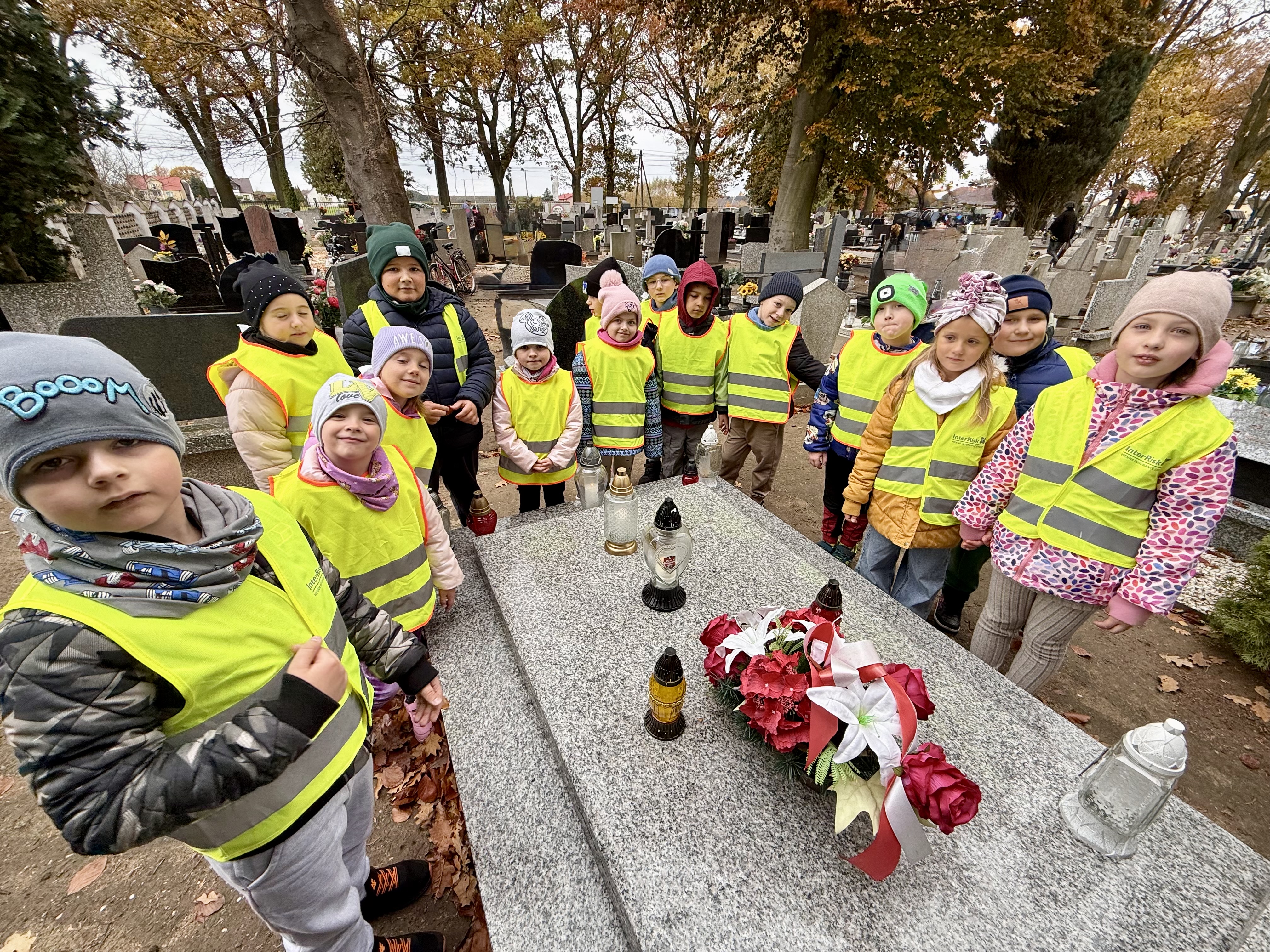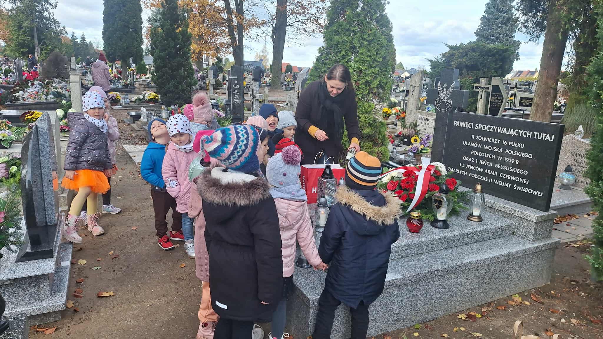 W tygodniu poprzedzającym dzień Wszystkich Świętych nasze przedszkolaki wybrały się na cmentarz parafialny, by w ciszy i zadumie zapalić znicze na grobie poległych żołnierzy. Dzieci z wielką powagą słuchały krótkiej opowieści o odwadze tych, którzy walczyli o naszą wolność. Choć były to krótkie wizyty, pozostawiły w małych sercach wiele refleksji. To ważne chwile, które uczą, że pamięć o przeszłości jest częścią naszej tożsamości.
