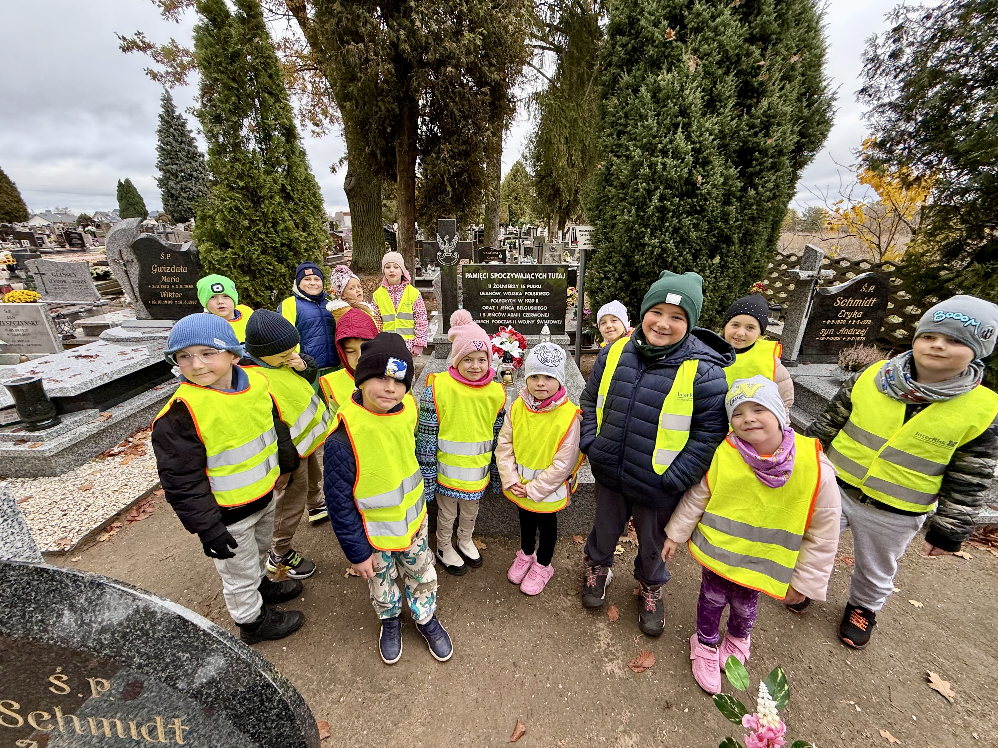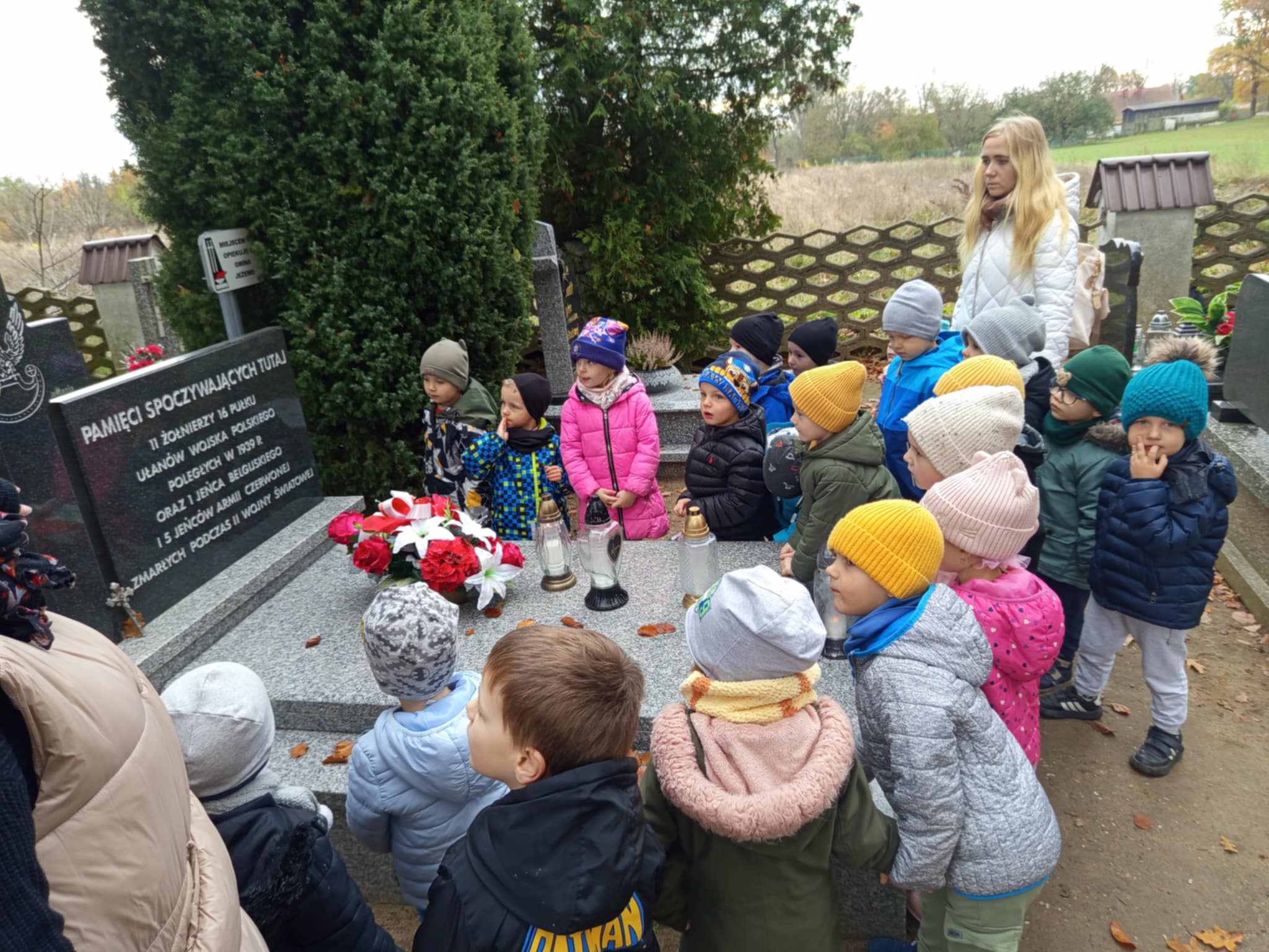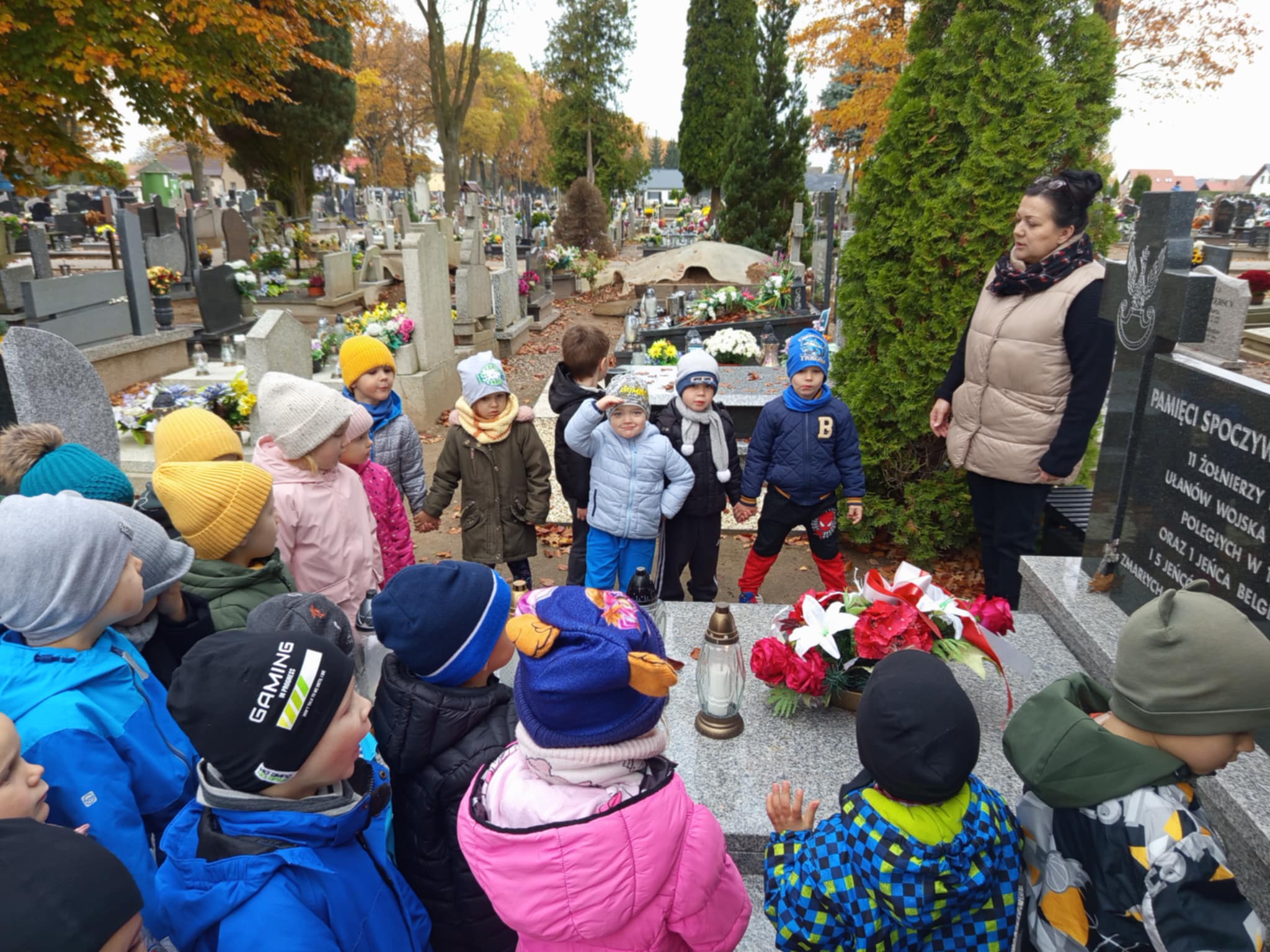 W tygodniu poprzedzającym dzień Wszystkich Świętych nasze przedszkolaki wybrały się na cmentarz parafialny, by w ciszy i zadumie zapalić znicze na grobie poległych żołnierzy. Dzieci z wielką powagą słuchały krótkiej opowieści o odwadze tych, którzy walczyli o naszą wolność. Choć były to krótkie wizyty, pozostawiły w małych sercach wiele refleksji. To ważne chwile, które uczą, że pamięć o przeszłości jest częścią naszej tożsamości.